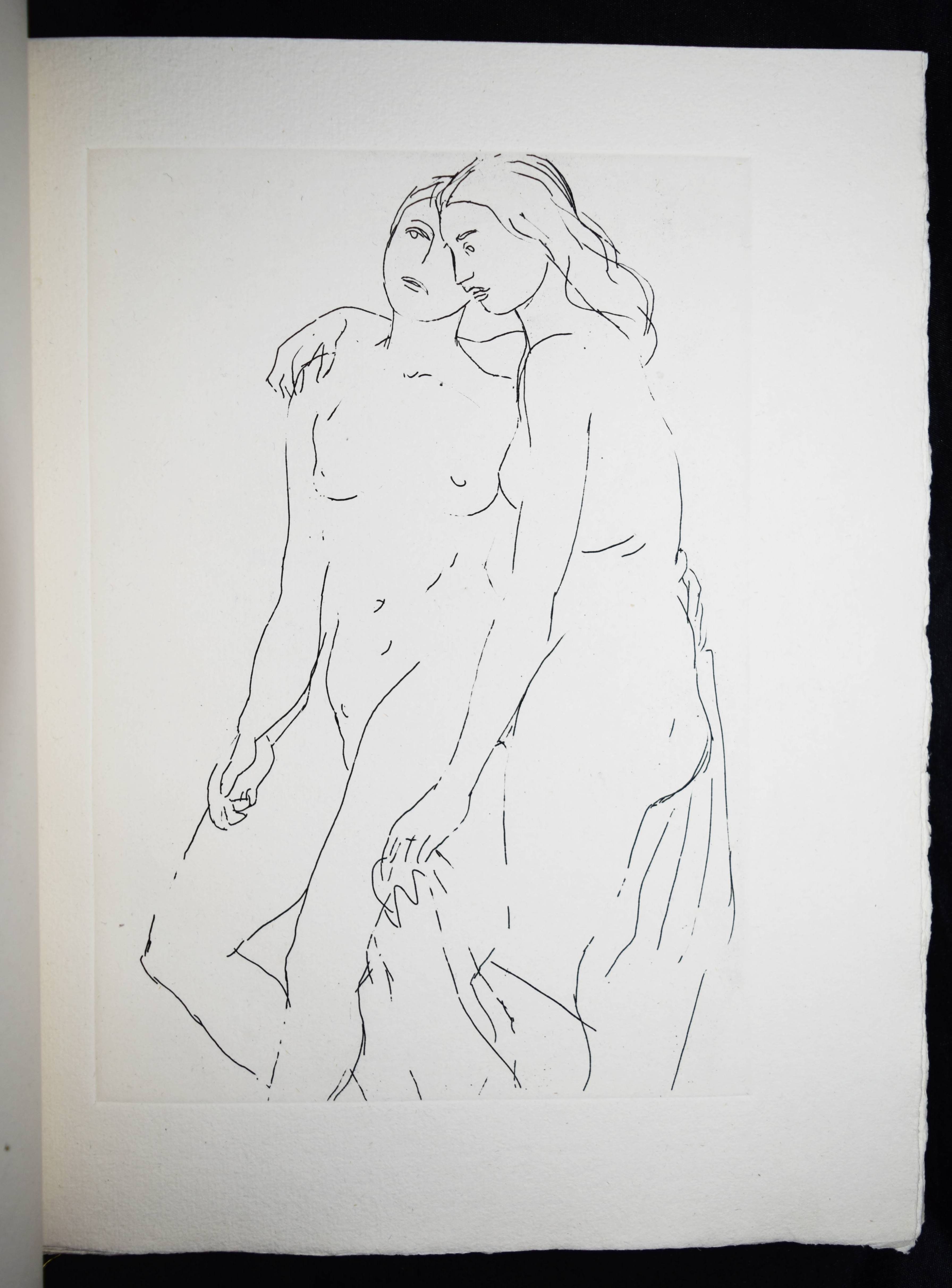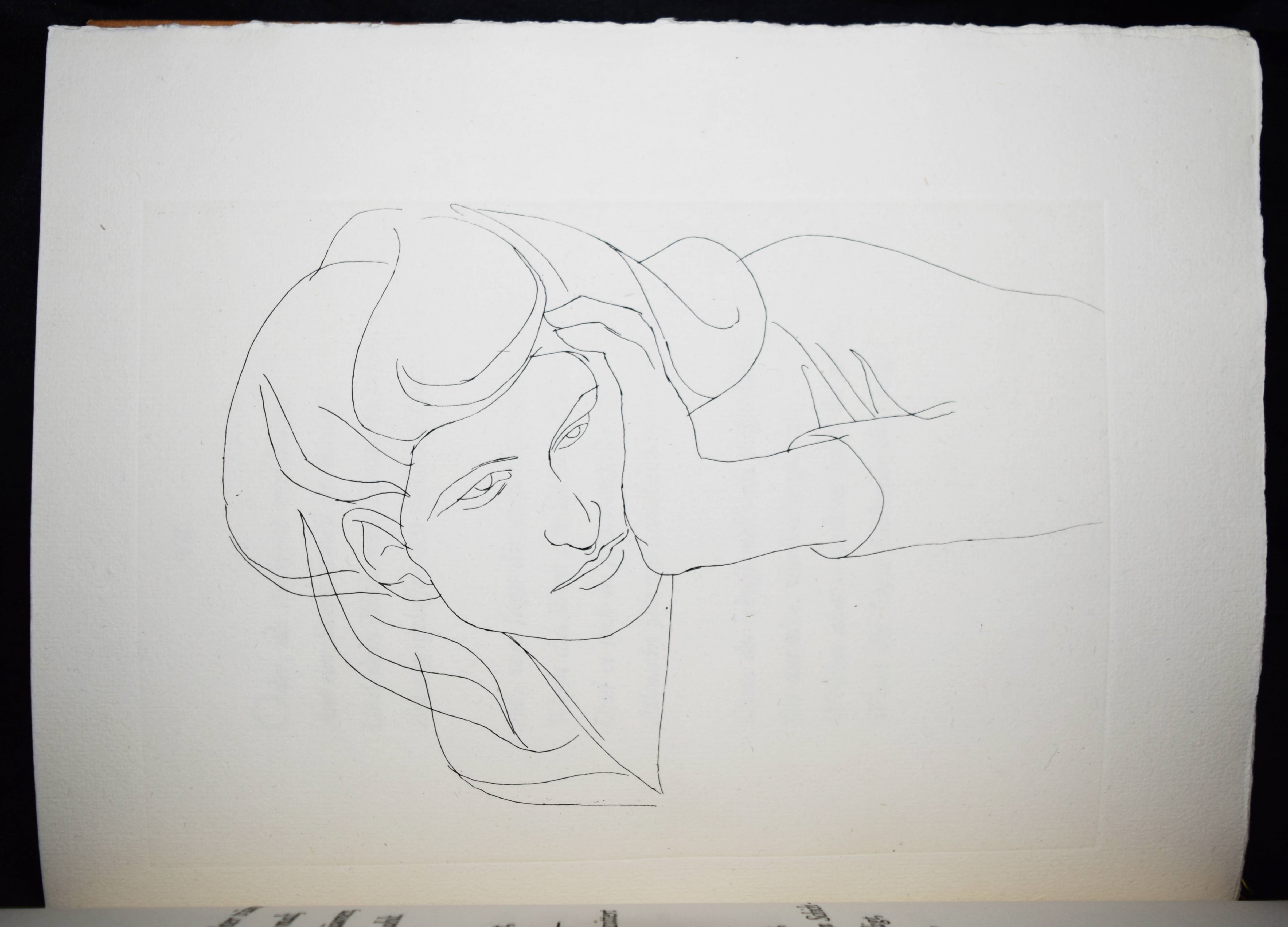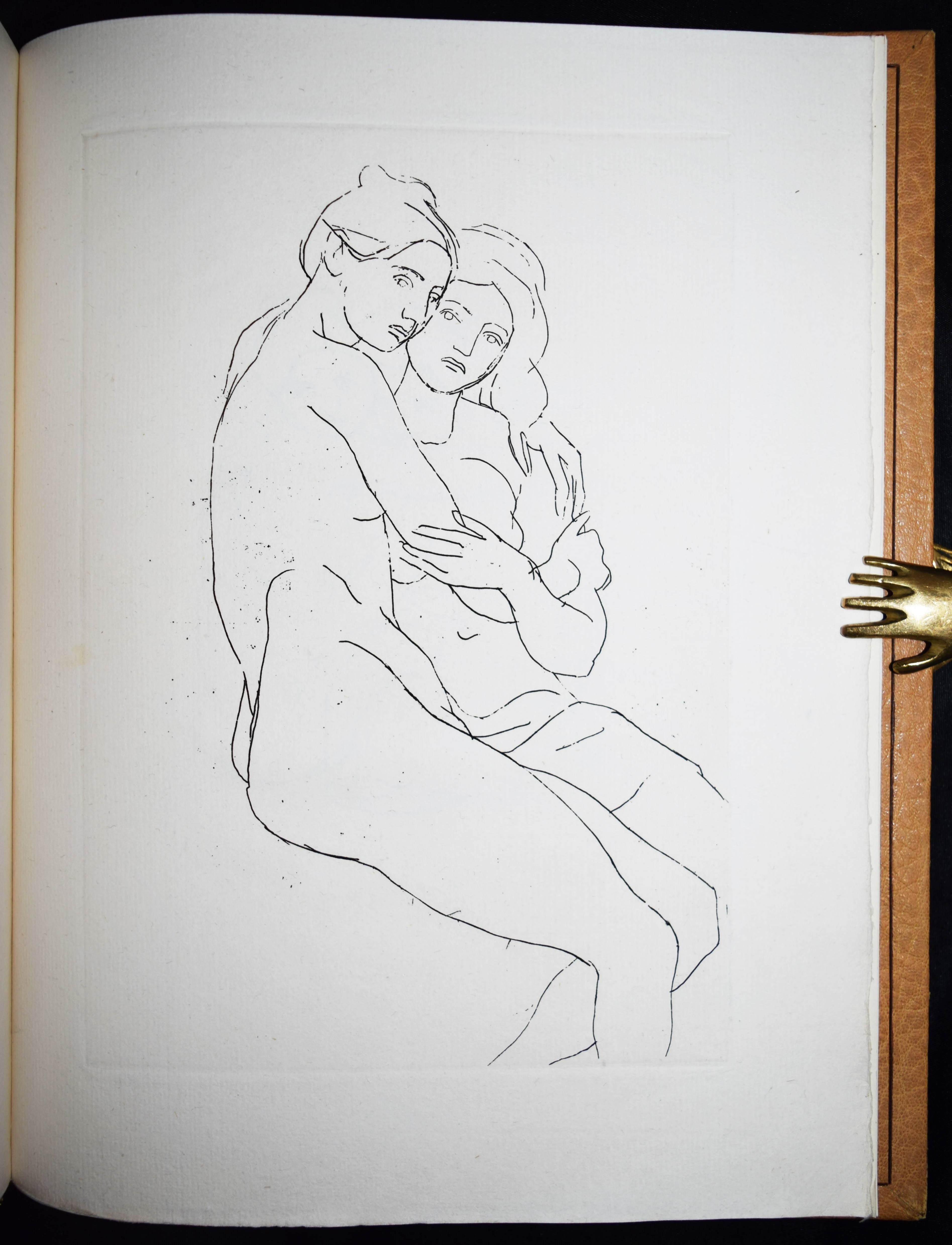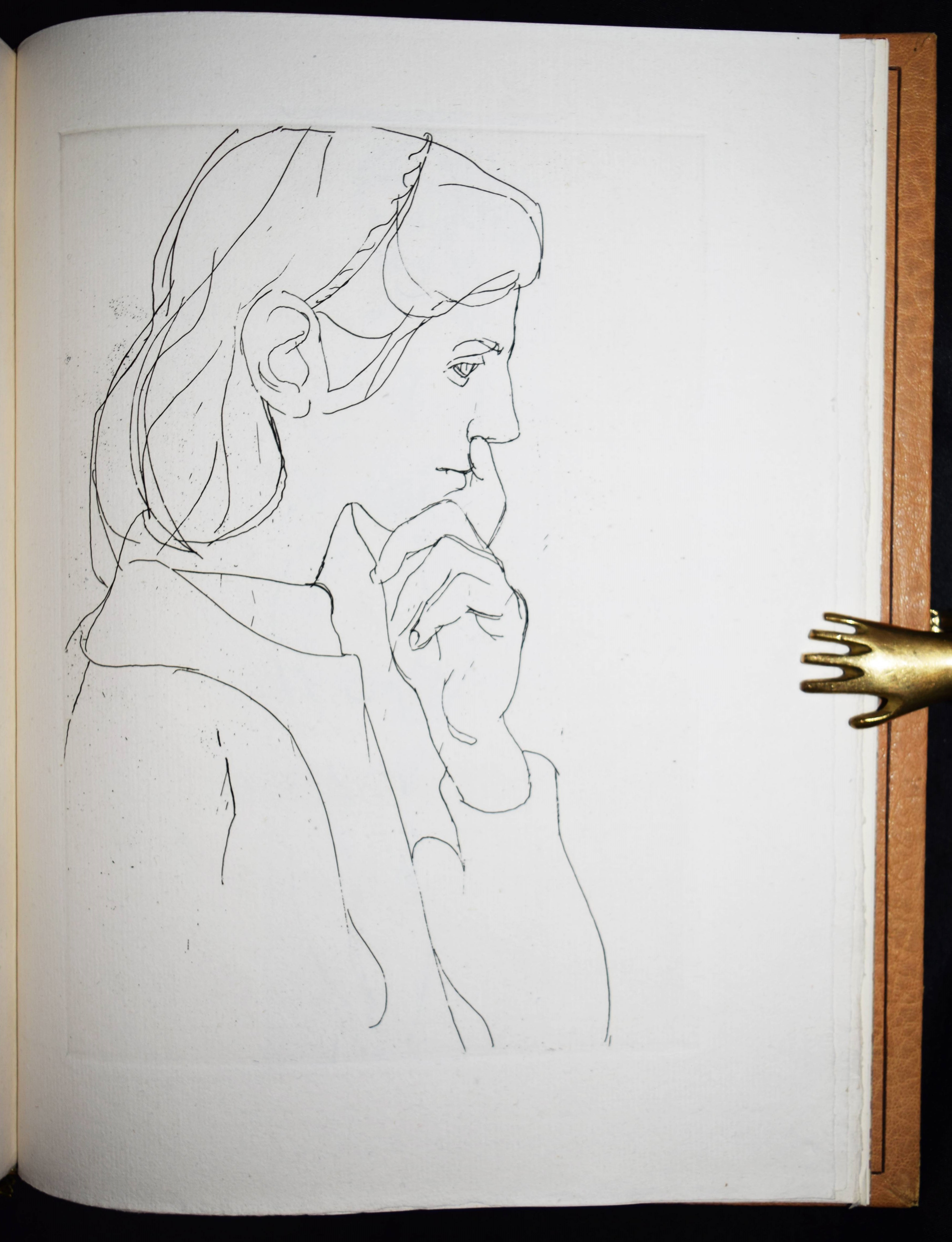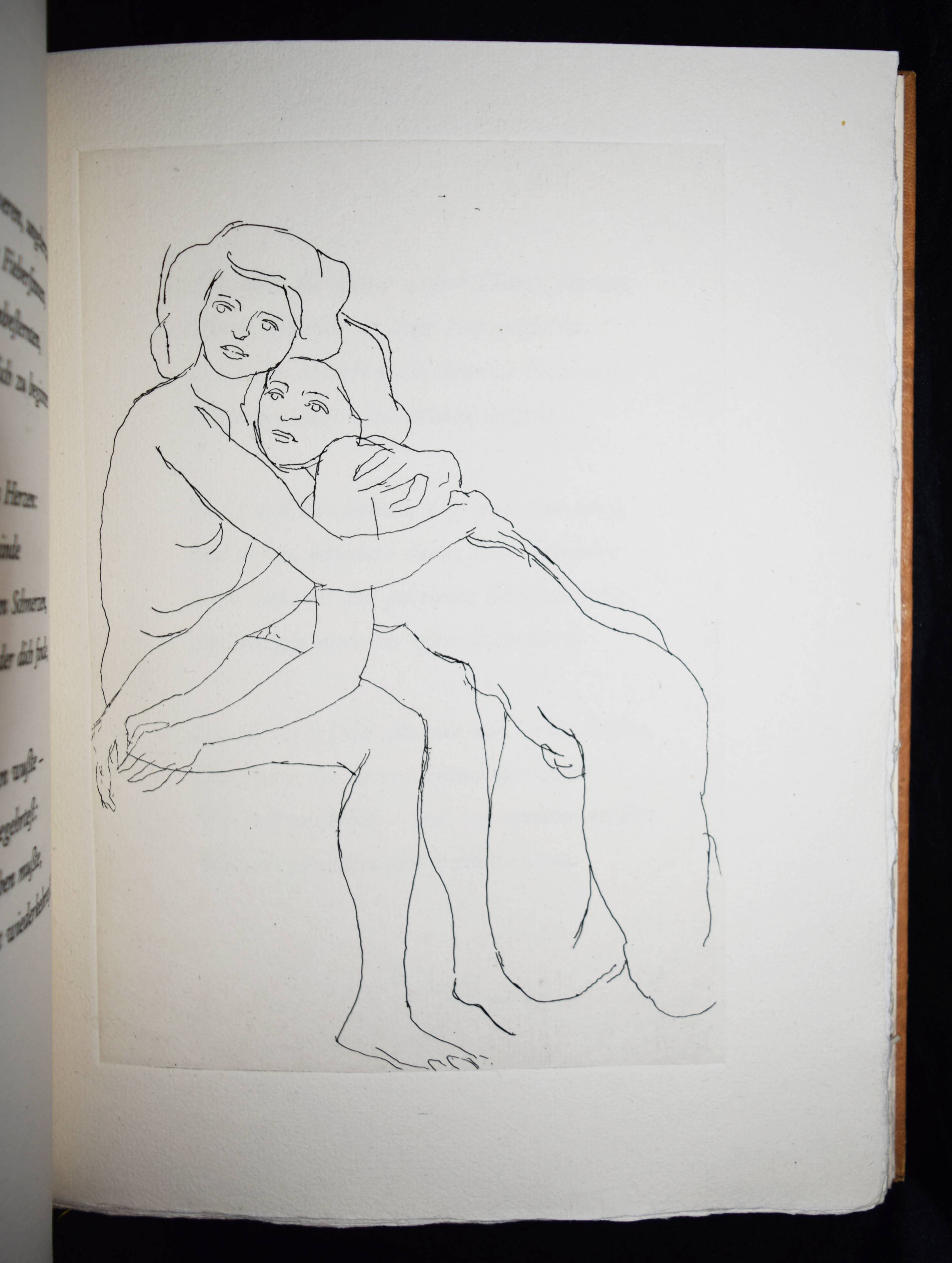 Brenner, Paul Ad(olf). Das trostreiche Antlitz. Gedichte. Heinrich Müller Originalradierungen. (Zürich, Armin Großenbacher 1941). Folio (35,5 x 26,5 cm.). 80 S., [1] Bl. mit Titel in Rot u. Schwarz, gestoch. Titelvignette u. 18 Orig.-Radierungen sowie Suite mit weiteren 18 Radierungen. Hellbrauner OLdr. mit 6 unechten Bünden, Rückentitel u. Deckelfiletten sowie Kopfgoldschnitt (signiert: D. Ogisz). Nr. 7 von 10 Exemplaren der Vorzugsausgabe (GA 56 Exemplare). – Von P. A. Brenner u. H. Müller im Druckvermerk signiert und mit einer zusätzlichen Suite der Radierungen. – Druck auf „Papier de Montval à la main“ von Gaspard Maillol. Die Radierungen druckte Christan Bichsel in Zürich. – Der Schweizer Lyriker P. A. Brenner (1910-1967) arbeitete bis 1957 als Kaufmann. „Man war jung genug, zwischen den Aufführungen der „Dreigroschenoper“, Vorträgen über das Bauhaus Dessau und Protestkundgebungen gegen die Verurteilung Saccos und Vanzettis dennoch in den Gedichtbüchern Hofmannthals, Rilkes und Georges sich zu ergänzen. Zwei Reisen nach Dalmatien, längere und kürzere Aufenthalte in Paris und in der Provence, bewahrten mich davor, in meinem unfreiwillig ausgeübten Berif als Kaufmann zu erstarren. Meine ersten Gedichtbücher schrieb ich unterwegs in Eisenbahnzügen, Wartesälen, in Cafés und billigen Hotelzimmern. Vieles von dem, das ich bis ungefähr 1938 publiziert habe, trägt deutlich die Zeichen des Unsteten und einer Zeit, die wirklichkeitswach und spannungsgeladener war als die heutige. Während man in Zürich den ersten Dichtern der Emigration begegnete und uns Ignazio Silone aus „Fonramara“ vorgelesen hatte, fielen Bomben auf Guernica. Als ich begriff, dass mit Verseschreiben die schiefen Verhältnisse, in die das ermüdete, zerwühlte Europa geriet, nicht zu ändern waren, stand ich mit meiner Arbeit dort, wo man nicht mehr an Eingebung und „blaue Stunden“ glaubt. Fragt man mich, warum ich trotzdem Gedichte mache, so muss ich antworten: Um mich in das zu verwandeln, was anscheinend meiner innersten Natur entspricht“ (P. A. Brenner am 29. 2. 1960 in „Schweizer Schriftsteller der Gegenwart“). – Der Maler, Graphiker und Kunstpädagoge H. Müller (1903-1978), Schüler von Ernst Würtenberger in Karlsruhe, war Mitbegründer der Künstlervereinigung „Der graphische Kreis“ und von 1943 bis 1949 Präsident der Zürcher Sektion der Gesellschaft Schweizerischer Maler und Bildhauer (GSAMBA). – Schönes Exemplar in einem dekorativen signierten Handeinband.
