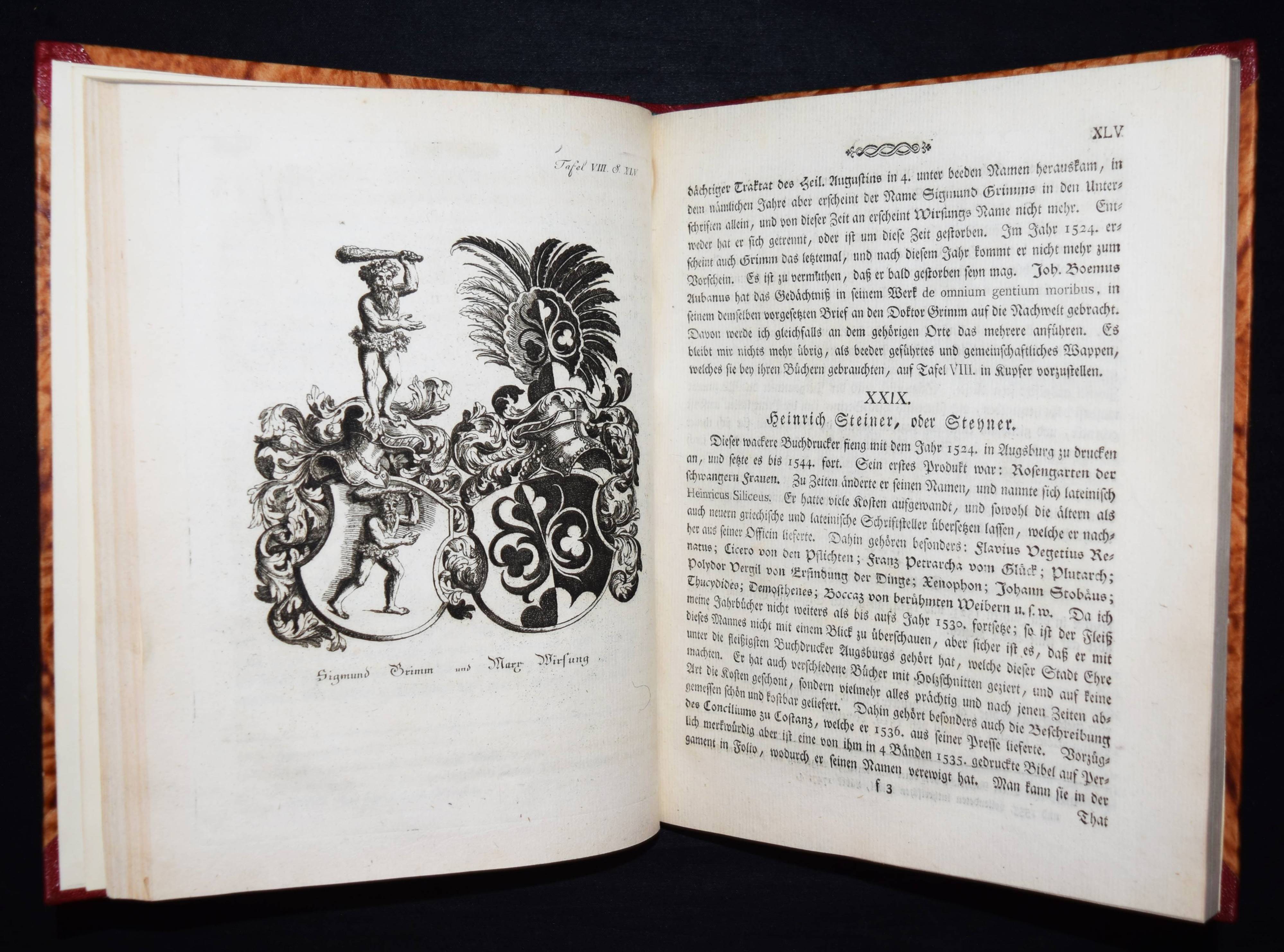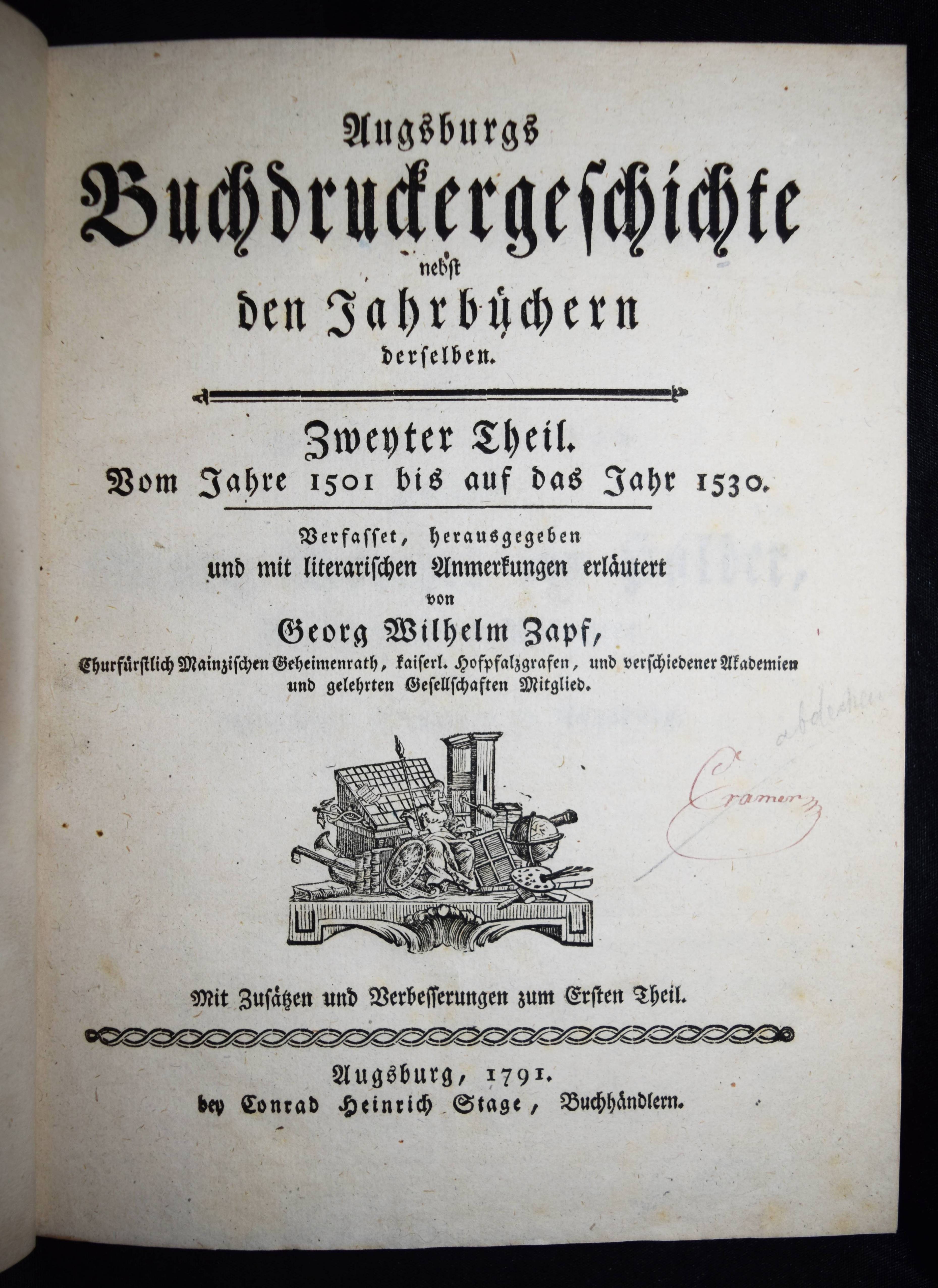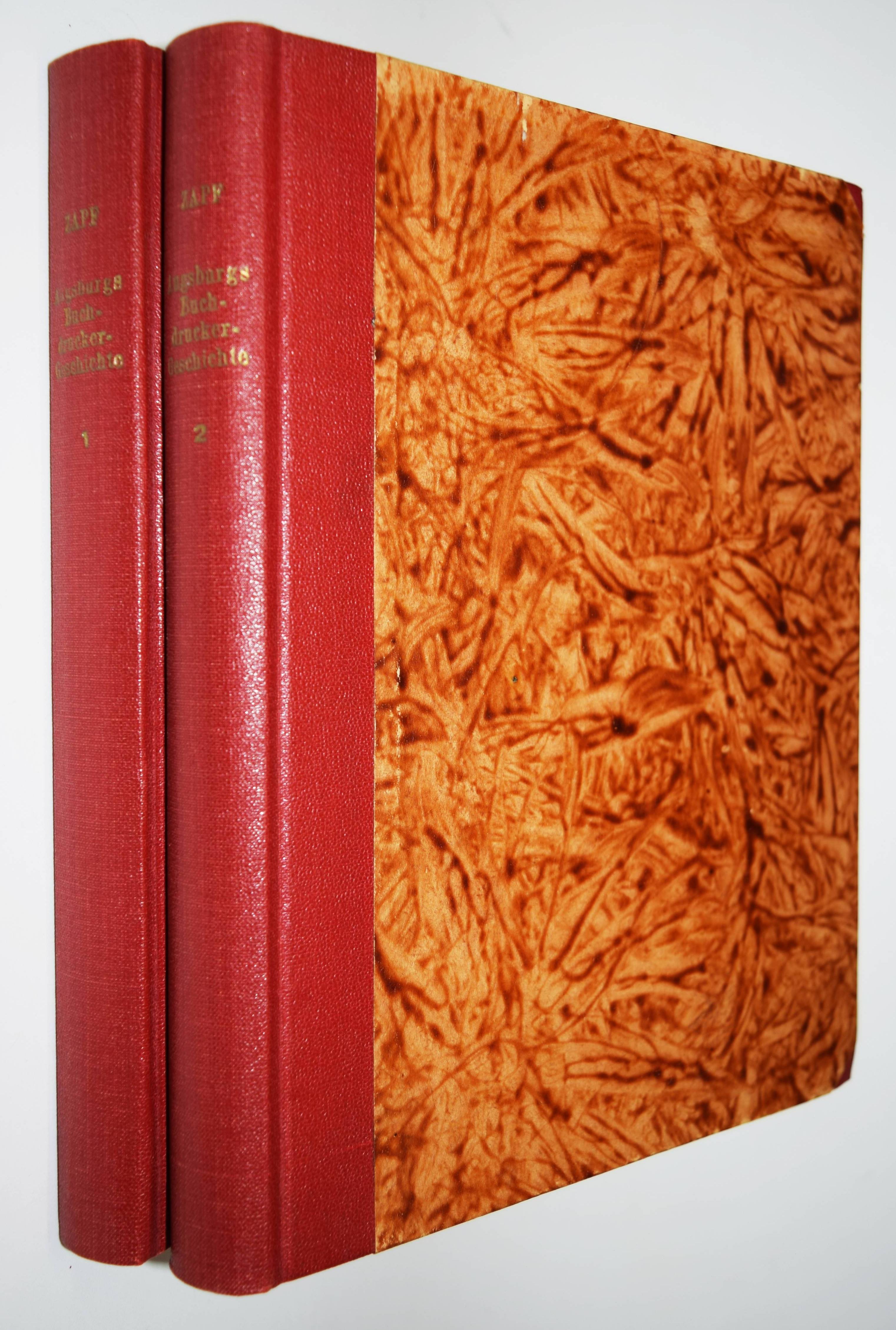 Zapf, Georg Wilhelm. Augsburgs Buchdruckergeschichte nebst den Jahrbüchern derselben. Erster (und) zweyter Theil. Vom Jahre 1468 bis auf das Jahr 1530. Verfasset, herausgegeben und mit literarischen Anmerkungen erläutert. 2 Bände. Augsburg, Conrad Heinrich Stage 1786-1791. Gr. 8°. [8] Bl., XLVIII, 220 S.; [4] Bl., XVI, 263 S., [8] (1 w.) Bl. mit gestoch. Titelvign., 8 Kupfertafeln, 2 Textkupfern u. mehreren Holzschnitt-Vignetten. Moderne Hln. mit goldgepr. Rückentiteln. Bestermann 3400. Bigmore-W. III, 111 (dat. versehentl. 1788 für Band I). – Erste Ausgabe. – Band I behandelt den Zeitraum 1468 bis 1500, Band II den von 1501 bis 1530. Beigegeben ist auch ein „historisch-literarisches Verzeichnis“ der Augsburger Inkunabeln. – N.a.T., gutes sauberes Exemplar.