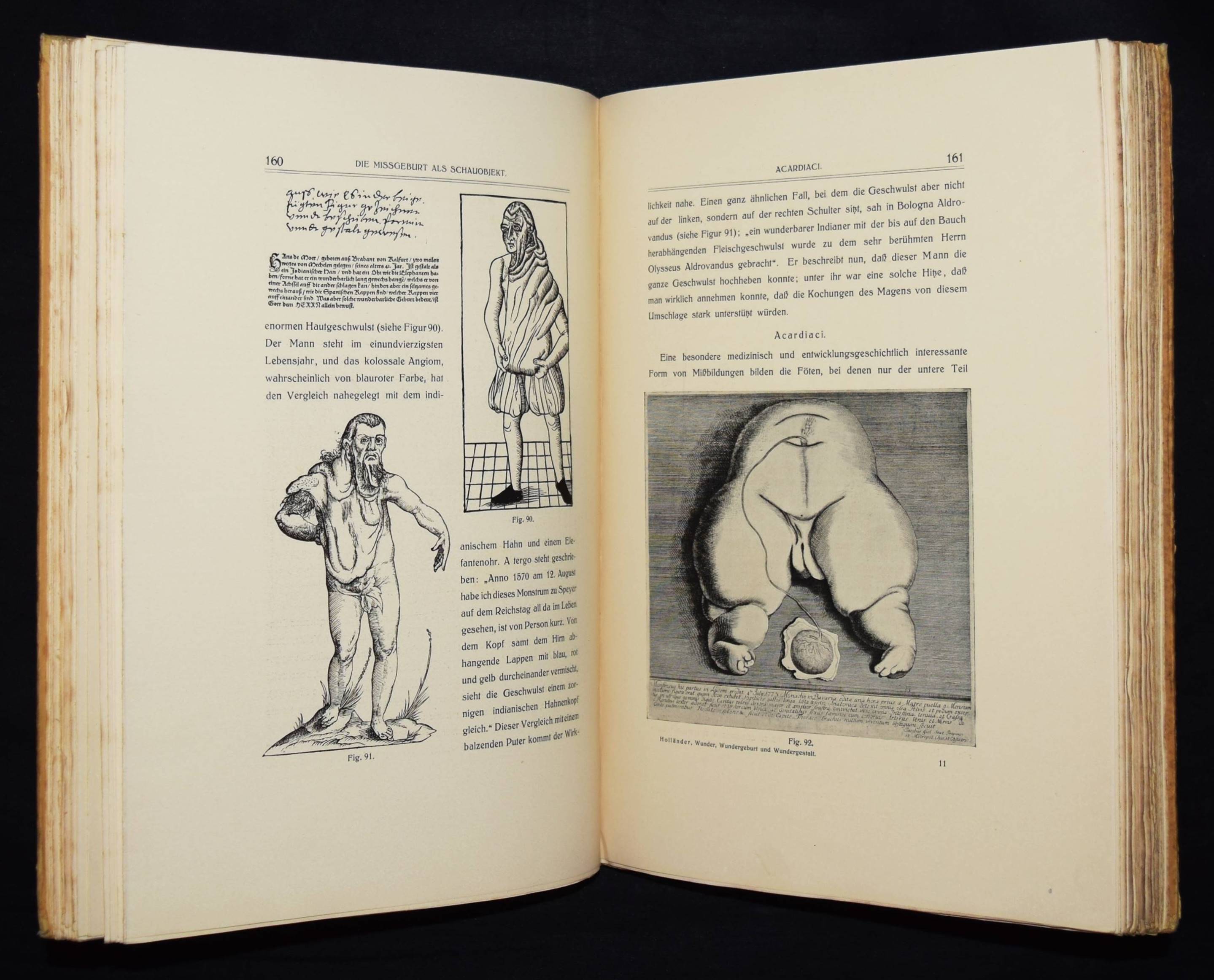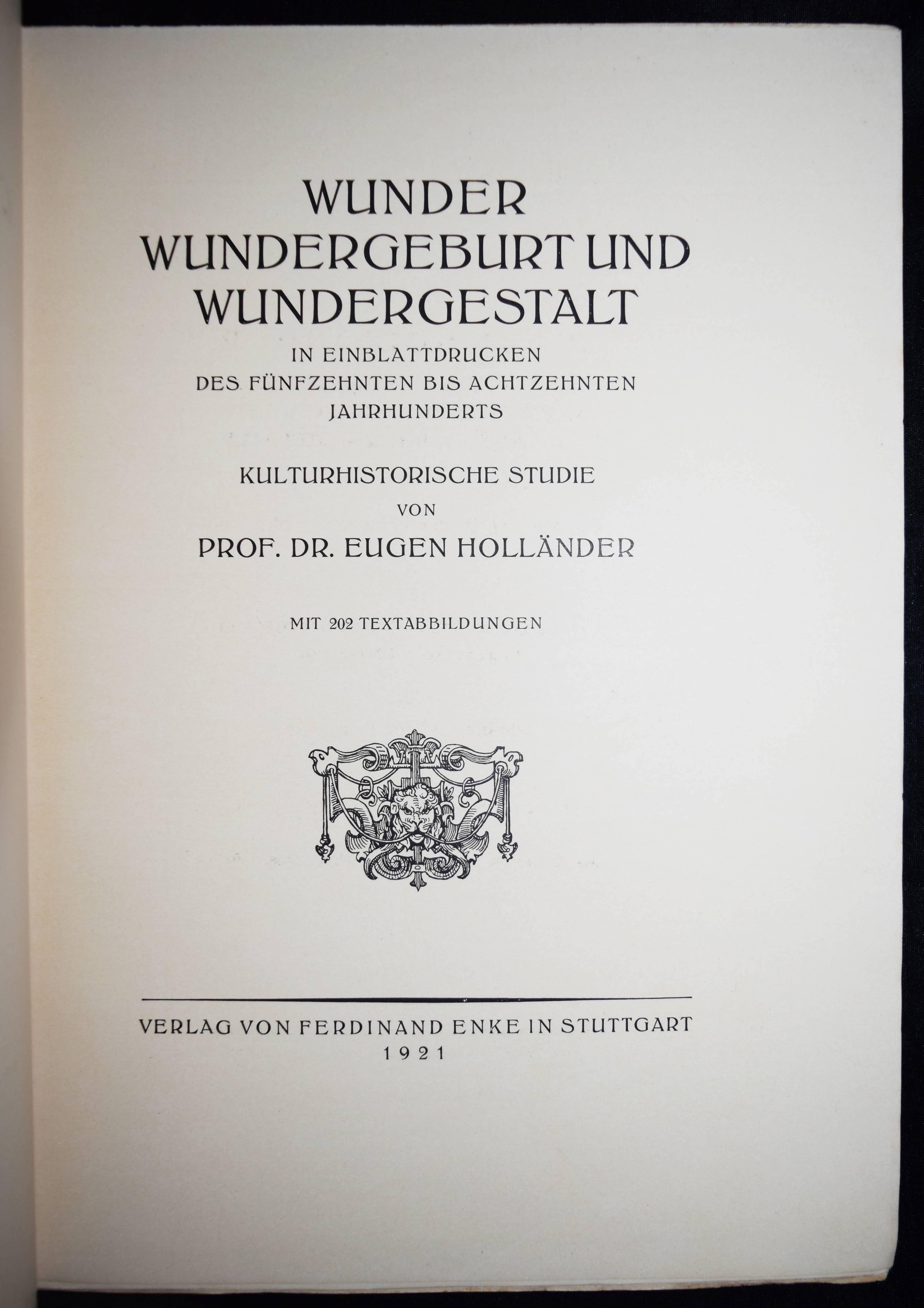 Holländer, Eugen. Wunder, Wundergeburt und Wundergestalt. In Einblattdrucken des fünfzehnten bis achtzehnten Jahrhunderts. Kulturhistorische Studie. Stuttgart, Enke, 1921. 4°. XVI, 373 S. mit 202 Abb. Illustr. OHln. (Beiträge aus dem Grenzgebiet zwischen Medizingeschichte und Kunst, Kultur, Literatur, Band 4). Einband angestaubt und etwas fleckig, gutes Exemplar.