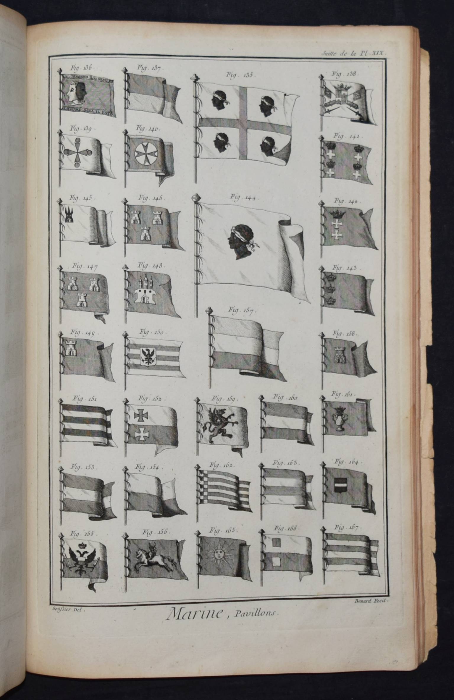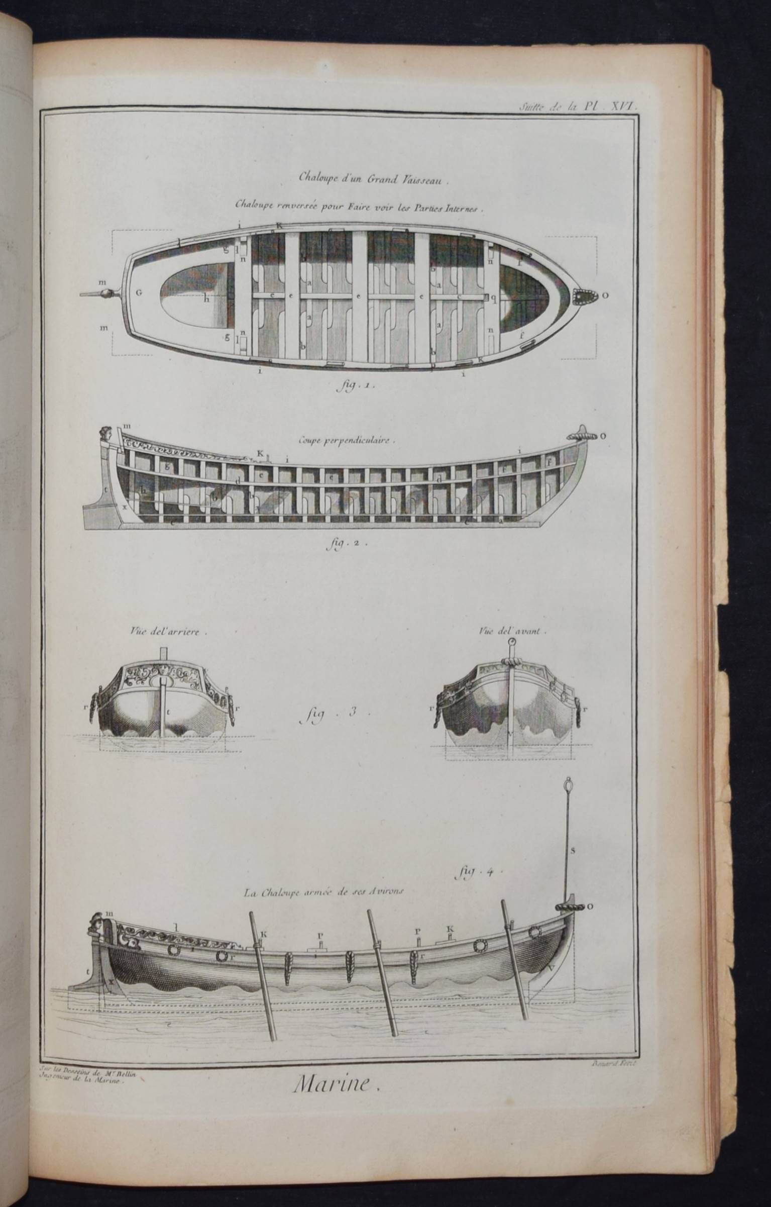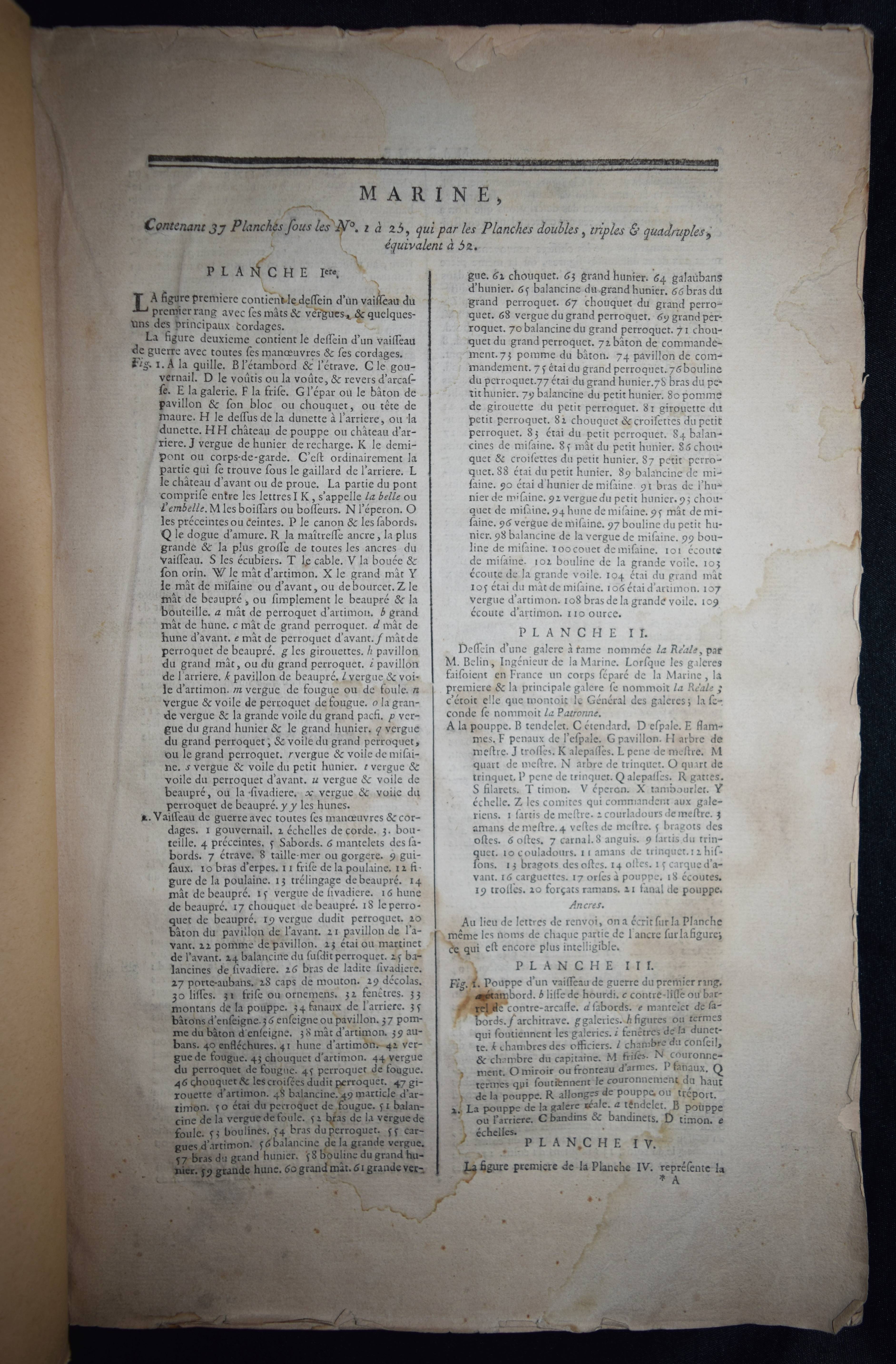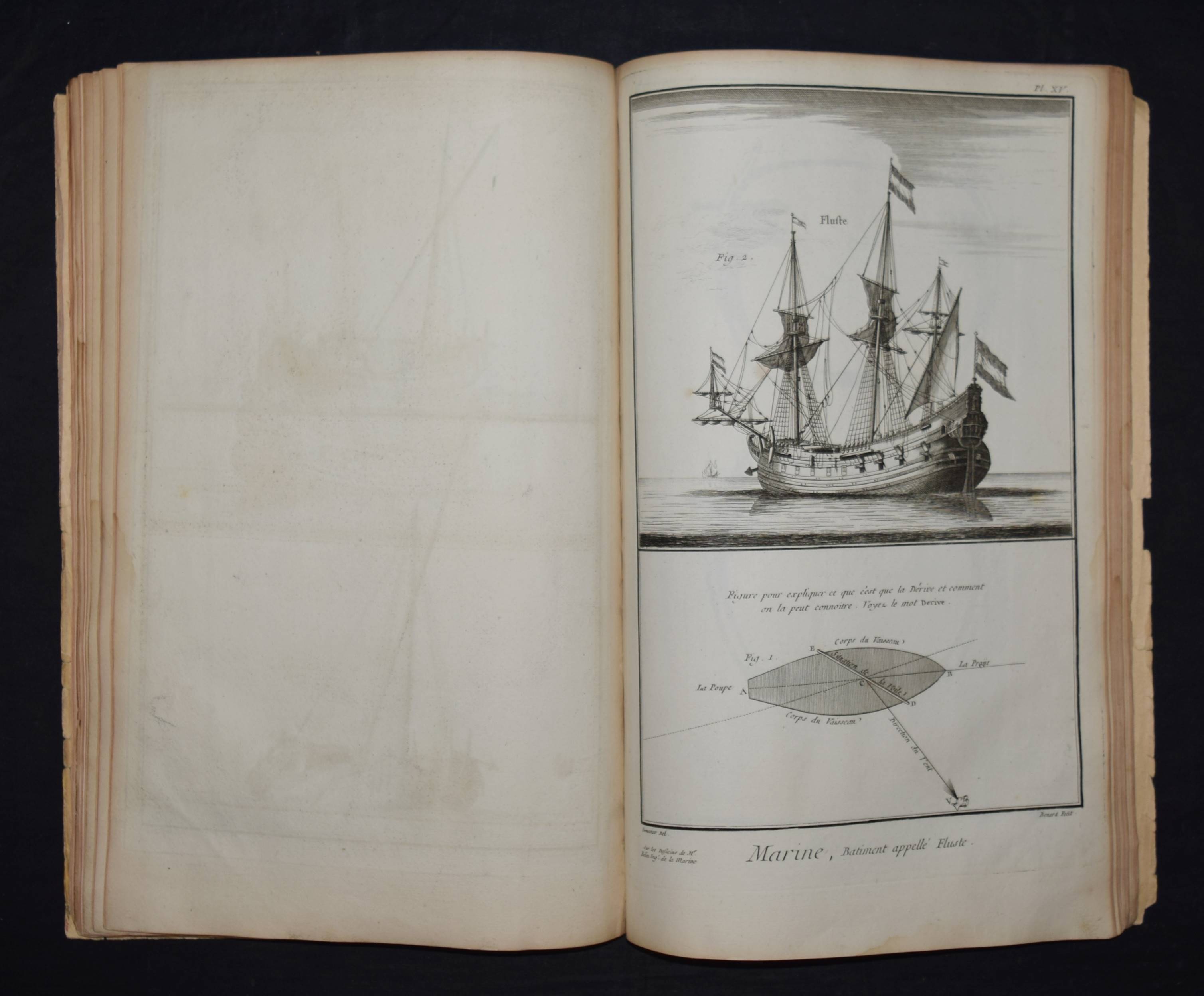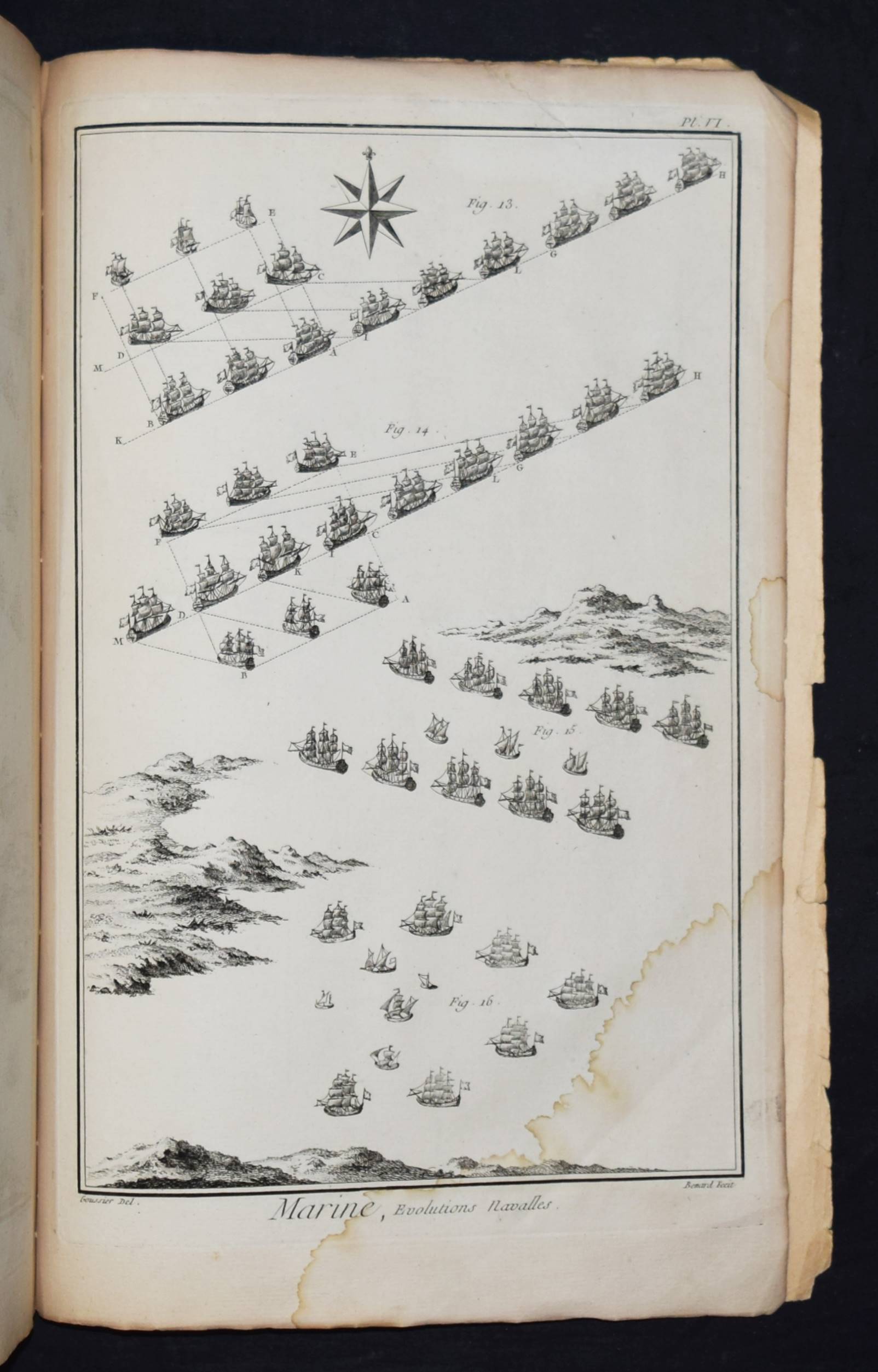 Marine – Goussier, (Louis Jacques) et (Jacques Renaud) Benard. Marine. Contenant 37 planches sous les No. 1 à 25, qui par les planches doubles, triples & quadruples, équivalent à 52. (Und): Marine, évolutions navales. 2 Teile in 1 Band. Paris (1787). Folio (39 x 26 cm.). 12 S., 37 (5 doppelblattgr., 4 gefalt.) Kupfertafeln; [1] Bl., 7 Kupfertafeln. Marmorierter Papierumschlag. Graesse II, 389. – Interessante Folge von 44 Kupfertafeln aus der berühmten Encyclopedie von Denis Diderot und Jean Le Rond d’Alembert (″Encyclopédie, ou dictionnaire raisonné des sciences, des art et des métiers…“) zur Marine und Schiffsbau. – Die schönen großformatiken Tafeln zeigen prächtige Segelschiffe, ihren Bau und verschiedene Flaggen, die Tafeln im Anhang veranschaulichen die Navigation auf See. – Der franz. Kupferstecher J. R. Bénard (eig. 1731-1794) hat mindestens 1500 Tafeln für die Encyclopedie gestochen; davon zahlreiche nach Vorlagen des Mathematikers und Zeichners L.-J. Goussier (1722-1799). Goussier wurde 1747 von d’Alembert für die Encyclopédie gewonnen und die Arbeit von Handwerksbetrieben in ganz Frankreich dokumentiert. – Rücken etwas berieben, Umschlag mit geringen Randläsuren, Textteil etwas braunfleckig, wenige Tafel im rechten Rand etwas wasserfleckig, sonst gut erhaltene Folge.