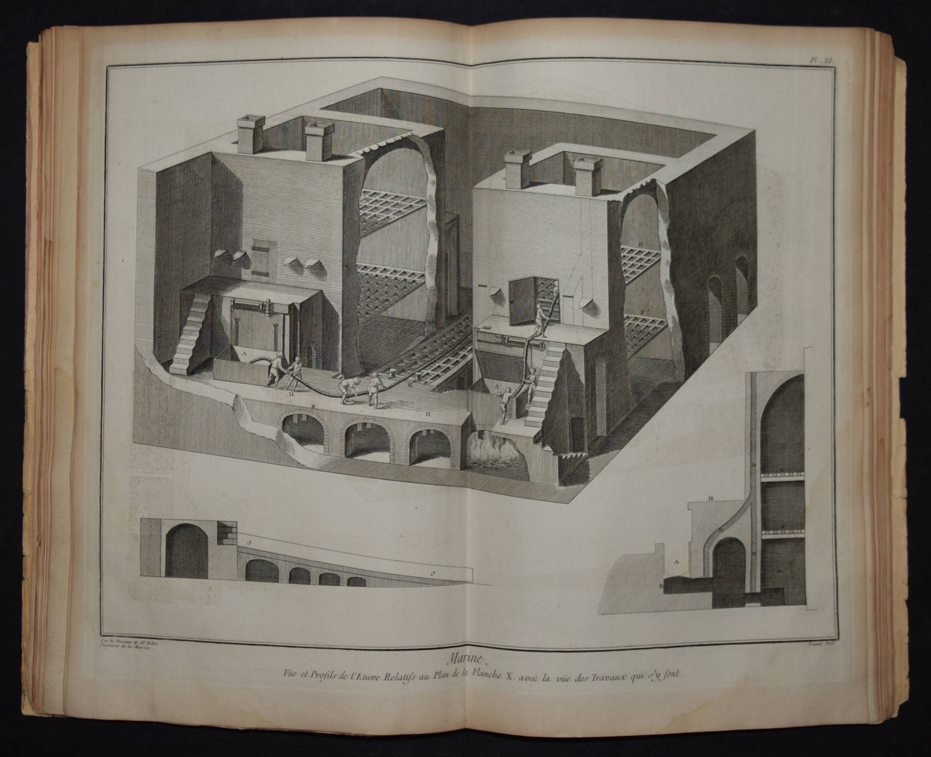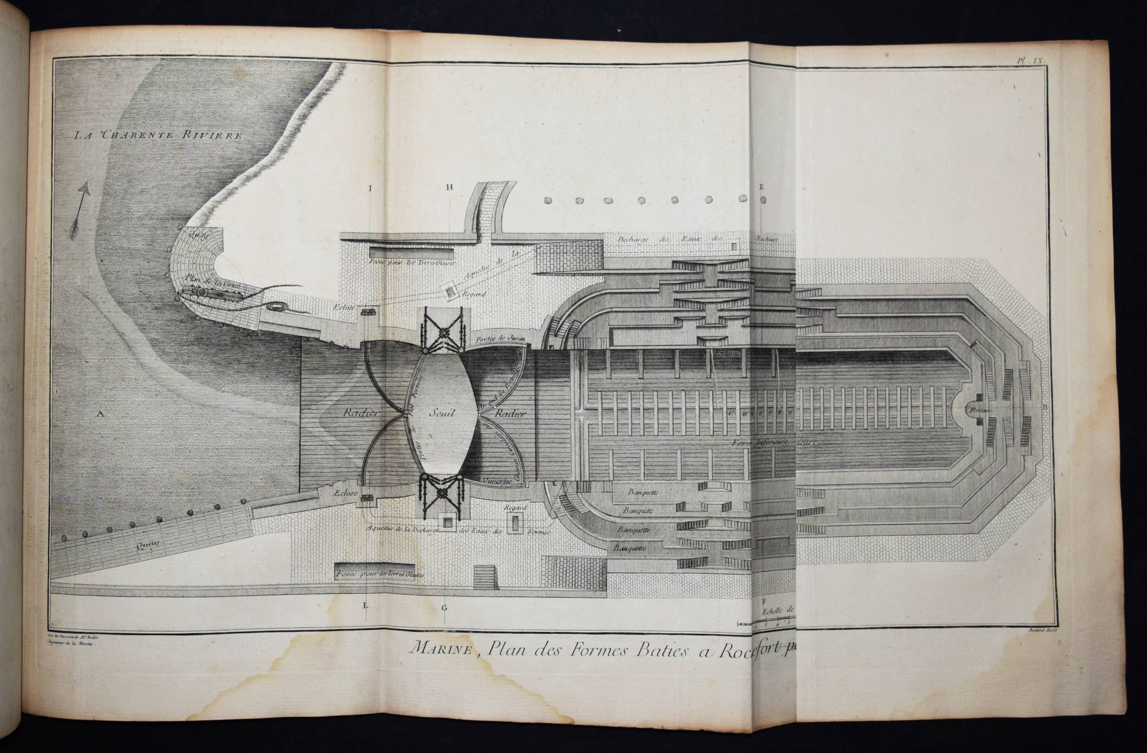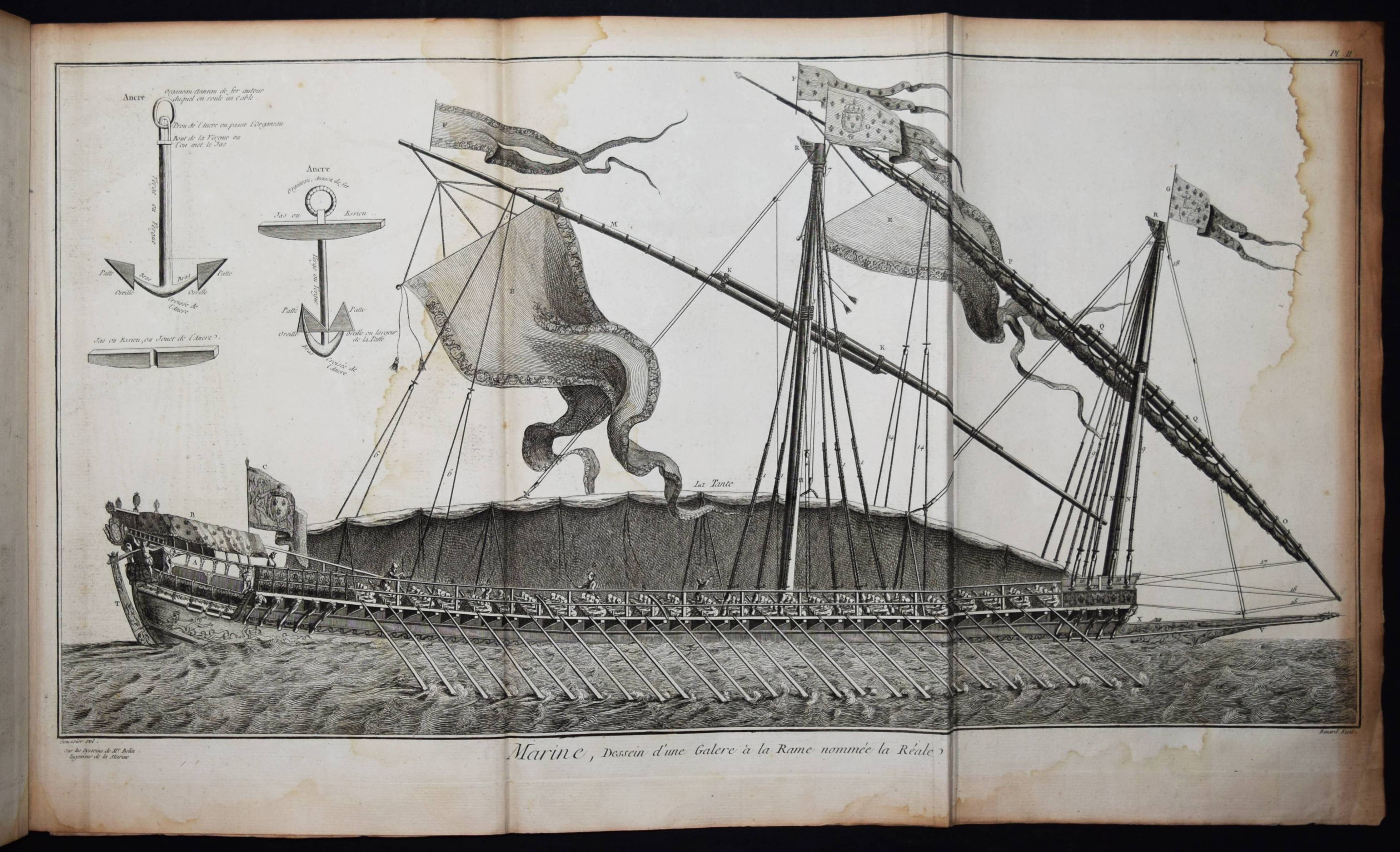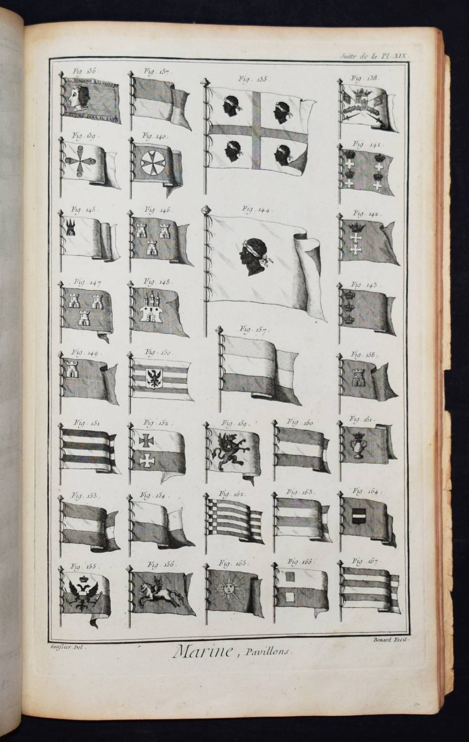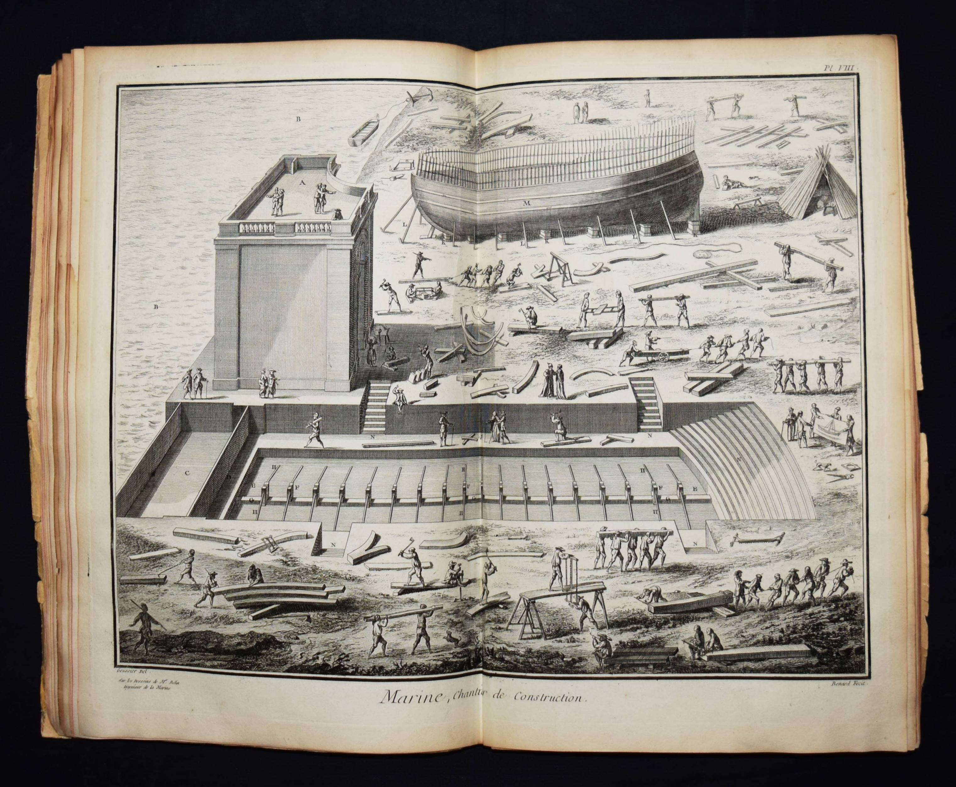 Marine – Goussier, (Louis Jacques) et (Jacques Renaud) Benard. Marine. Contenant 37 planches sous les No. 1 à 25, qui par les planches doubles, triples & quadruples, équivalent à 52. (Und): Marine, évolutions navales. 2 Teile in 1 Band. Paris (1787). Folio (39 x 26 cm.). 12 S., 37 (5 doppelblattgr., 4 gefalt.) Kupfertafeln; [1] Bl., 7 Kupfertafeln. Marmorierter Papierumschlag. Graesse II, 389. – Interessante Folge von 44 Kupfertafeln aus der berühmten Encyclopedie von Denis Diderot und Jean Le Rond d’Alembert (″Encyclopédie, ou dictionnaire raisonné des sciences, des art et des métiers…“) zur Marine und Schiffsbau. – Die schönen großformatiken Tafeln zeigen prächtige Segelschiffe, ihren Bau und verschiedene Flaggen, die Tafeln im Anhang veranschaulichen die Navigation auf See. – Der franz. Kupferstecher J. R. Bénard (eig. 1731-1794) hat mindestens 1500 Tafeln für die Encyclopedie gestochen; davon zahlreiche nach Vorlagen des Mathematikers und Zeichners L.-J. Goussier (1722-1799). Goussier wurde 1747 von d’Alembert für die Encyclopédie gewonnen und die Arbeit von Handwerksbetrieben in ganz Frankreich dokumentiert. – Rücken etwas berieben, Umschlag mit geringen Randläsuren, Textteil etwas braunfleckig, wenige Tafel im rechten Rand etwas wasserfleckig, sonst gut erhaltene Folge.