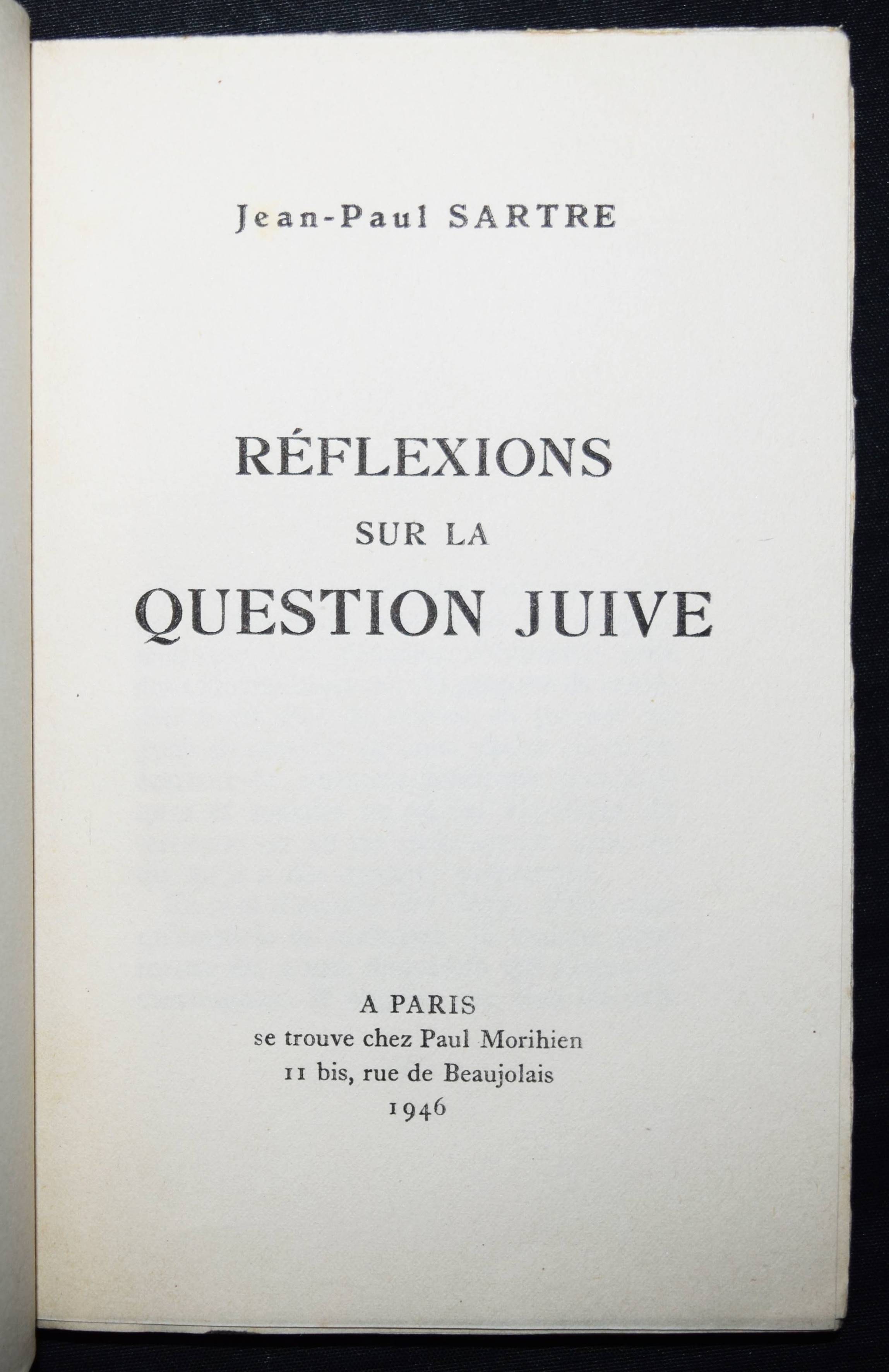 Sartre, Jean-Paul. Réflexions sur la question juive. Paris, Morihien 1946. 8°. 198 S., [1] Bl. OKart. Erste Ausgabe. – Eines von 3000 Exemplaren auf Vélin Alfa. – Rückendeckel etwas gebräunt, gutes Exemplar.