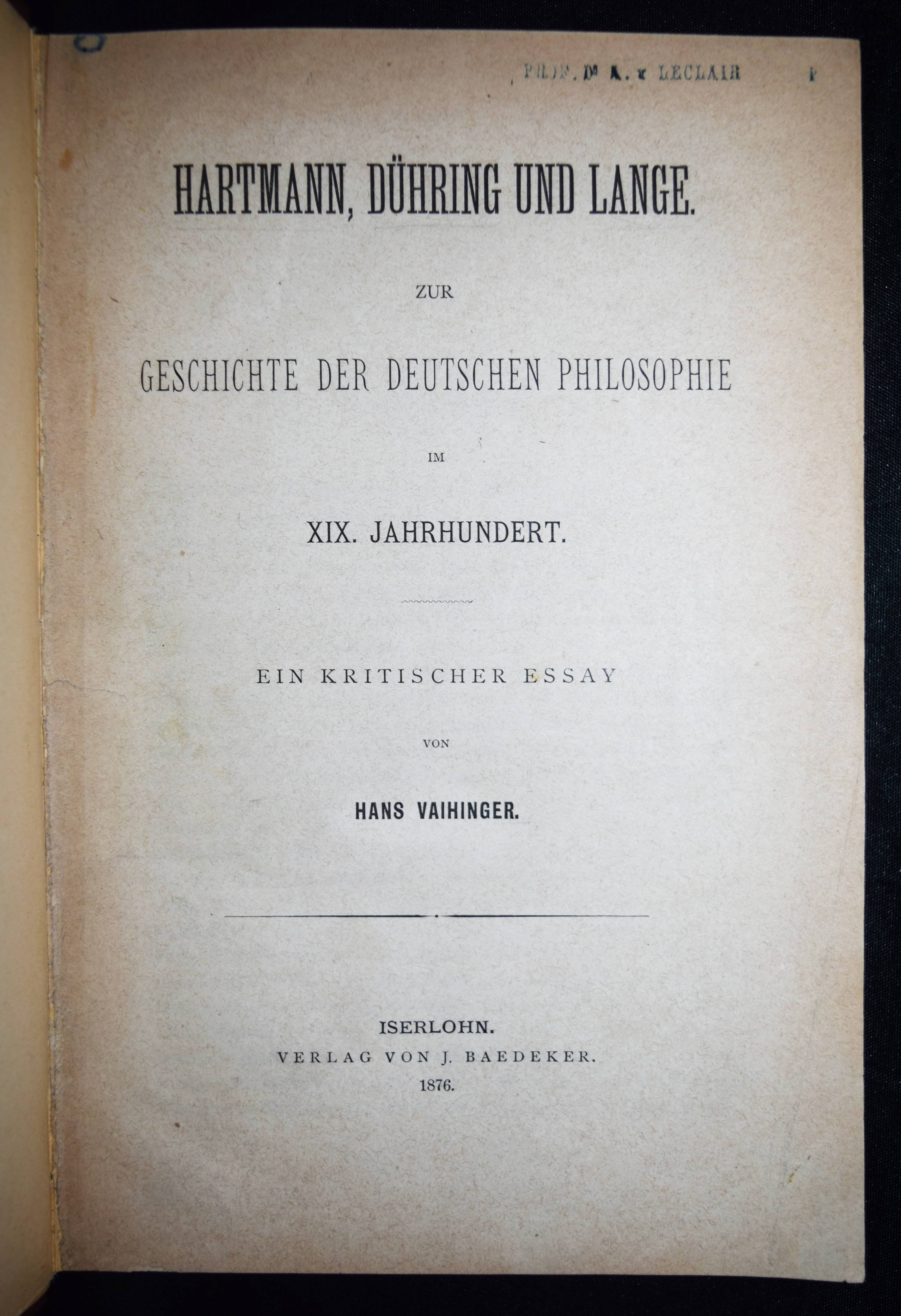 Vaihinger, Hans. Hartmann, Dühring und Lange. Zur Geschichte der deutschen Philosophie im 19. Jahrhundert. Ein kritischer Essay. Iserlohn, J. Baedeker 1876. 8°. XII, 235 S. Hln. mit goldgepr. Rückentitel. Ziegenfuß II, 767 f. – Erste Ausgabe der ersten Veröffentlichung. – H. Vaihingers (1852-1933) „philosophische Bedeutung beruht auf seiner Begründung und selbstständigen Ausgestaltung einer Lehre von den Fiktionen (″Fiktionalismus“), die er in seiner „Philosophie des Als-Ob“ (1911) systematisch gliedert. V. bezeichnet seine philosophische Grundeinstellung als „positivistischen Idealismus“ oder „idealistischen Posivismus“ (W. Ziegenfuss). – Stellenweise Buntstiftanstreichungen im weißen Rand, gutes Exemplar.