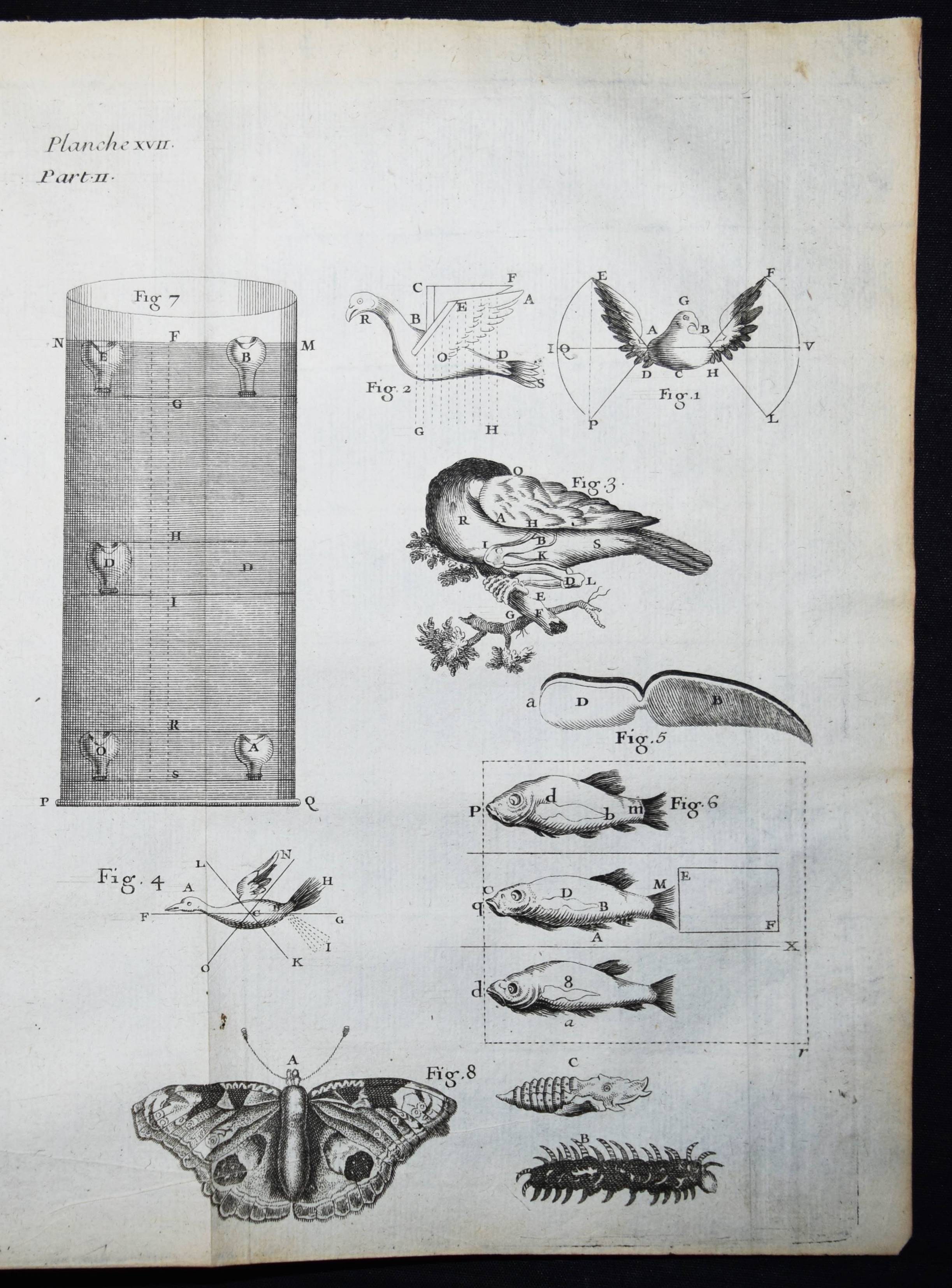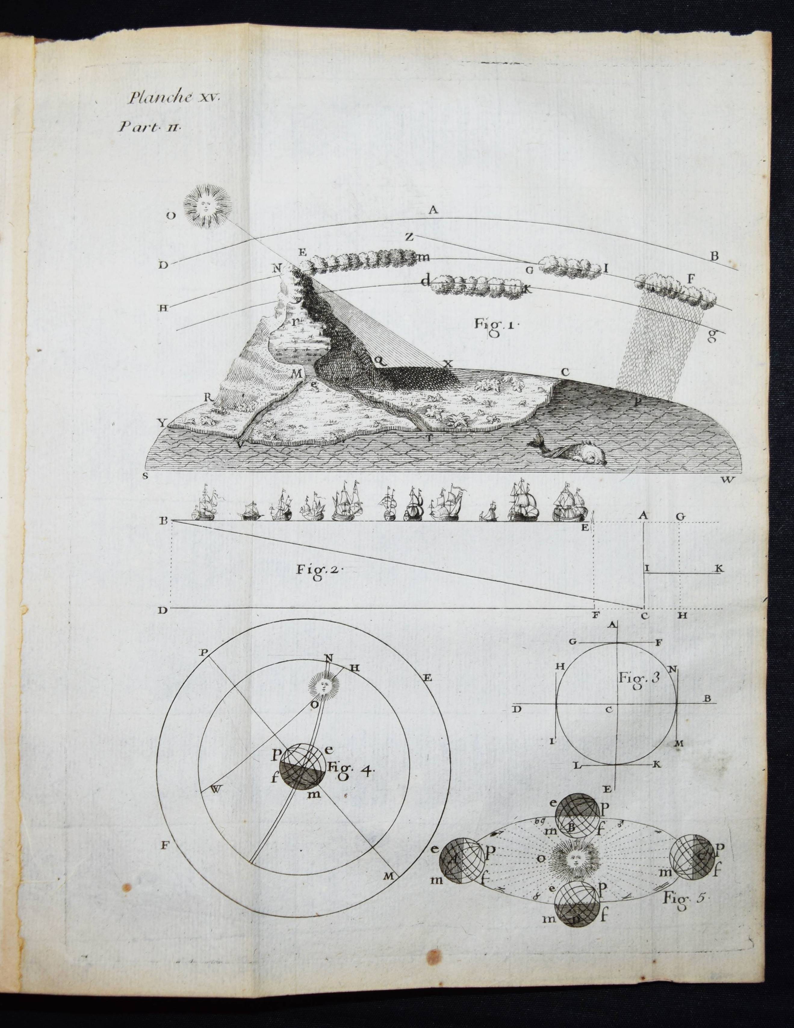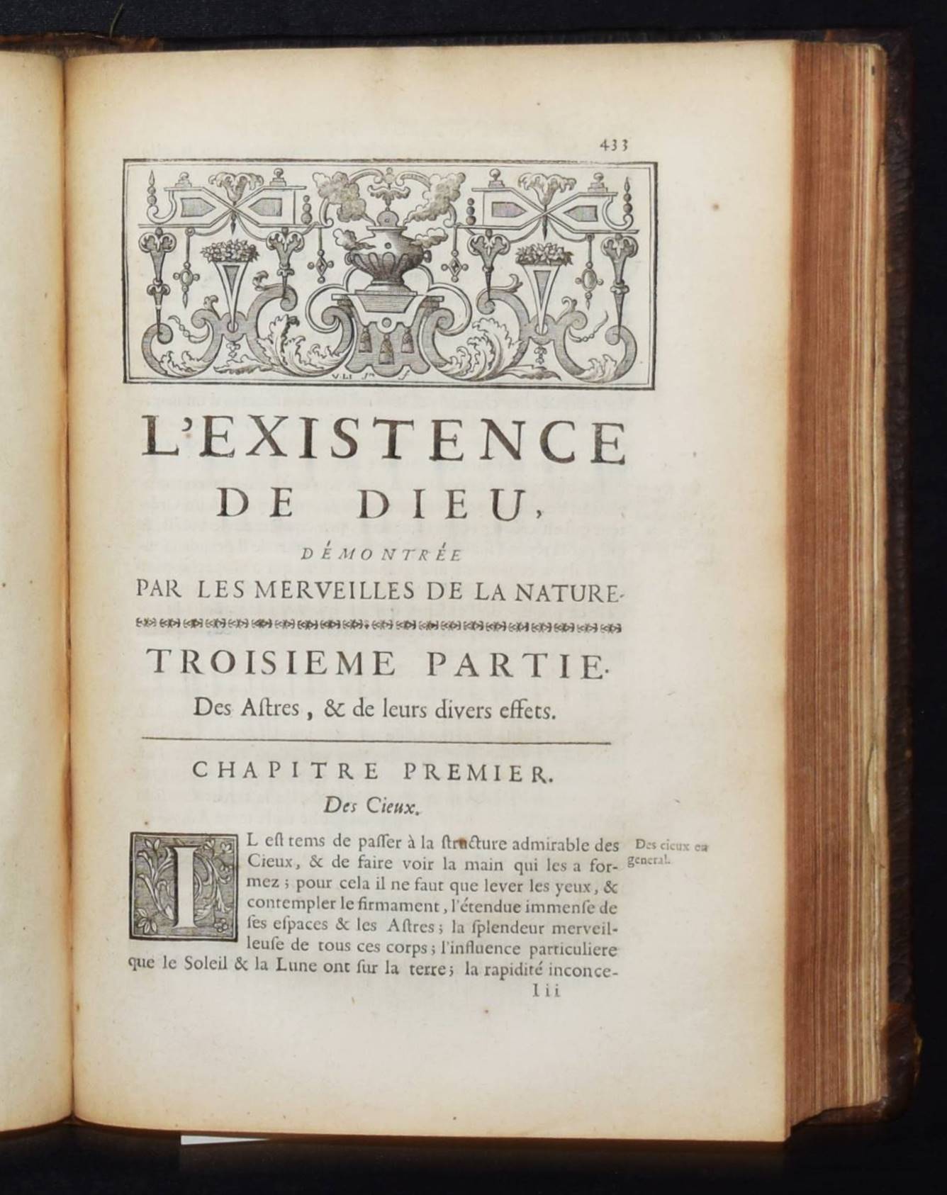 (Nieuwentijt auch Nieuwentyt, Bernard). L’existence de Dieu démontrée par les merveilles de la nature. En trois parties; ou l’on traite de la structure du corps de l’homme, des elemens, des astres, & de leurs divers effets. Avec des figures en taille-douce. 3 Teile in 1 Band. Paris, Jacques Vincent 1725. Gr.-8°. XXVII, 681, (3) S. mit 29 gefalt. Kupfertafeln. Kalbslederband der Zeit mit goldgepr. Rückenschild u. reicher Rückenvergoldung. Bierens de Haan 3563. Hirsch/Hüb. IV, 370. Poggendorff II, 289. – Erste französische Ausgabe; die niederl. Originalausgabe (″Het regt gebruik der wereltbeschouwingen, ter overtuiginge van ongodisten en ongelovigen“) erschien 1714. – Das seinerzeit vielbeachtete und oft übersetzte Werk gilt neben William Derhams Physico-Theology als eines der ersten dieser Art. – „Was intended to demonstrate the existence of God by teleological arguments. Never before has this been tried on such a scale, and none among Nieuwentijt’s numerous imitators equaled his completeness“ (DSB). – Die Tafeln mit anatomischen, zoologischen, technischen und astronomischen Darstellungen. – Der niederl. Philosoph, Mathematiker und Arzt B. Nieuwentijt (1654-1718) „versuchte die Existenz des Göttlichen durch die teleologische Beweisführung zu erreichen. Heftig kritisierte er den Rationalismus und Spinozismus mit wissenschaftsbezogenen methodologischen Argumenten. Seine Ideen beruhen darauf, dass Naturgesetze eine kontingente Geltung haben, d. h., sie sind zwischen einer idealen Wahrheit (die stets hypothetisch bzw. voraussetzungsabhängig ist) und erfahrungsabhängigen Tatsachenwahrheiten verortet. Er kritisiert, unter anderem, auch die Verwendung von unendlich kleinen Größen wie Isaac Newton sie vorgeschlagen hat und die Einführung von höheren Differentialen von Gottfried Wilhelm Leibniz“ (AnthroWiki). – Vorderes Gelenk im unteren Drittel angeplatzt, schönes Exlibris eines franz. Arztes, vord. freies Vorsatzblatt fehlt, die 2. Kupfertafel am Genital der dargestellteten Figur mit Tinte „zensiert“, 2 Tafeln fleckig, sonst nur vereinzelt leicht braunfleckig, gutes Exemplar.