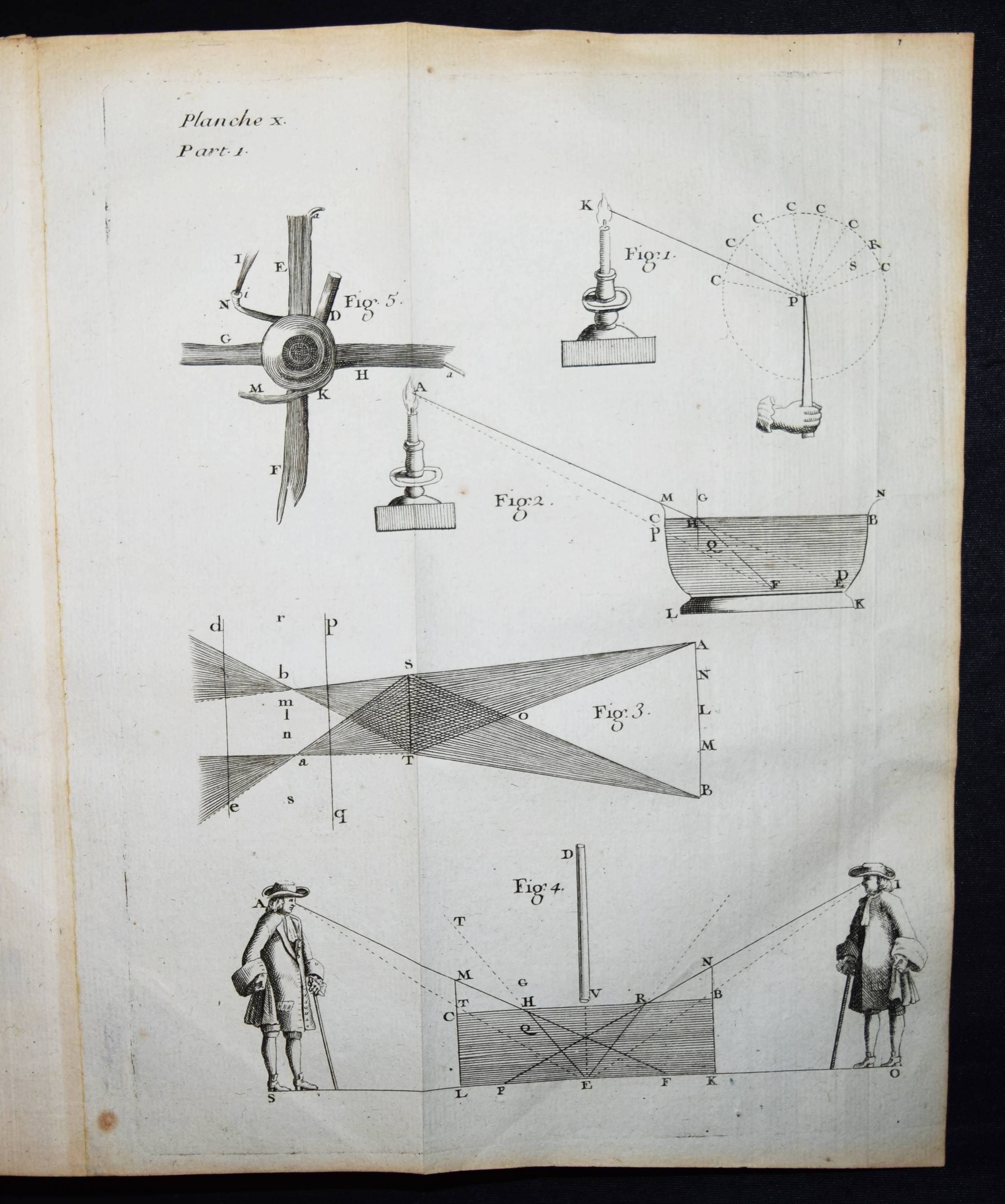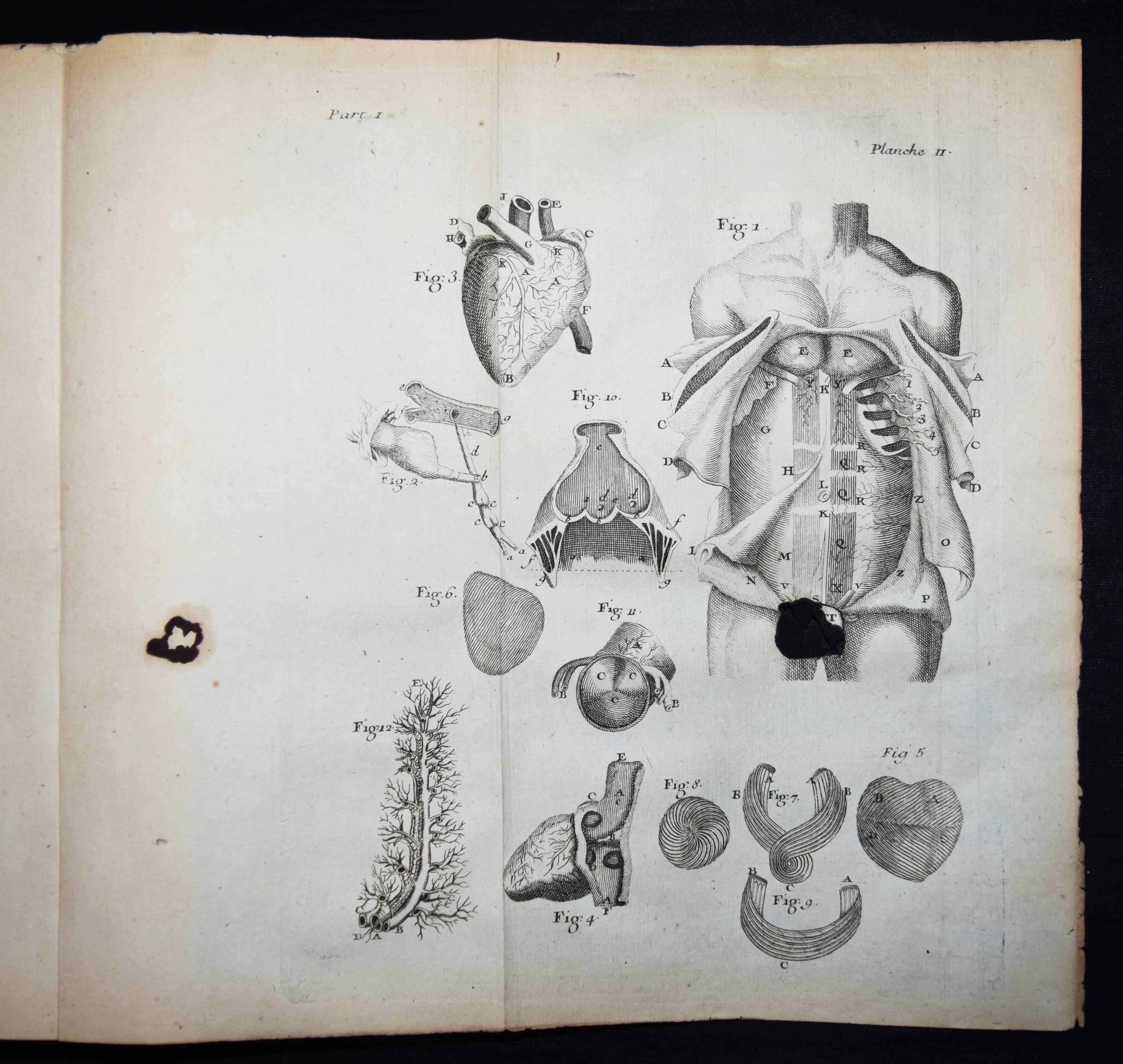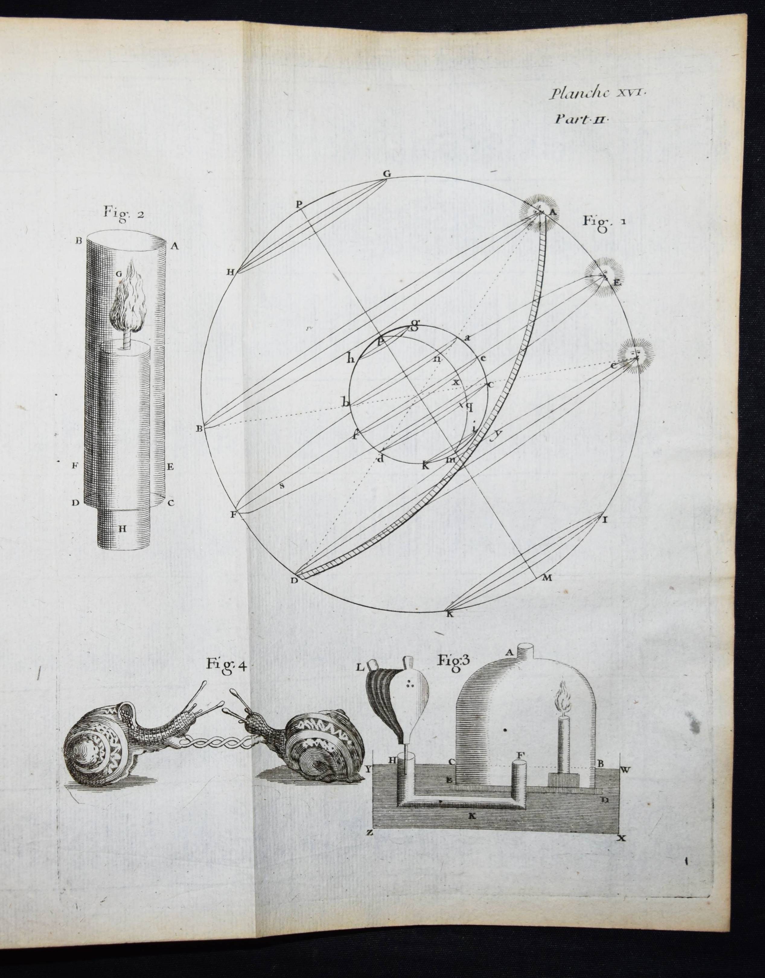 (Nieuwentijt auch Nieuwentyt, Bernard). L’existence de Dieu démontrée par les merveilles de la nature. En trois parties; ou l’on traite de la structure du corps de l’homme, des elemens, des astres, & de leurs divers effets. Avec des figures en taille-douce. 3 Teile in 1 Band. Paris, Jacques Vincent 1725. Gr.-8°. XXVII, 681, (3) S. mit 29 gefalt. Kupfertafeln. Kalbslederband der Zeit mit goldgepr. Rückenschild u. reicher Rückenvergoldung. Bierens de Haan 3563. Hirsch/Hüb. IV, 370. Poggendorff II, 289. – Erste französische Ausgabe; die niederl. Originalausgabe (″Het regt gebruik der wereltbeschouwingen, ter overtuiginge van ongodisten en ongelovigen“) erschien 1714. – Das seinerzeit vielbeachtete und oft übersetzte Werk gilt neben William Derhams Physico-Theology als eines der ersten dieser Art. – „Was intended to demonstrate the existence of God by teleological arguments. Never before has this been tried on such a scale, and none among Nieuwentijt’s numerous imitators equaled his completeness“ (DSB). – Die Tafeln mit anatomischen, zoologischen, technischen und astronomischen Darstellungen. – Der niederl. Philosoph, Mathematiker und Arzt B. Nieuwentijt (1654-1718) „versuchte die Existenz des Göttlichen durch die teleologische Beweisführung zu erreichen. Heftig kritisierte er den Rationalismus und Spinozismus mit wissenschaftsbezogenen methodologischen Argumenten. Seine Ideen beruhen darauf, dass Naturgesetze eine kontingente Geltung haben, d. h., sie sind zwischen einer idealen Wahrheit (die stets hypothetisch bzw. voraussetzungsabhängig ist) und erfahrungsabhängigen Tatsachenwahrheiten verortet. Er kritisiert, unter anderem, auch die Verwendung von unendlich kleinen Größen wie Isaac Newton sie vorgeschlagen hat und die Einführung von höheren Differentialen von Gottfried Wilhelm Leibniz“ (AnthroWiki). – Vorderes Gelenk im unteren Drittel angeplatzt, schönes Exlibris eines franz. Arztes, vord. freies Vorsatzblatt fehlt, die 2. Kupfertafel am Genital der dargestellteten Figur mit Tinte „zensiert“, 2 Tafeln fleckig, sonst nur vereinzelt leicht braunfleckig, gutes Exemplar.