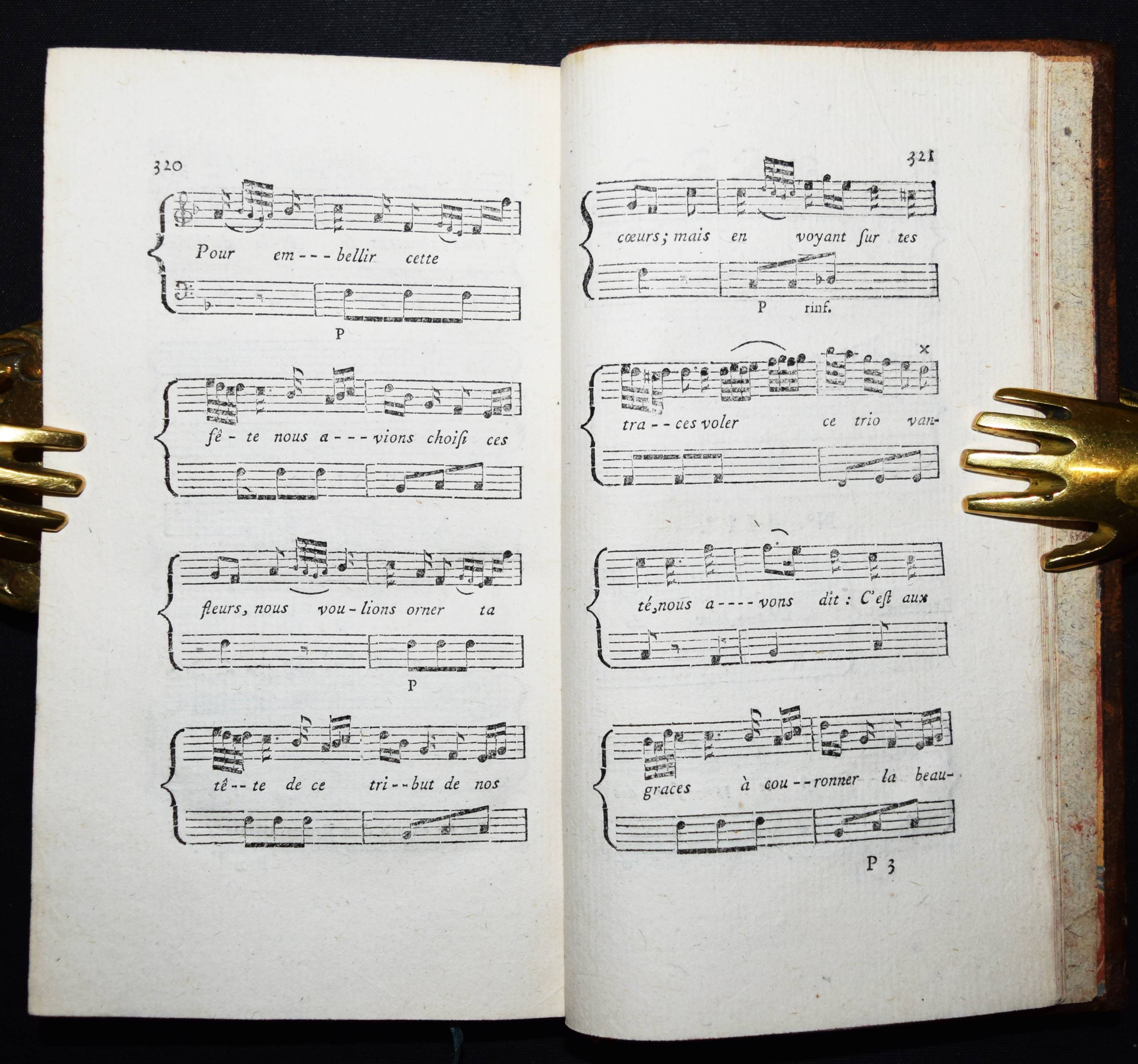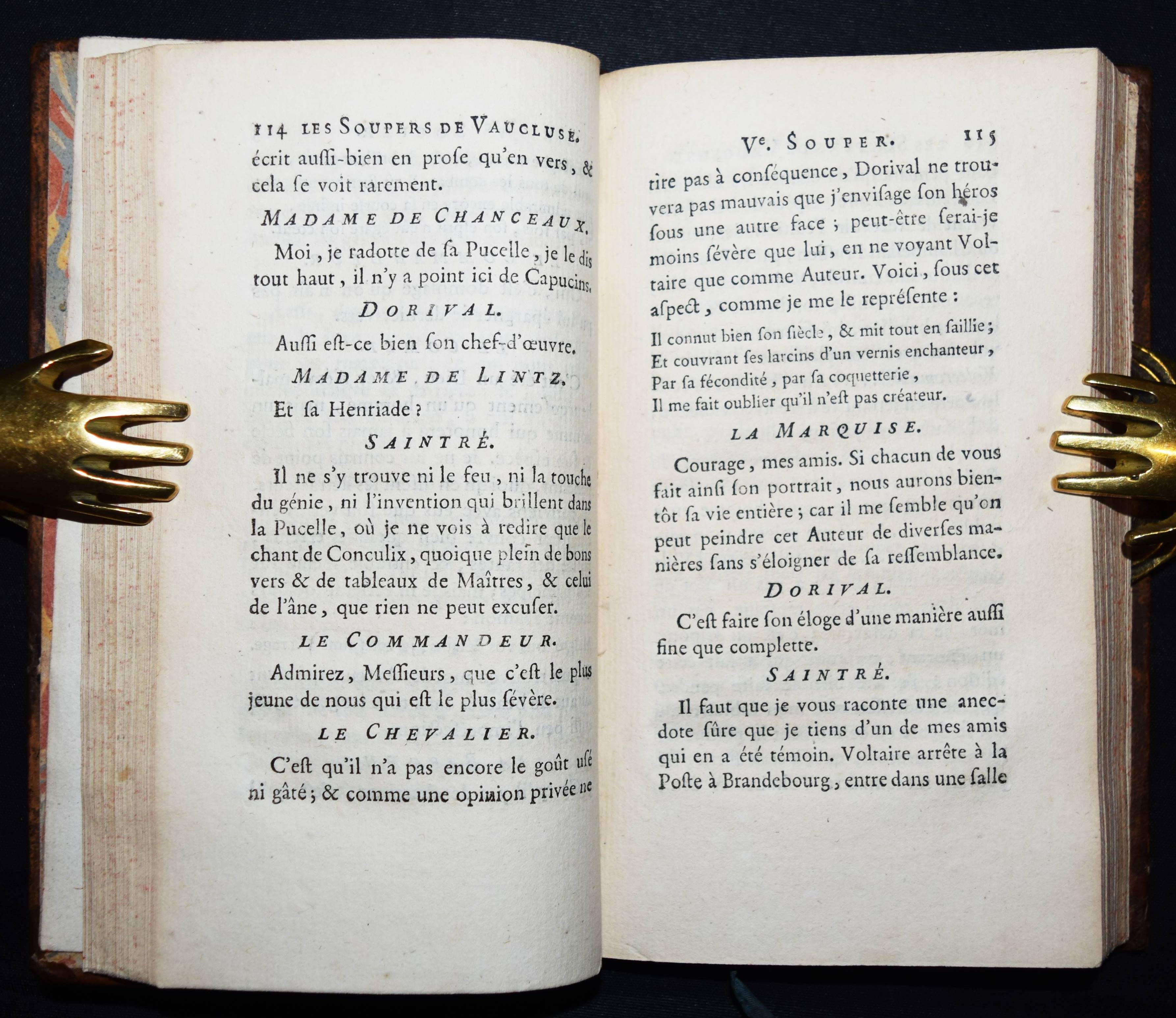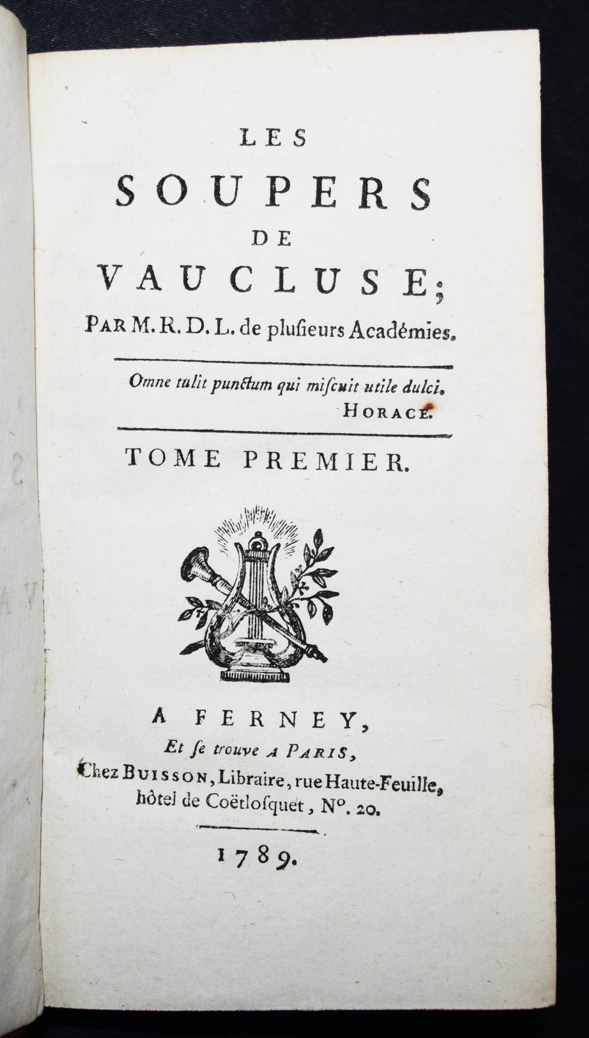 (Renaud de La Grelaye). Soupers de Vaucluse. Par M.R.D.L. de plusieurs académies. (Suivi Voyage de Paris en Corse en 1776). 3 Bände. Ferney, Paris, (Citoyen) Buisson 1789. Kl.-8°. XII, 332 S., [1] Bl.; [2] Bl., 363, (1) S.; [2] Bl., 296 S., [1] Bl. mit 46 S. Musikbeilagen. Kalbslederbände der Zeit mit goldgepr. Rückensch. u. dekorativer Rückenvergoldung. Barbier IV, 350 u. 537 a u. Quérard VII, 525 (geben beide fälschlich Restif de la Bretonne als Verfasser an). – Erste Ausgabe. – Berühmte Sammlung humoristischer Kurzgeschichten über Feste und die Gastronomie des 18. Jahrhunderts in Frankreich. Jeder Band am Ende mit Musikbeilagen. Am Ende von Band III (S. 180 ff.) berichtet der Verfasser von einer Reise nach Korsika durch die Champagne, Bourgogne, Lyonnais und Provence nach Toulon. – „Eine mehr unterhaltende, als belehrende Reisebeschreibung im Geschmacke der Franzosen Chapelle, Coyer etc. Denn auch Verse sind eingemischt.“ (Aus einer zeitgenöss. Rezension der deutschen Übersetzung von Friedrich Schulz, Königsberg 1796). – Schönes sauberes und dekorativ gebundenes Exemplar.