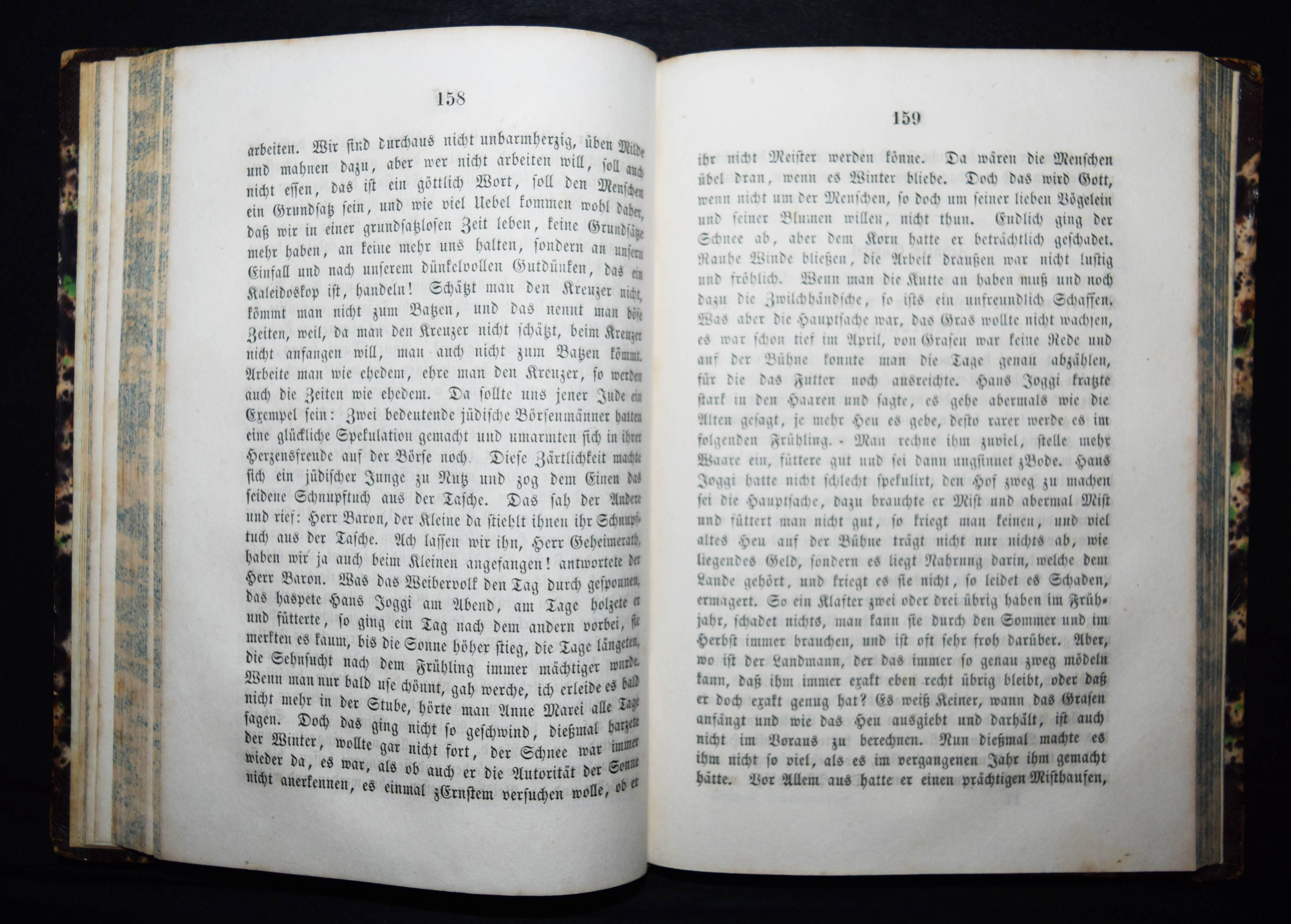 Gotthelf, Jeremias (d. i. Albert Bitzius). Erlebnisse eines Schuldenbauers. Berlin, Julius Springer 1854. Kl.-8°. VIII, 408 S. Hldr. d. Zt. mit goldgepr. Rückenschild u. Rückenvergoldung. ADB II, 685. Slg. Borst 2530. Junker/M. 488. W.-G.² 48. – Erste Ausgabe. – „Bitzius’ Romane und Erzählungen reagierten auf Zeitereignisse. Bezüglich vieler seiner Themen erwiesen sich Predigt und Journalistik als eigentliche Vorschule seines Erzählwerks. Jeder seiner 13 Romane entfaltet Aspekte europäischer Modernisierungs- und Säkularisierungskrisen, die im Titel von Zeitgeist und Bernergeist (1852) auf eine Formel gebracht werden. Die soziale Frage wird nicht nur im Bauernspiegel (1837), sondern auch in der Armennot (1840), den Leiden und Freuden eines Schulmeisters (1838-1839), in Uli der Knecht (1841) und in Erlebnisse eines Schuldenbauers (1854) thematisiert“ (R. Graf in HLS). – Rücken etwas berieben, Exlibris, Titelblatt braunfleckig, sonst gutes sauberes Exemplar.