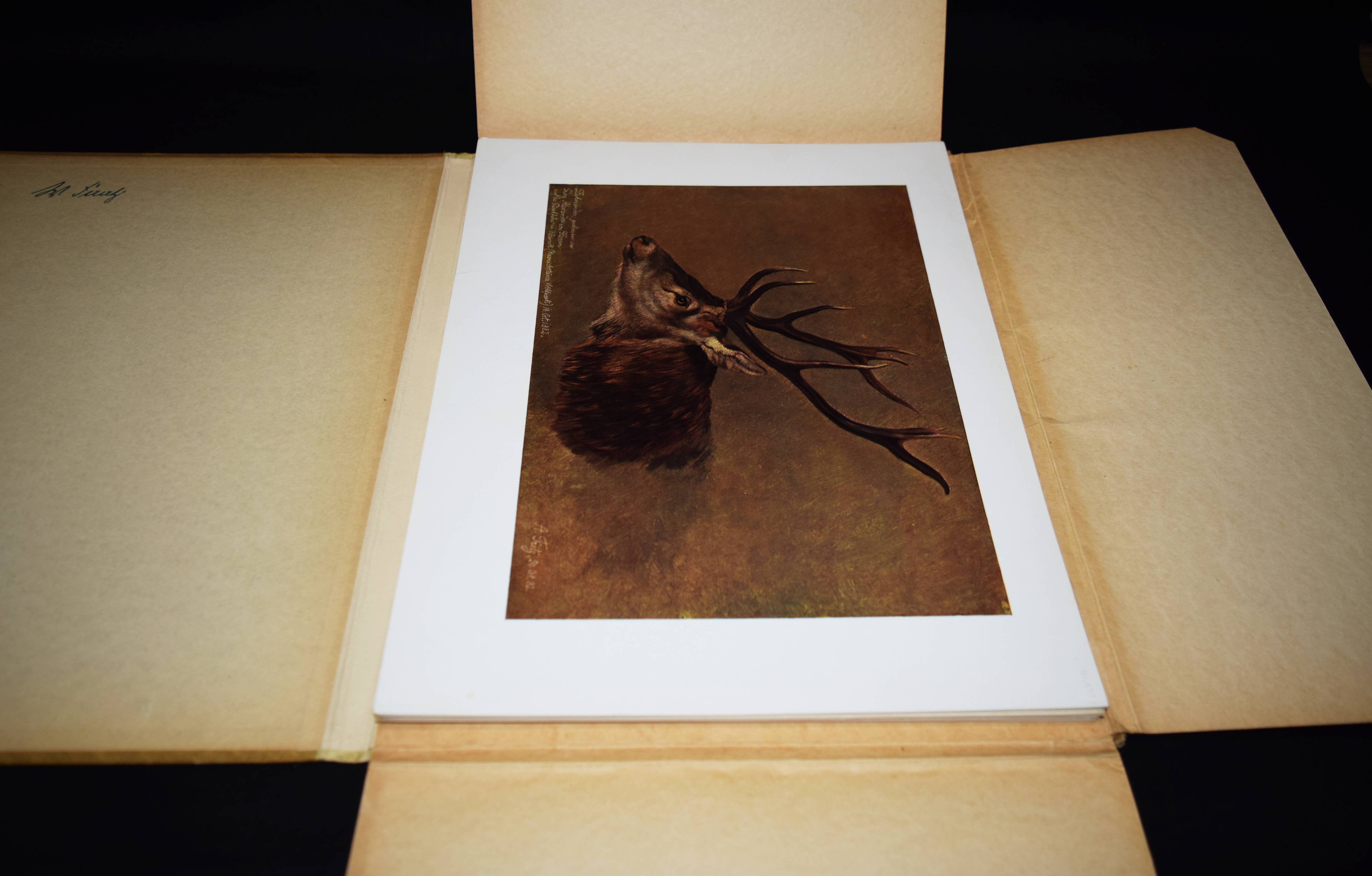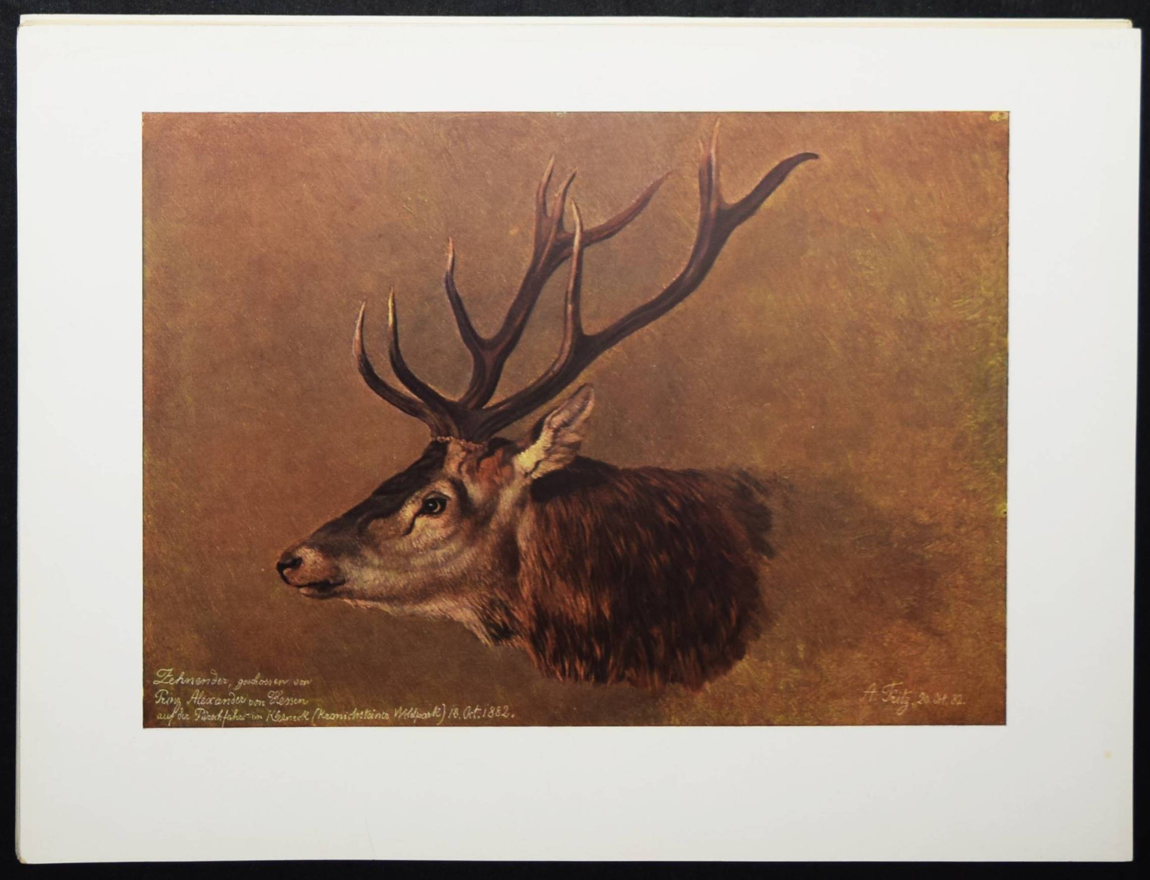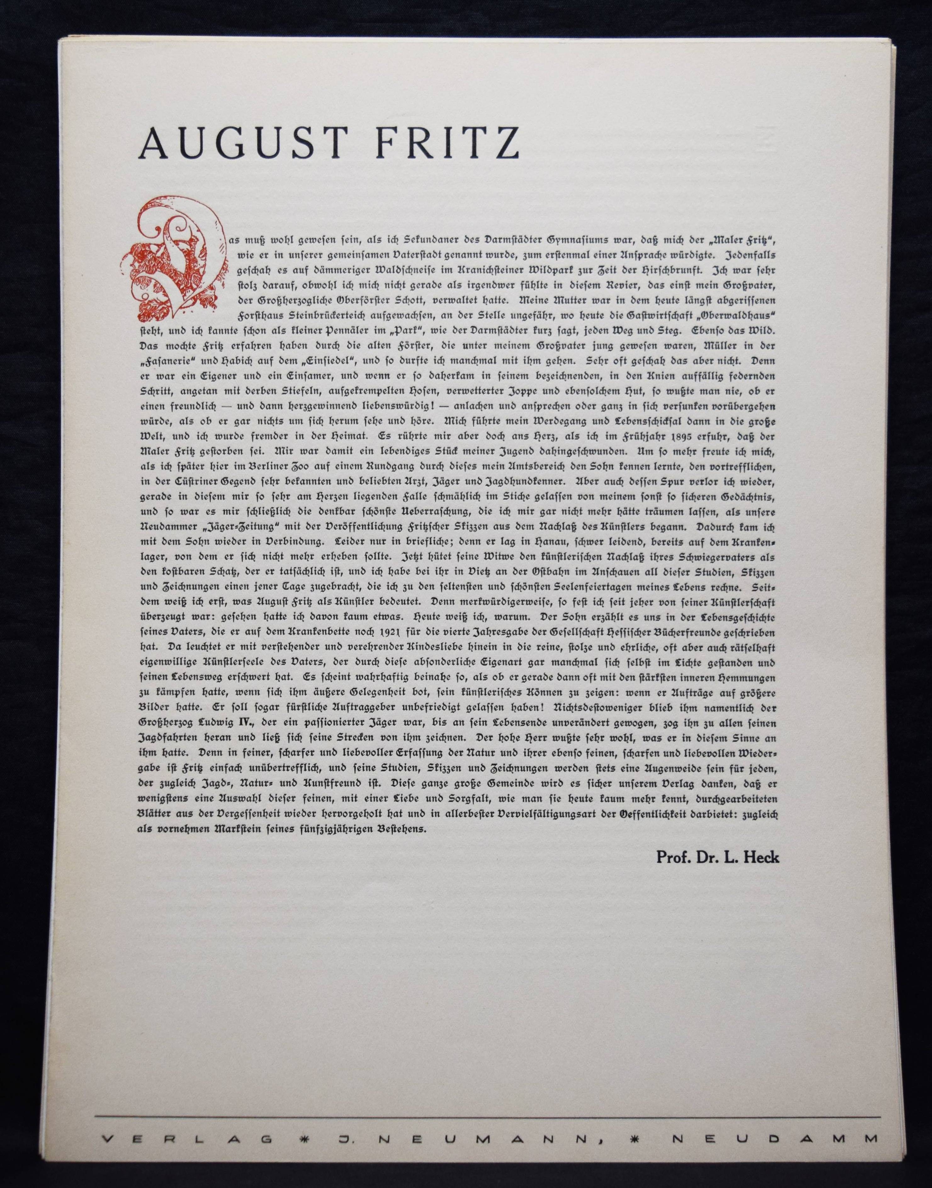 Fritz – Heck, L. August Fritz. Aus dem Nachlaß eines hessischen Wald- und Wildmalers. Neudamm, J. Neumann (1923). Folio (38 x 28 cm.). [4] S. (Text) u. 28 teils farb. Tafeln. Illustr. Orig.-Halbleinen-Flügelmappe. Eine Farbtafel im rechten w. Rand beschnitten, sonst sehr gut erhalten.