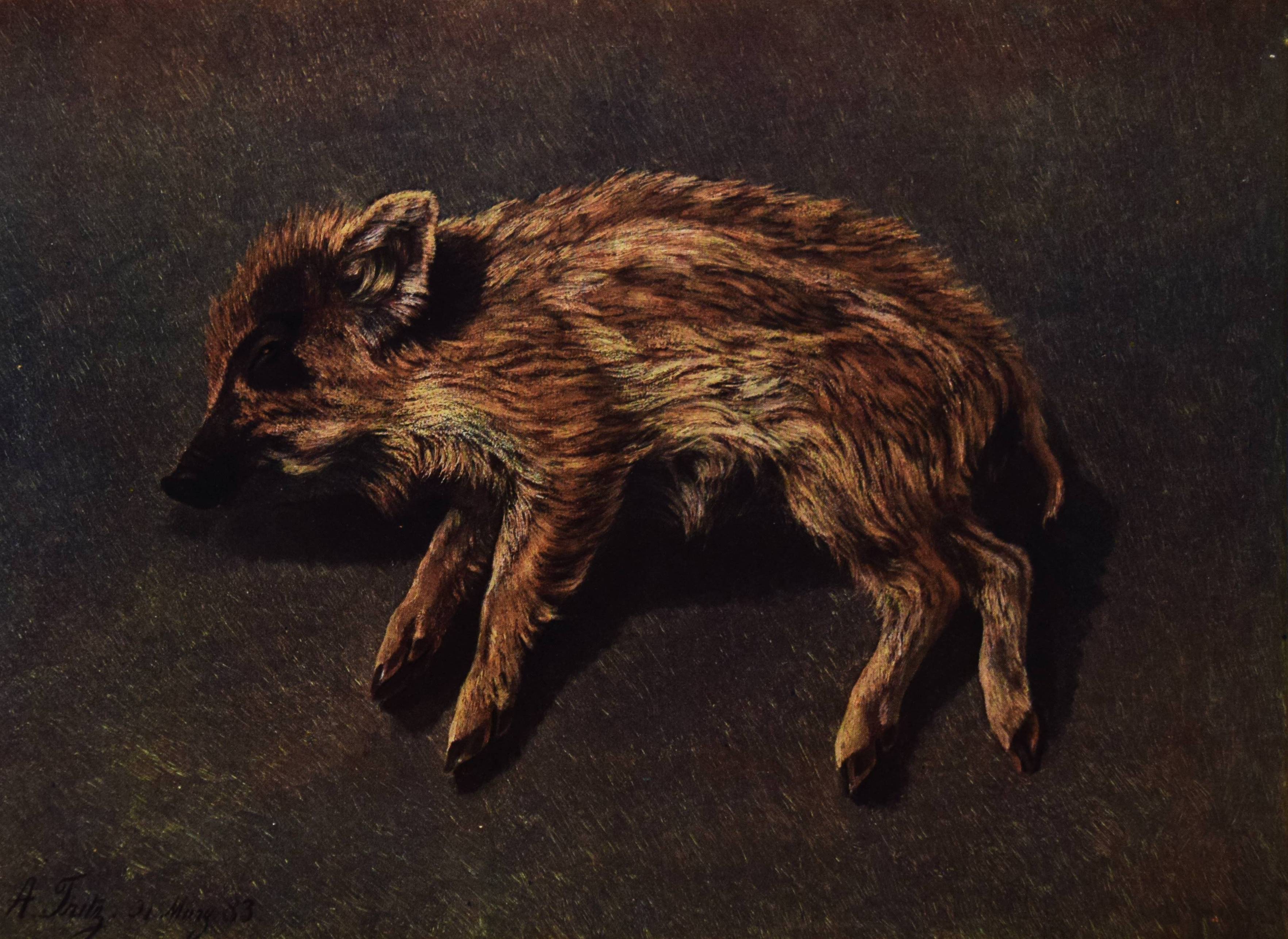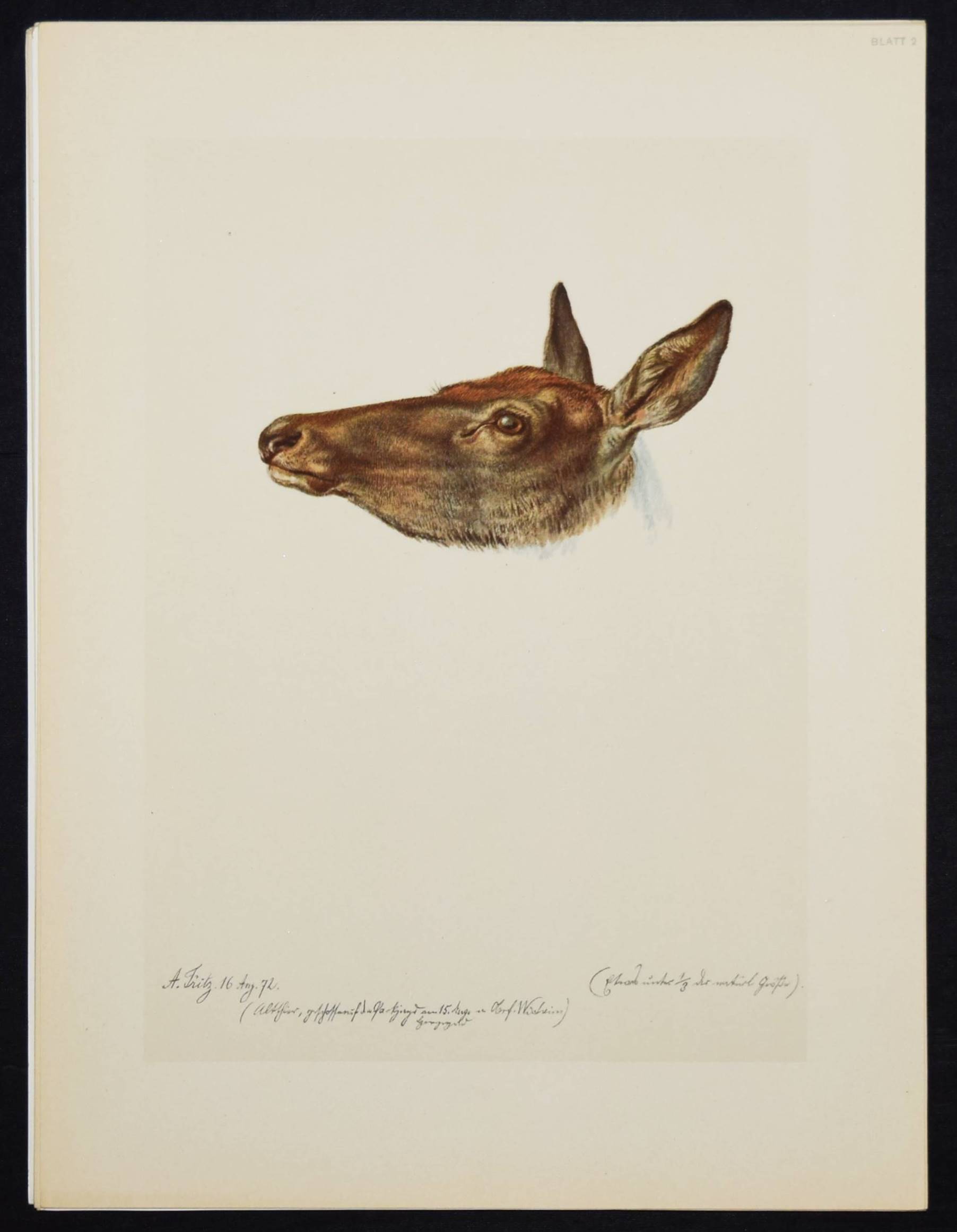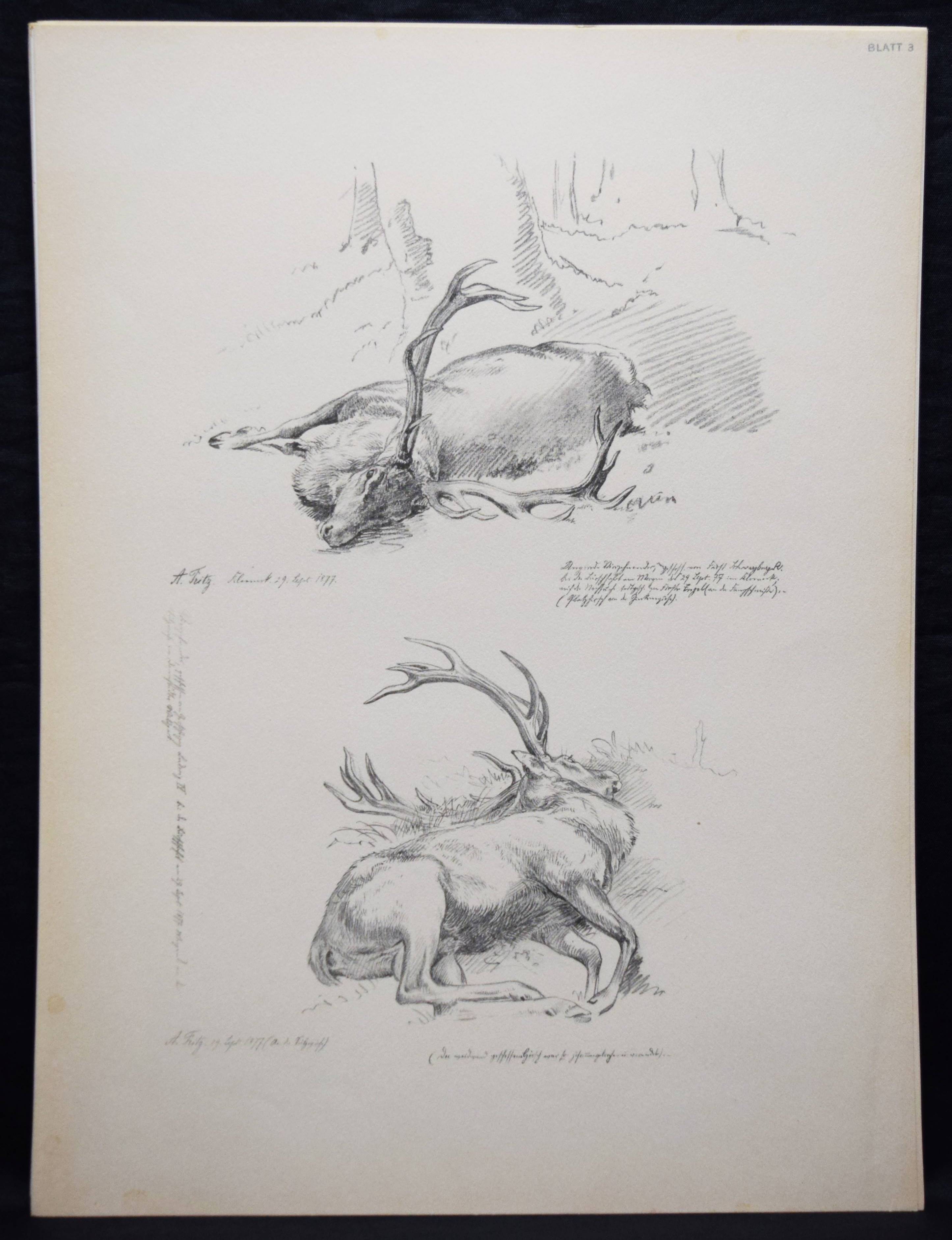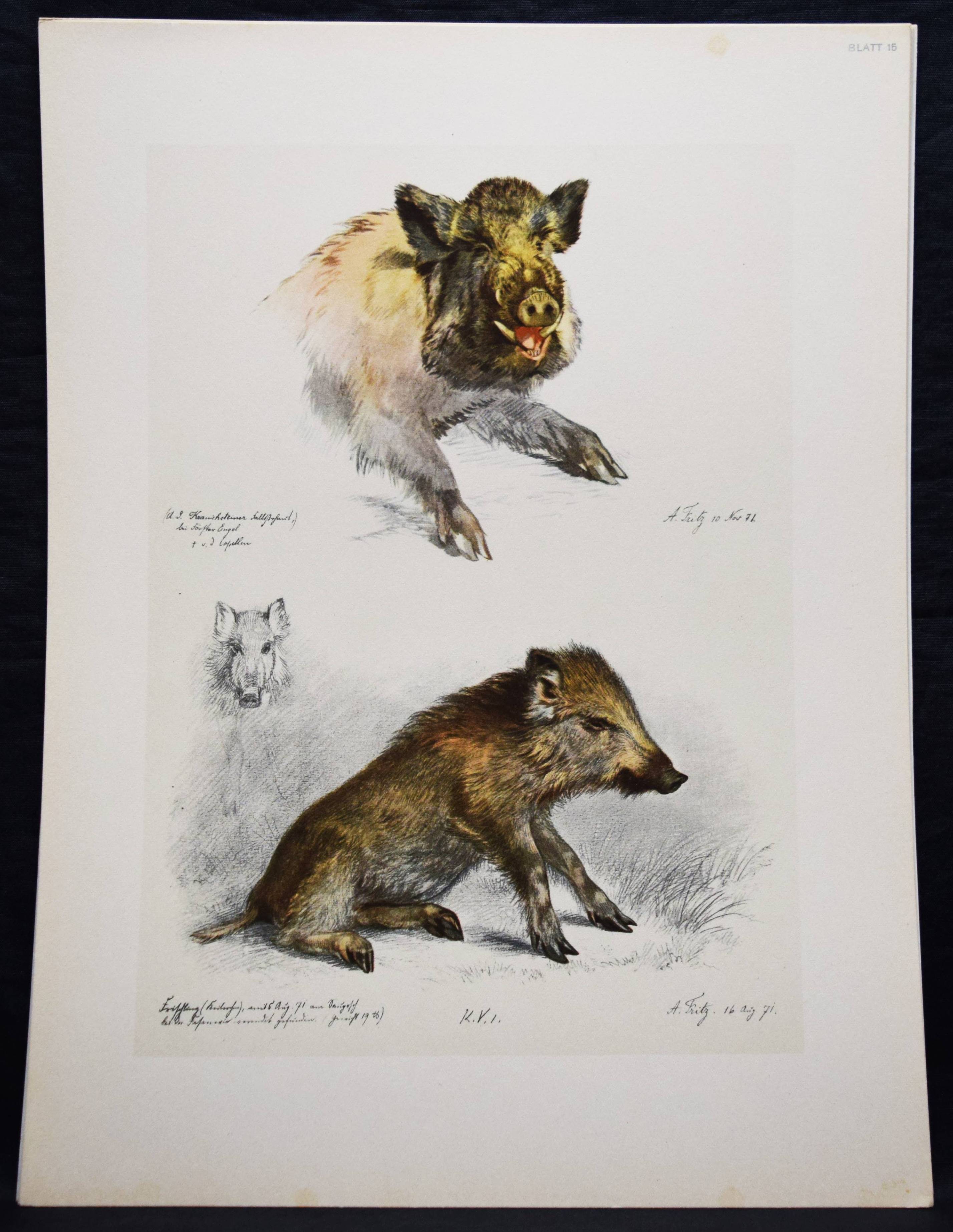 Fritz – Heck, L. August Fritz. Aus dem Nachlaß eines hessischen Wald- und Wildmalers. Neudamm, J. Neumann (1923). Folio (38 x 28 cm.). [4] S. (Text) u. 28 teils farb. Tafeln. Illustr. Orig.-Halbleinen-Flügelmappe. Eine Farbtafel im rechten w. Rand beschnitten, sonst sehr gut erhalten.