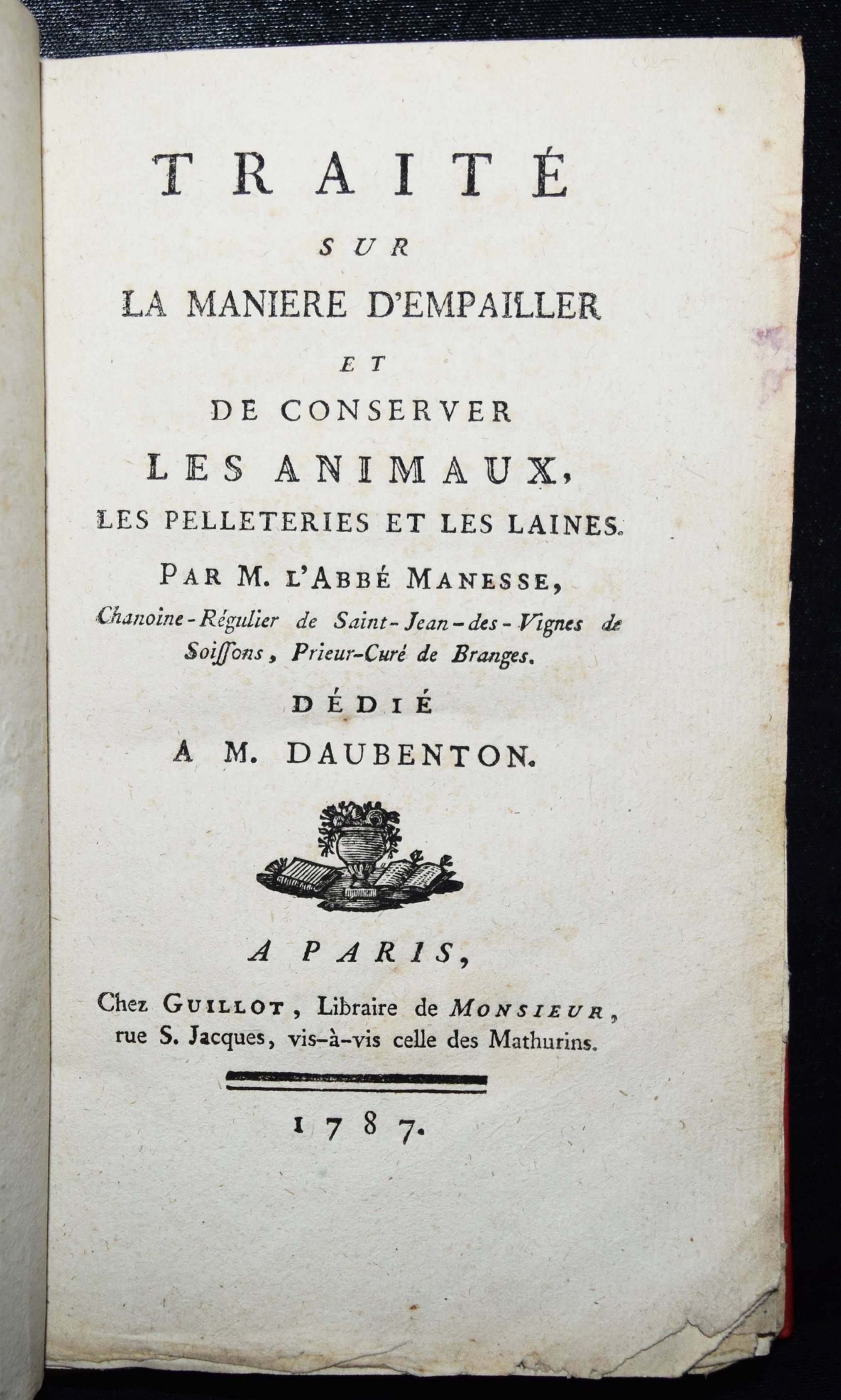 Manesse, (Denis-Joseph). Traité sur la manière d’empailler et de conserver les animaux, les pelleteries et les laines. Dédié à M. Daubenton. Paris, Guillot 1787. 8°. 196 S. Moderner Hprgt. mit goldgepr. Rückenschild. Quérard V, 487. – Erste Ausgabe des Hauptwerks des franz. Ornithologen D.-J. Manesse (1743-1820). Das erste Handbuch zur Tierpräperation. Im letzten Kapitel beschreibt Manesse eine Methode künstliche Augen herzustellen „Manière de faire des yeux imitant parfaitement la nature“. – „In den 1770er Jahren entwickelte der Apotheker Jean-Baptiste Bécœur ein arsenhaltiges Konservierungsmittel, mit dem auch größere Tierhäute konserviert werden konnten, gab seine Erfindung aber nicht preis. Im Jahr 1820 wurde das Mittel von dem französischen Zoologen und Tierpräparator Louis Dufresne (1752–1832) in den Handel gebracht. Seit Mitte des 19. Jahrhunderts wurden Tierkörper in der Präparation nicht mehr ausgestopft wie Kopfkissen, sondern entsprechend ihrer Anatomie und natürlichen Haltung in Position gebracht. Die gegerbte Haut mit Federn/Haaren wird seit dieser Zeit auf einen korrekt angefertigten Grundkörper aufgebracht. Um diesen herstellen zu können, bedarf es umfangreicher Kenntnisse in Anatomie, Ethologie und Statik. Darüber hinaus sind gute Präparatoren auch immer Künstler, die ebenso gelungen plastisch arbeiten können. Nicht wenige Präparatoren/Dermoplastiker sind insbesondere durch ihre Kunstplastiken von Tieren berühmt geworden (Akeley, ter Meer)“ (Wikipedia). – Zeitgenöss. Besitzvermerk und Stempel auf dem Vortitel, nur vereinzelt leicht fleckig und etwas gebräunt, sehr gutes seitlich und unten unbeschnittenes Exemplar.