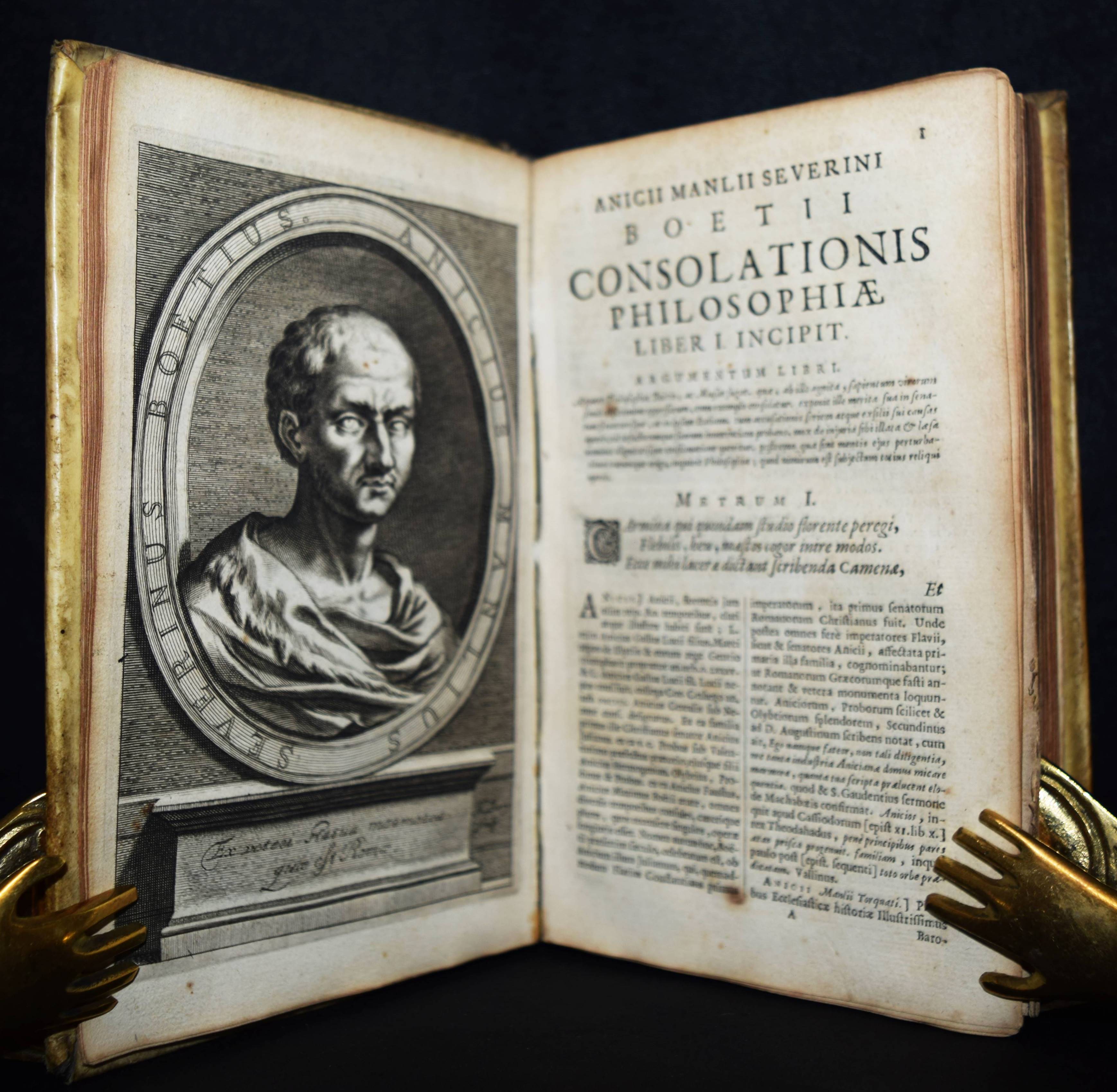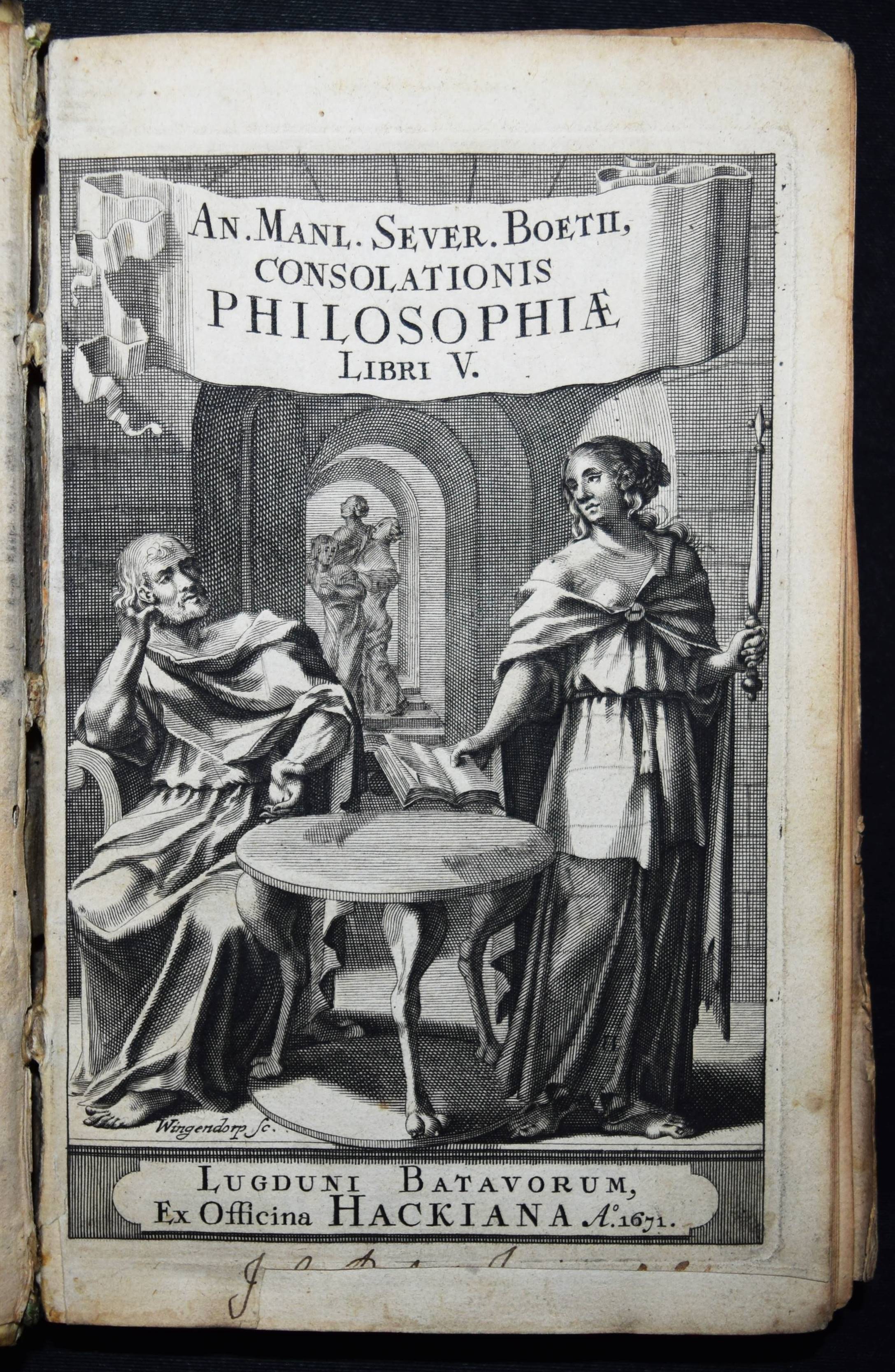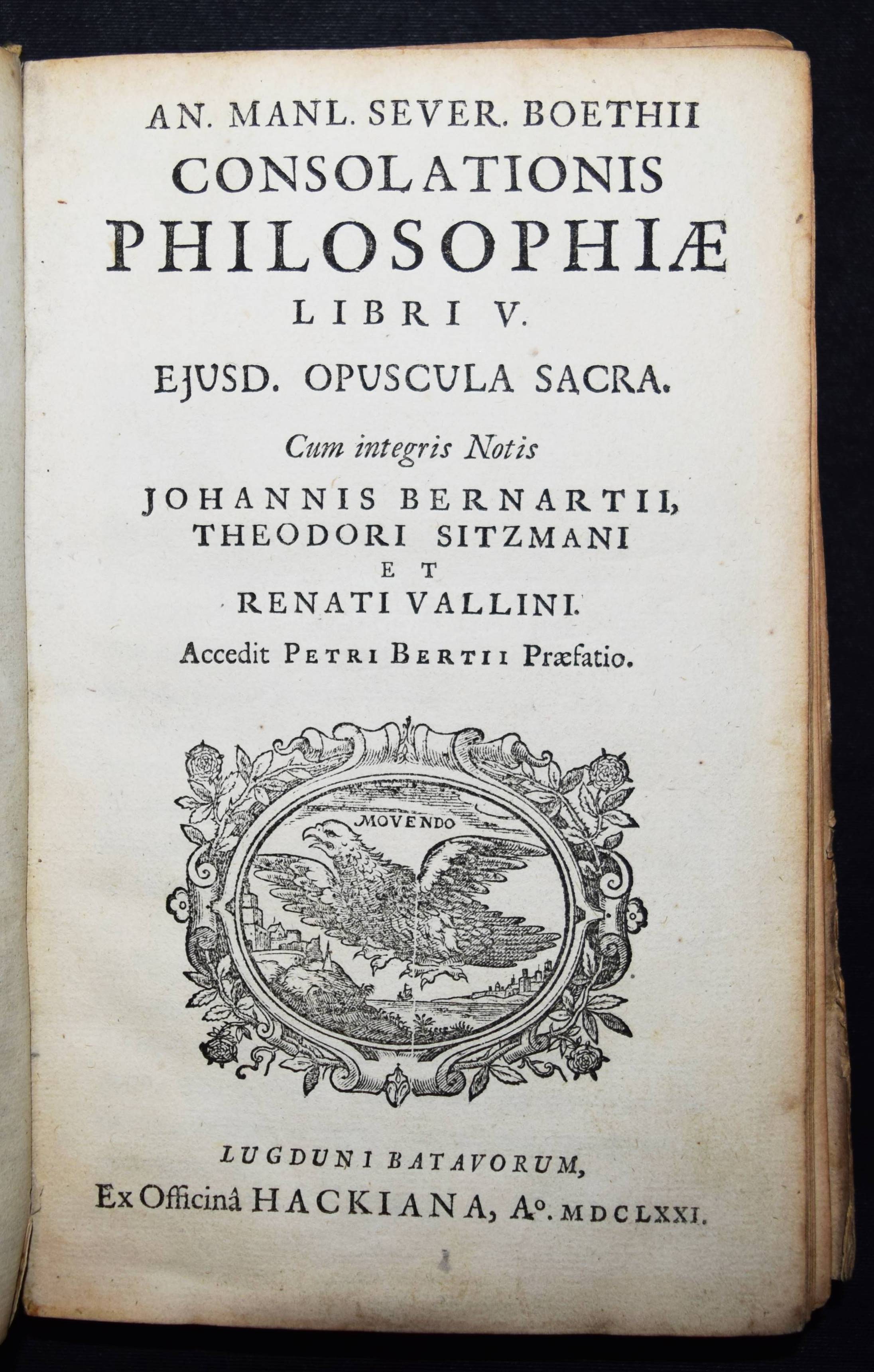 Boethius, An(icius) Manl(ius) (Torquatus) Sever(inus). Consolationis philosophiae. Libri V. Ejusd. opuscula sacra. Cum integris notis Johannis Bernartii, Theodori Sitzmani et Renati Vallini. Accedit Petri Bertii praefatio. Lugduni Batavorum (Leiden), Hack 1671. Kl.-8°. [21] Bl., 323, (9) S. mit gestoch. Frontispiz, 1 gestoch. Portrait u. Holzschnitt-Druckermarke auf dem Titelblatt. Prgt. d. Zt. Schweiger I, 33. Ziegenfuss I, 126. – „Neue Recens. nach Mscr. und älteren Ausgaben … Vallinus Noten werden geschätzt“ (Schweiger zur ersten Ausgabe dieser Edition von 1656). – Der römische Staatsmann und Philosoph A. M. T. S. Boethius (480-524 oder 526 n. Chr.) in seinen Schriften zeigt er sich „neuplatonisch beeinflußt. Seine vorwiegend philologisch-gelehrte Tätigkeit widmete er in größerem Umfang aristotelischen Schriften, die er übersetzte und kommentierte. Neben Aristoteles schätzte er Platon sehr hoch und glaubte, die Unterschiede in den Lehren beider ausgleichen zu können. Daneben kommentierte und übersetzte er die Eisagoge des Porphyrius und verfaßte einen Kommentar zu Ciceros Topik und eigene Schriften zur Logik, Mathematik und Musik. Während seiner schweren Kerkerhaft entstand die Trostschrift De consolatione philosophiae, die einen eklektischen Platonismus erkennen läßt. B. identifiziert die Gottheit mit dem Weltschöpfer, Gott ist ihm zugleich das eine und das höchste Gut. Die göttliche Vorsehung rückt er stark. in den Vordergrund zeigt auch darin stoische Beeinflussung, daß er diese Pronoia mit der festen Gesetzlichkeit des Naturlaufes ausgleicht und darum freiwillige Unterordnung unter den göttlichen Plan des Weltgeschehens verlangt. In Zusammenhang hiermit bestreitet er einen erheblichen Wert der äußeren Güter, so daß also deren ungerechte Verteilung kein Argument gegen die Güte Gottes darstellen kann; seine Schrift wird mithin zu einer Theodize“ (W. Ziegenfuss). – Einband angestaubt und etwas fleckig, Innengelenk nach dem Portrait angeplatzt, dadurch eine Lage gelockert, stellenweise etwas wasserfleckig und durchgehend leicht gebräunt, sonst gut erhalten.