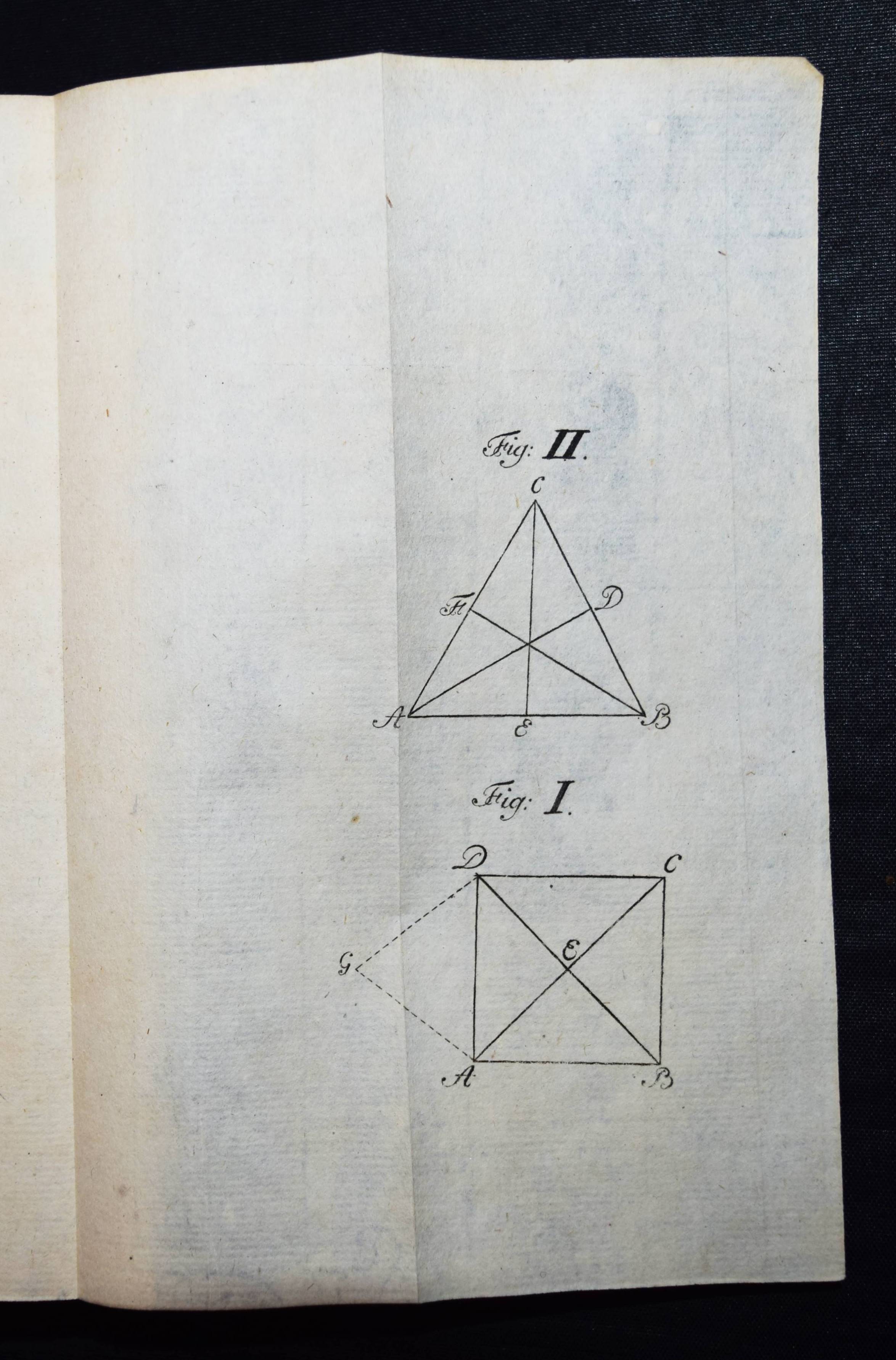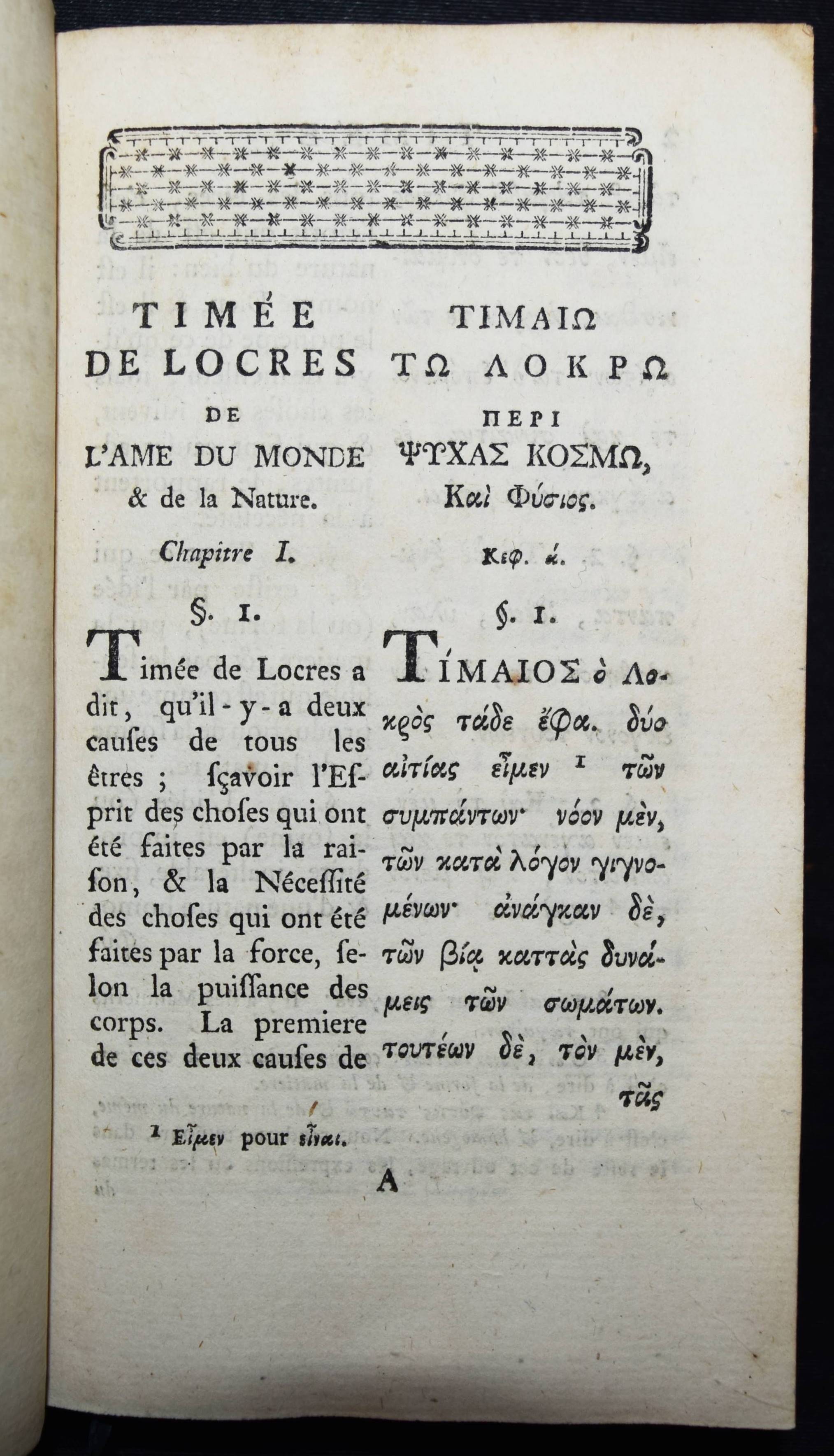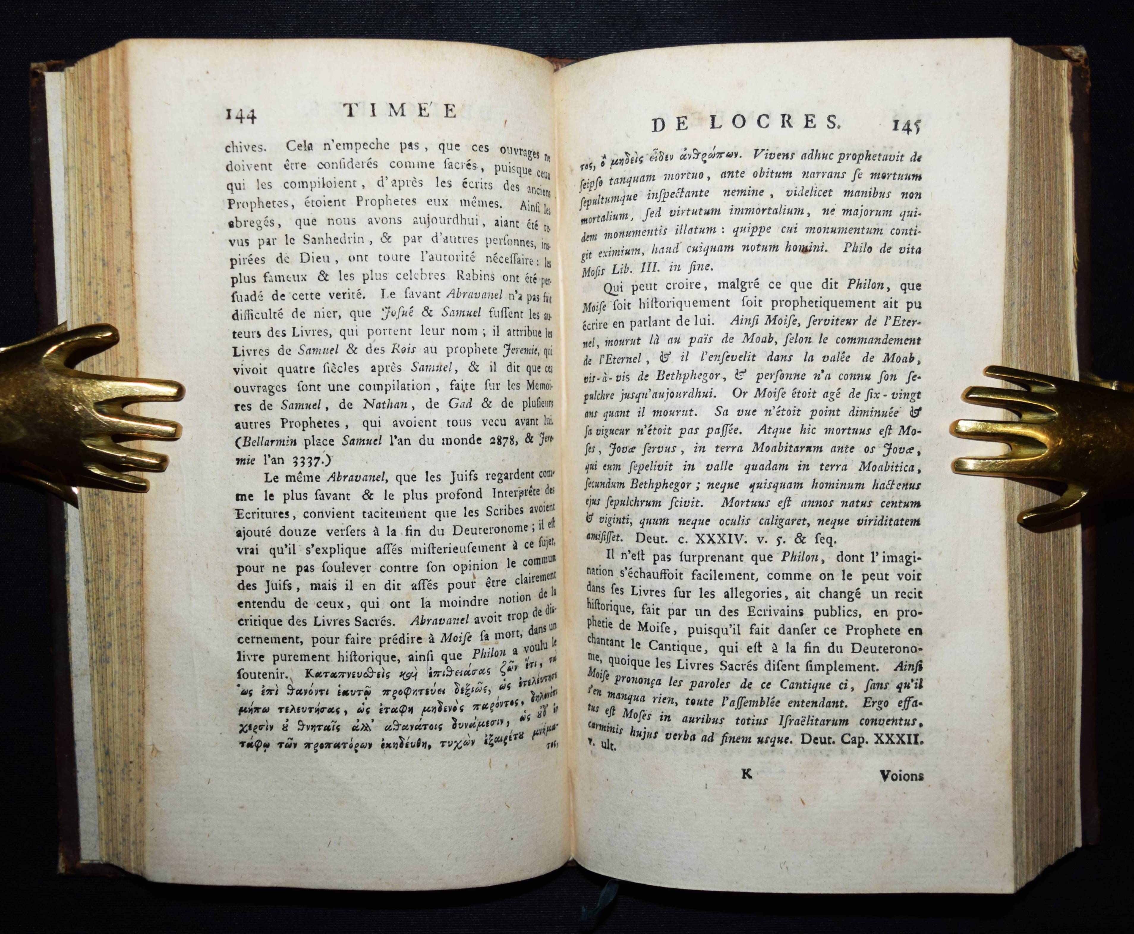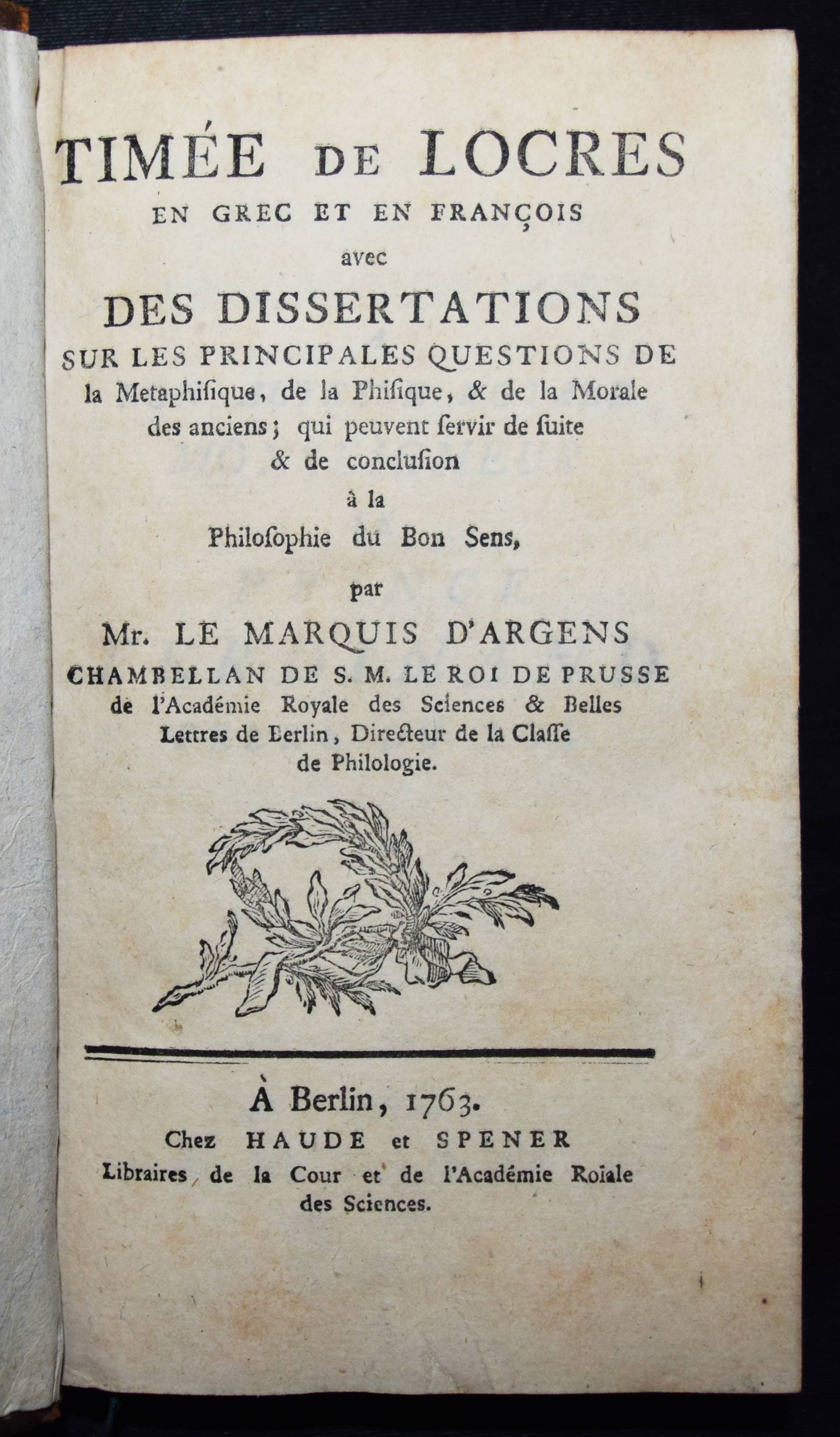 Argens, (Jean-Baptiste Boyer) d’. Timée de Locres en Grec et en François. Avec des dissertations sur les principales questions de la metaphisique, de la phisique, & de la morale des anciens; qui peuvent servir de suite & de conclusion à la philosophie du bon sens. Berlin, Haude et Spener 1763. Kl-8°. [2] Bl., XIV, 405 S., [2] Bl. mit 1 gefalteten Kupfertafel (geom. Figuren). Kalbslederband der Zeit mit goldgepr. Rückenschild und dekorativer Rückenvergoldung. Brunet V, 861. Cioranescu 8351. VD18 15334392. – Erste Ausgabe, mit griechisch-französischem Paralleltext, über Timaios von Lokri aus Platons Dialog Timaios, dem Philosophen der pythagoreischen Schule (Weltschöpfungsmythos). – „Der Dialog Timaios entwickelt die platonische Kosmologie, die den Prozess des Werdens bis zur Entstehung des Menschen und des Staates darstellt. P.s Weltschöpfungslehre geht aus vom Weltbaumeister (Demiurgos), der auf die Urbilder blickend die Einzeldinge und die Welt schuf. Weil er aber wollte, daß alles Seiende ihm ähnlich sei, so verlieh er der Welt Seele und Vernunft; Welt ist allumfassend, darum ist das Nebeneinanderbestehen einer Mehrzahl von Welt ist allumfassend, darum ist das Nebeneinanderbestehen einer Mehrzahl von Welten unmöglich. Die sichtbare Welt besteht aus der Verbindung des Feuers und des festen Elementes, der Erde, die durch Hinzutreten des Wassers und der Luft ein bestimmtes Verhältnis zueinander eingehen. Es soll sich das Feuer zur Luft, wie die Luft zum Wasser, wie das Wasser zur Erde verhalten. Die Weltseele durchdringt alles, das Reich des Einheitlichen und das des Vielen, und vermag alles zu erkennen. Als Abbild der Ewigkeit erhielt das Gewordene vom Weltschöpfer die Zeit; und um sie zu erzeugen, wurden Sonne, Mond und fünf andere Gestirne mit ihren periodischen und zahlengesetzlich geregelten Umläufen geschaffen: die Götter, und die Wesen, die in der Luft, im Wasser und auf der Erde leben. Es ist zweifelhaft, ob P. auch die Achsendrehung der Erde lehrte. Das Firmament dreht sich um die Erde, und die Sterne sind die vollkommensten unter den Göttern, die, aus Feuer gebildet und kugelförmig, und so auf der Erde gesehen werden können“ (W. Ziegenfuss, Philosophen Lexikon I, S. 288 f.). – Nur vereinzelt leicht braunfleckig, schönes dekorativ gebundenes Exemplar.