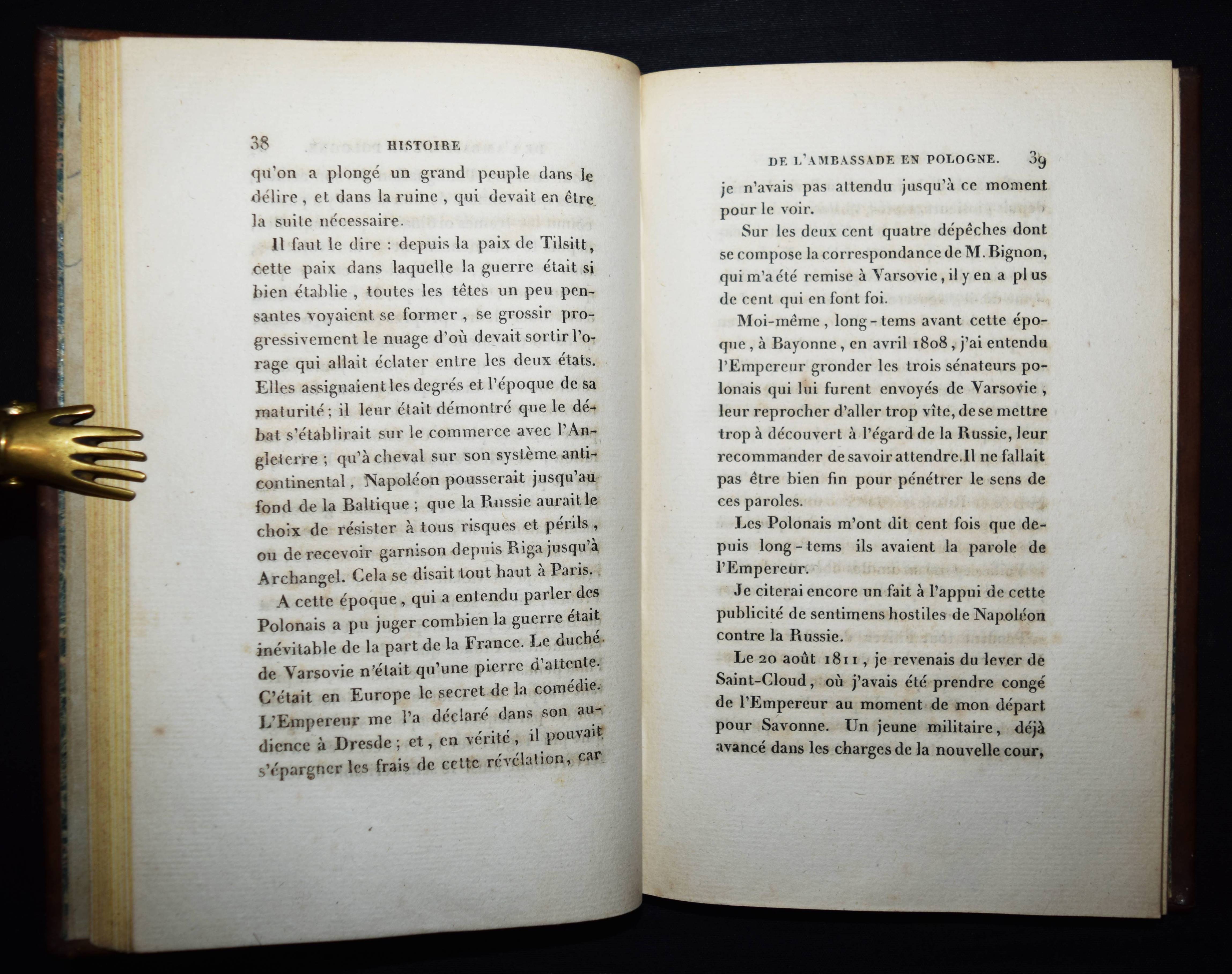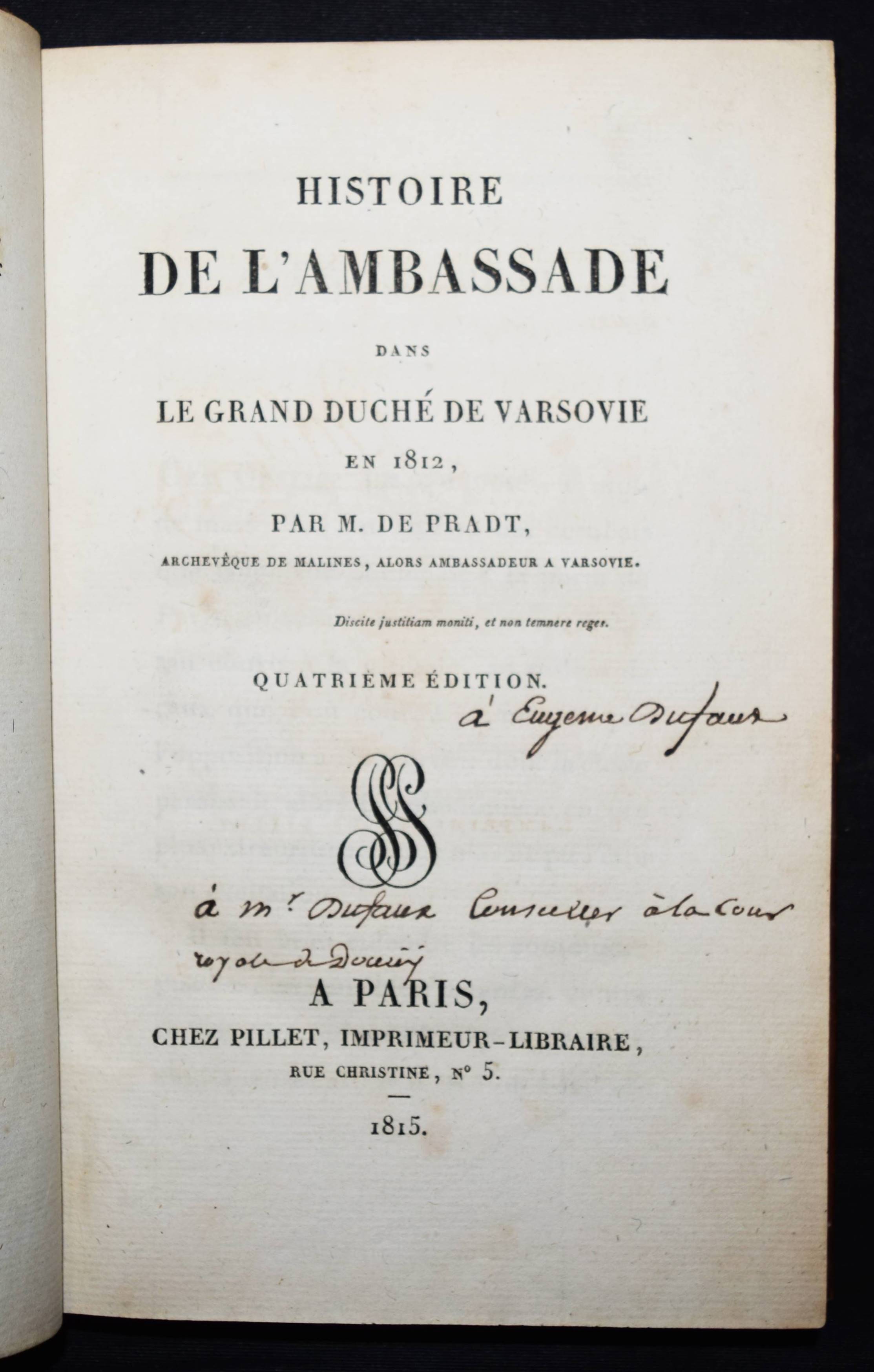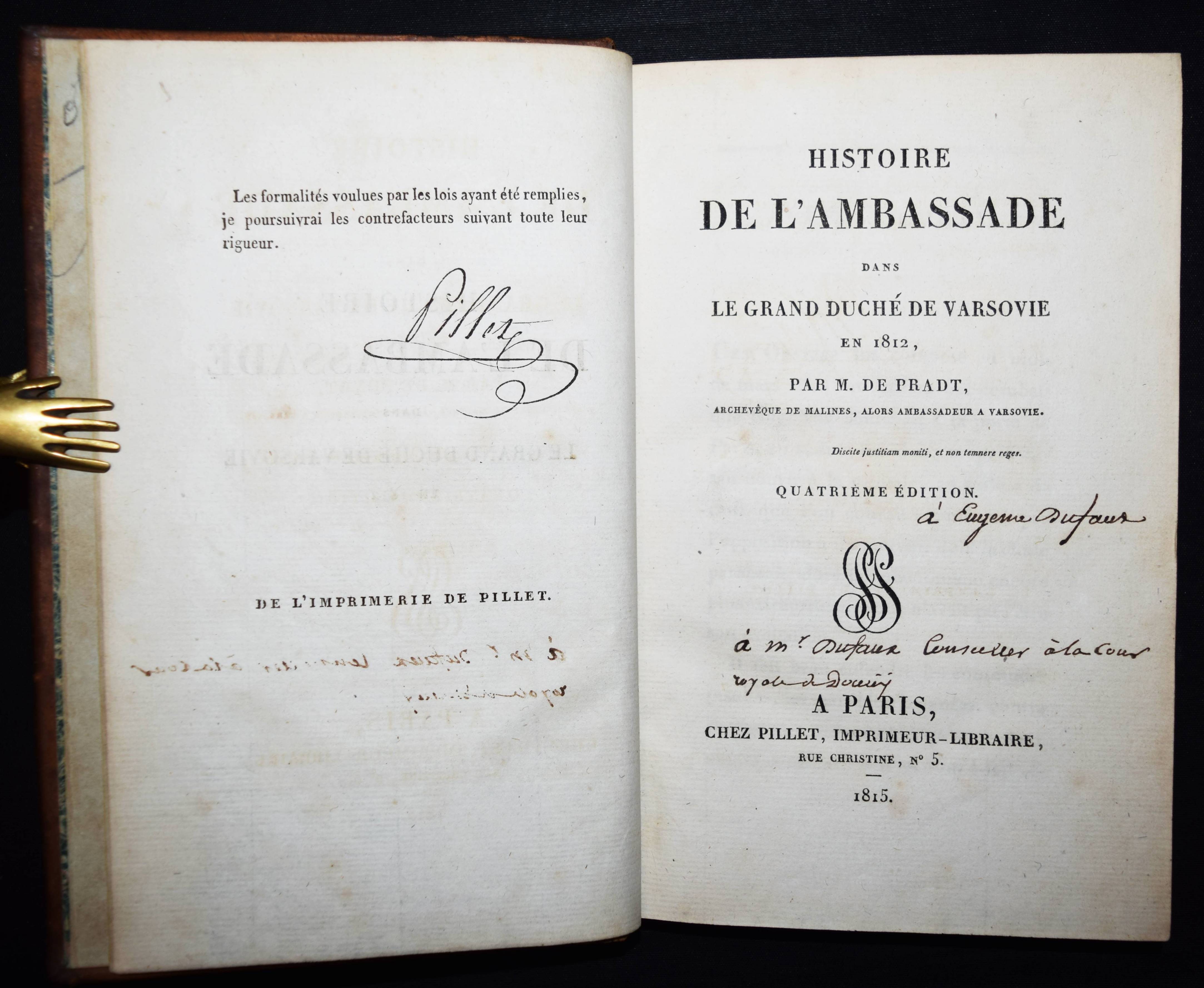 Napoleon I. – Pradt, (Dominique Georges Frédéric) de. Histoire de l’ambassade dans le grand duché de Varsovie en 1812. Quatrième édition. Paris, Pillet 1815. 8°. XXII, 239 S. Ldr. d. Zt. mit goldgepr. Rückenschild u. reicher Rückenvergoldung. Quérard VII, 326. – Vom Verleger Pillet im Druckvermerk signiert. – Wichtiges Quellenwerk zum Rastatter und Wiener Kongress. – Der franz. Diplomat D. de Pradt (1759-1837), ein enger Berater Napoleons und seit 1812 Botschafter in Warschau, „erregte aber hier durch sein zweideutiges Benehmen die Unzufriedenheit der Polen und wurde von Napoleon in seine Diözese verwiesen. Seitdem war er der heftigste Feind des Kaisers“ (Wikipedia). – „Monsieur de Pradt a la gloire d’avoir devancé toutes les biographies diffamatoires qui ont pollulé depuis; mais tout ce que le ci-devant aumonier a de verve, de style, d’amertume de coeur, de virus d’ingratitude . tout cela semble avoir été particulièrement réservé pour insulter et ternir l’astre brillant qui brillait au milieu de ces splendeurs subalternes“ (Quérard). – Vorderdeckel unten mit kl. Abriebstellen, zeitgenöss. Besitzvermerk auf dem Titelblatt, sauberes und dekorativ gebundenes Exemplar.