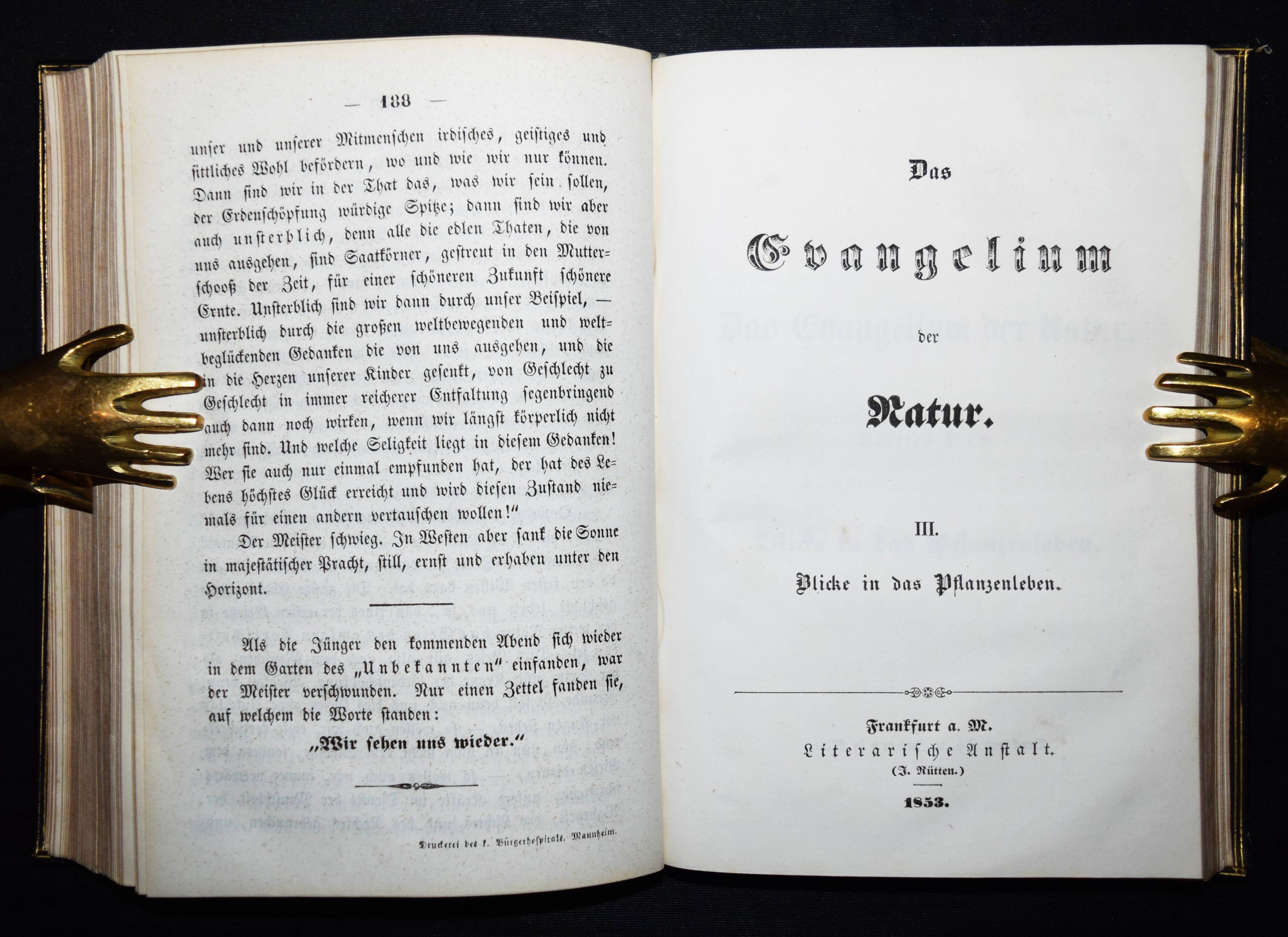 Einband – Nachtblauer Maroquinlederband mit goldgepr. Rückentitel, Romantiker-Rücken- u. Deckelvergoldung, goldgepr. Deckel- u. Innenkantenfiletten u. Goldschnitt. Inhalt: (Rau, Heribert). Das Evangelium der Natur. Teil 1-3 (von 6) in 1 Band. Mannheim, Tobias Löffler 1853. Kl.-8°. [2] Bl., 191 S.; 188 S.; 185 S. mit einigen Holzschnitten im Text. Sehr dekorativer Romantikereinband. – Die drei Teile behandeln: I. Der Sternenhimmel. – II. Die Erdbildungsgeschichte. – III. Blicke in das Pflanzenleben. – H. Rau (1813-1876) „hat eine erstaunlich vielseitige und reiche Thätigkeit entfaltet, er hat sich auf dem Gebiete der Dichtung ebenso versucht wie auf demjenigen der Wissenschaft, er hat philosophische Werke ebenso verfaßt wie theologische und geschichtliche, er hat Volkskalender herausgegeben und Operntexte geschrieben“ (ADB XXVII, 376). – Außergewöhnlich schönes Exemplar.