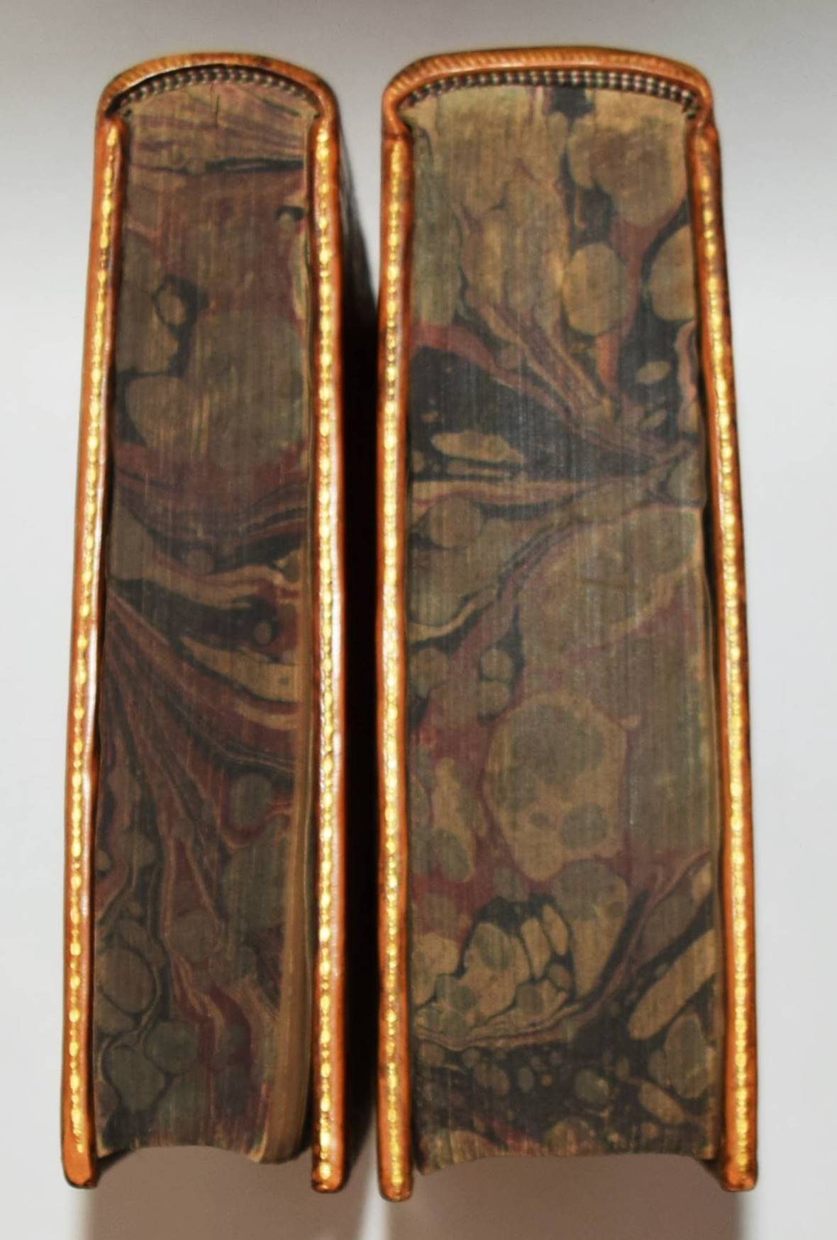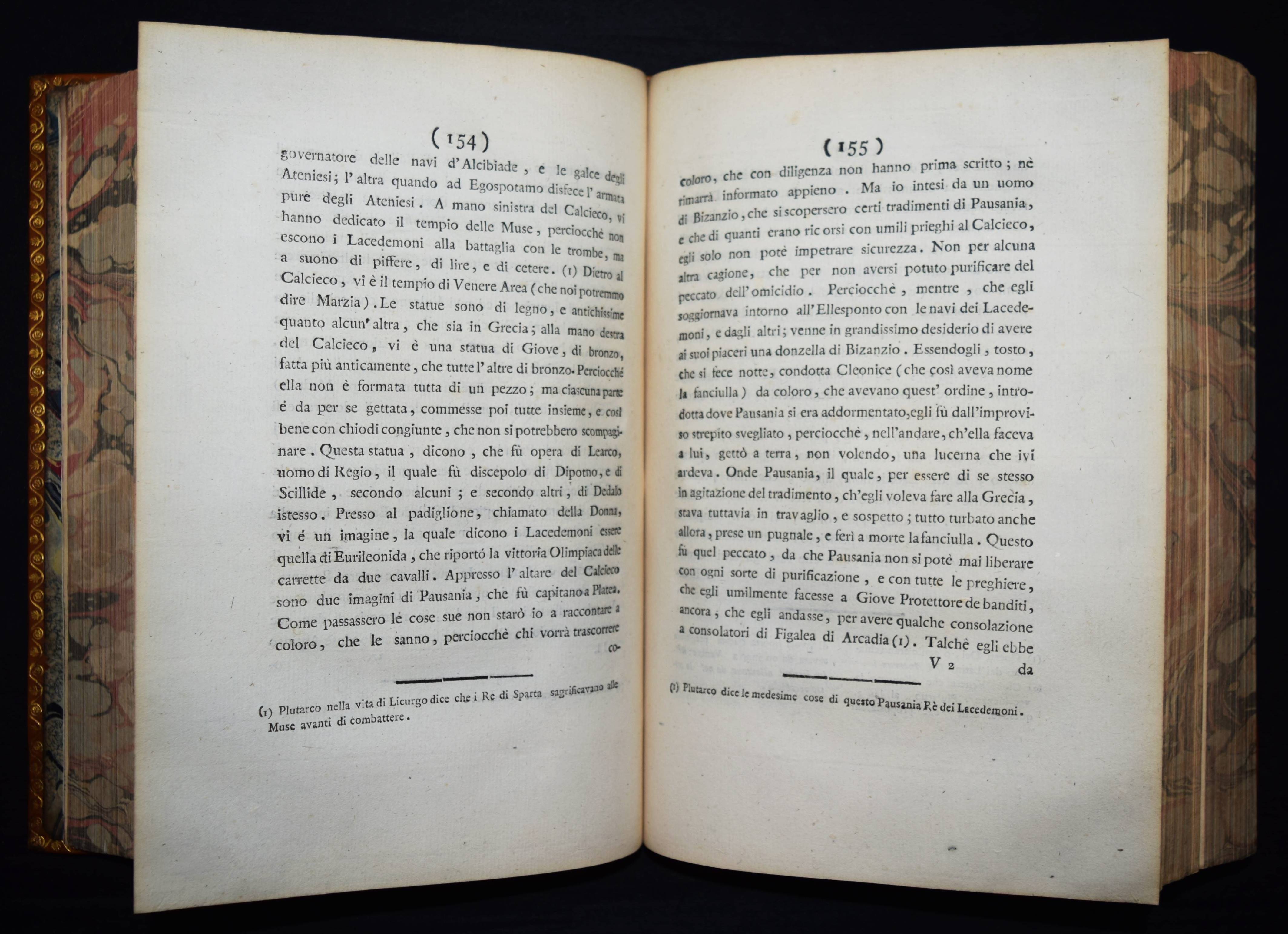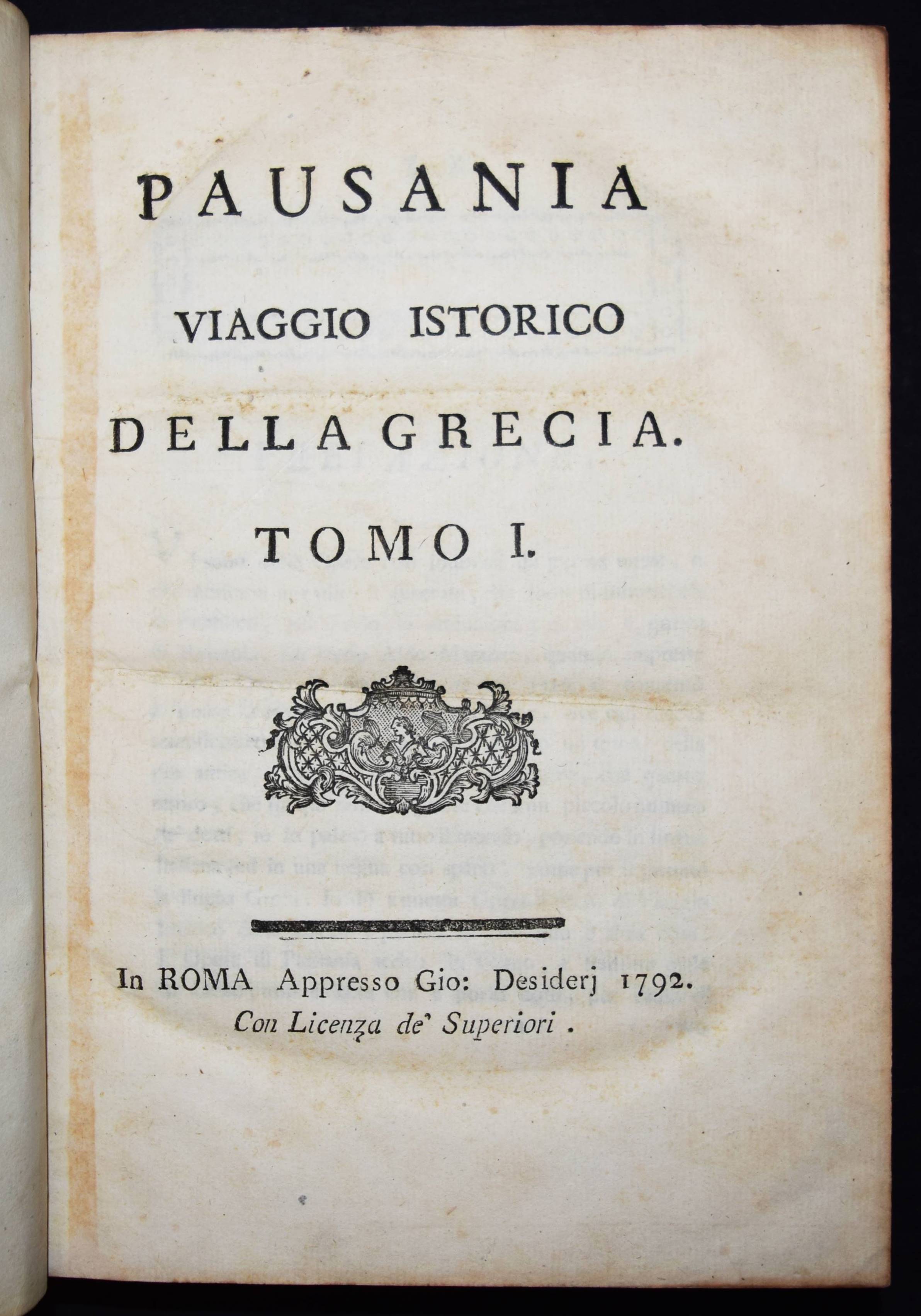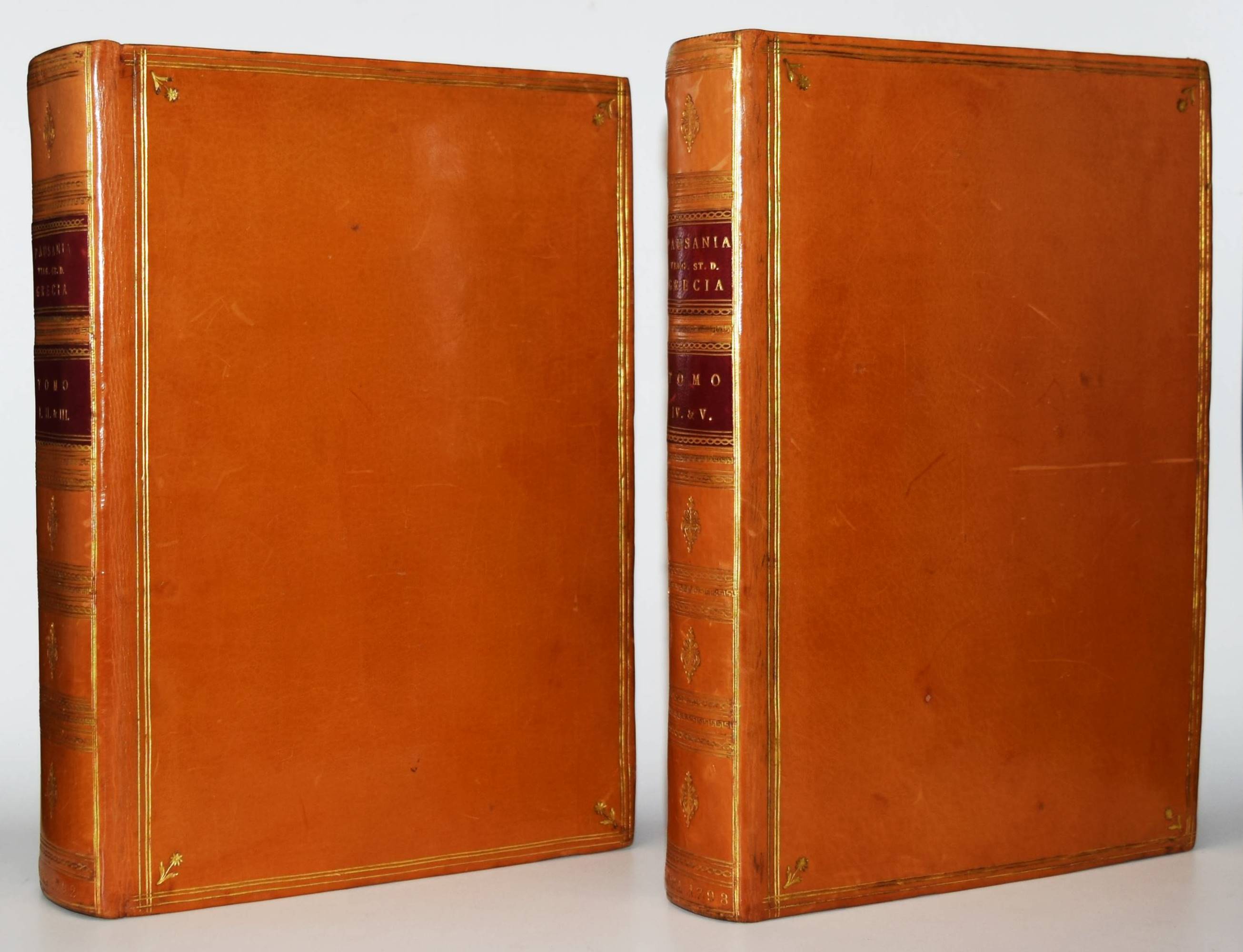 Pausanias. Viaggio istorico della Grecia. (Traduzione di Giovanni Desidera). 5 Teile in 2 Bänden. Roma, G. Desideri 1792-1793. 4° (25 x 18 cm.). XX, 253, (3) S.; [2] Bl., 316 S.; [2] Bl, 286 S.; [2] Bl., 256 S.; [2] Bl., 274 S., [1] Bl. Geglättete Kalbslederbände der Zeit mit jeweils 2 goldgepr. Rückenschildern, dekorativer Rückenvergoldung, goldgepr. Deckelfiletten und Innenkantenvergoldung sowie marm. Vorsätzen und marm. Schnitt. Sehr seltene erste Ausgabe der ital. Übersetzung von G. Desidera. – Pausanias „De tota Graecia libri decem“ gilt als „erster Fremdenführer Griechenlands“ (KLL). – Pausanias (zweite Hälfte des 2. Jh.s n.Chr.), „Verfasser einer Beschreibung Griechenlands (Attika, Peloponnes, Böotien, Phokis, Delphi) mit Berücksichtigung der Geographie, Historie, Mythologie neben der Schilderung der Örtlichkeiten und der Denkmäler. Er ist im Ganzen zuverlässig; sein Stil ist von dem Streben nach Variation bestimmt, das ihn zu Künsteleien in Umschreibung, Wortstellung, Suche nach verschollenen Wörtern usw. führt“ (Tusculum Lexikon). – Nur vereinzelt minimal braunfleckig und etwas gebräunt, außergewöhnlich schönes Exemplar in einem prachtvollen zeitgenössischen Handeinband.