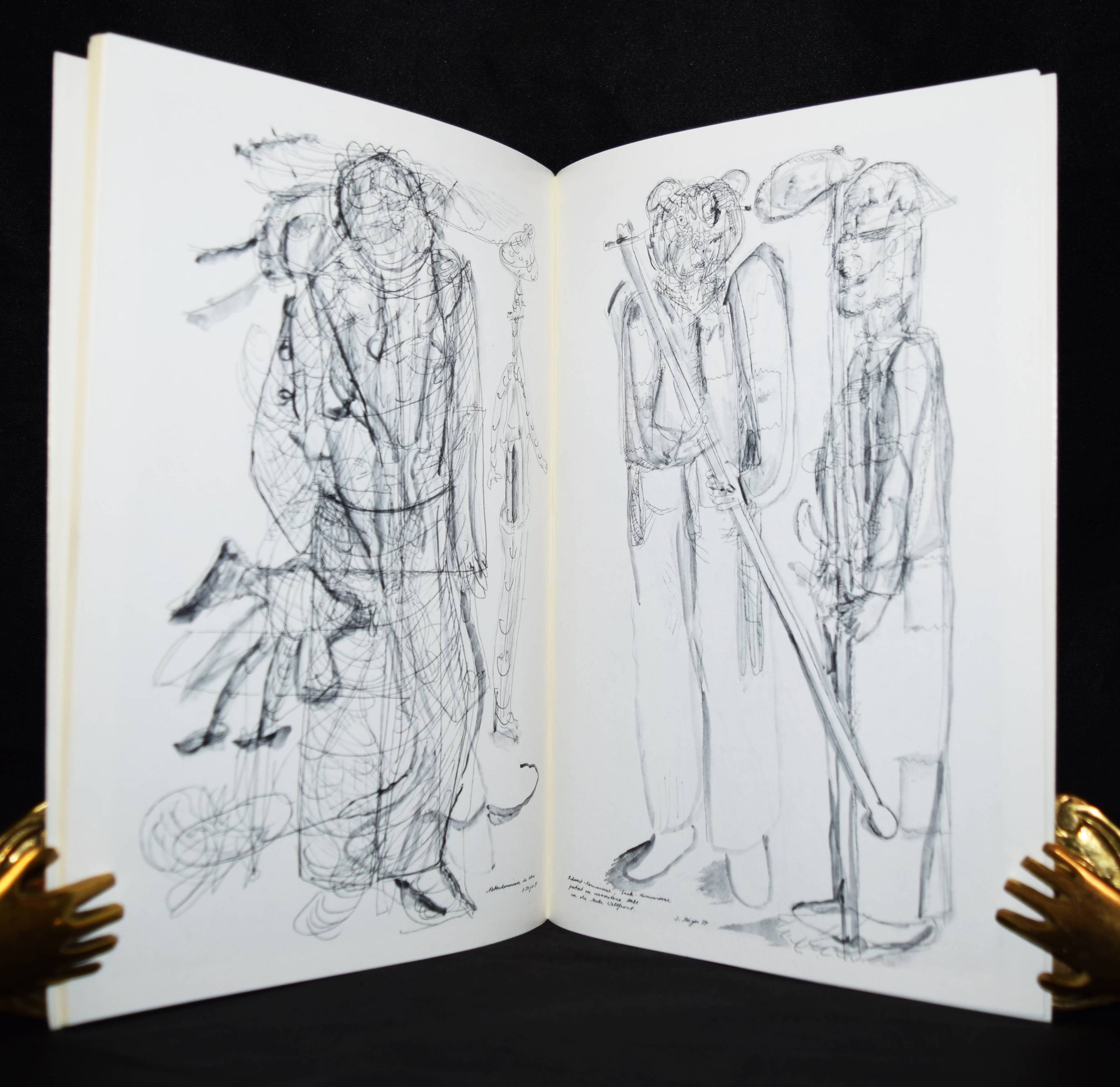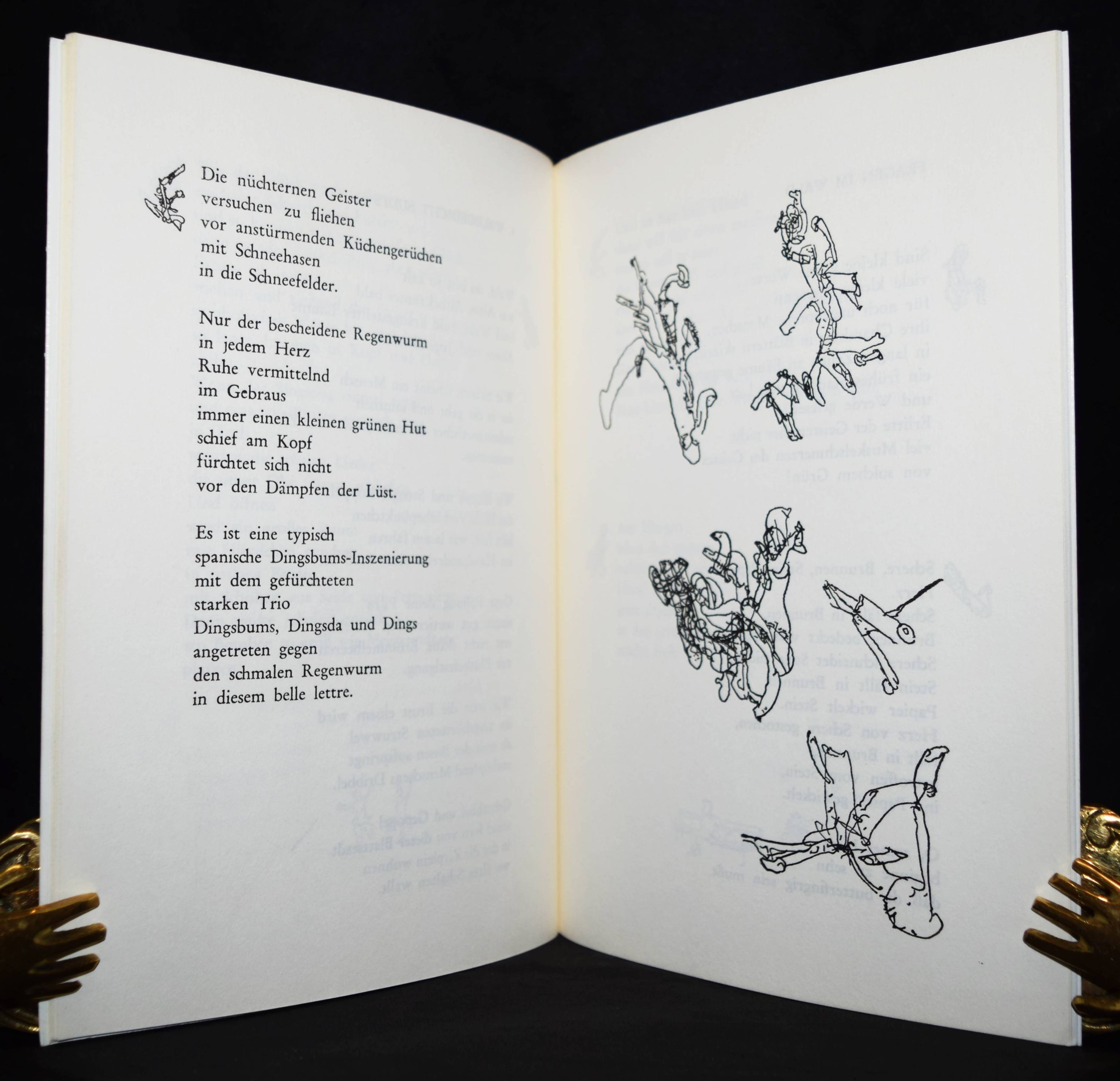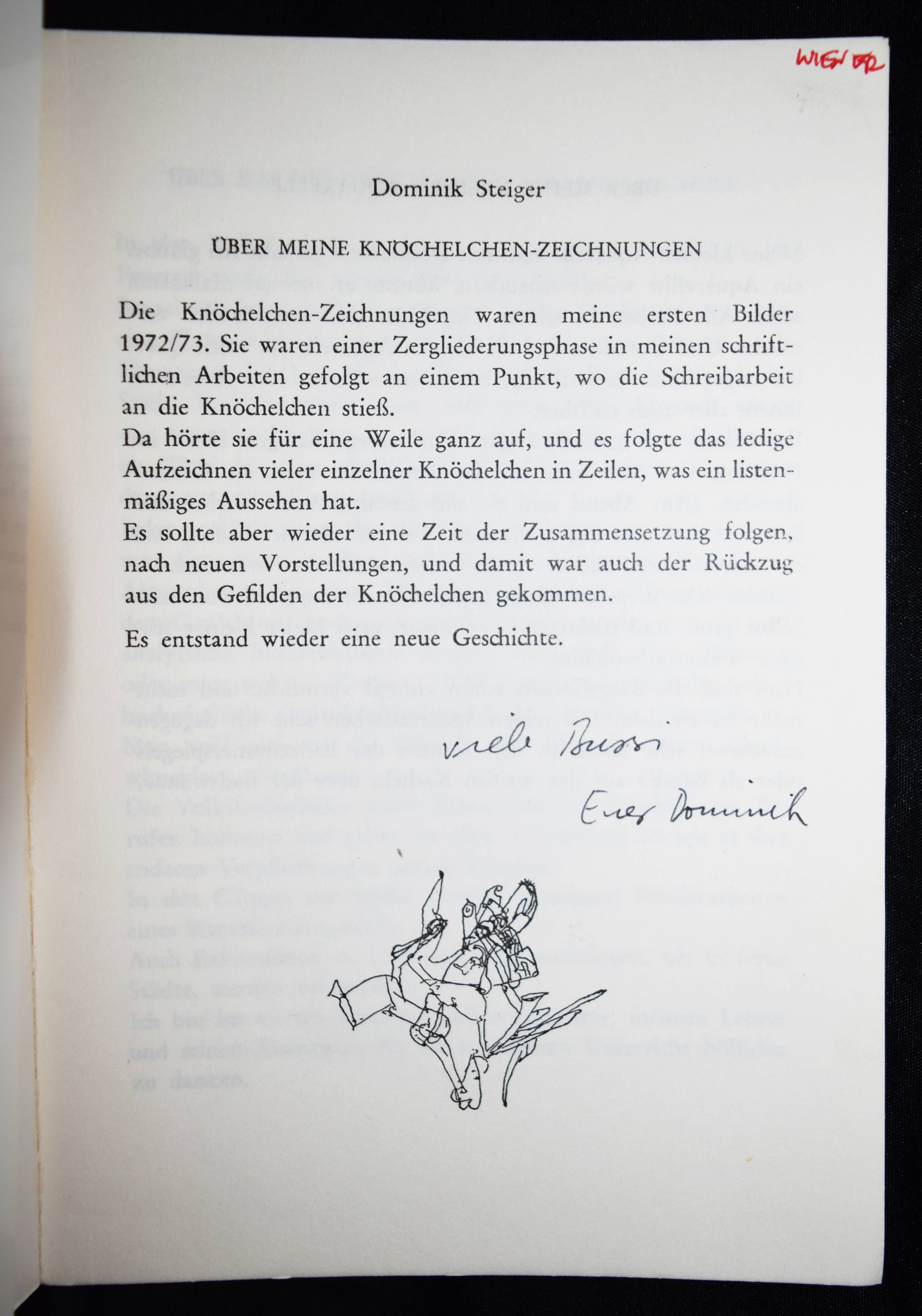 Steiger, Dominik. Über meine Knöchelchen-Zeichnungen (und anderes). (Herausgegeben von Otto Breicha in Zusammenarbeit mit dem Buchdienst Fesch). Wien, Selbstverlag (1982). 8°. [20] Bl. mit einem Portrait von Isolde Ohlbaum, 16 teils farb. Tafeln und Illustrationen im Text. Farbig illustr. OKart. Erste Ausgabe. – Mit eigenhändiger Widmung von D. Steiger für Oswald Wiener „viele Bussi, Euer Dominik“. – „Die Knöchelchen-Zeichnungen waren meine ersten Bilder 1972/73. Sie waren einer Zergliederungsphase in meinen schriftlichen Arbeiten gefolgt an einem Punkt, wo die Schreibarbeit an die Knöchelchen stieß.Da hörte sie für eine Weile ganz auf, und es folgte das ledige Aufzeichnen vieler einzelner Knöchelchen in Zeilen, was ein listenmäßiges Aussehen hat. Es sollte aber wieder eine Zeit der Zusammensetzung folgen, nach neuen Vorstellungen, und damit war auch der Rückzug aus den Gefilden der Knöchelchen gekommen. Es entstand wieder eine neue Geschichte“ (S. 1). – Der österreichische Literat und Künstler D. Steiger (1940-2014), aus dem Umfeld der Wiener Gruppe und des Wiener Aktionismus, zählt mit seinen Werken zu den wichtigen Vertretern der österreichischen Avantgarden seit den 1950er Jahren. – Sehr gutes Exemplar.