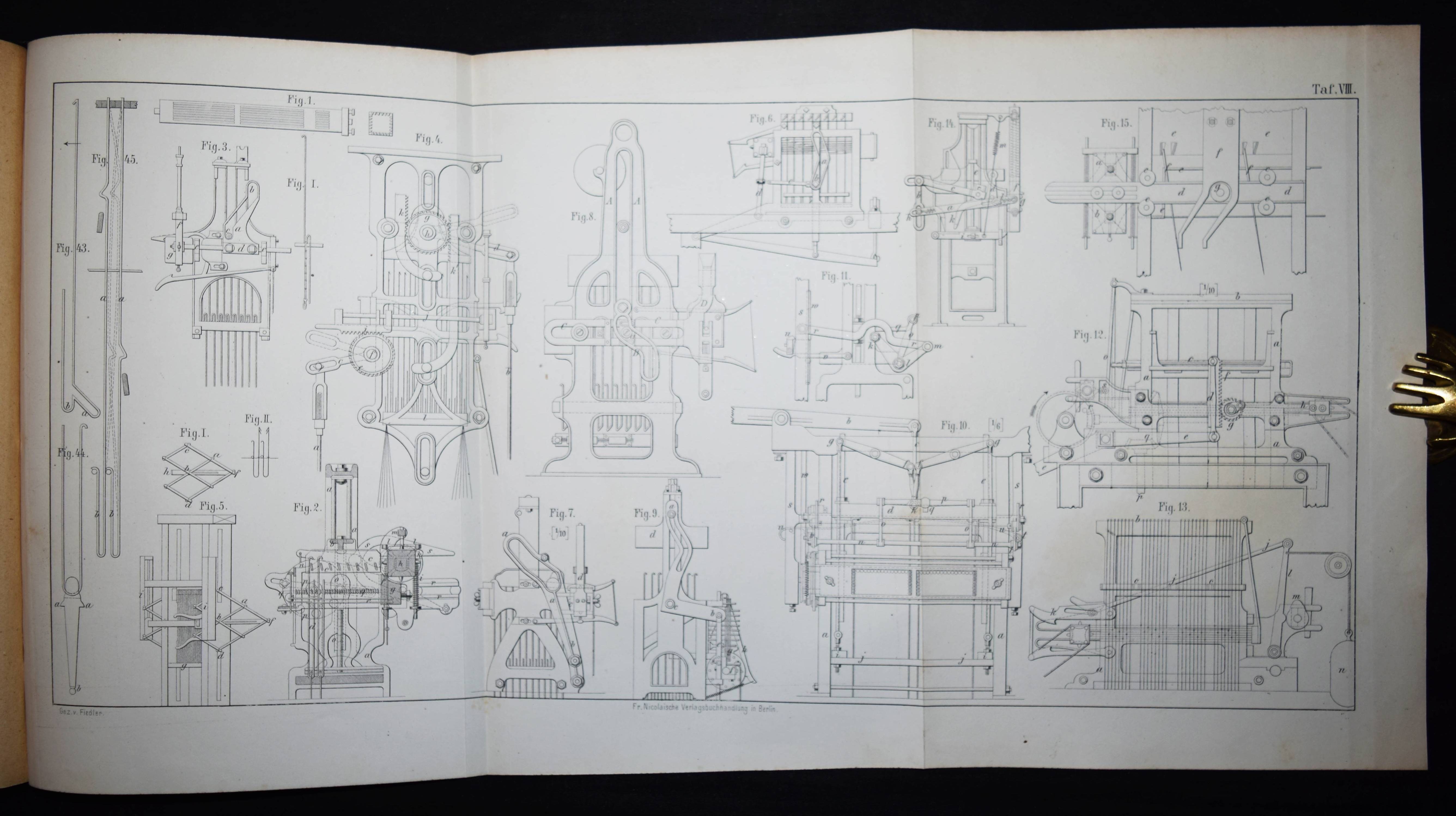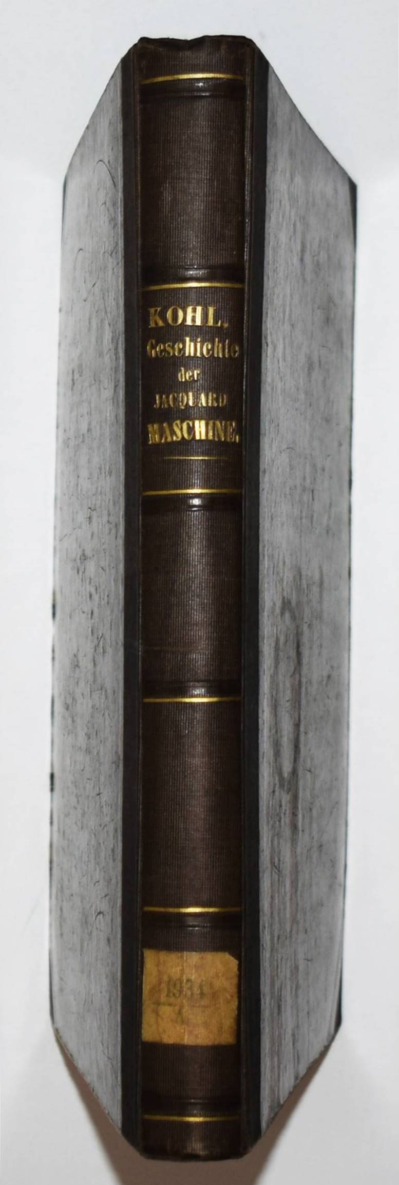 Kohl, Friedrich. Geschichte der Jacquard-Maschine und der sich ihr anschliessenden Abänderungen und Verbesserungen. Nebst der Biographie Jacquard’s. Eine von dem Verein zur Beförderung des Gewerbfleisses in Preussen gekrönte Preisschrift. Berlin, Nicolai 1872. 4°. 197, (1) S. mit lithogr. Portrait, 18 Holzschnitten u. 16 gefalt. lithogr. Tafeln. OHln. mit goldgepr. Rückentitel u. Linienvergoldung. Konig III, 314. – Erste Ausgabe, selten. – „Mittels der Jacquardmaschine, der ersten industriellen Anwendung einer Lochkartensteuerung, konnte der Handweber mit einem einzigen Fusstritt die in den Lochkarten gespeicherten Kombinationen der Kettfaden fur die Fachbildung abrufen“ (Konig). – „Schon in prähistorischer Zeit gab es in vielen Teilen der Welt einfache Webstühle. Doch erst 1785 erfand der Engländer Edmund Cartwright den ersten mechanischen Webstuhl. Eine erhebliche Verbesserung brachte schließlich am 19. April 1805 die Webmaschine des französischen Seidenwebers Joseph-Marie Jacquard (1752–1834)“ (Wikipedia). – „Der Beginn der Jacquardweberei ist die Lochkarte: Ein längliches, schmales Stück Hartpappe mit Hunderten von Löchern in mathematischer Folge gestanzt. Die Lochkarte enthält wie ein Morsealphabet die Codierung jedes einzelnen Schusses eines Musters. Zu einem Kartenlauf zusammengenäht bildet sich Schuss für Schuss der Rapport und damit die endlose Musterwiederholung. Bildhafte Gewebe wie Blütenranken, Fabelwesen, biblische, weltliche oder geometrische Muster entstehen. Der Franzose Joseph-Marie Jacquard hat dieses Prinzip 1805 in Lyon als Sohn einer Seidenweberfamilie entwickelt. … Während am Zugwebstuhl mehrere Personen arbeiteten, um gleichzeitig die richtigen Zampelschnüre für das Muster zu ziehen und den Webschützen zu betätigen, wurde durch die Lochkartensteuerung das Weben komplexer Muster durch eine einzige Person am Webstuhl möglich. Dafür muss dem Weben der aufwändige Vorgang des Kartenschlagens vorgeschaltet werden. Hierbei wird das Muster über den gestanzten Lochrhythmus in das binäre System von Hebung und Senkung übertragen. Das Schlagen der Lochkarten ist quasi das Programmieren des Webstuhls wie beim Codieren eines Computers“ (L. Schwalenberg, Faszination Jacquard. S. 9 f.). – Einband etwas berieben, St.a.V.u.T., Text papierbedingt gebräunt, die Tafeln teils etwas braunfleckig, gutes Exemplar.