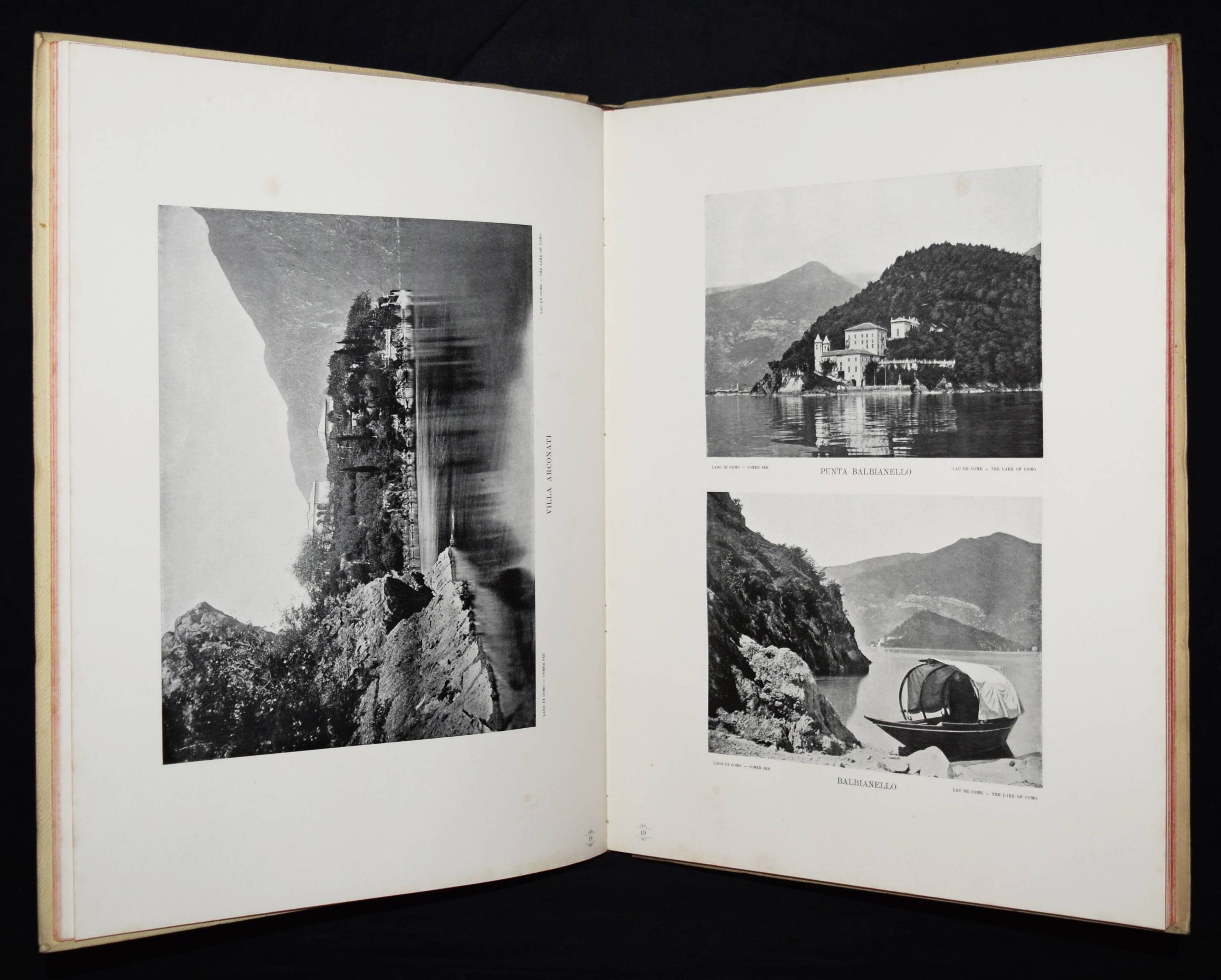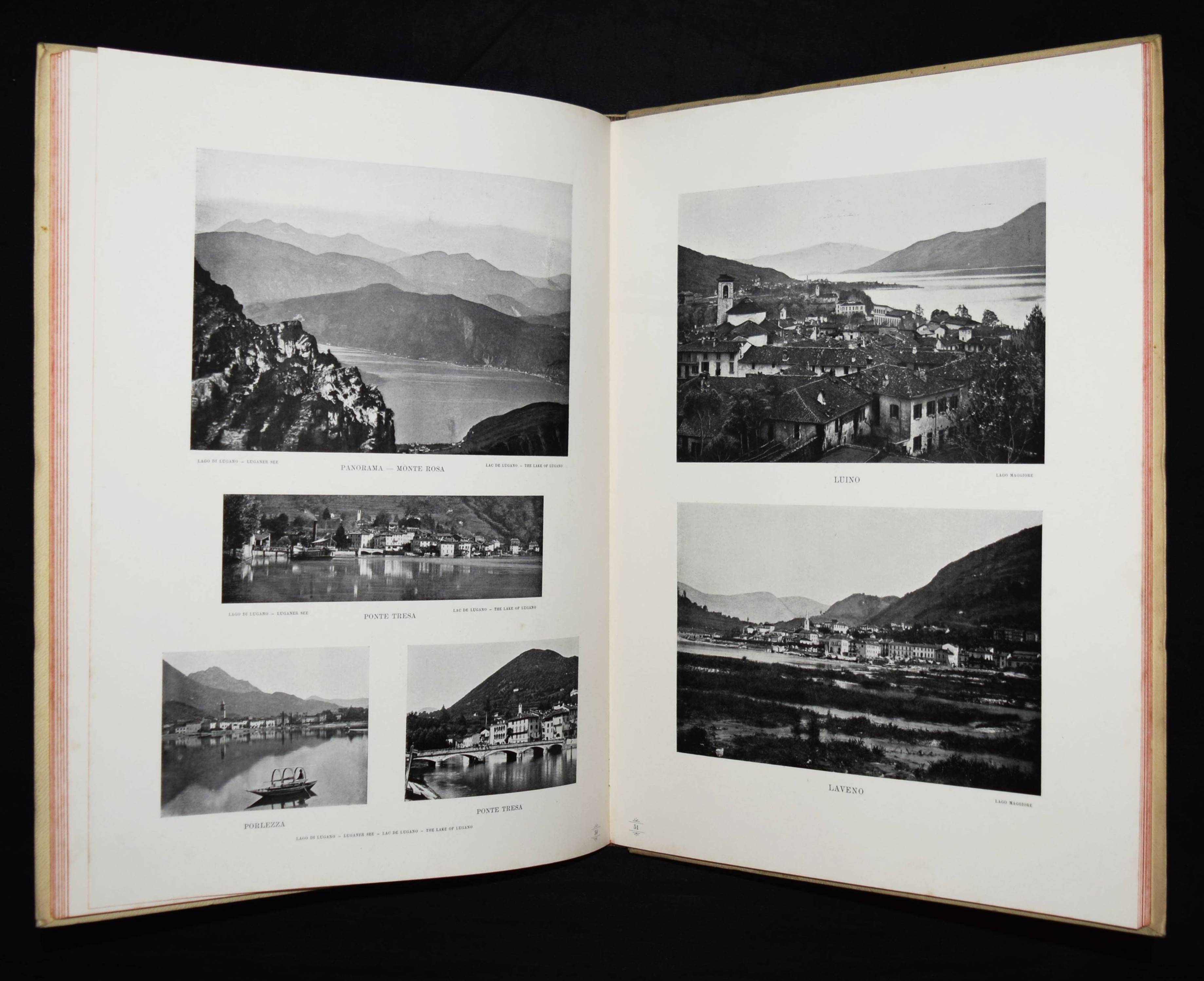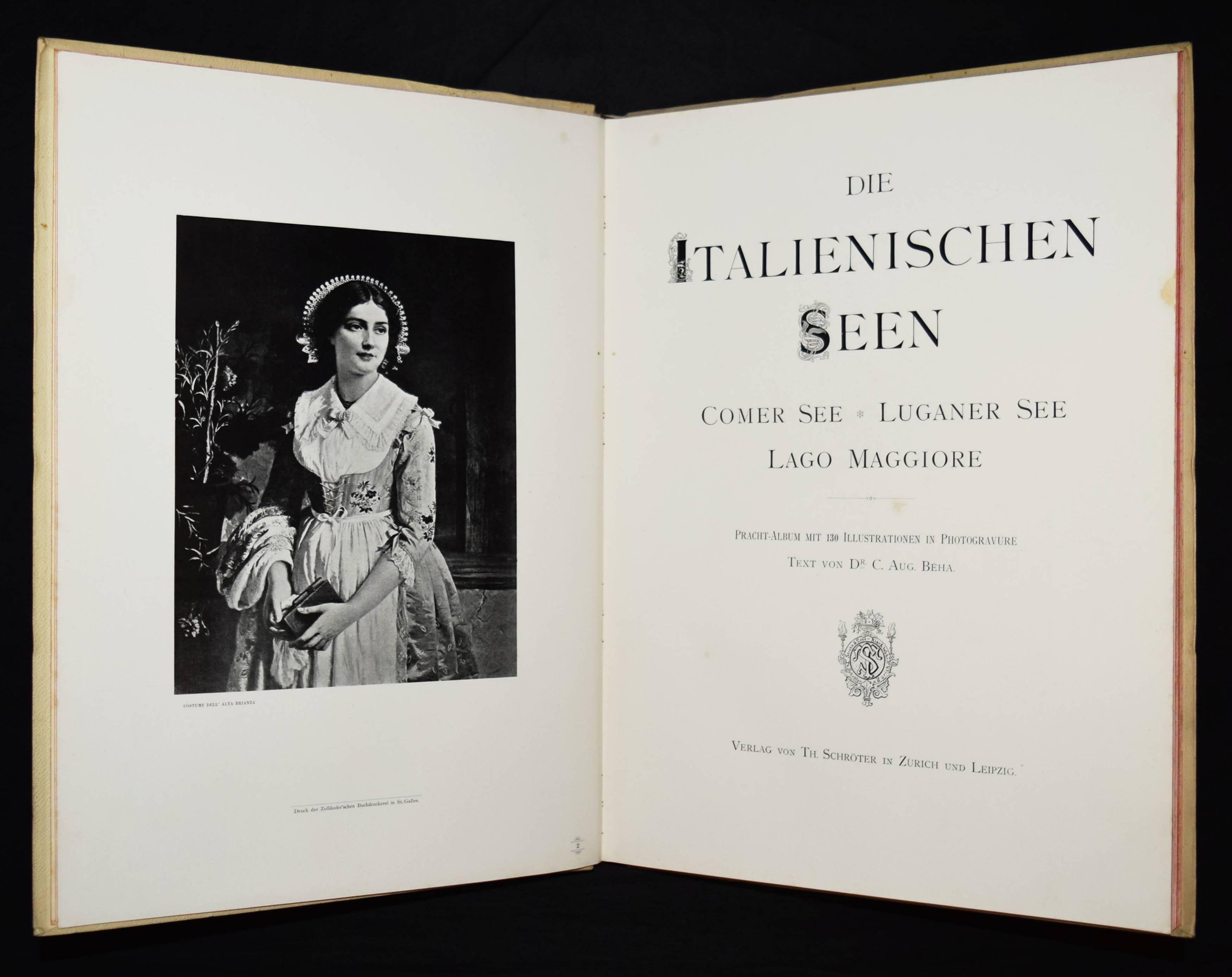 Béha, C(arlo) Aug(usto). Die italienischen Seen. Comer See, Luganer See, Lago Maggiore. Pracht-Album mit 130 Illustrationen in Photogravure. Zürich u. Leipzig, Schröter o. J. (1899). Gr.-4°. 78 S., [2] Bl. mit 130 Abb. nach Photographien. Farbig illustr. OLn. (Ansicht der Isola Pescatori im Lago Maggiore). Nicht bei Heidtmann. – Erste Ausgabe. – Eine zweite Auflage erschien 1901 in St. Gallen mit dem Titel „Die oberitalienischen Seen“. – Vorderdeckel im unteren Rand etwas fleckig, sonst sehr gutes sauberes Exemplar.
