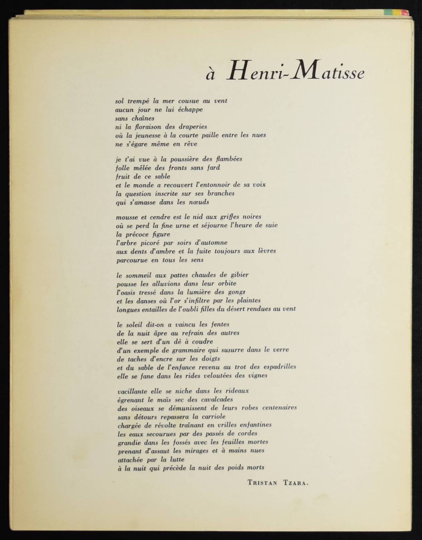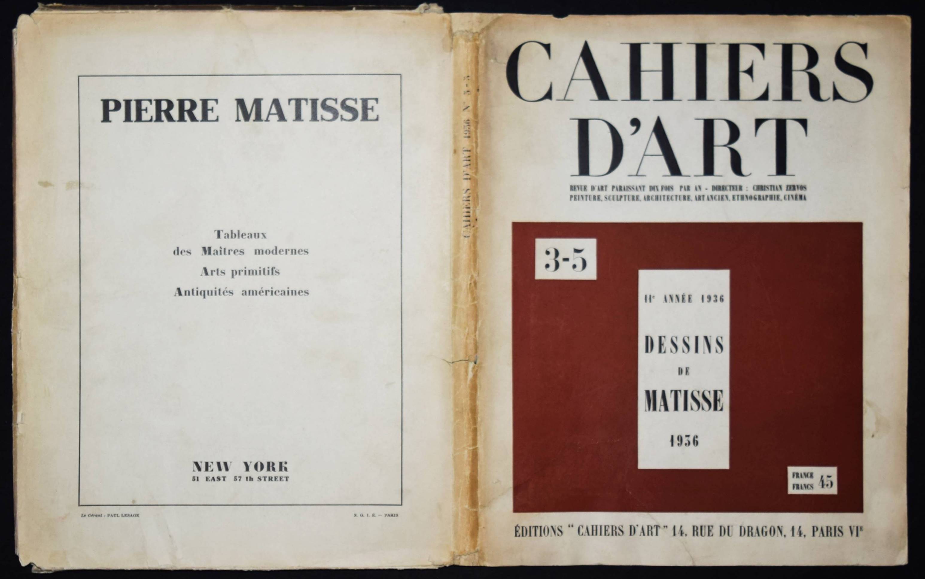 Matisse – Zervos, Christian (Ed.). Dessins de Matisse 1936. Cahiers d’Art. Revue d’art paraissant dix fois par an. No. 3-5. 11e année 1936. Paris, Éditions „Cahiers d’art“ 1936. Folio (33,5 x 25,5 cm.). S. 69-145, [1] Bl., [8] Bl. (Anzeigen) mit 2 ganzs. Abb. im Text u. 36 mont. Tafeln. Orig.-Flügelmappe. Neben der Duchamp-Nummer aus dem gleichen Jahr das bedeutendste Heft der berühmten Zeitschrift. Der hier zuerst veröffentlichte Zyklus wurde 1992 und 2005 nachgedruckt. Mit einer Einführung von C. Zervos „Automatisme et espace illusoire“ und einem Gedicht von Tristan Tzara „à Henri Matisse“. – Die Flügelmappe angestaubt und mit restaurierten Einrissen und Fehlstellen, sonst sehr gut erhalten.
