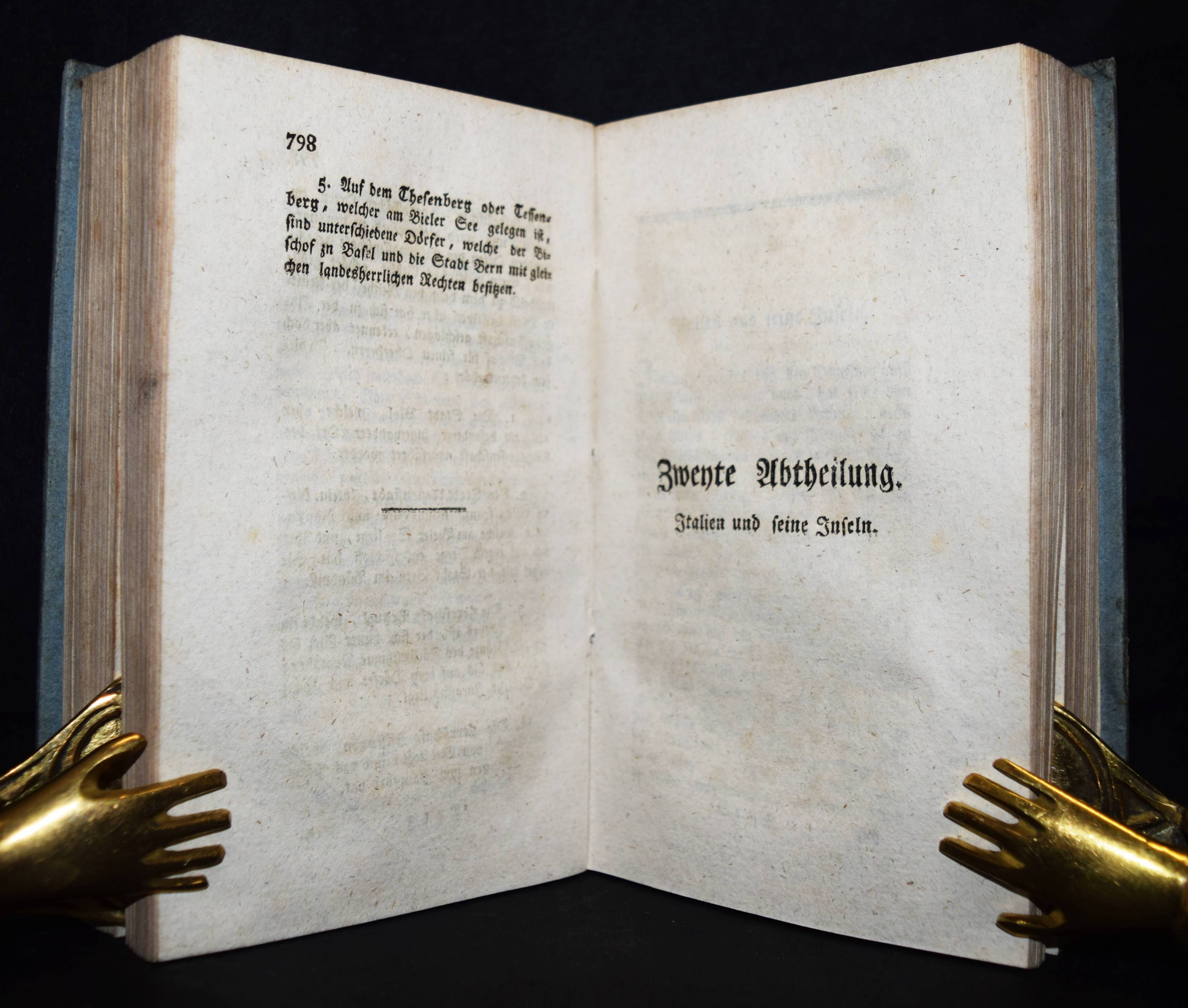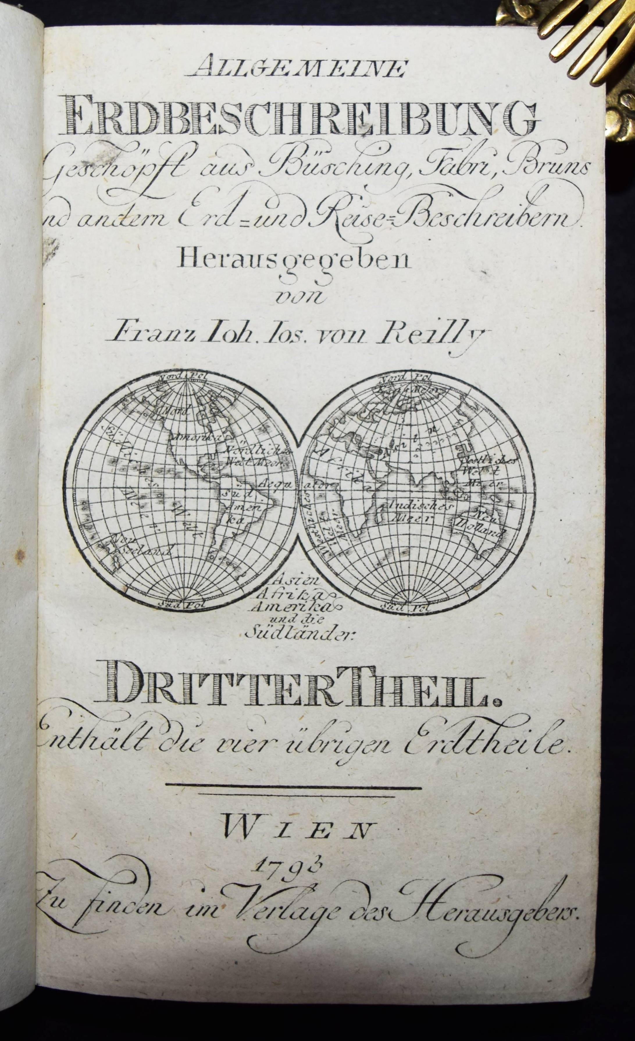 Reilly, Franz Joh(ann) Jos(ef) v. (Hrsg.). Allgemeine Erdbeschreibung. I. Enthält das östliche und nördliche Europa. – II. Enthält das westliche und südliche Europa. – III. Enthält die vier übrigen Erdtheile. 3 Bände. Wien, Selbstverlag 1792-1793. 8°. Gestoch. Titel, 566 S.; gestoch. Titel, 1263 S.; gestoch. Titel, 718 S., die gestoch. Titel jeweils mit 1 Karte. Pbde. d. Zt. mit Rückensch. NBD XXI, 334. ÖBL IX, 39. – Erste Ausgabe. – Die gestoch. Titel mit kleinen Karten: Nordosteuropa, Südwesteuropa und eine Weltkarte in 2 Hemisphären. – Der zweite Teil von Bd. II mit einem separaten Zwischentitel „Italien und seine Inseln“. – Der Wiener Kartograph und Verleger F. J. J. Reilly (1766-1820) gründete 1789 in Wien seinen Verlag für kartographische Kupferstichwerke. „Mit seiner enormen Produktion (1789–1802 erschien mindestens eine Karte pro Woche) besaß R.s Verlag um die Jahrhundertwende eine dominierende Stellung in der aufstrebenden Wiener Privatkartographie, die Nürnberg, das zuvor führende Zentrum der Kartenherstellung im Röm.-Dt. Reich, überflügelte“ (J. Dörflinger in NDB). – Stellenweise etwas braunfleckig, sehr gutes Exemplar.