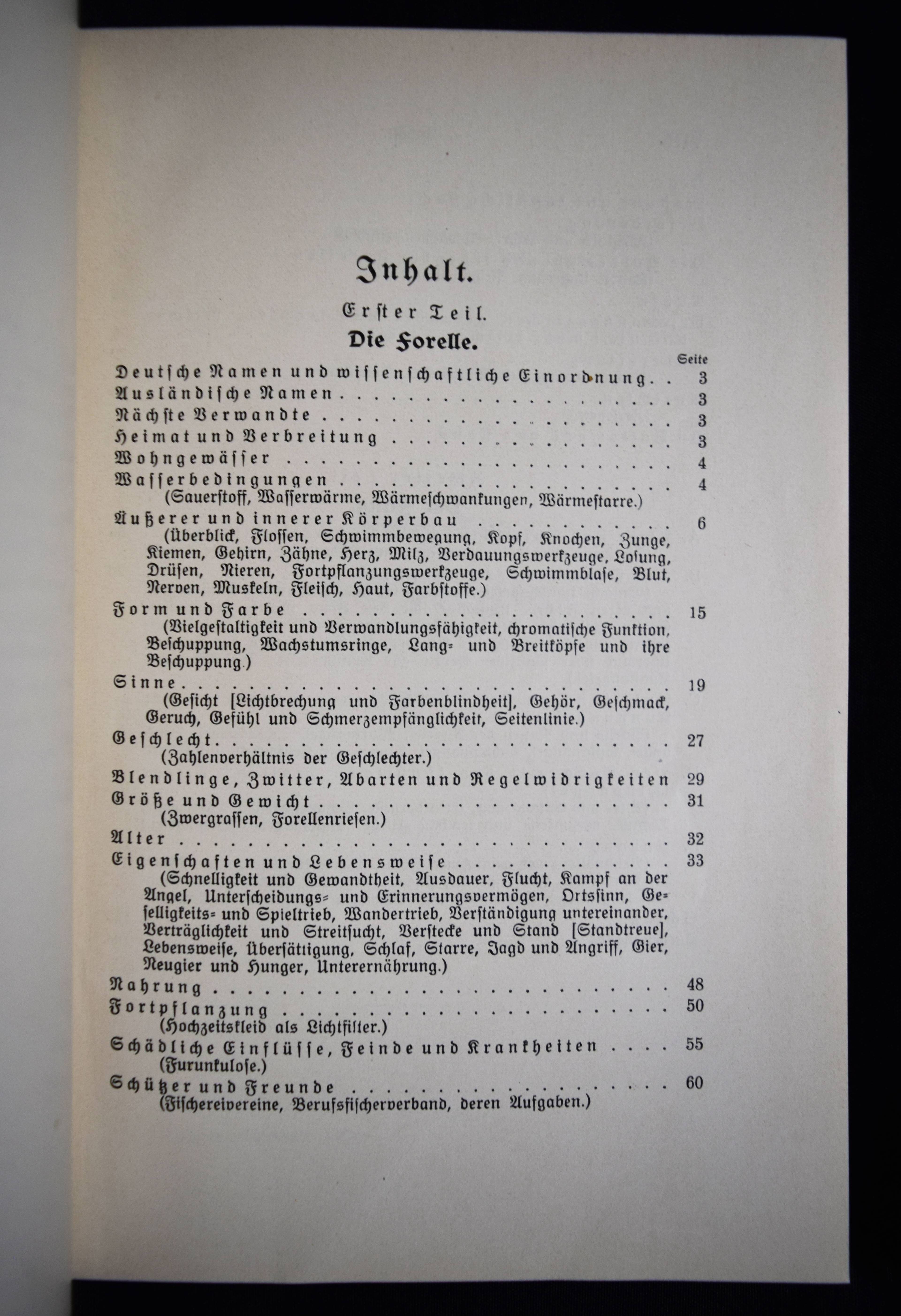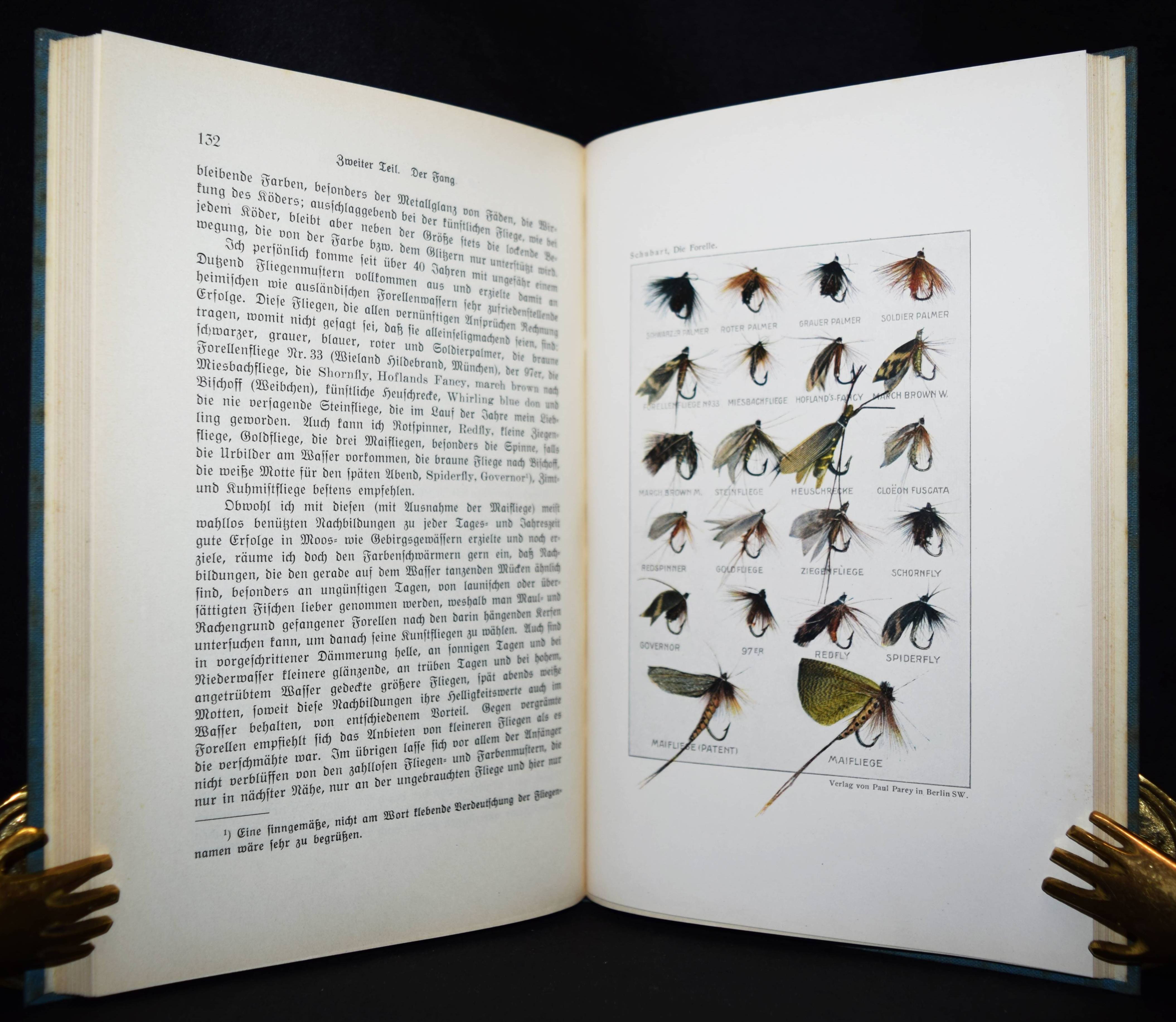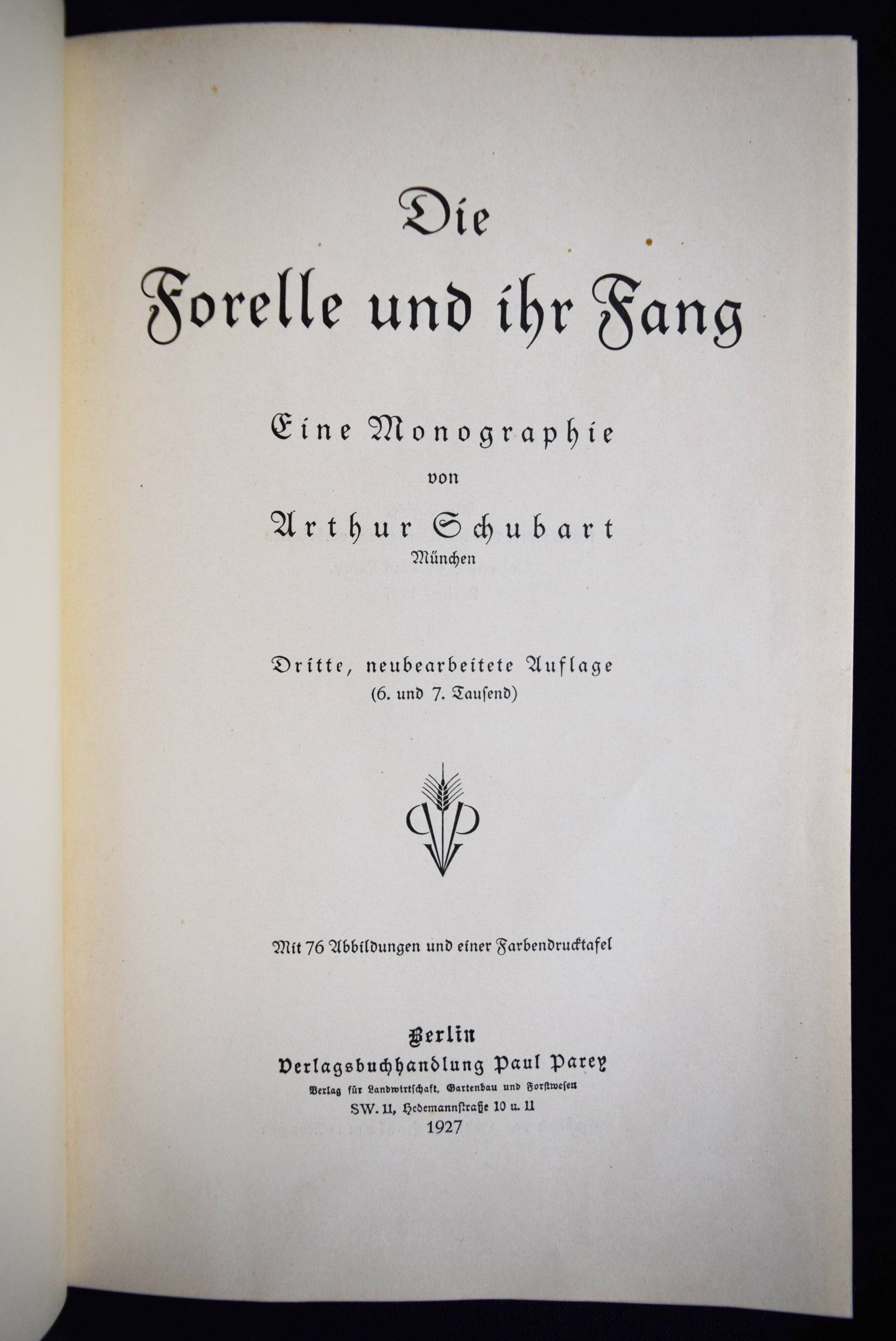 Schubart, Arthur. Die Forelle und ihr Fang. Eine Monographie. 3., neubearbeitete Aufl. Berlin, Parey 1927. 8°. 184 S. mit 76 Abbildungen und einer Farbendrucktafel. Illustrierter OLn. (von Ludwig Hohlwein). Einband etwas braunfleckig, gutes Exemplar.