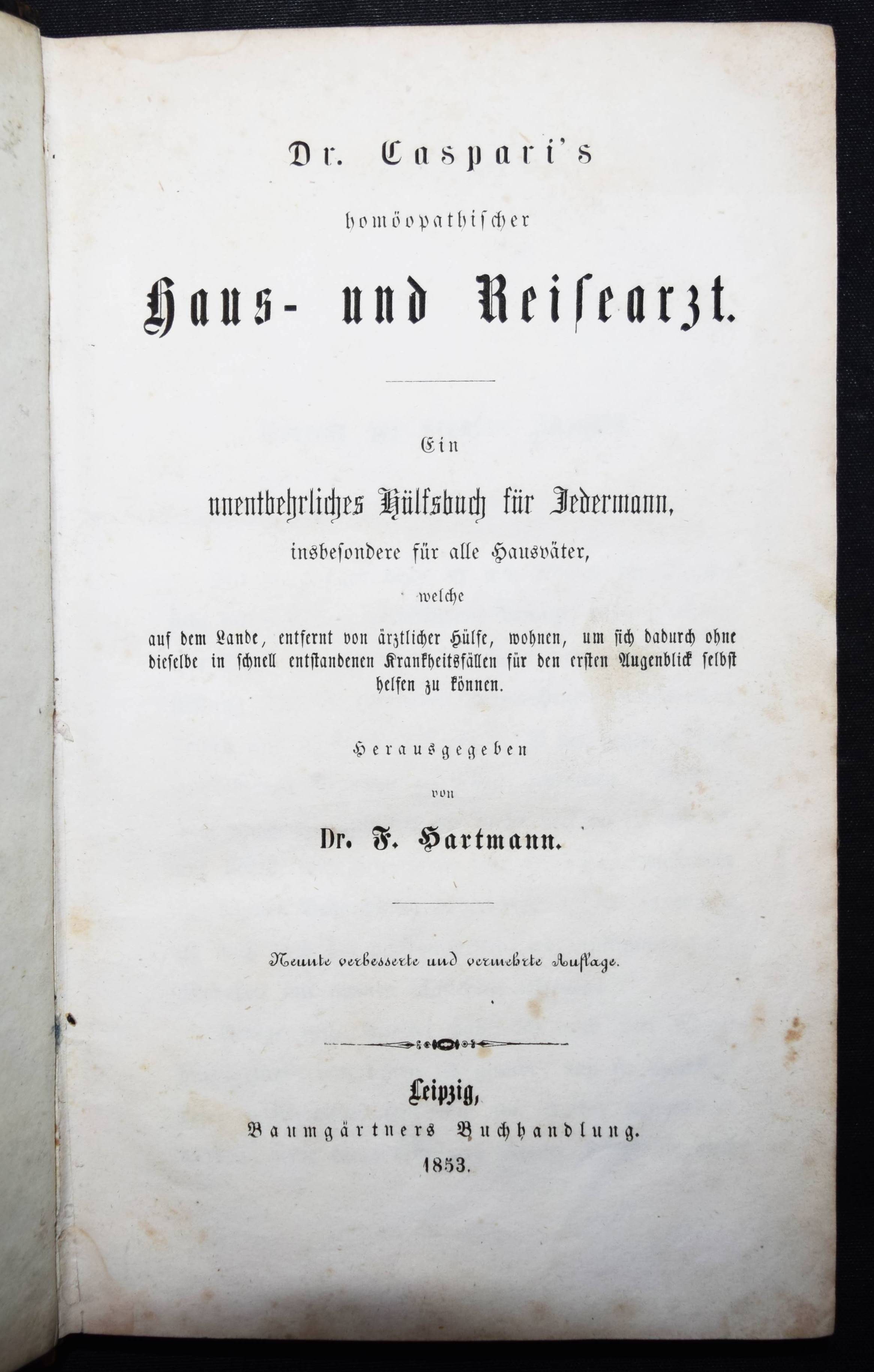 Caspari, (Carl Gottlob). Dr. Caspari’s homöopathischer Haus- und Reisearzt. Ein unentbehrliches Hülfsbuch für Jedermann, insbesondere für alle Hausväter, welche auf dem Lande, entfernt von ärztlicher Hülfe, wohnen, um sich dadurch ohne dieselbe in schnell entstandenen Krankheitsfällen für den ersten Augenblick selbst helfen zu können. 9. verbessert u. vermehrte Auflage von F. Hartmann. Leipzig, Baumgärtners Buchhandlung 1853. 8°. XIV, 326 s. Hldr. d. Zt. mit goldgepr. Rückentitel und Rückenvergoldung. Hirsch-Hüb. I, 676. Tischner, Geschichte der Homöopathie 430 ff. (erste Ausgabe von 1826). – Einband etwas berieben, vorderes freies Vorsatzbl. fehlt, stellenweise etwas braunfleckig, gutes Exemplar.