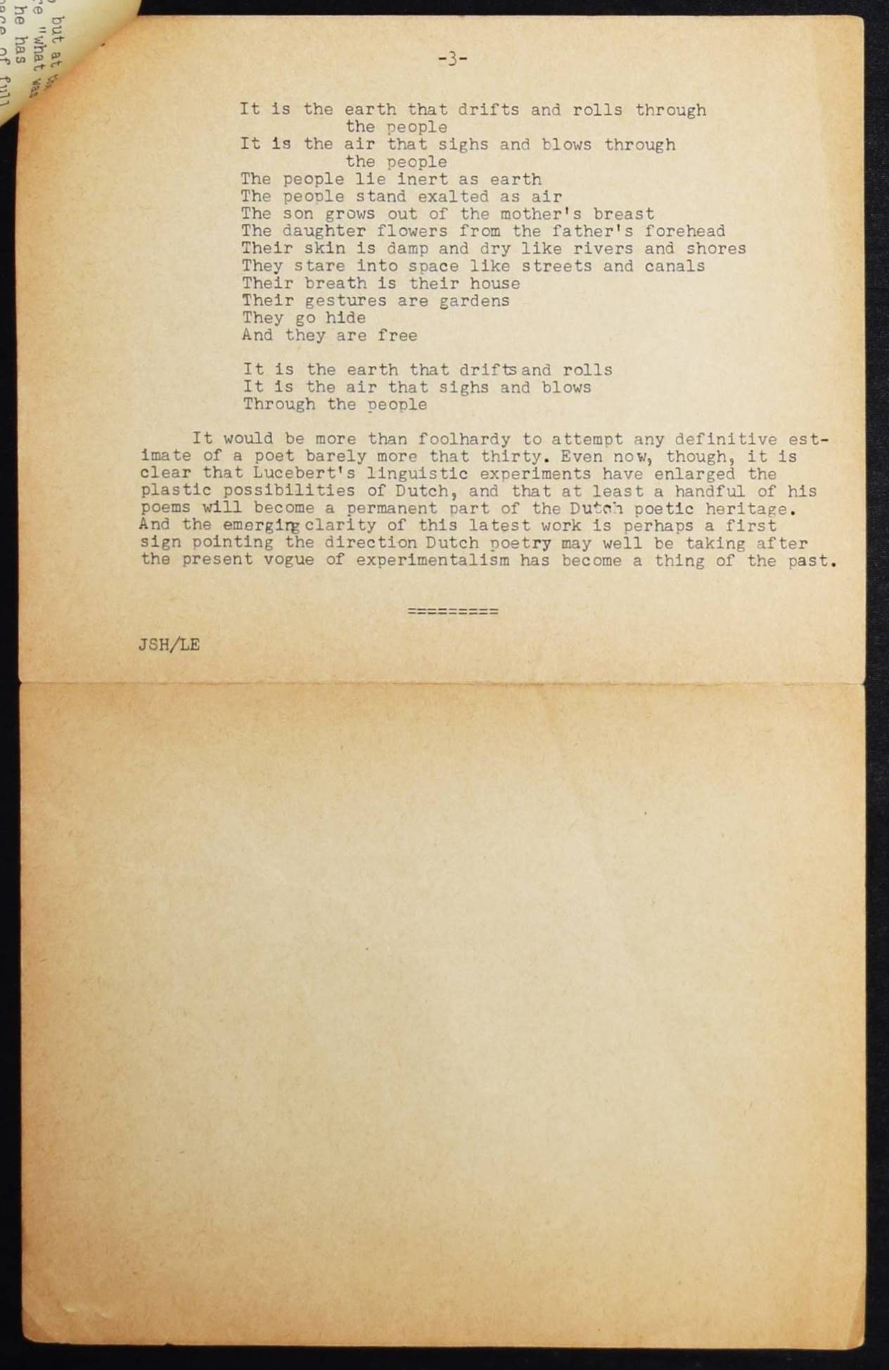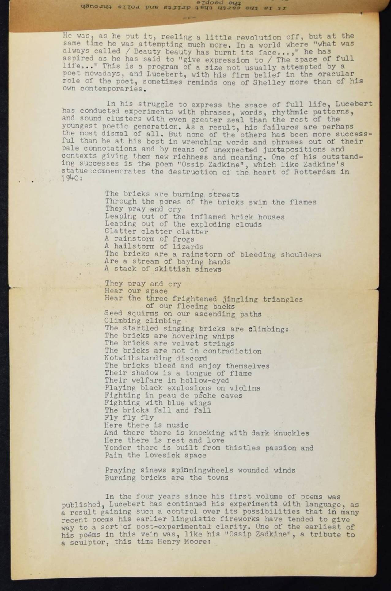 Lucebert (d. i. Lubertus Jacobus Swaanswijk). The burnt face of beauty. Dutch poetry. Script by James S. Holmes. Orig.-Typoskript für eine Radio-Sendung. Hilversum, Radio Nederland 12.-13. September 1955. 4°. 3 S. Orig.-Typoskript für eine Radiosendung über den bedeutenden niederl. Avantgarde-Künstlers mit 4 Gedichten. Mit Briefkopf in Blau und Rot: „News from the Netherlands. Radio Nederland“. – „Of the experimentalists who appeared on the Dutch poetic scene around 1950 none has been so much the centre of controversy: so much the object of avid praise and violent condemnation as the young poet who writes under the nom de plume Lucebert. The controversy, the praise and condemnation were perhaps inevitable, the sacrosanctities of traditional poetry. …“ (J. S. Holmes). – Lucebert (1924-1994) gründete 1948 „mit anderen jungen Dichtern und Malern die Experimentele Groep in Holland. Ihr Ziel war es, „erstarrte ästhetische Auffassungen zu bekämpfen“ um „eine freie Entfaltung der neuen künstlerischen Prinzipien“ zu ermöglichen. Nach gemeinsamen Arbeiten mit belgischen und dänischen Künstlern, wie Pierre Alechinsky und Asger Jorn und Carl-Henning Pedersen, gründeten sie in Paris die Gruppe Cobra. Lucebert war vor allem als Lyriker bei der Gruppe aktiv. Luceberts erste Lesung seiner Gedichte anlässlich der ersten Cobra-Ausstellung endet mit einem Eklat. Nach Tumulten im Publikum musste die Polizei die Vorlesung von Lucebert und seinen Freunden vorzeitig beenden. … Mit surrealistischen und dadaistischen Einflüssen galt Luceberts Lyrik als avantgardistisch und revolutionär. Er brach die gängigen Regeln der Dichtung und schuf eine neue, junge und moderne Schreibweise“ (Wikipedia). – Papierbedingt etwas gebräunt, sonst gut erhalten.