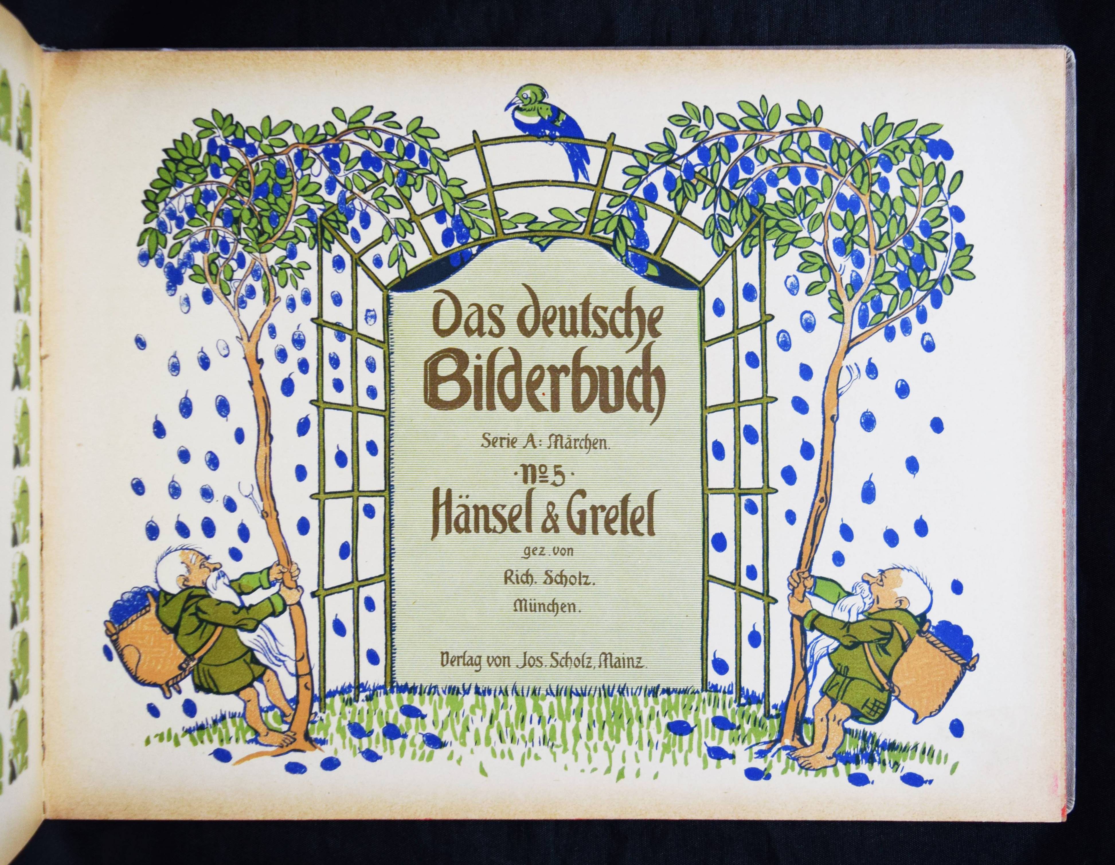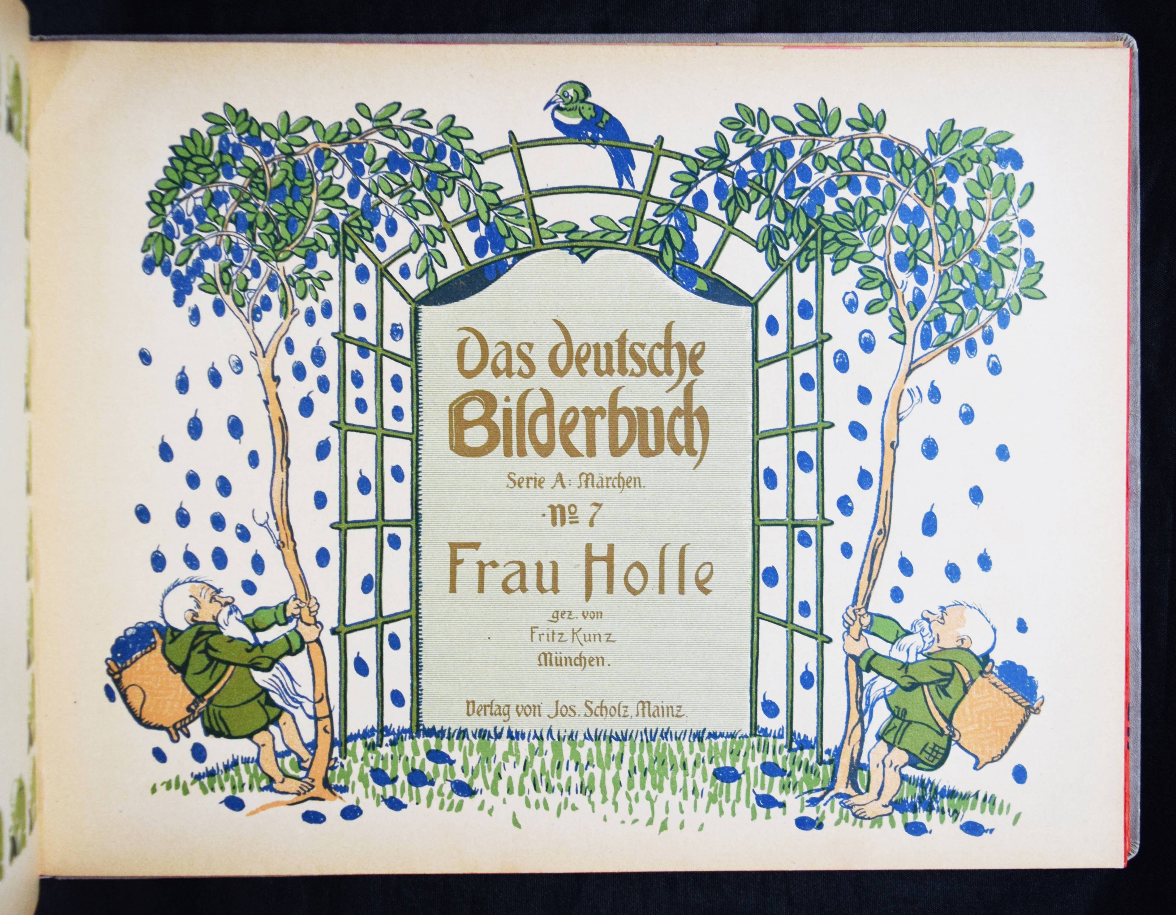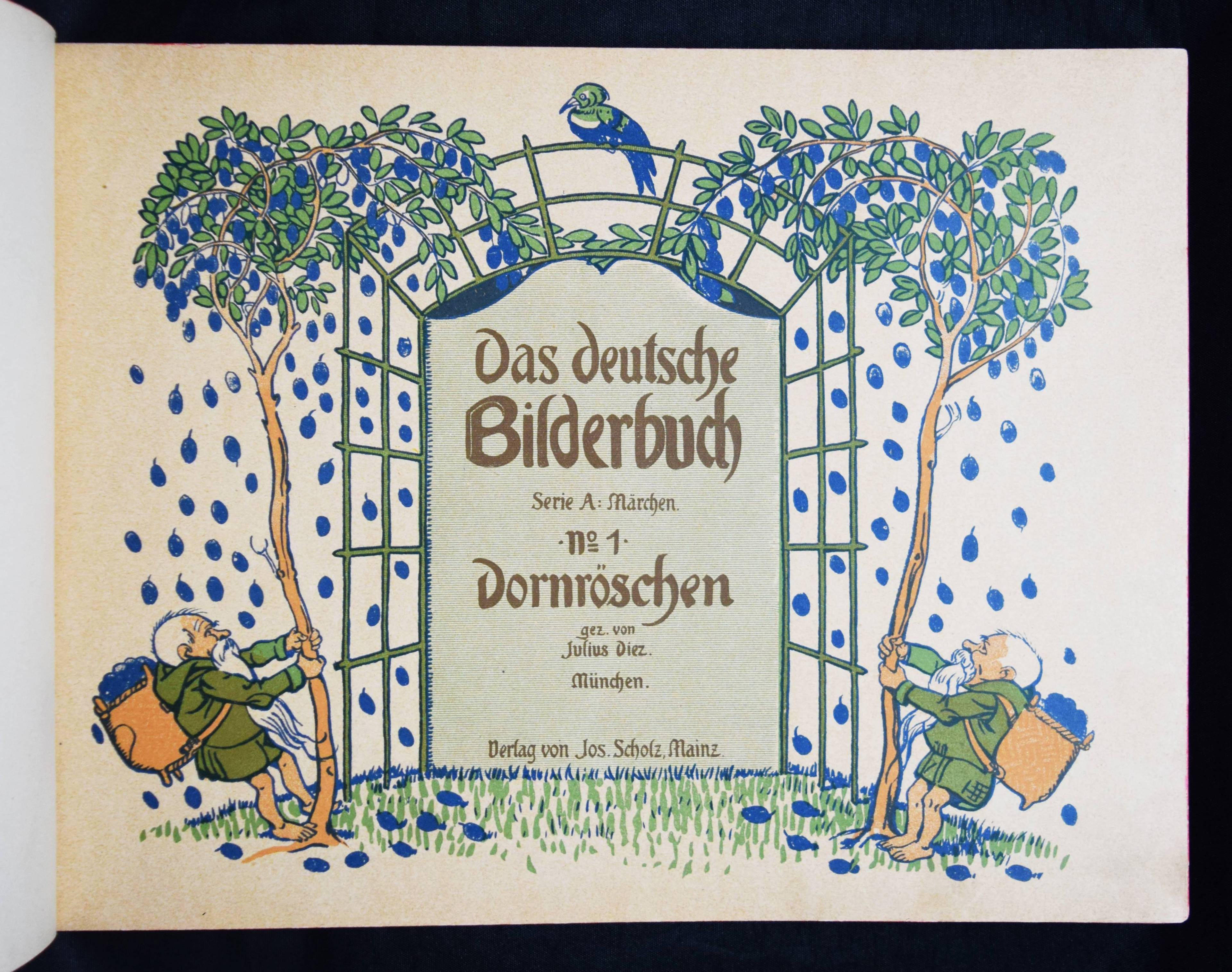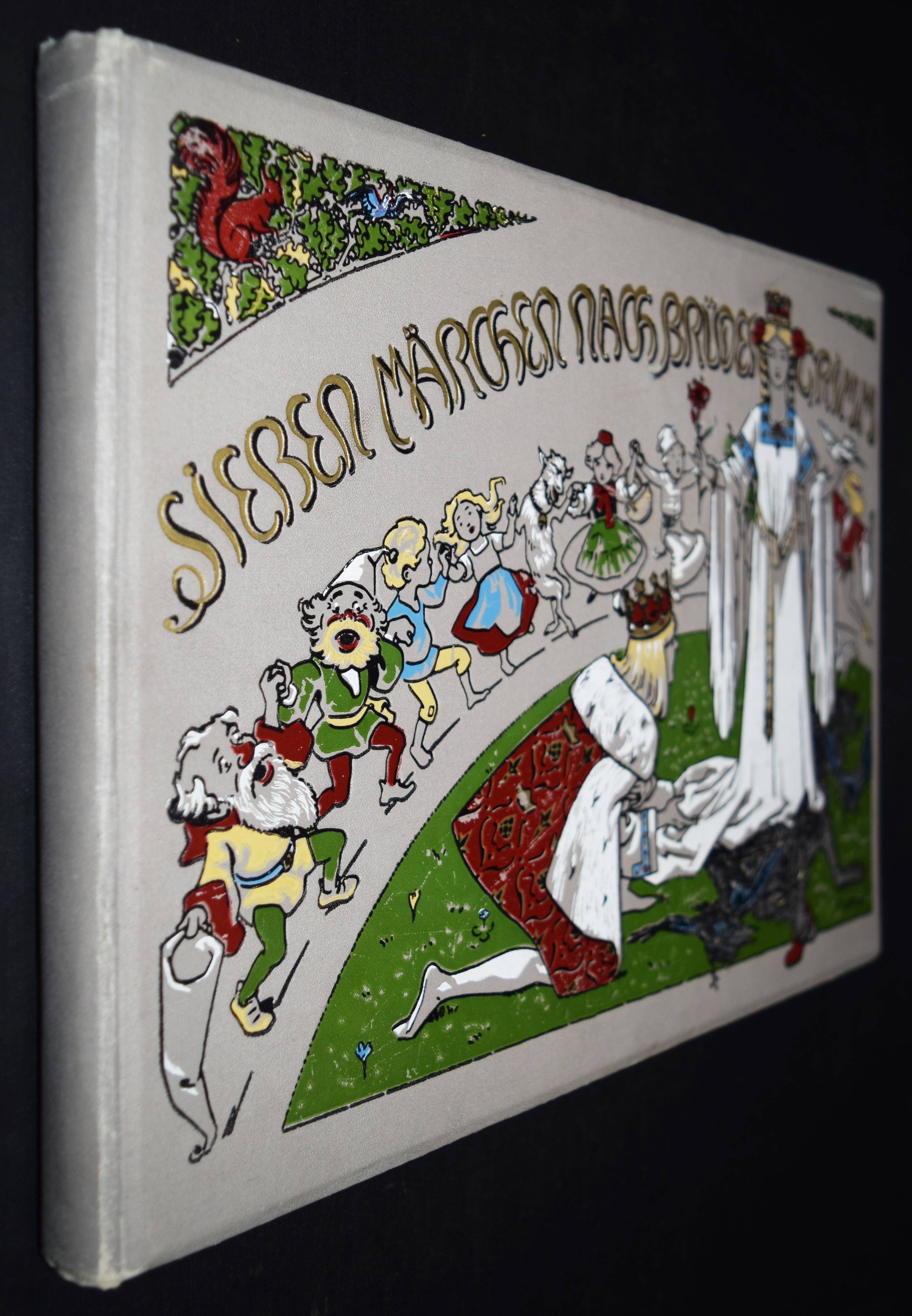 (Grimm, Jakob u. Wilhelm). Sieben Märchen nach Brüder Grimm. (Deckeltitel). (Sammelband der Märchen-Bilderbücher Nr. 1-7). Mainz, Scholz o. J. (1905). Quer-8°. 56 unbez. Bl. mit 7 wdh. farb. illustr. Titeln (zwei Zwerge mit Pflaumenbäumen, Entwurf von J. Diez), 56 farbalgraphierten Farbtafeln (von dünnen Aluminiumplatten gedruckt) u. Illustrationen im Text. Farbig illustr. OLn. (von Franz Jüttner). (″Das deutsche Bilderbuch“. Serie A: Märchen Nr. 1-7, Nr. 103). Klotz 9000/82. Doderer-Müller S. 257 ff. (mit Abb.). Ries, Scholz S. 138. Wegehaupt, Grimm S. 37 f. (mit Abb.). – Seltener Sammelband mit den sieben ersten Titeln der bekannten Märchen-Bilderbuch-Reihe des Scholz-Verlags; sogenannte „Prachtausgabe“. – Mit den von Julius Diez entworfenen Vorsätzen: Motiv „Paradiesvogel“. – Enthält die Märchen: Dornröschen mit Bildern von Julius Diez; Marienkind mit Bildern von Heinrich Lefler und Joseph Urban; Aschenputtel mit Bildern von Adolf Münzer; Rotkäppchen mit Bildern von Arpad Schmidhammer; Hänsel und Gretel mit Bildern von Richard Scholz; Sneewittchen mit Bildern von Franz Jüttner; Frau Holle mit Bildern von Fritz Kunz. – Vorliegender umfangreichster Sammelband der Reihe enthält auch die beiden bedeutendsten künstlerischen Beiträge „Das Marienkind“ der Wiener Künstler Lefler und Urban (vgl. Bilderwelt 466) sowie „Frau Holle“ des Schweizers Fritz Kunz (1868-1947, vgl. SBI S. 48 mit Abb. Tafel 6), „dessen festlich-dekorative und symbolistische Note in der ganzen Reihe hervorsticht“ (H. Ries). – Im Falz zwischen den Titeln teils geringfügig angeplatzt, papierbedingt gebräunt, sehr gutes Exemplar.