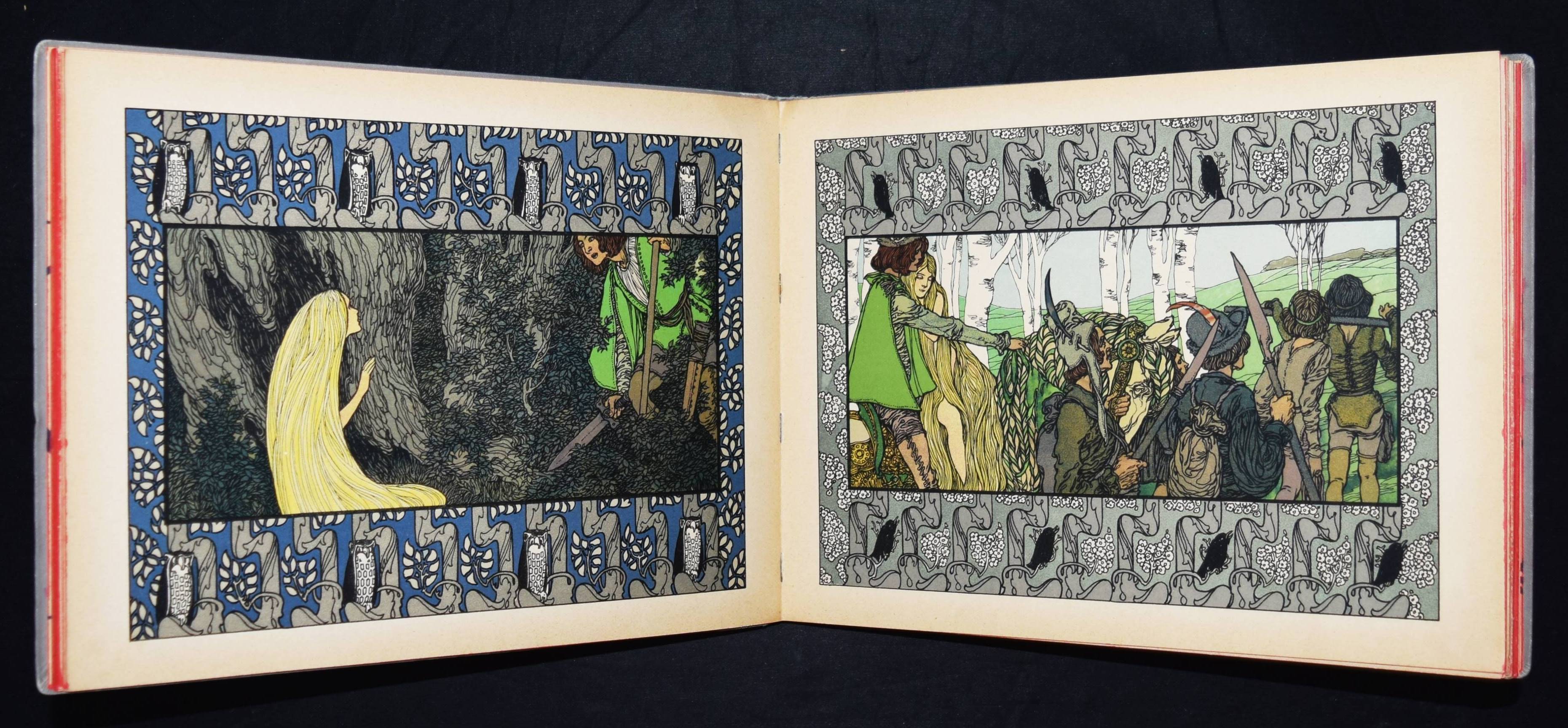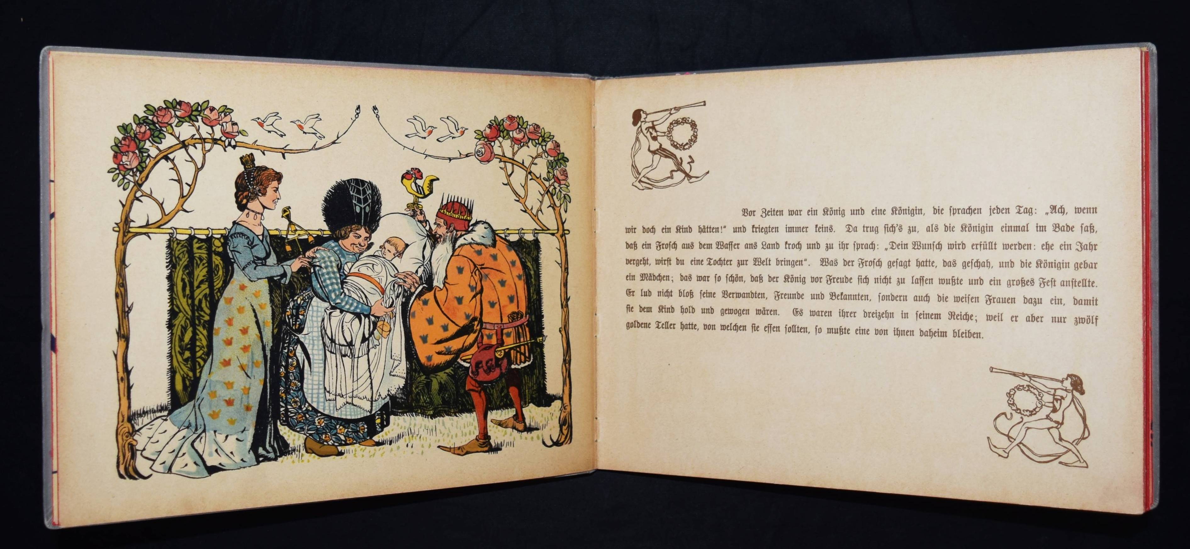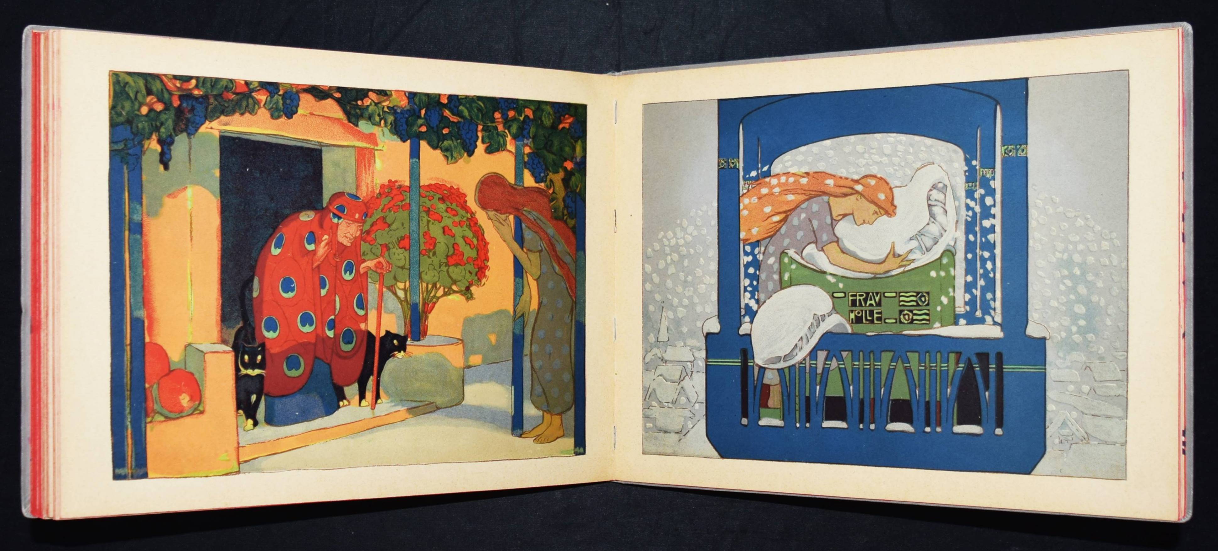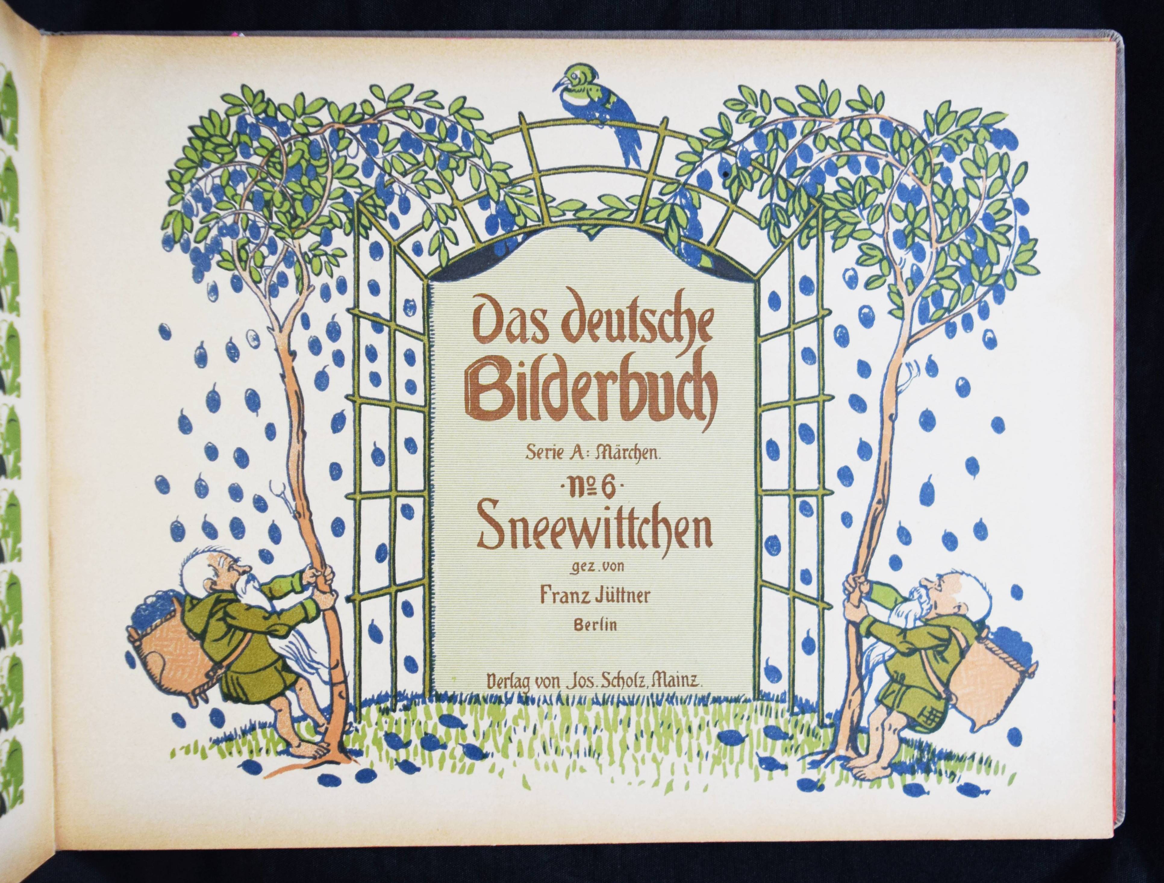 (Grimm, Jakob u. Wilhelm). Sieben Märchen nach Brüder Grimm. (Deckeltitel). (Sammelband der Märchen-Bilderbücher Nr. 1-7). Mainz, Scholz o. J. (1905). Quer-8°. 56 unbez. Bl. mit 7 wdh. farb. illustr. Titeln (zwei Zwerge mit Pflaumenbäumen, Entwurf von J. Diez), 56 farbalgraphierten Farbtafeln (von dünnen Aluminiumplatten gedruckt) u. Illustrationen im Text. Farbig illustr. OLn. (von Franz Jüttner). (″Das deutsche Bilderbuch“. Serie A: Märchen Nr. 1-7, Nr. 103). Klotz 9000/82. Doderer-Müller S. 257 ff. (mit Abb.). Ries, Scholz S. 138. Wegehaupt, Grimm S. 37 f. (mit Abb.). – Seltener Sammelband mit den sieben ersten Titeln der bekannten Märchen-Bilderbuch-Reihe des Scholz-Verlags; sogenannte „Prachtausgabe“. – Mit den von Julius Diez entworfenen Vorsätzen: Motiv „Paradiesvogel“. – Enthält die Märchen: Dornröschen mit Bildern von Julius Diez; Marienkind mit Bildern von Heinrich Lefler und Joseph Urban; Aschenputtel mit Bildern von Adolf Münzer; Rotkäppchen mit Bildern von Arpad Schmidhammer; Hänsel und Gretel mit Bildern von Richard Scholz; Sneewittchen mit Bildern von Franz Jüttner; Frau Holle mit Bildern von Fritz Kunz. – Vorliegender umfangreichster Sammelband der Reihe enthält auch die beiden bedeutendsten künstlerischen Beiträge „Das Marienkind“ der Wiener Künstler Lefler und Urban (vgl. Bilderwelt 466) sowie „Frau Holle“ des Schweizers Fritz Kunz (1868-1947, vgl. SBI S. 48 mit Abb. Tafel 6), „dessen festlich-dekorative und symbolistische Note in der ganzen Reihe hervorsticht“ (H. Ries). – Im Falz zwischen den Titeln teils geringfügig angeplatzt, papierbedingt gebräunt, sehr gutes Exemplar.