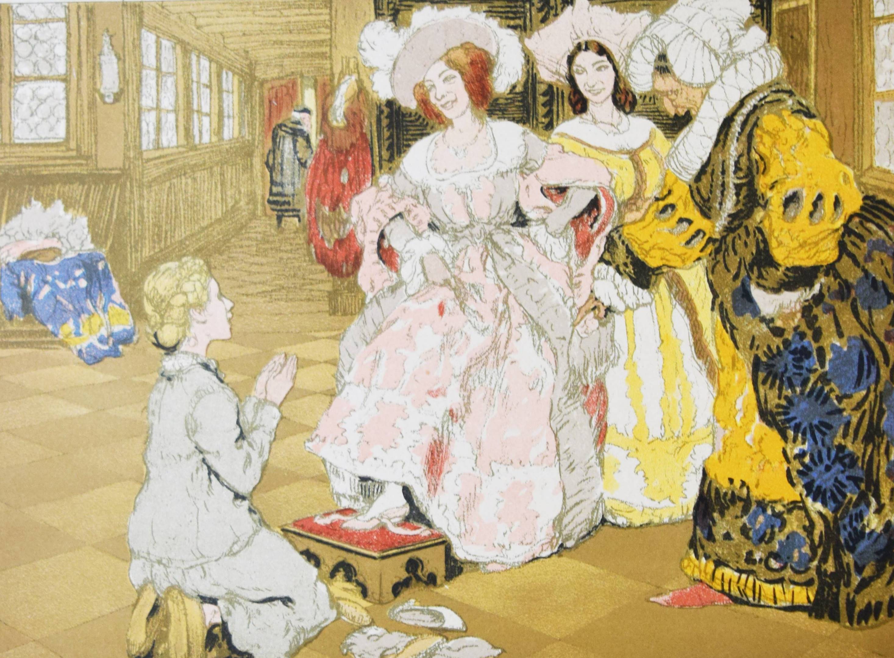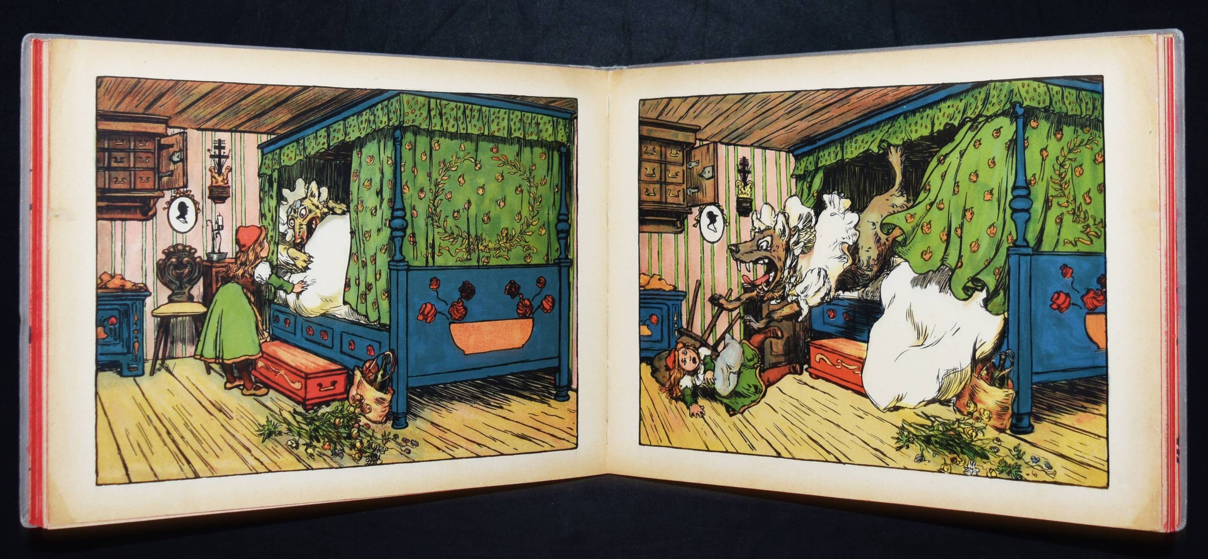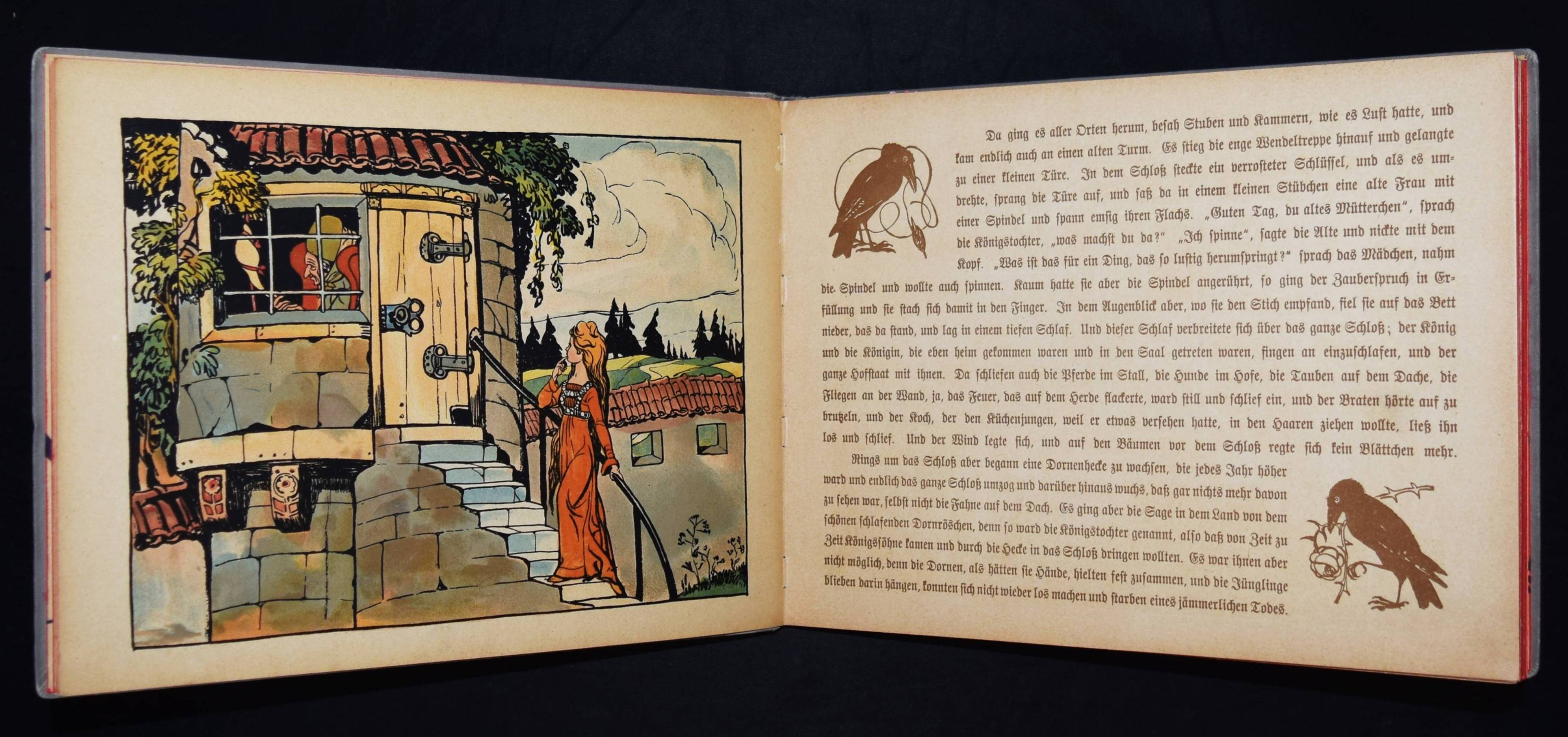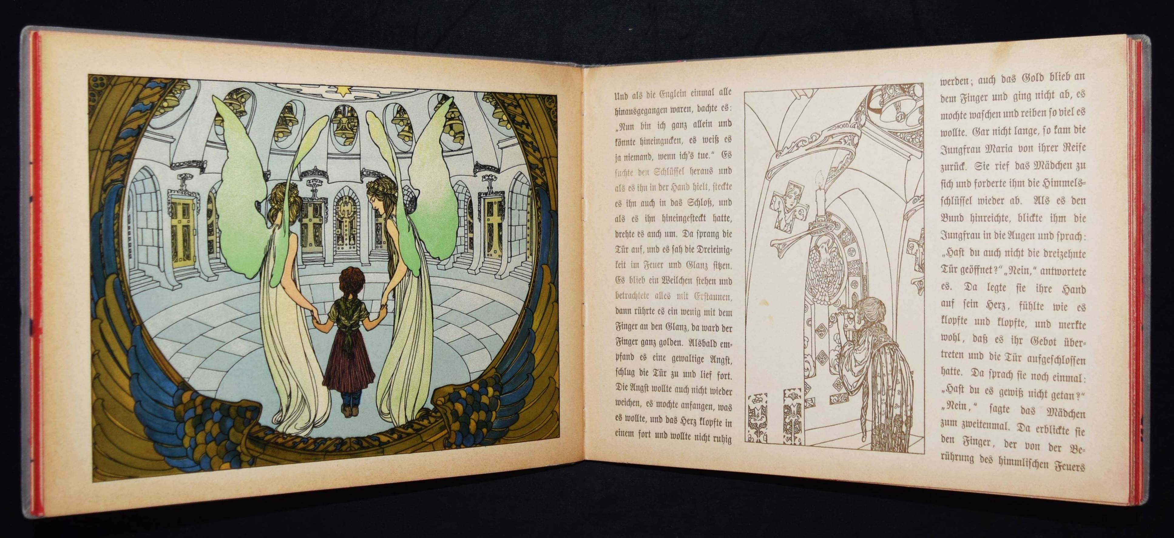 (Grimm, Jakob u. Wilhelm). Sieben Märchen nach Brüder Grimm. (Deckeltitel). (Sammelband der Märchen-Bilderbücher Nr. 1-7). Mainz, Scholz o. J. (1905). Quer-8°. 56 unbez. Bl. mit 7 wdh. farb. illustr. Titeln (zwei Zwerge mit Pflaumenbäumen, Entwurf von J. Diez), 56 farbalgraphierten Farbtafeln (von dünnen Aluminiumplatten gedruckt) u. Illustrationen im Text. Farbig illustr. OLn. (von Franz Jüttner). (″Das deutsche Bilderbuch“. Serie A: Märchen Nr. 1-7, Nr. 103). Klotz 9000/82. Doderer-Müller S. 257 ff. (mit Abb.). Ries, Scholz S. 138. Wegehaupt, Grimm S. 37 f. (mit Abb.). – Seltener Sammelband mit den sieben ersten Titeln der bekannten Märchen-Bilderbuch-Reihe des Scholz-Verlags; sogenannte „Prachtausgabe“. – Mit den von Julius Diez entworfenen Vorsätzen: Motiv „Paradiesvogel“. – Enthält die Märchen: Dornröschen mit Bildern von Julius Diez; Marienkind mit Bildern von Heinrich Lefler und Joseph Urban; Aschenputtel mit Bildern von Adolf Münzer; Rotkäppchen mit Bildern von Arpad Schmidhammer; Hänsel und Gretel mit Bildern von Richard Scholz; Sneewittchen mit Bildern von Franz Jüttner; Frau Holle mit Bildern von Fritz Kunz. – Vorliegender umfangreichster Sammelband der Reihe enthält auch die beiden bedeutendsten künstlerischen Beiträge „Das Marienkind“ der Wiener Künstler Lefler und Urban (vgl. Bilderwelt 466) sowie „Frau Holle“ des Schweizers Fritz Kunz (1868-1947, vgl. SBI S. 48 mit Abb. Tafel 6), „dessen festlich-dekorative und symbolistische Note in der ganzen Reihe hervorsticht“ (H. Ries). – Im Falz zwischen den Titeln teils geringfügig angeplatzt, papierbedingt gebräunt, sehr gutes Exemplar.