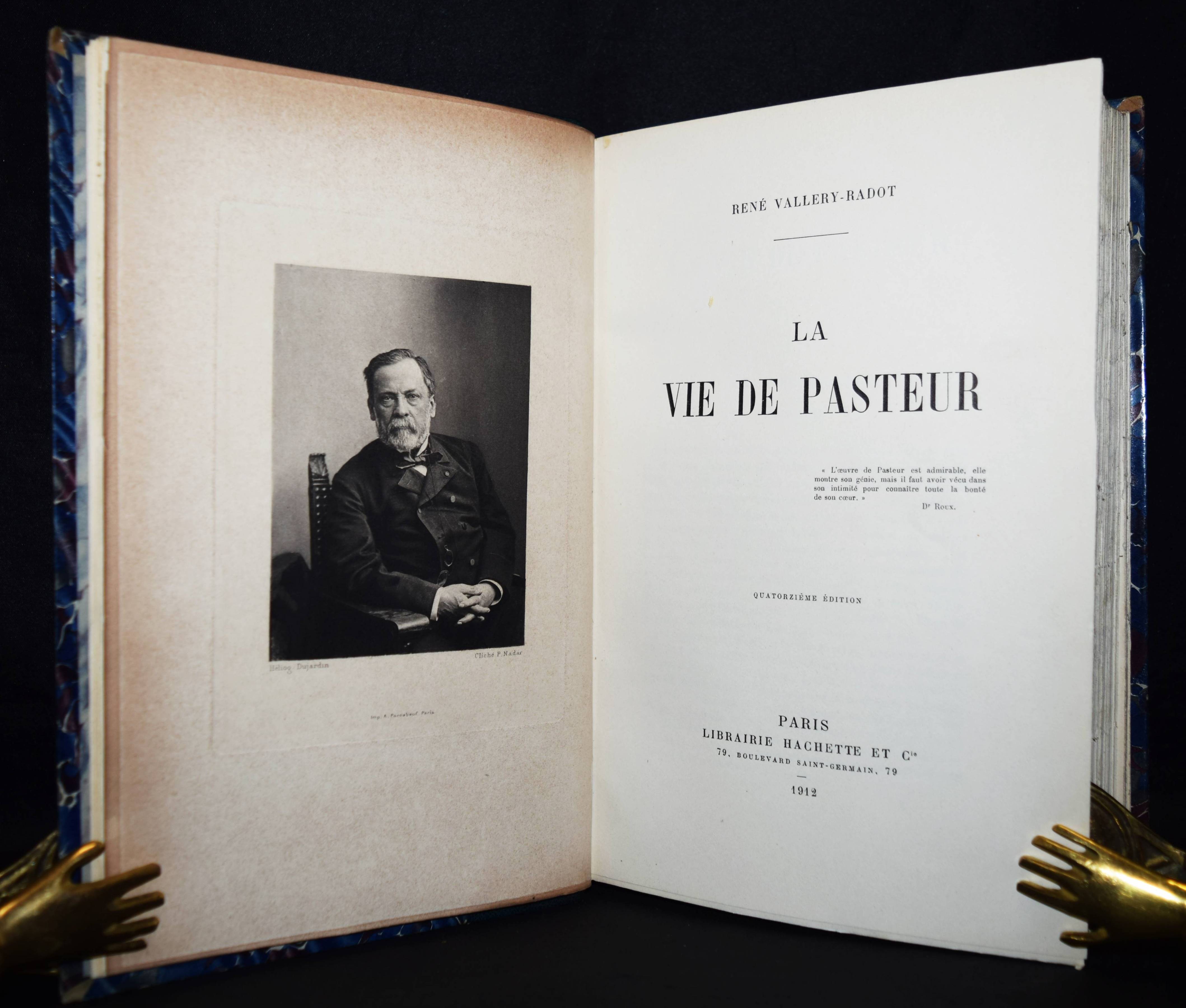 Pasteur – Vallery-Radot, René. La vie de Pasteur. Quatorzième édition. Paris, Hachette et Cie. 1912. Gr.-8°. [2] Bl., 692 S. mit 1 Portrait in Heliogravure nach einer Fotografie von P(aul) Nadar. Hldr. d. Zt. mit dekorativer Rückenvergoldung und Kopfgoldschnitt (Orig.-Umschlag beigebunden). Dekorativ gebundenes Exemplar der wichtigsten Biographie des großen franz. Chemikers. – Sehr gut erhalten.