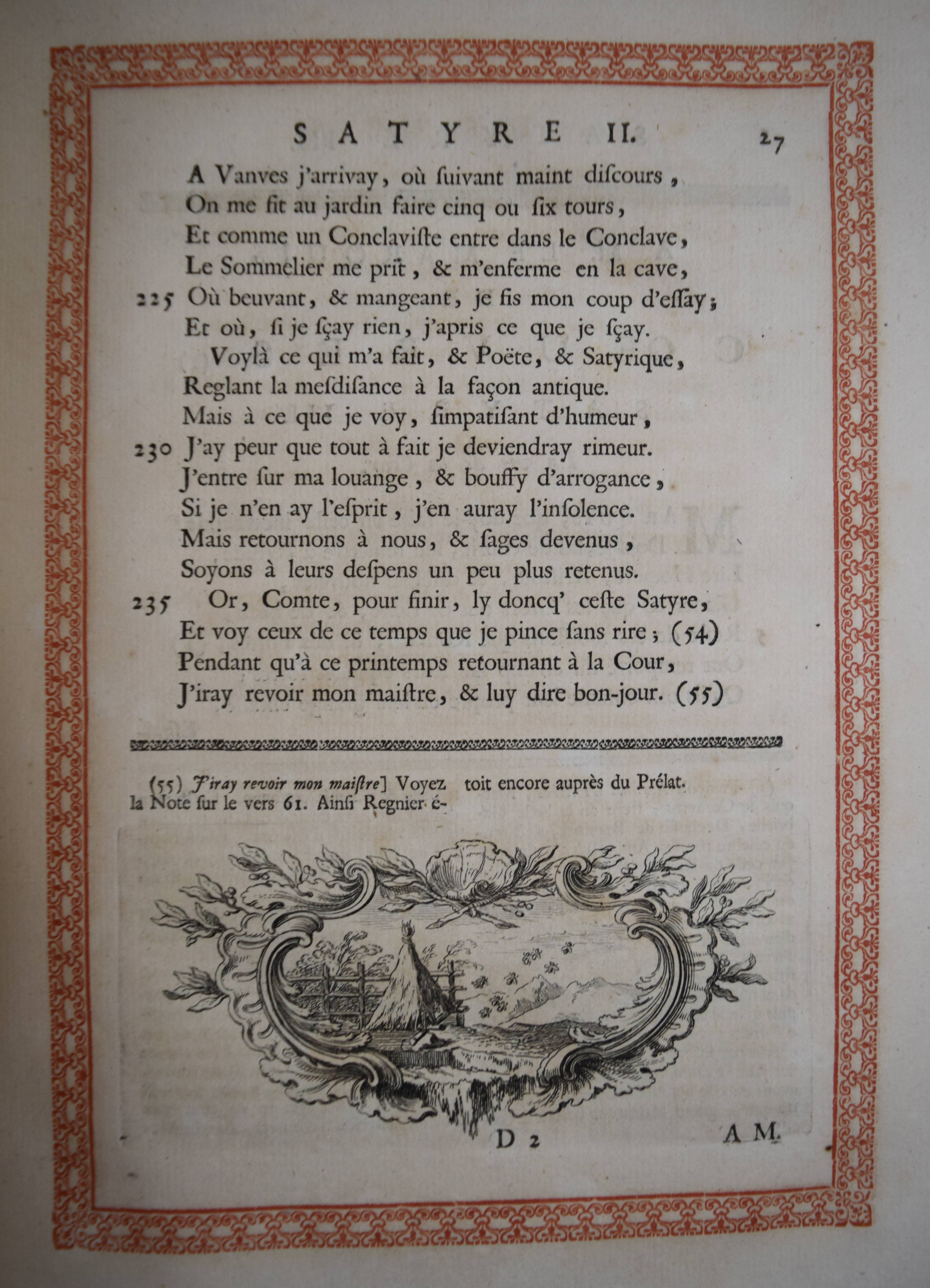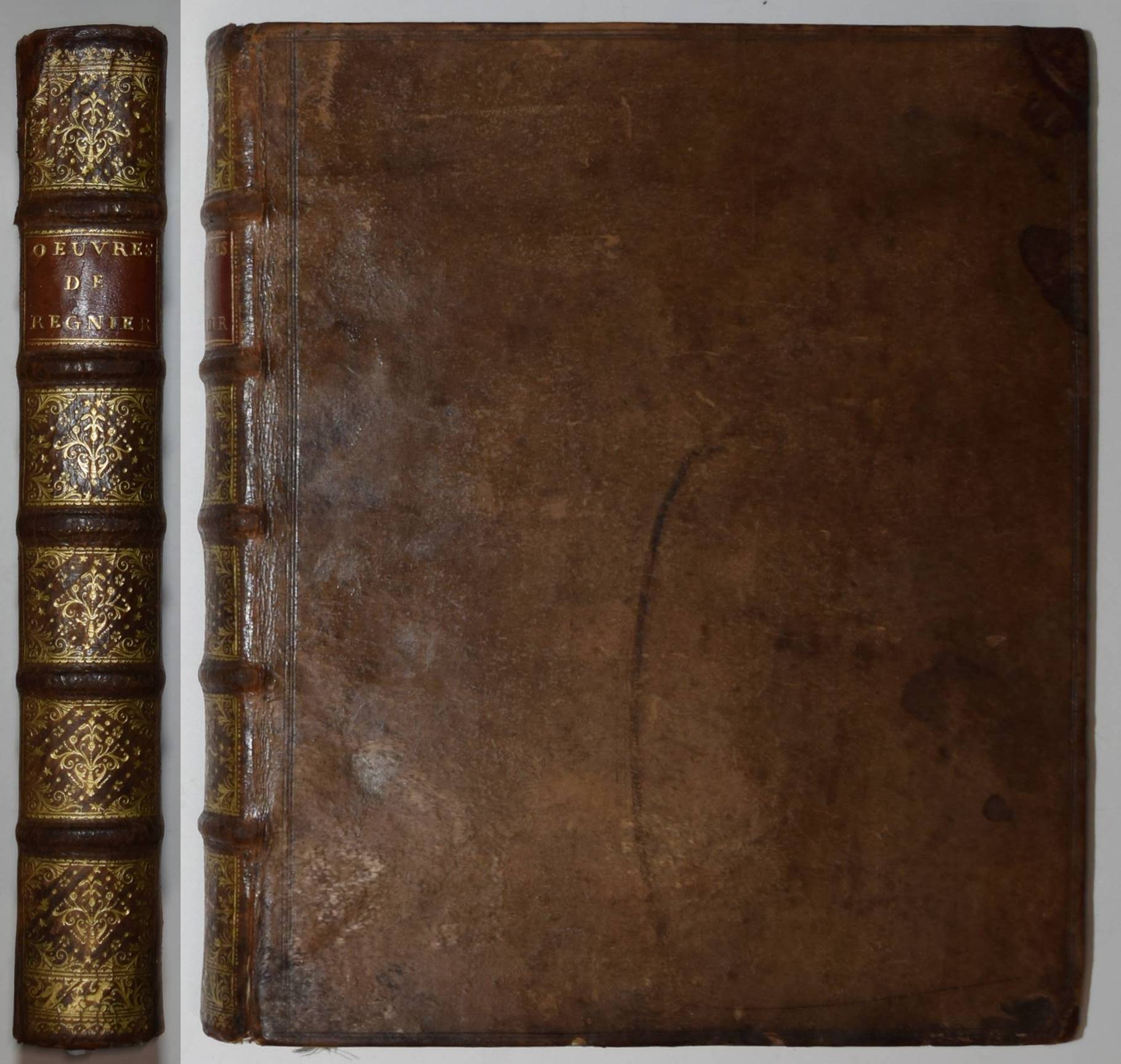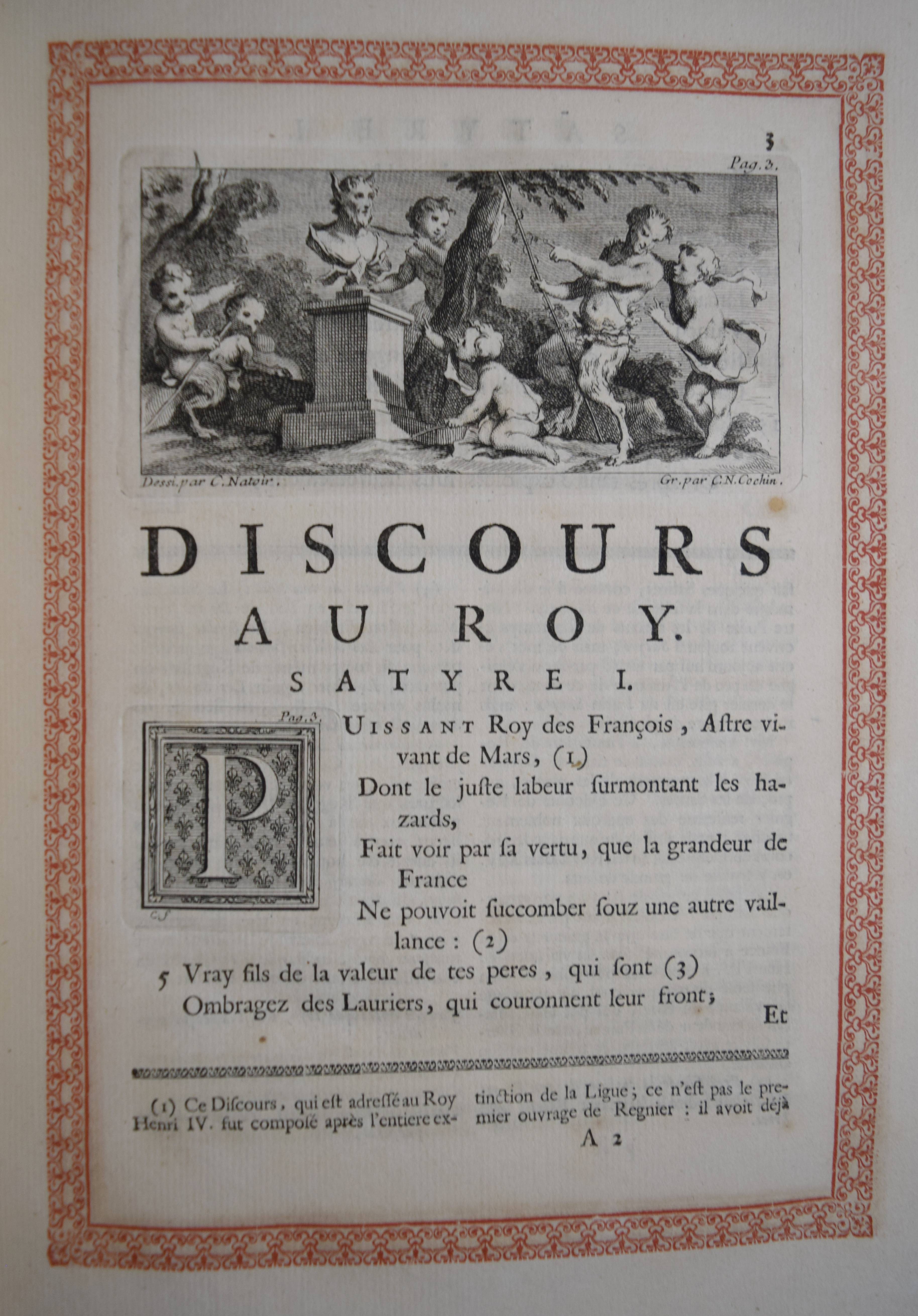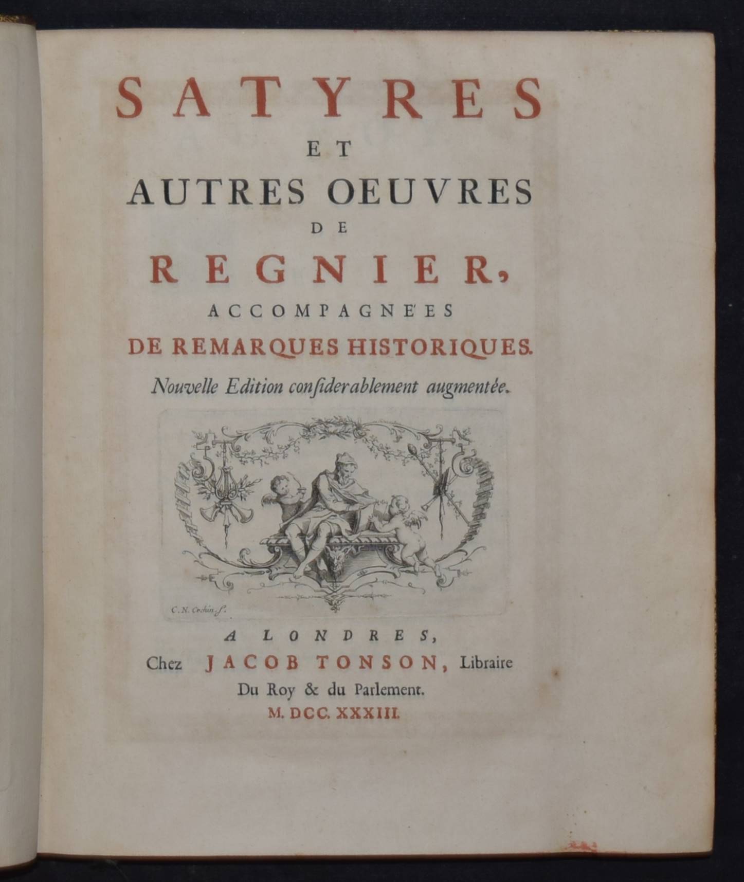 Régnier, (Mathurin). Satyres et autres oeuvres de Regnier. Accompagnées de remarques historiques. Nouvelle edition considerablement augmentée. Londres (i.e. Amsterdam), Jacob Tonson 1733. 4° (28 x 23,5 cm.). XX,420 S. mit Titel in Rot u. Schwarz, gestoch. Frontispiz von L. Cars nach C. Natoire, gestoch. Titelvignette von Nicolas Cochin und 21 (teils wdh.) Kopf- und Schlußvignetten von Cochin nach Boucher und Natoire sowie 1 gestoch. Portrait von St.-Aubin. Kalbslederband der Zeit. mit goldgepr. Rückenschild, reicher floraler Rückenvergoldung und Innenkantenvergoldung. Brunet IV, 1188. Cioranescu 19048. Cohen-Ricci 867. Graesse VI, 67. Sander 1684. Tchemerzine IX, 392. – Prachtvoll ausgestattete Ausgabe; jede Seite mit roter Bordüre. – Mit historischen Anmerkungen von Claude Brossette und Lenglet-Dufresnoy. – Der franz. Satiriker M. Régnier (1573-1613), Neffe des Dichters Philippe Desportes, wurde 1609 zum Domherrn von Chartres ernannt. „Seine sechzehn Satiren, die das alltägliche Leben und typische Figuren seiner Zeit behandeln, sind im Stil von Horaz und Juvenal verfasst. Die Sprache ist volkstümlich und farbenreich. Als sein bedeutendstes Werk gilt die Satire Macette“ (Wikipedia). – Einband etwas berieben, vorderes Gelenk unten etwas angeplatzt, stellenweise wasserfleckig und teils stärker gebräunt, insgesamt gutes dekorativ gebundenes Exemplar.