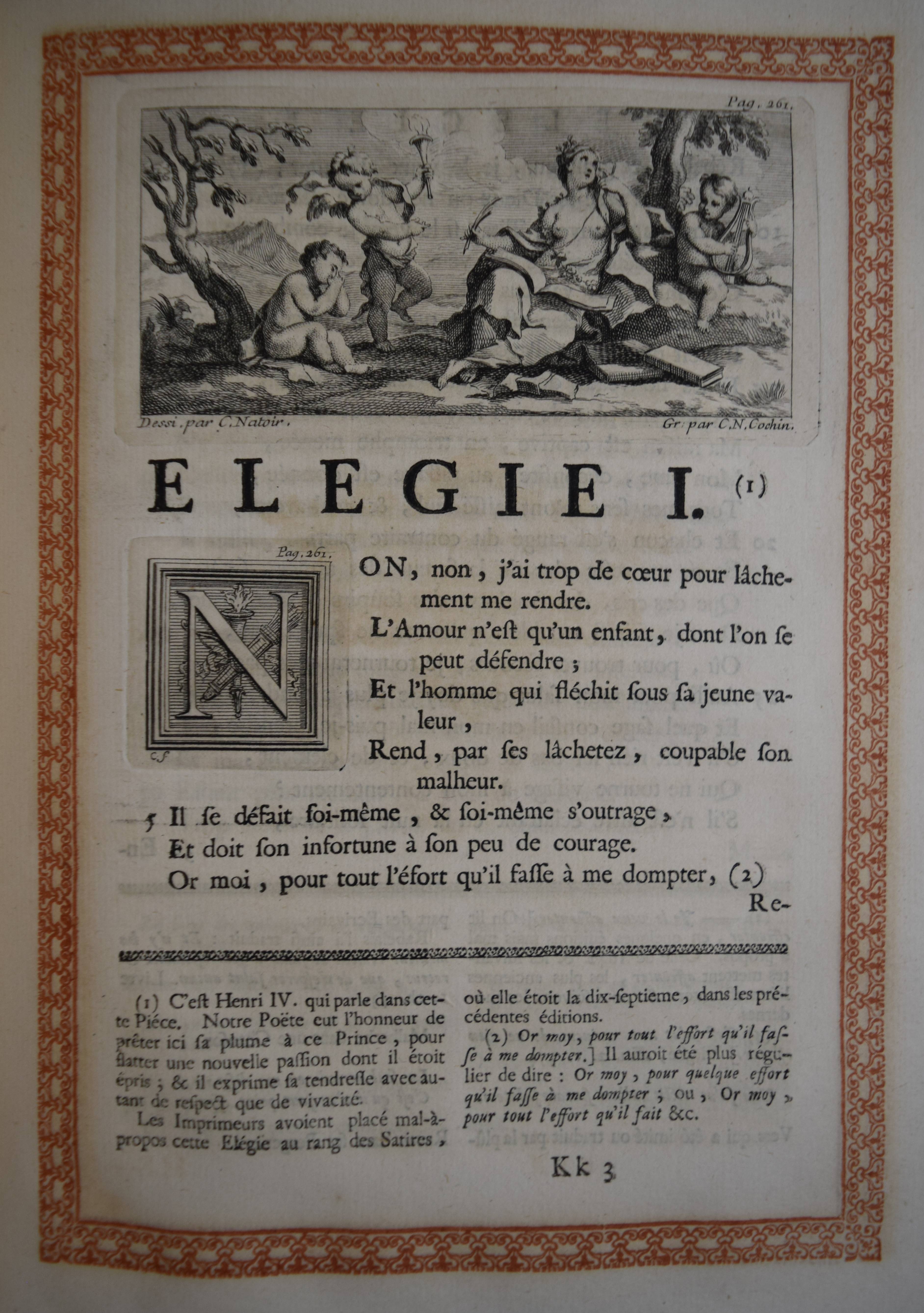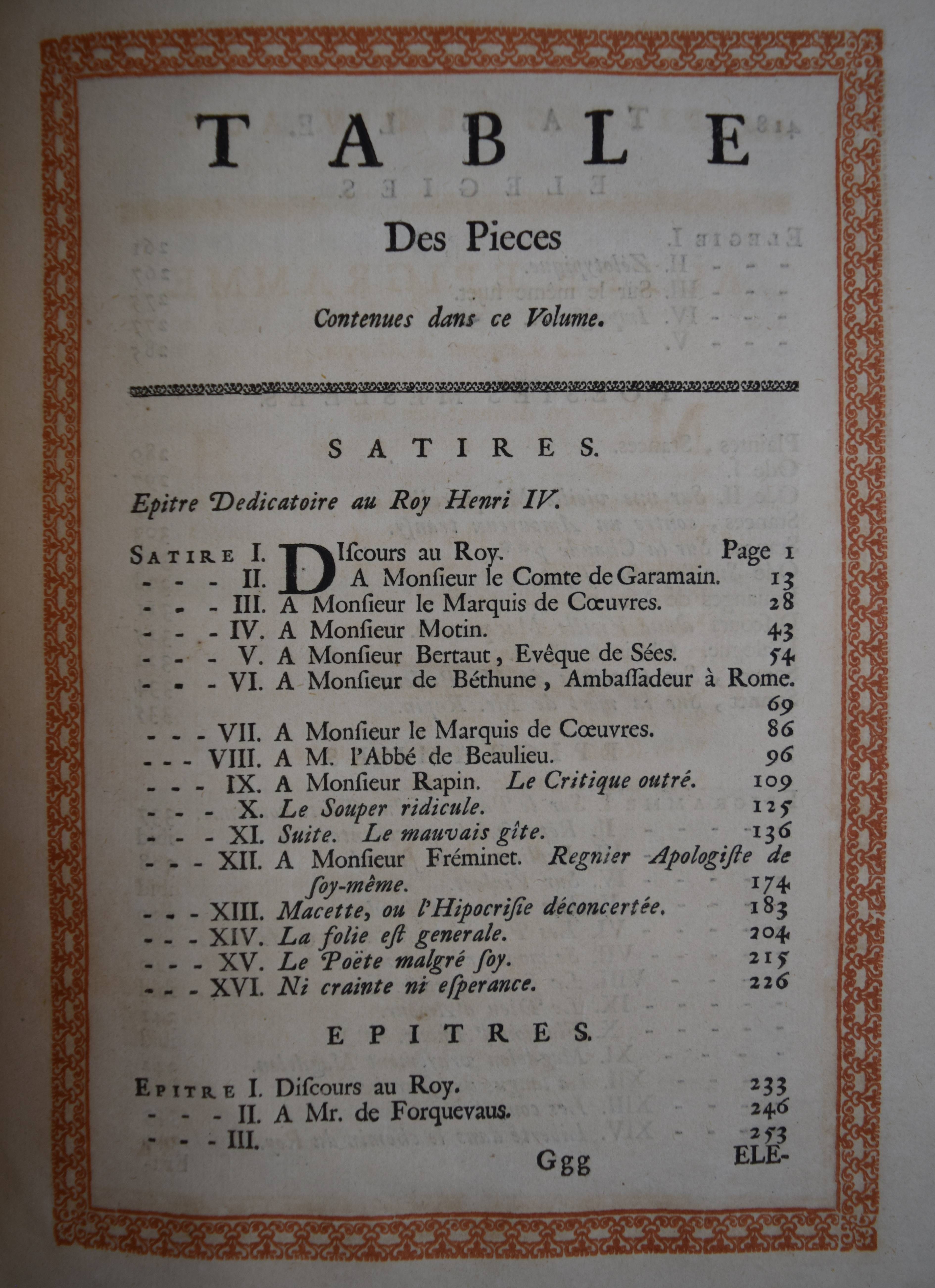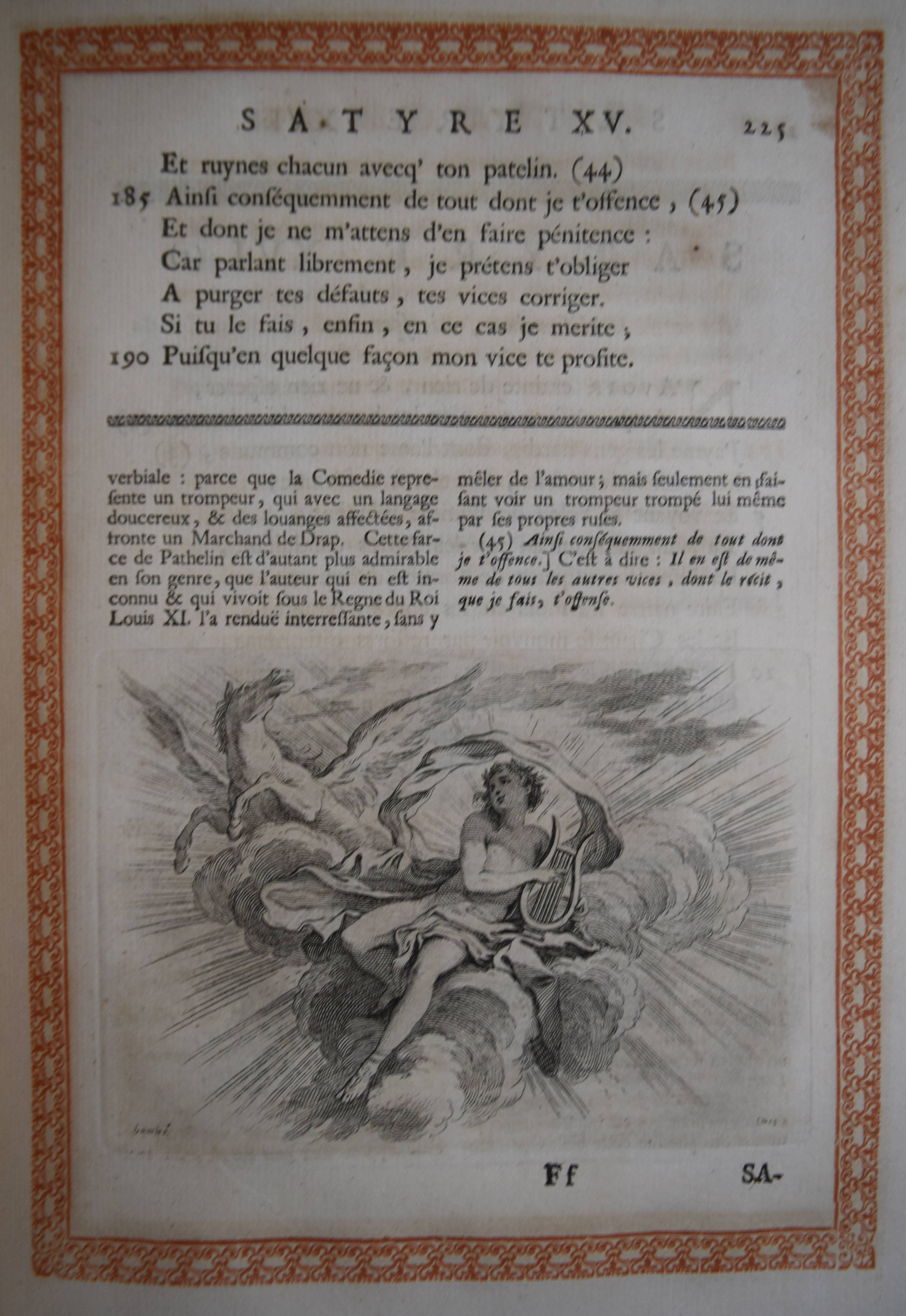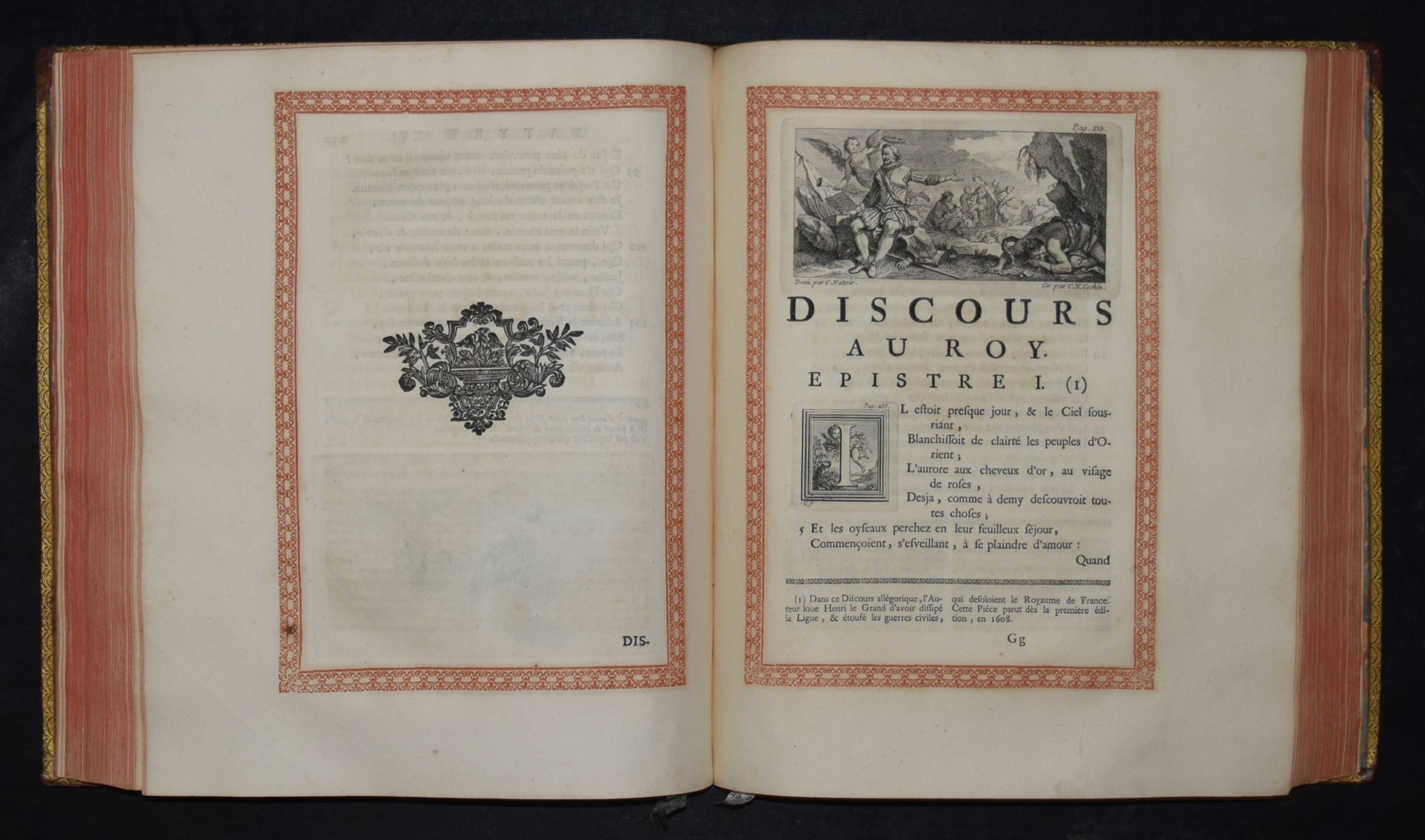 Régnier, (Mathurin). Satyres et autres oeuvres de Regnier. Accompagnées de remarques historiques. Nouvelle edition considerablement augmentée. Londres (i.e. Amsterdam), Jacob Tonson 1733. 4° (28 x 23,5 cm.). XX,420 S. mit Titel in Rot u. Schwarz, gestoch. Frontispiz von L. Cars nach C. Natoire, gestoch. Titelvignette von Nicolas Cochin und 21 (teils wdh.) Kopf- und Schlußvignetten von Cochin nach Boucher und Natoire sowie 1 gestoch. Portrait von St.-Aubin. Kalbslederband der Zeit. mit goldgepr. Rückenschild, reicher floraler Rückenvergoldung und Innenkantenvergoldung. Brunet IV, 1188. Cioranescu 19048. Cohen-Ricci 867. Graesse VI, 67. Sander 1684. Tchemerzine IX, 392. – Prachtvoll ausgestattete Ausgabe; jede Seite mit roter Bordüre. – Mit historischen Anmerkungen von Claude Brossette und Lenglet-Dufresnoy. – Der franz. Satiriker M. Régnier (1573-1613), Neffe des Dichters Philippe Desportes, wurde 1609 zum Domherrn von Chartres ernannt. „Seine sechzehn Satiren, die das alltägliche Leben und typische Figuren seiner Zeit behandeln, sind im Stil von Horaz und Juvenal verfasst. Die Sprache ist volkstümlich und farbenreich. Als sein bedeutendstes Werk gilt die Satire Macette“ (Wikipedia). – Einband etwas berieben, vorderes Gelenk unten etwas angeplatzt, stellenweise wasserfleckig und teils stärker gebräunt, insgesamt gutes dekorativ gebundenes Exemplar.
