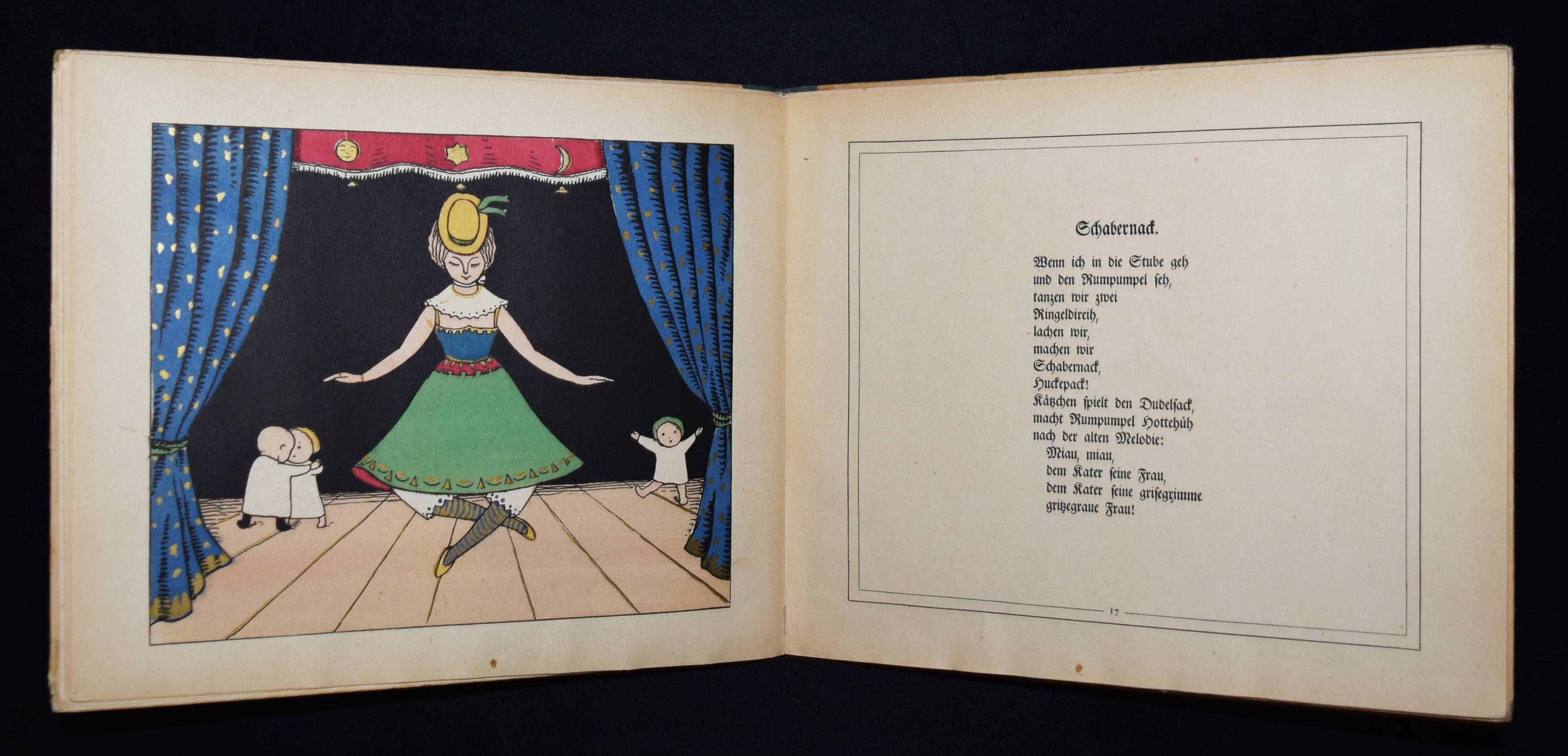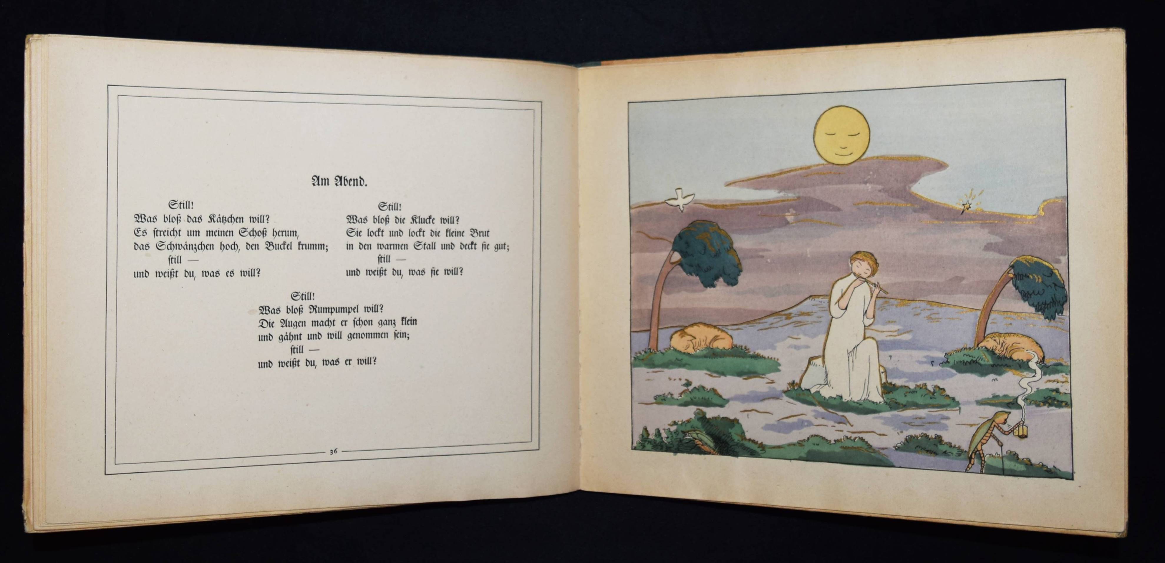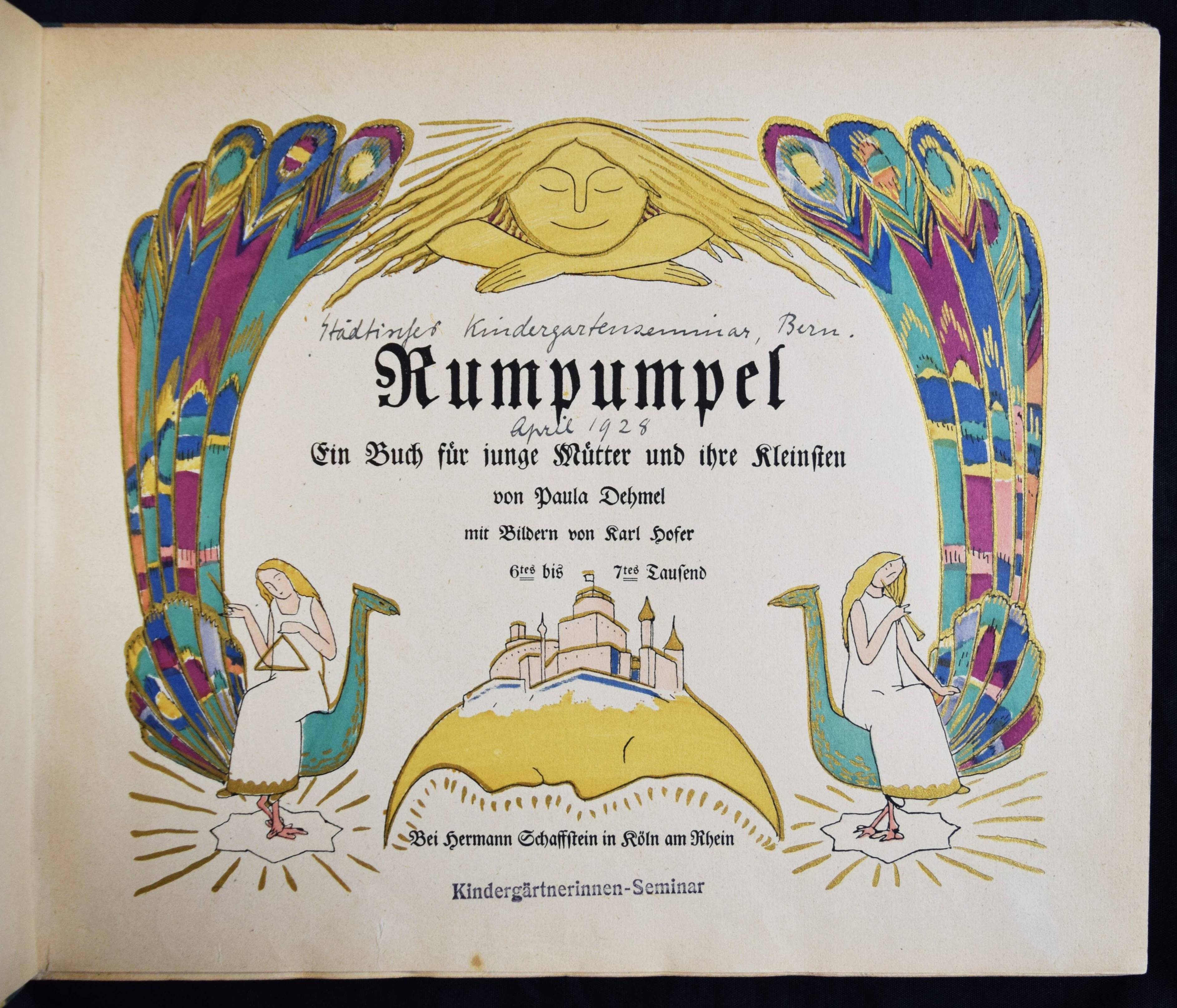 Dehmel, Paula. Rumpumpel. Ein Buch für junge Mütter und ihre Kleinsten. Mit Bildern von Karl Hofer. 6.-7. Tsd. (3. Aufl.). Köln, Hermann Schaffstein o. J. (1919). Quer-4°. 45, (1) S. mit handkol. Titel und 15 handkol. und teils goldgehöhten Tafeln. Farbig illustr. Orig.-Halbleinenband. Bilderwelt 513. Doderer/Müller 709 u. S. 250 ff. Klotz, Bilderbücher 2345/3. LKJ I, 292 ff. u. 551. OLdenburg, Künstler 154. Pressler 203. Ries 596, 1. Stark, Schaffstein S. 32. Stuck-Villa I, 379 u. II, 212 u. S. 137. – Dritte Auflage, die erste Ausgabe erschien 1903. – „Dieser Hofer ist ja wundervoll!! So habe ich mir im Traum die Bilder zum Rumpumpel gedacht“ (Paula Dehmel zit. nach Stark). – „Rumpumpel ist eines der ungewöhnlichsten Bilderbücher aus der Zeit um 1900. Der Innentitel weist schon in den kühnen, vehementen Farbklängen der umrahmenden Straußenfedern aus der Jugendstil-Palette hinaus in das Vorfeld des Expressionismus. Klänge als Farbmelodie läßt Hofer auf den Wegen durch dieses Bilderbuch aufwachsen. In 15 Vollbildern führt er, oft in harten, doch überzeugenden Farb-Kontrasten, gleichsam szenische Pantomimen vor, komponiert zu jeder einzelnen Szene den gemäßen Bühnenraum und Fond, wobei er das Schwarz als Hintergrund nicht scheut, und versteht es dennoch bei aller Expressivität in Farbe und Form, einen echt kindlichen Tenor vom Anfang bis zum Ende durchzuhalten“ (H. A. Halbey in Doderer/Müller). – Von Freyhold inspiriert, legt Hofer das erste Bilderbuch vor, das den Jugendstil durch den Rückgriff auf naiv-kindliche Sehweise überwindet“ (H. Ries in Bilderwelt). – Innengelenke alt mit Leinenstreifen verstärkt, Titel mit handschr. Besitzvermerk und Stempel „Kindergärtnerinnen-Seminar“ (Bern), Titel und S. 3/4 mit kl. restaurierten Randeinrissen, sehr gutes sauberes Exemplar.