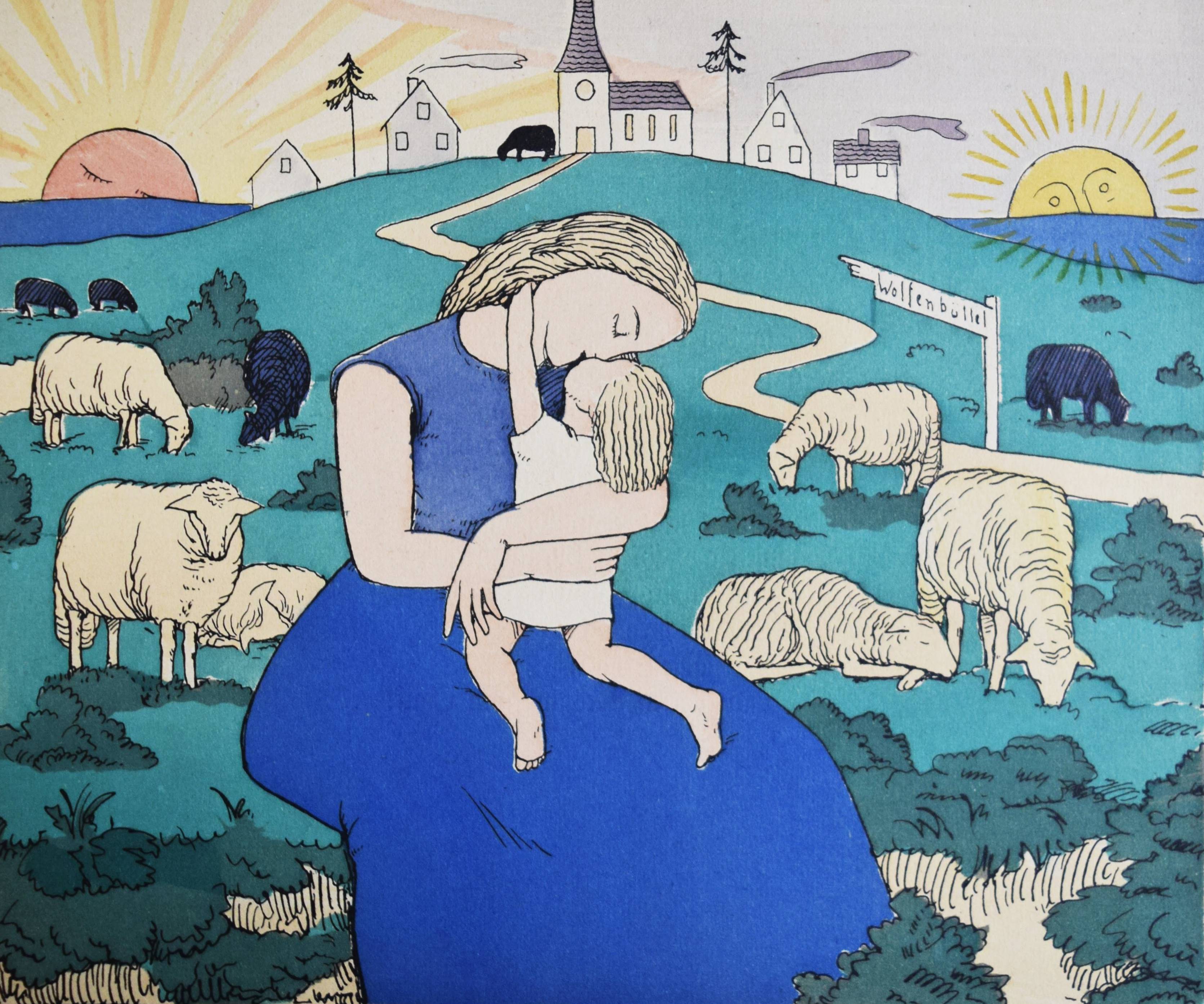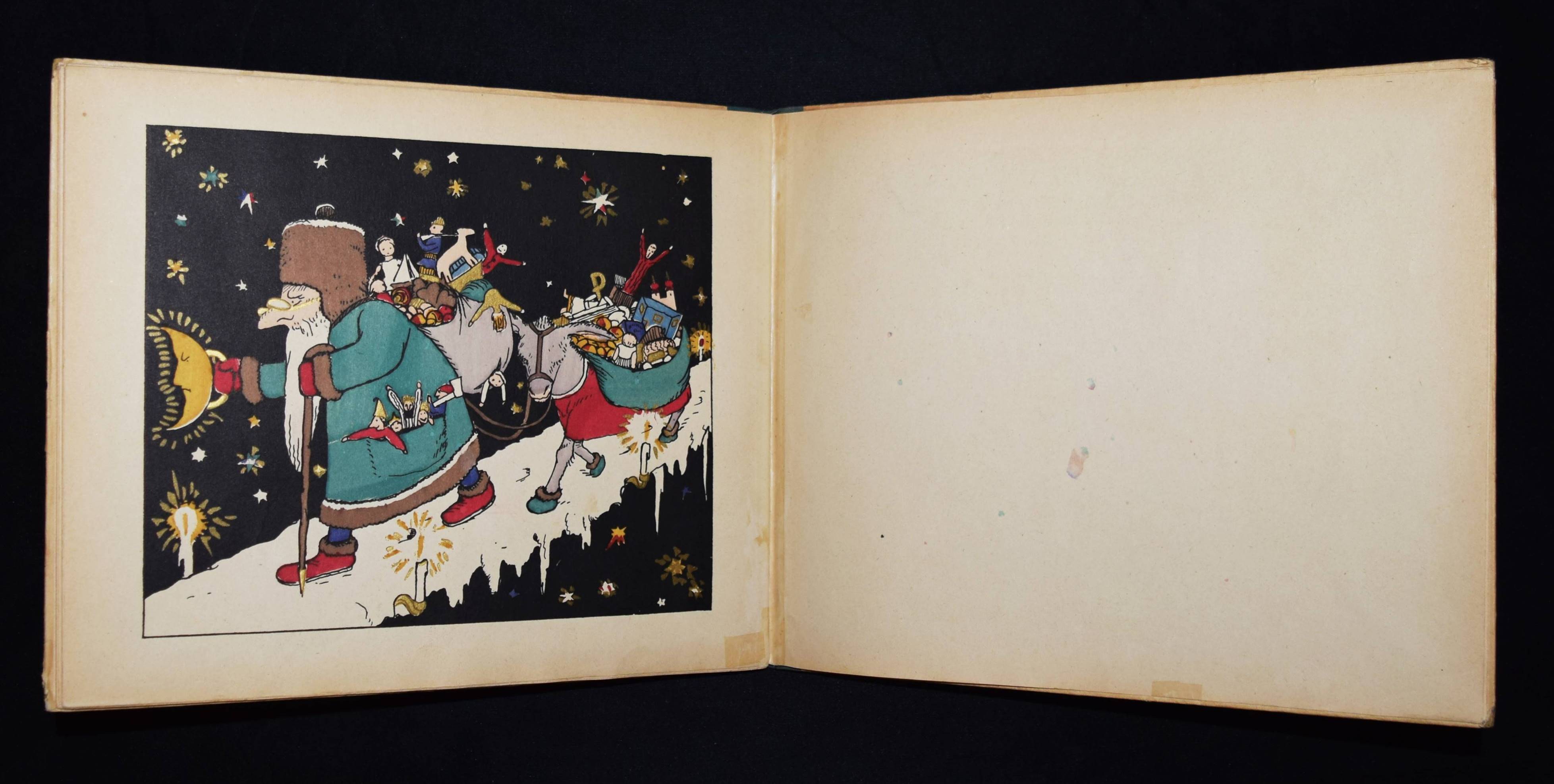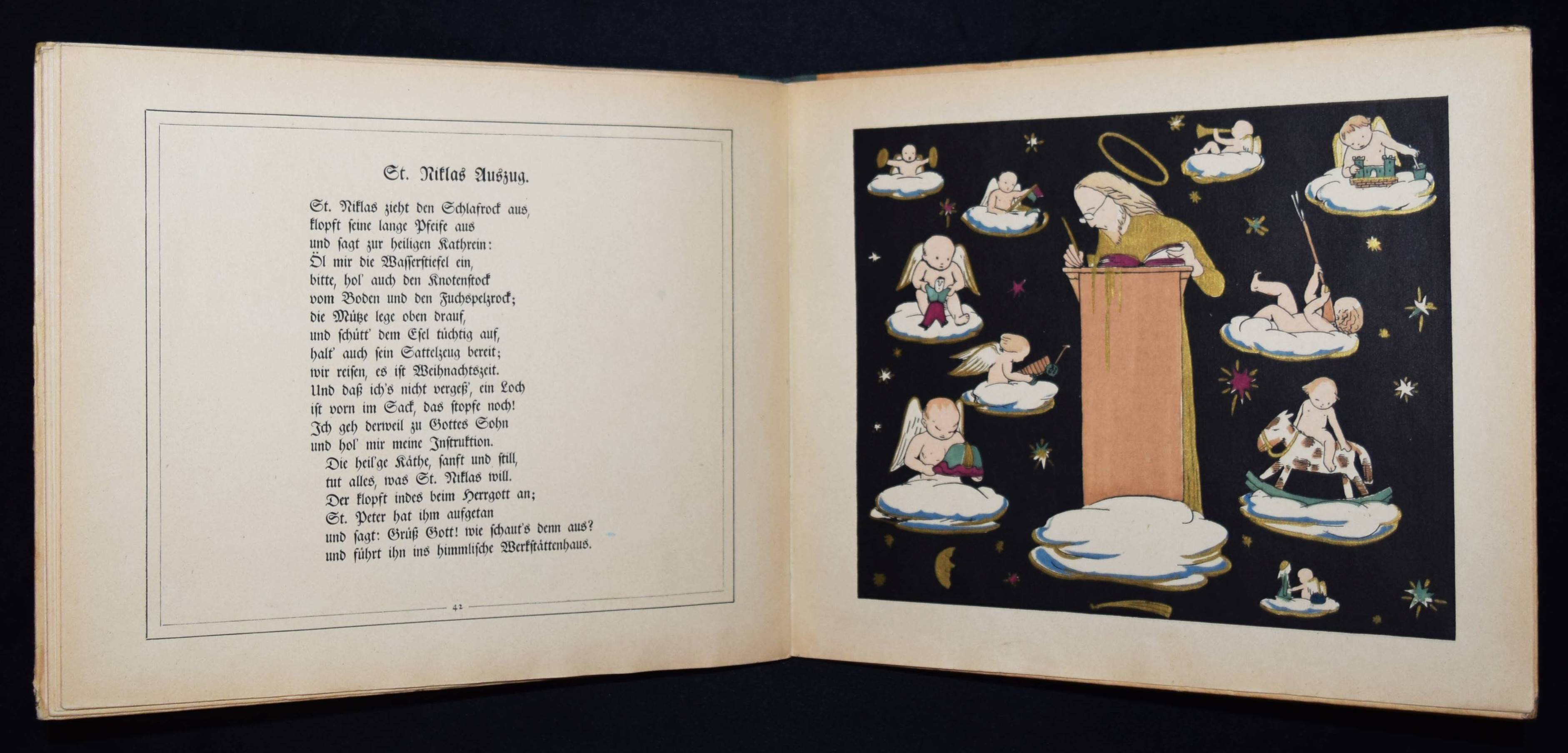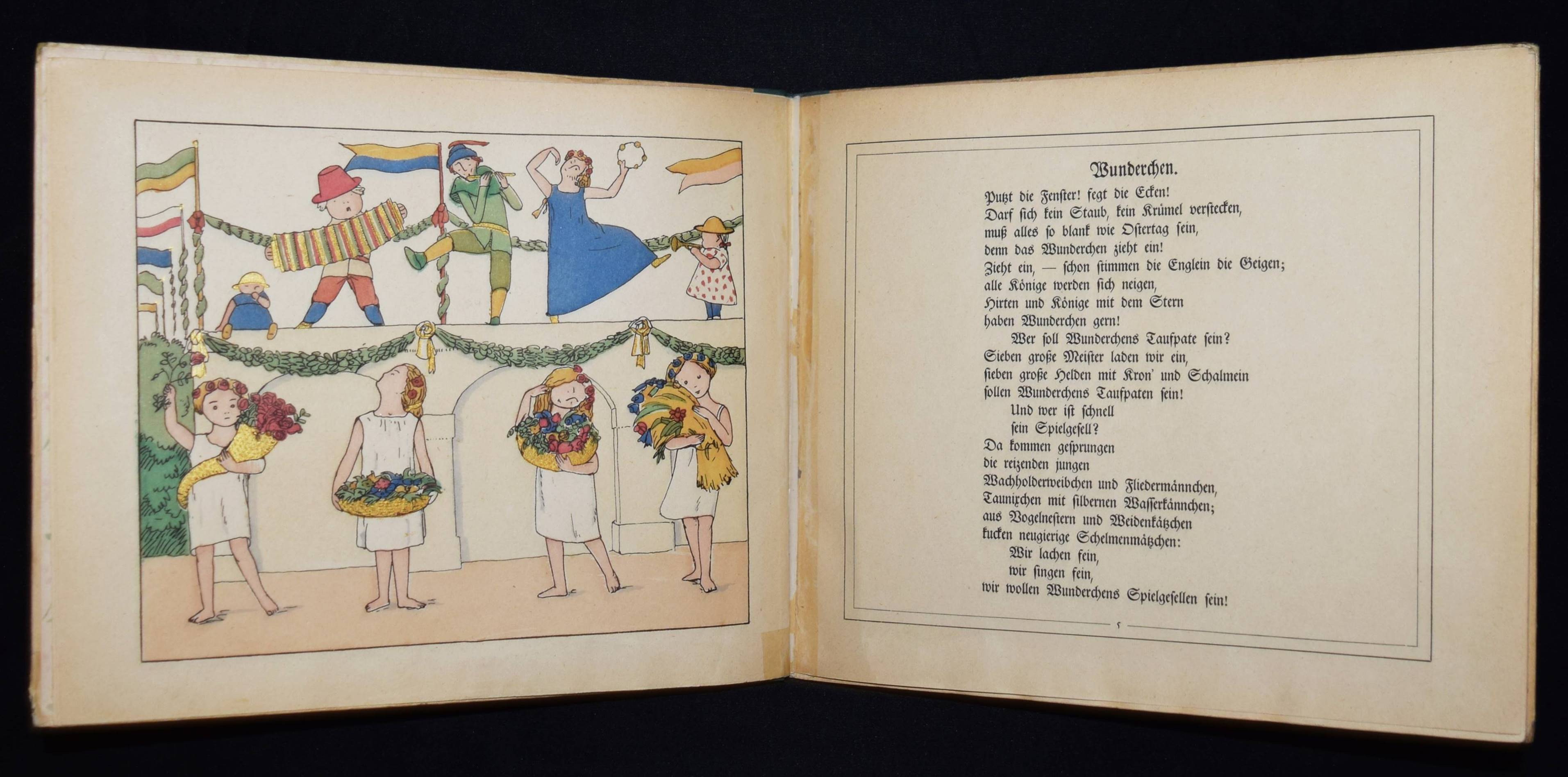 Dehmel, Paula. Rumpumpel. Ein Buch für junge Mütter und ihre Kleinsten. Mit Bildern von Karl Hofer. 6.-7. Tsd. (3. Aufl.). Köln, Hermann Schaffstein o. J. (1919). Quer-4°. 45, (1) S. mit handkol. Titel und 15 handkol. und teils goldgehöhten Tafeln. Farbig illustr. Orig.-Halbleinenband. Bilderwelt 513. Doderer/Müller 709 u. S. 250 ff. Klotz, Bilderbücher 2345/3. LKJ I, 292 ff. u. 551. OLdenburg, Künstler 154. Pressler 203. Ries 596, 1. Stark, Schaffstein S. 32. Stuck-Villa I, 379 u. II, 212 u. S. 137. – Dritte Auflage, die erste Ausgabe erschien 1903. – „Dieser Hofer ist ja wundervoll!! So habe ich mir im Traum die Bilder zum Rumpumpel gedacht“ (Paula Dehmel zit. nach Stark). – „Rumpumpel ist eines der ungewöhnlichsten Bilderbücher aus der Zeit um 1900. Der Innentitel weist schon in den kühnen, vehementen Farbklängen der umrahmenden Straußenfedern aus der Jugendstil-Palette hinaus in das Vorfeld des Expressionismus. Klänge als Farbmelodie läßt Hofer auf den Wegen durch dieses Bilderbuch aufwachsen. In 15 Vollbildern führt er, oft in harten, doch überzeugenden Farb-Kontrasten, gleichsam szenische Pantomimen vor, komponiert zu jeder einzelnen Szene den gemäßen Bühnenraum und Fond, wobei er das Schwarz als Hintergrund nicht scheut, und versteht es dennoch bei aller Expressivität in Farbe und Form, einen echt kindlichen Tenor vom Anfang bis zum Ende durchzuhalten“ (H. A. Halbey in Doderer/Müller). – Von Freyhold inspiriert, legt Hofer das erste Bilderbuch vor, das den Jugendstil durch den Rückgriff auf naiv-kindliche Sehweise überwindet“ (H. Ries in Bilderwelt). – Innengelenke alt mit Leinenstreifen verstärkt, Titel mit handschr. Besitzvermerk und Stempel „Kindergärtnerinnen-Seminar“ (Bern), Titel und S. 3/4 mit kl. restaurierten Randeinrissen, sehr gutes sauberes Exemplar.