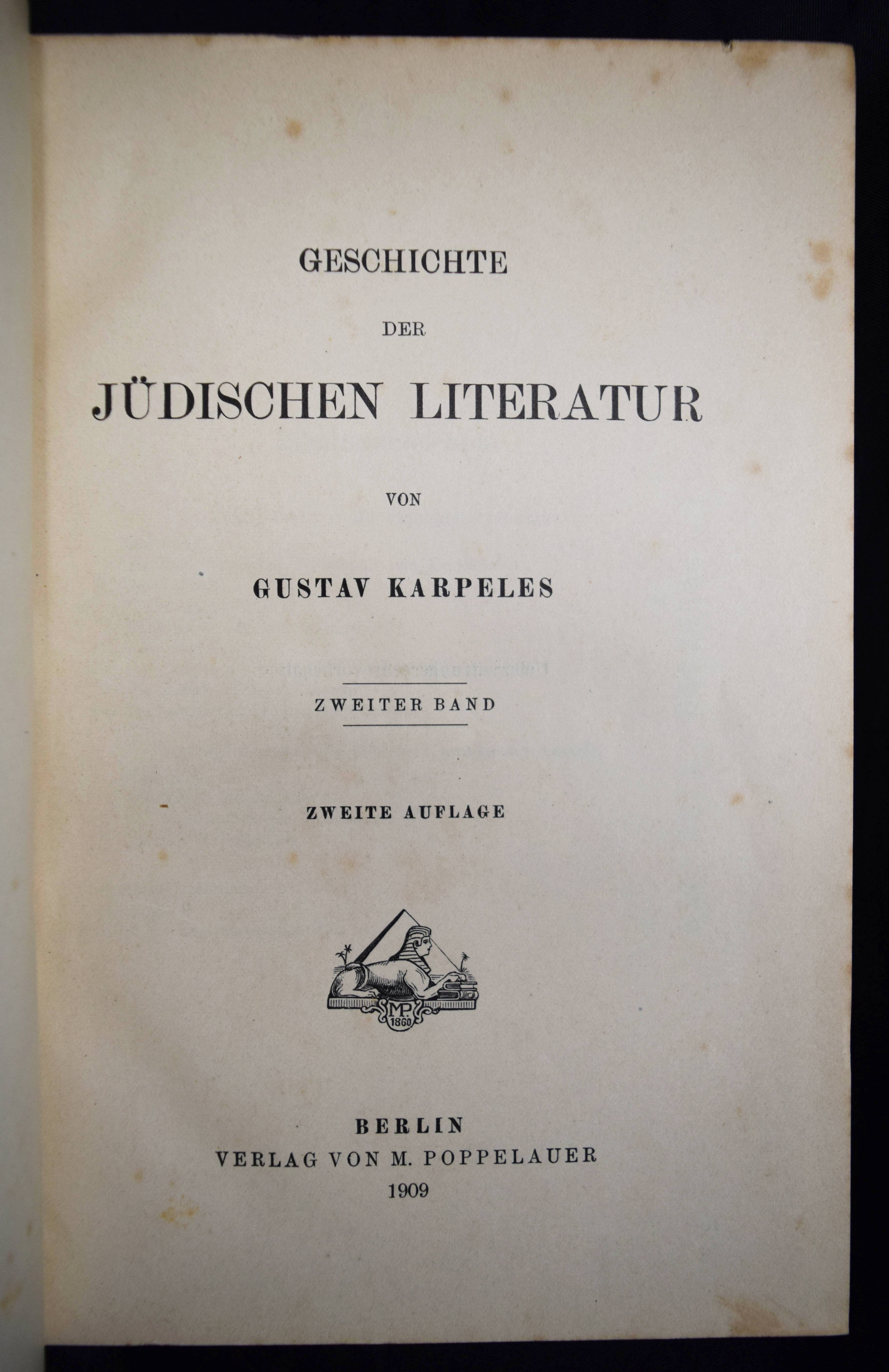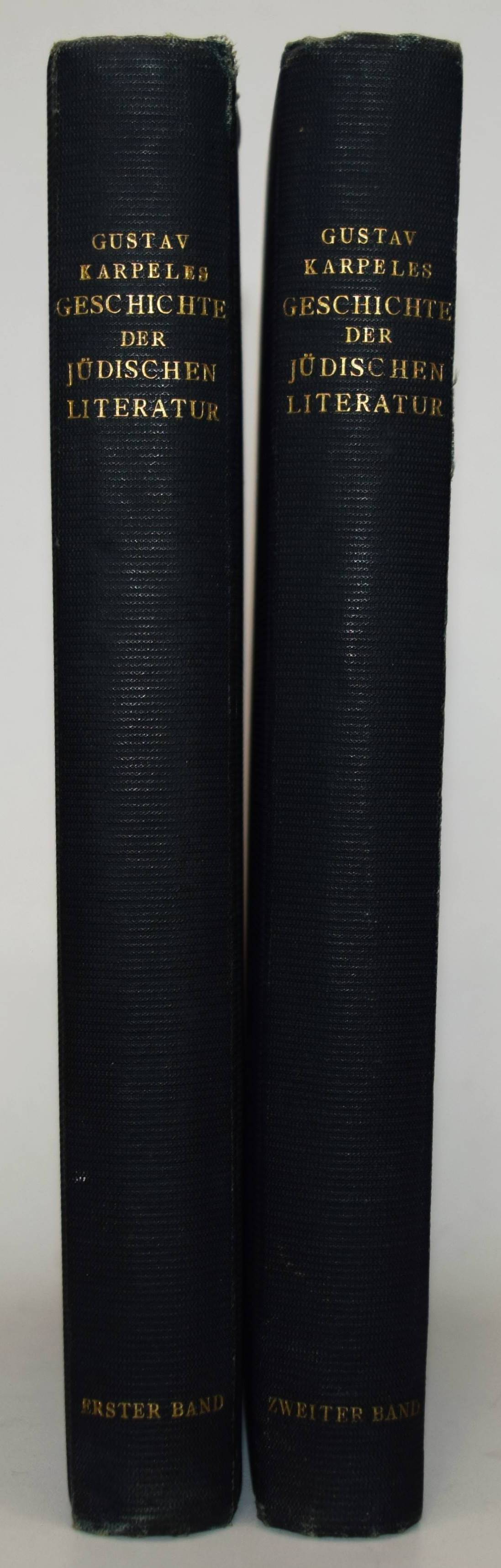 | Karpeles, Gustav. Geschichte der jüdischen Literatur. 2. Aufl. 2 Bände. Berlin, M. Poppelauer 1909. Gr.-8°. VI, 492 S.; 496 S. OLn. mit goldgepr. Rücken- und Deckeltiteln. Einbände etwas berieben, im Schnitt etwas stockfleckig, gutes Exemplar.