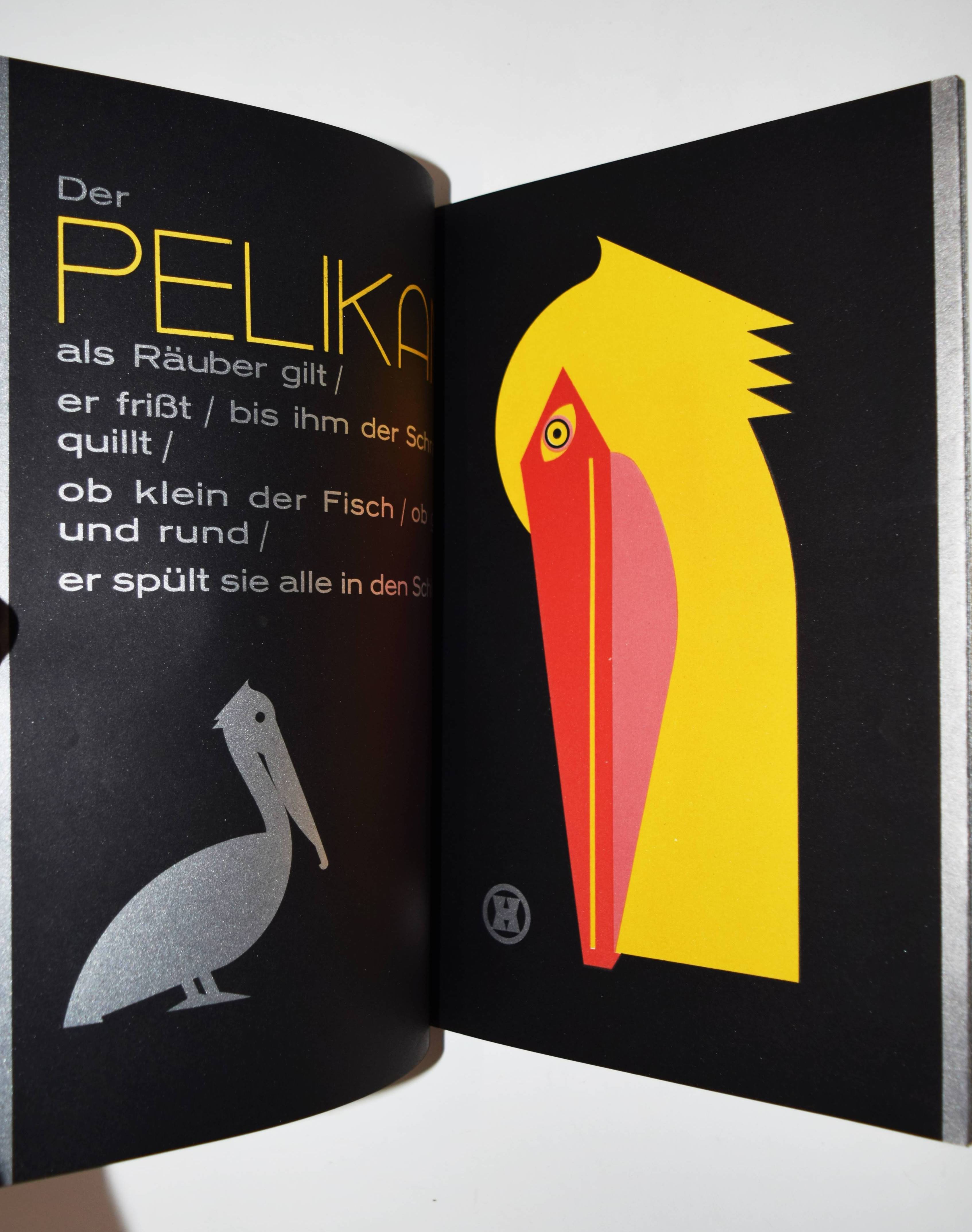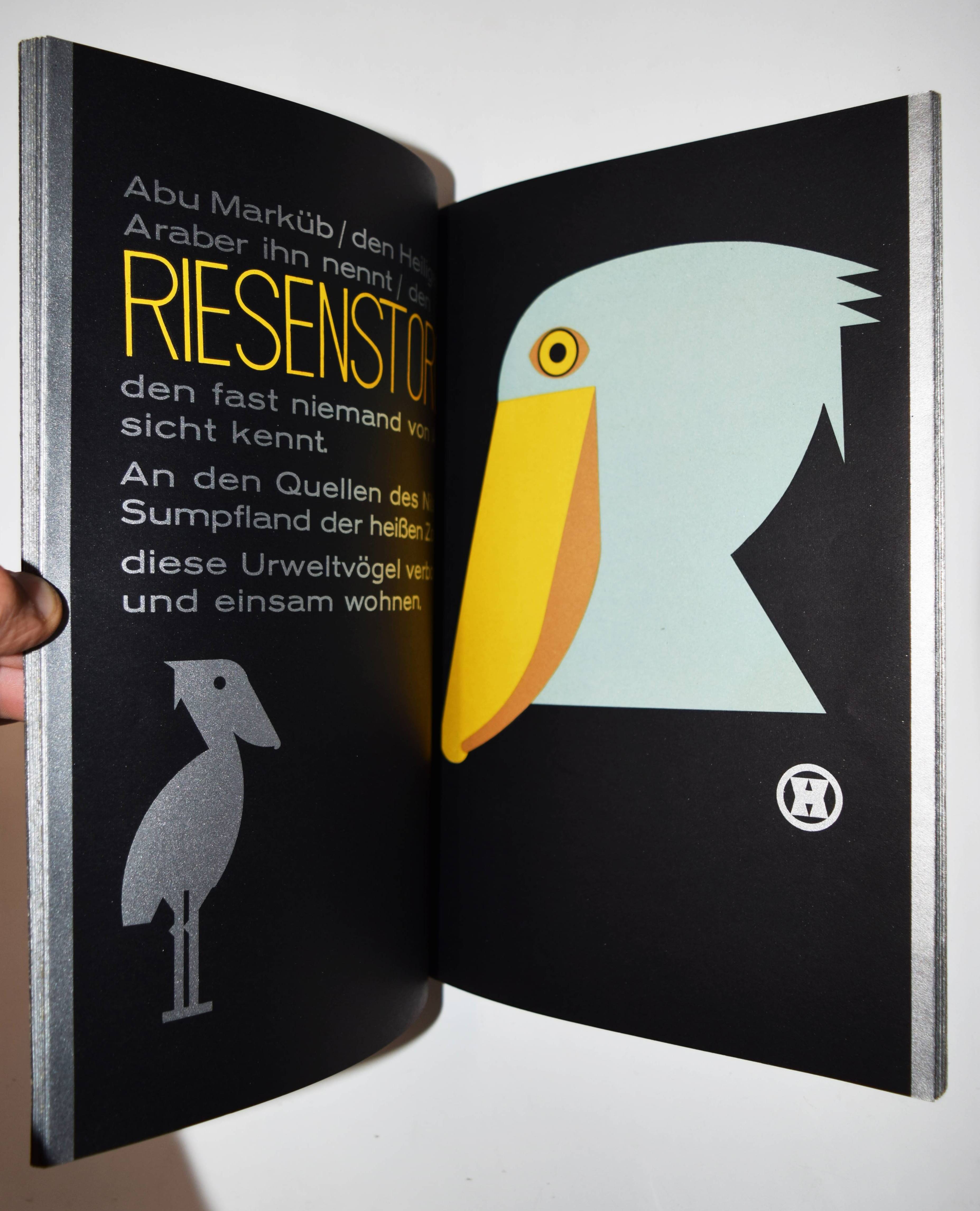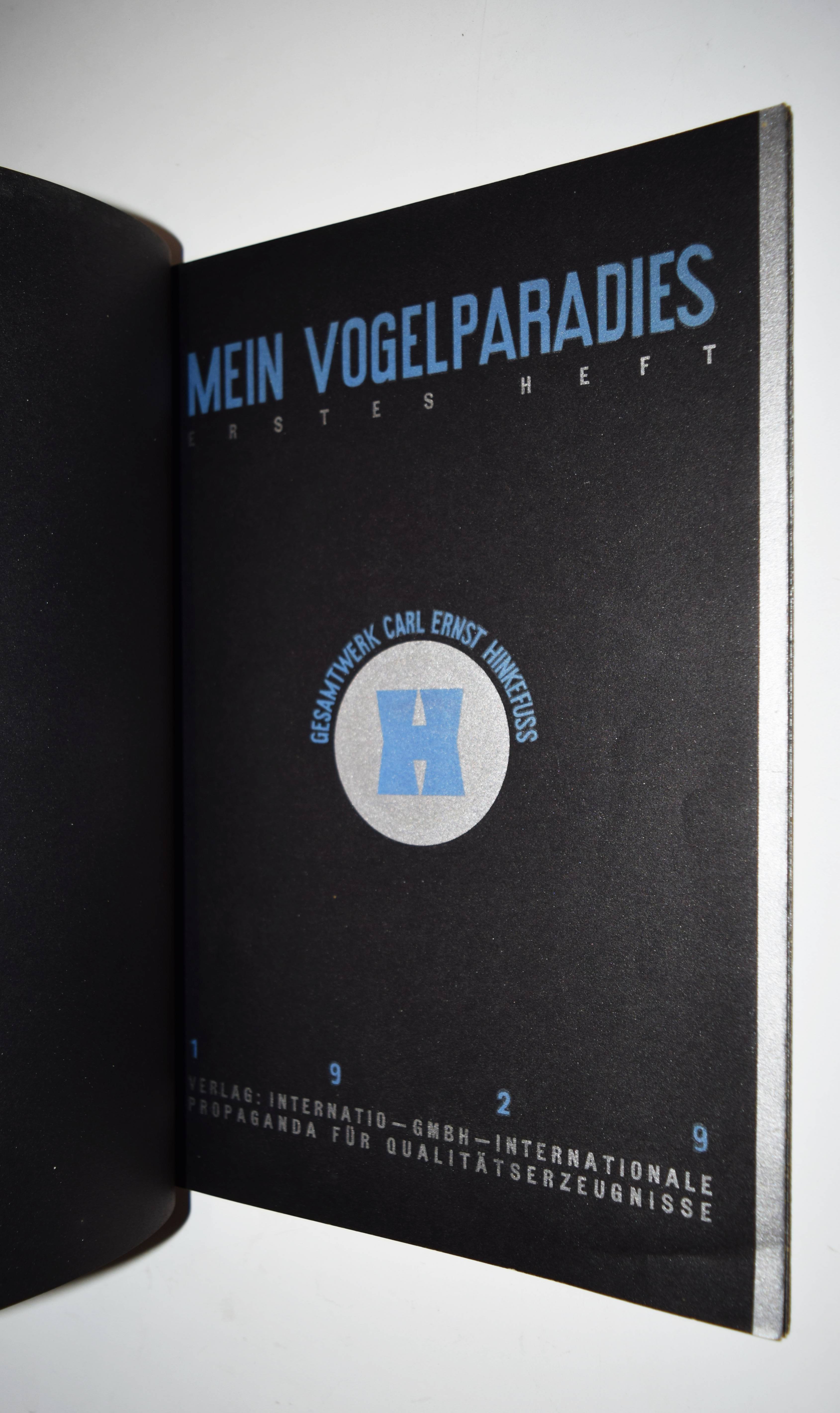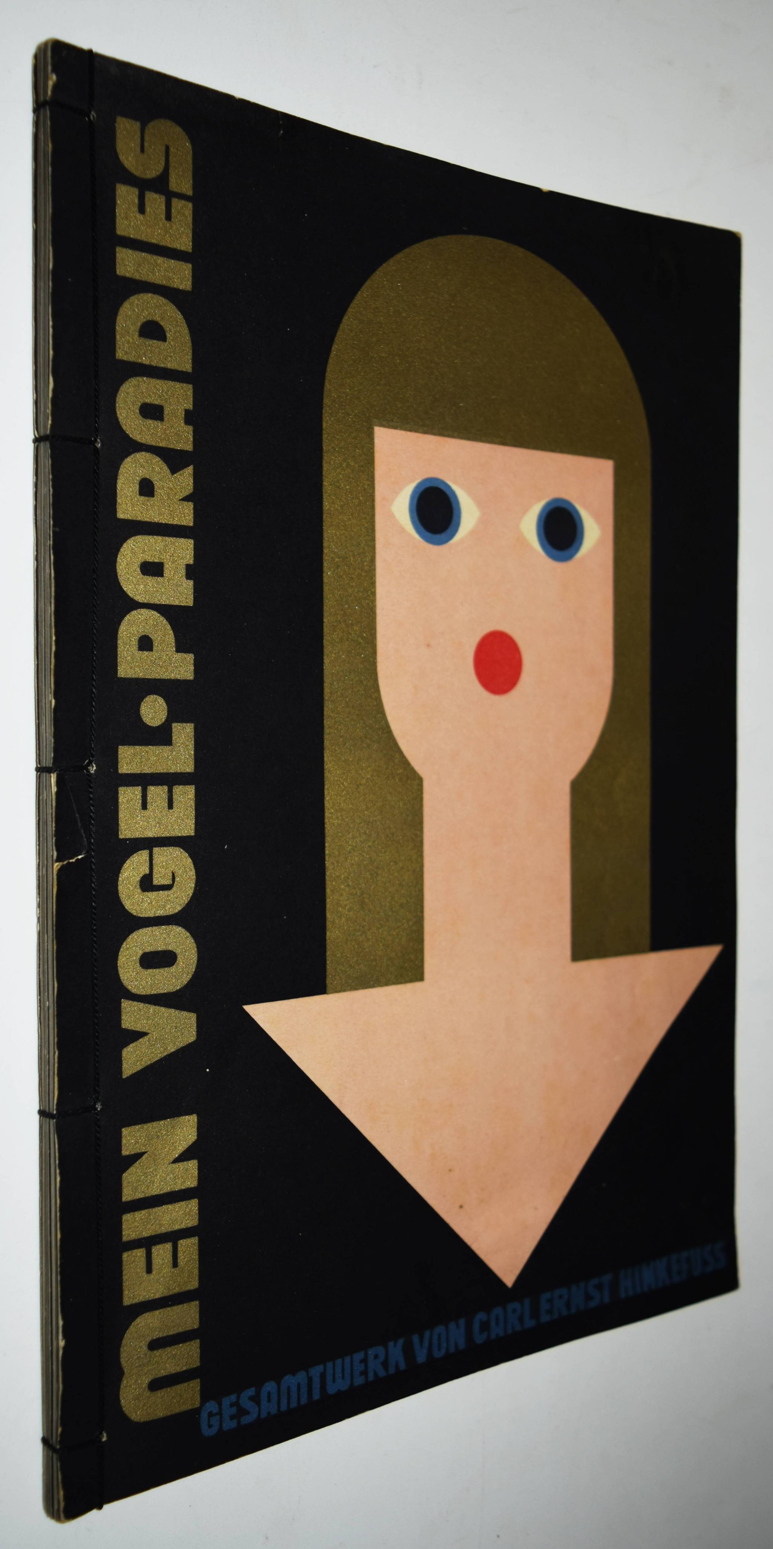 Hinkefuss, Carl Ernst. Mein Vogelparadies. Gesamtwerk. Erstes Heft (alles Erschienene). Berlin und Dessau, C. Dünnhaupt u. Reklameverlag Internatio (1929). 4° (30 x 21 cm.). [16] Bl. mit 12 farblithogr. Tafeln von C. E. Hinkefuss. Farblithogr. illustr. OKart. (Blockbuch mit Kordelheftung). Bolliger/Holstein 1981/82 GK 409. Slg. Cotsen 4822. Dokumentations-Bibliothek VI, 393. Stuck-Villa II, 210. – Außergewöhnliches, in Form und Farbgebung richtungsweisendes Bilderbuch der „Neuen Sachlichkeit“, dass der Werbegraphiker Carl Ernst Hinkefuss (1881-1970) gestaltet hat. Das in kräftigen Farben mit Typographie in Gold und Silber auf schwarzen Karton gedruckte Buch wurde in 1500 Exemplaren hergestellt und als kostenlose Werbegabe verteilt. – „Ein bisher nicht beschriebenes Kinderbuch eines dem Bauhaus nahestehenden Werbefachmannes. Ein drucktechnisch und graphisch beispielhaftes Werk der zwanziger Jahre“ (H. Bolliger). – Sehr gutes wohlerhaltenes Exemplar.