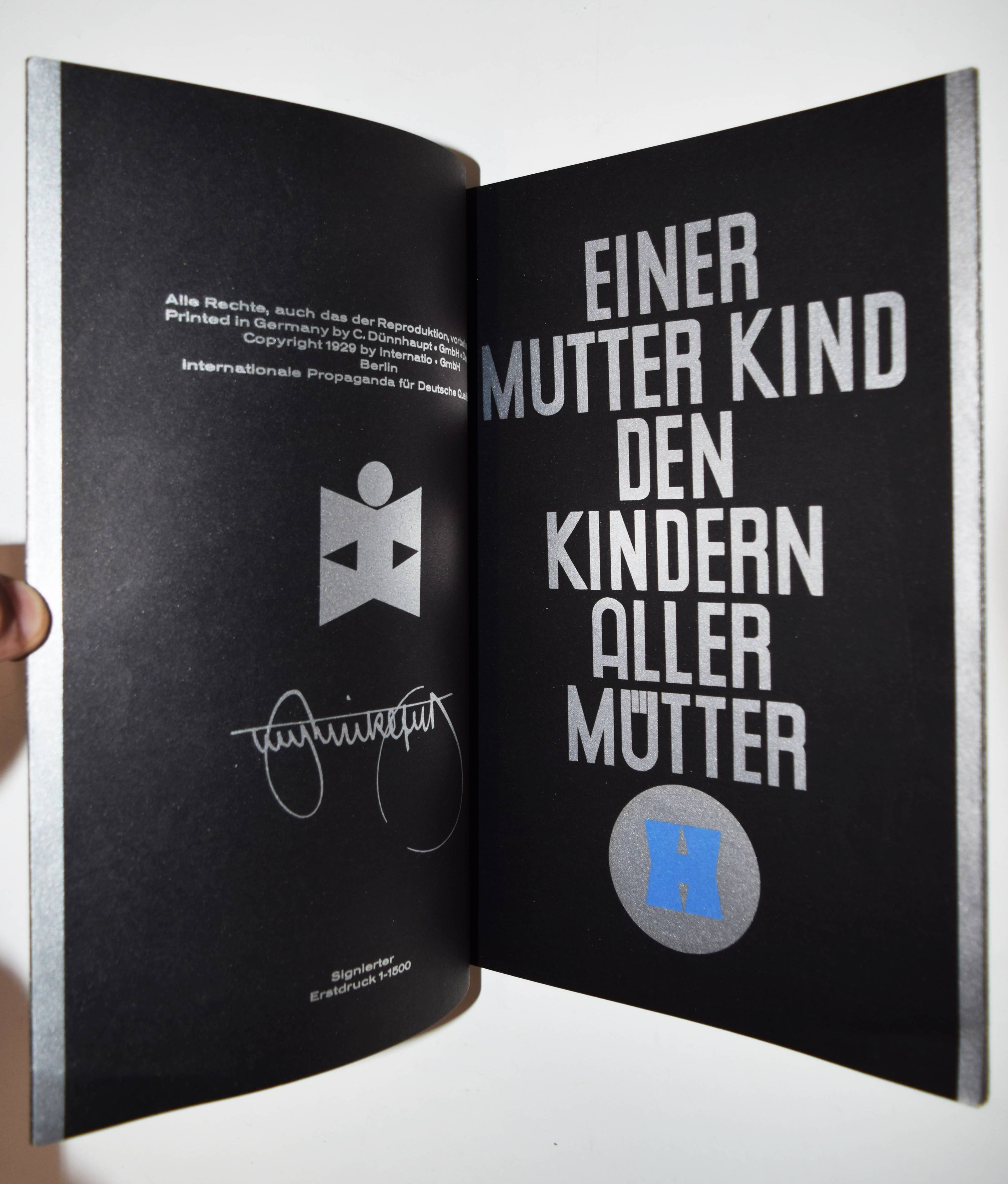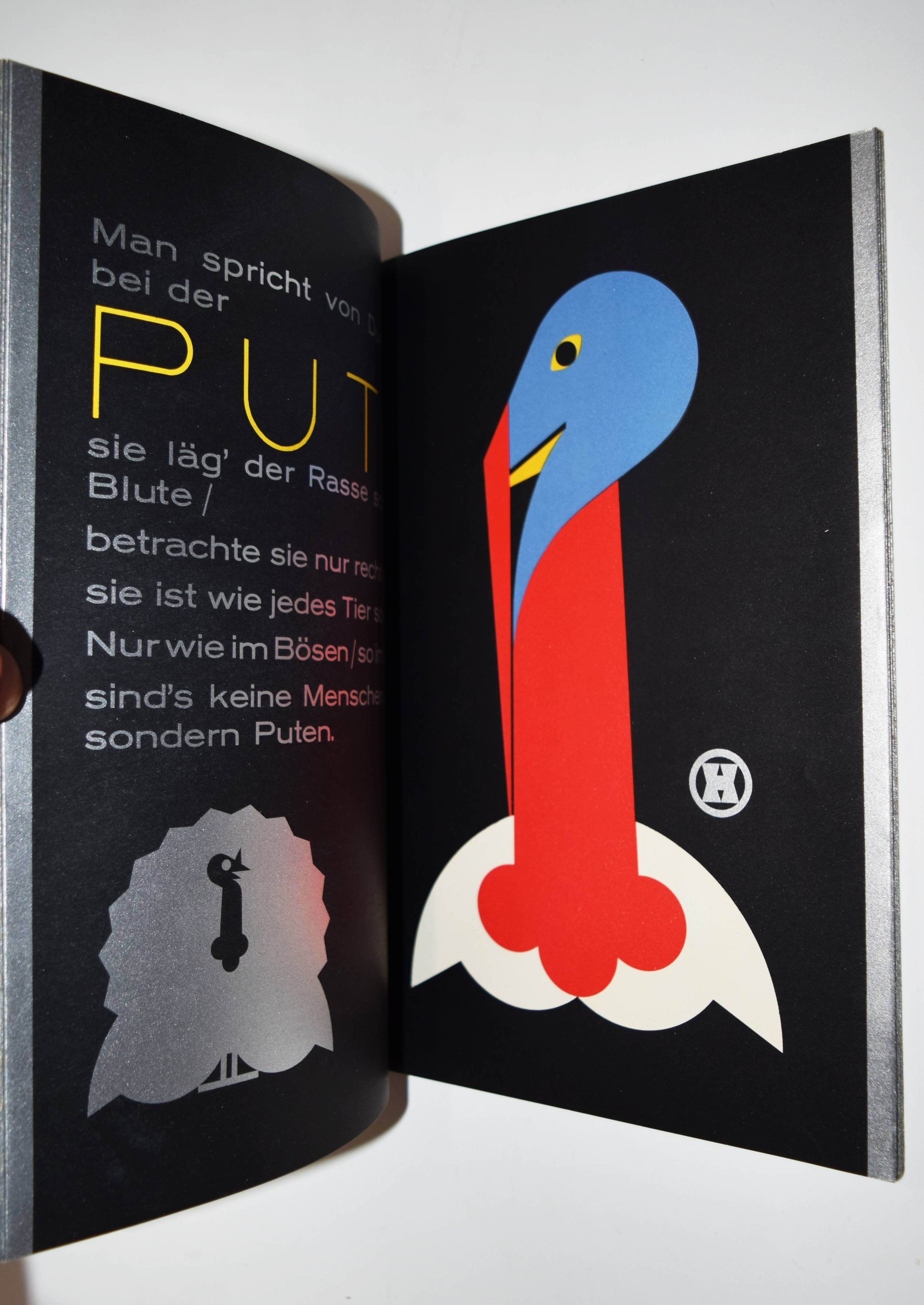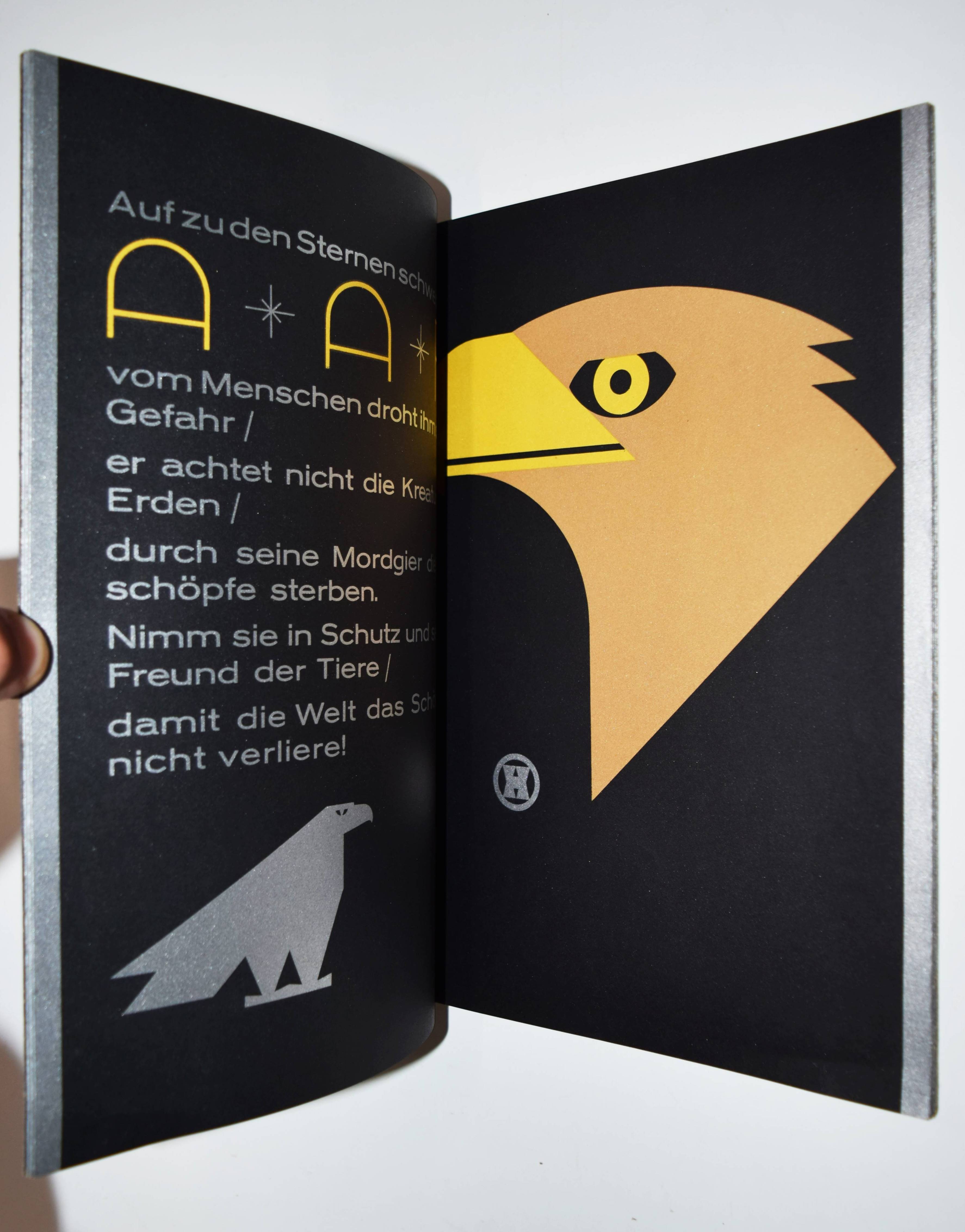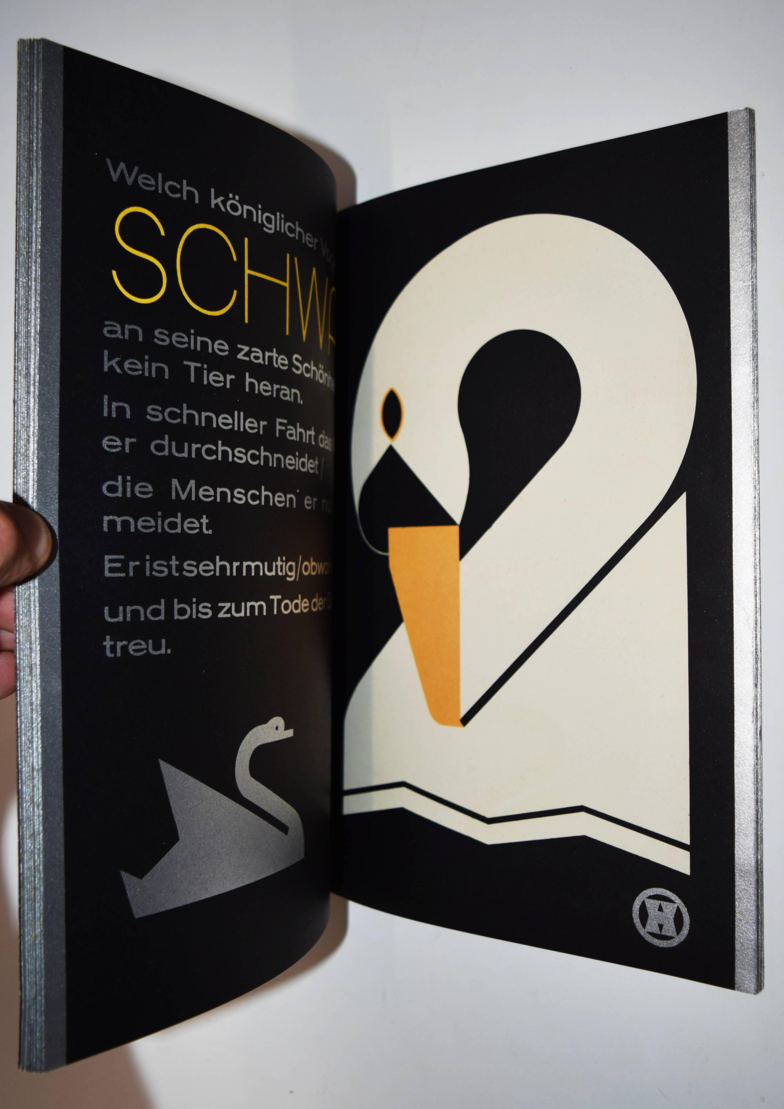 Hinkefuss, Carl Ernst. Mein Vogelparadies. Gesamtwerk. Erstes Heft (alles Erschienene). Berlin und Dessau, C. Dünnhaupt u. Reklameverlag Internatio (1929). 4° (30 x 21 cm.). [16] Bl. mit 12 farblithogr. Tafeln von C. E. Hinkefuss. Farblithogr. illustr. OKart. (Blockbuch mit Kordelheftung). Bolliger/Holstein 1981/82 GK 409. Slg. Cotsen 4822. Dokumentations-Bibliothek VI, 393. Stuck-Villa II, 210. – Außergewöhnliches, in Form und Farbgebung richtungsweisendes Bilderbuch der „Neuen Sachlichkeit“, dass der Werbegraphiker Carl Ernst Hinkefuss (1881-1970) gestaltet hat. Das in kräftigen Farben mit Typographie in Gold und Silber auf schwarzen Karton gedruckte Buch wurde in 1500 Exemplaren hergestellt und als kostenlose Werbegabe verteilt. – „Ein bisher nicht beschriebenes Kinderbuch eines dem Bauhaus nahestehenden Werbefachmannes. Ein drucktechnisch und graphisch beispielhaftes Werk der zwanziger Jahre“ (H. Bolliger). – Sehr gutes wohlerhaltenes Exemplar.