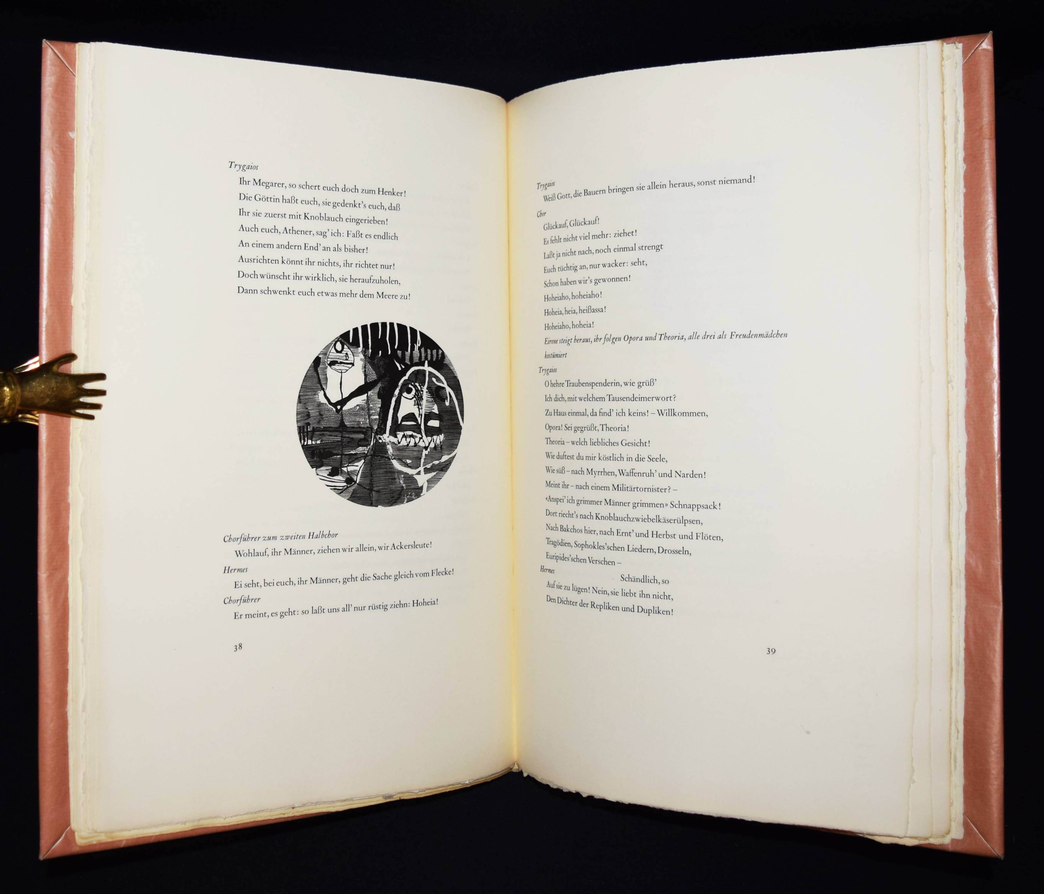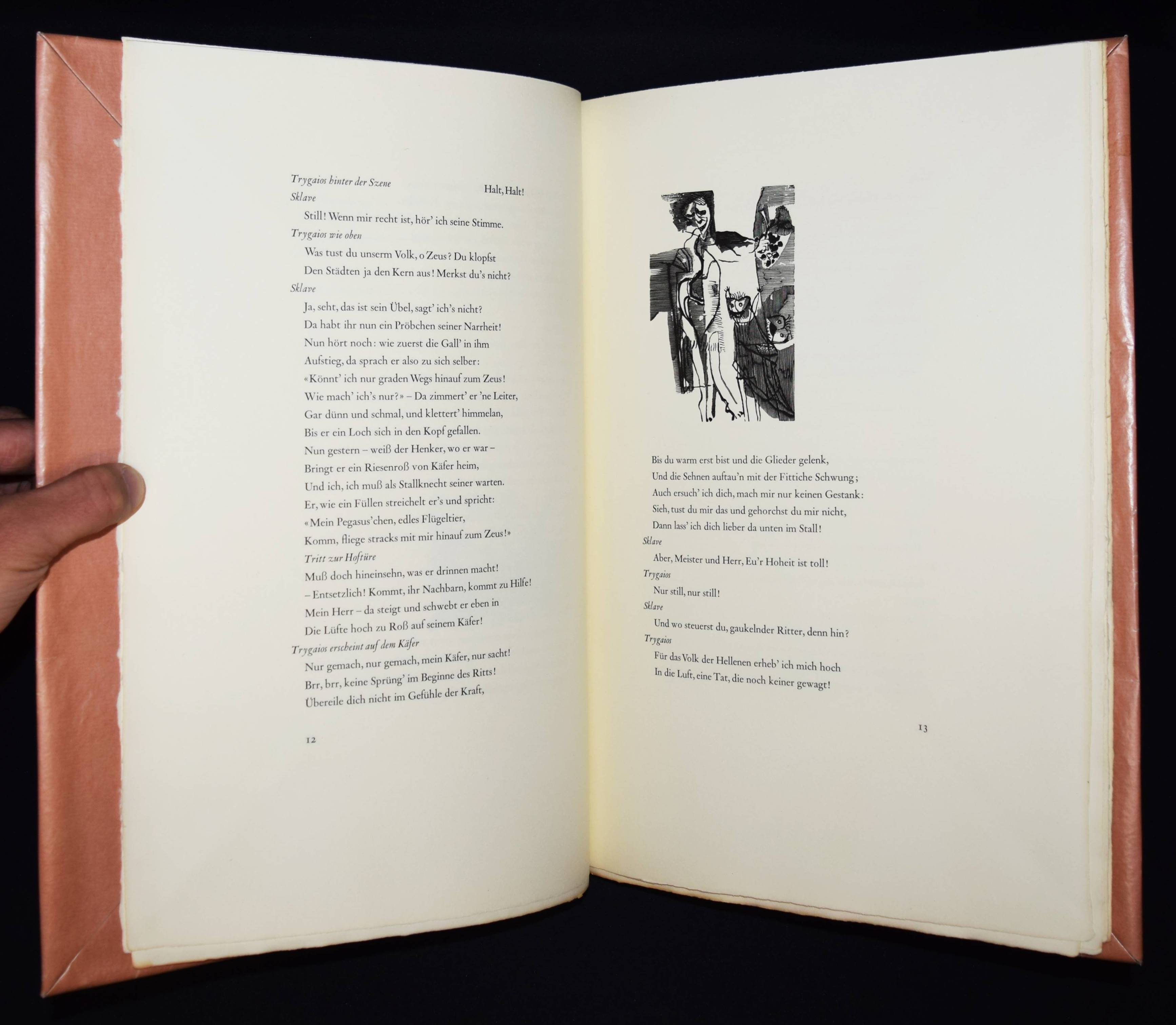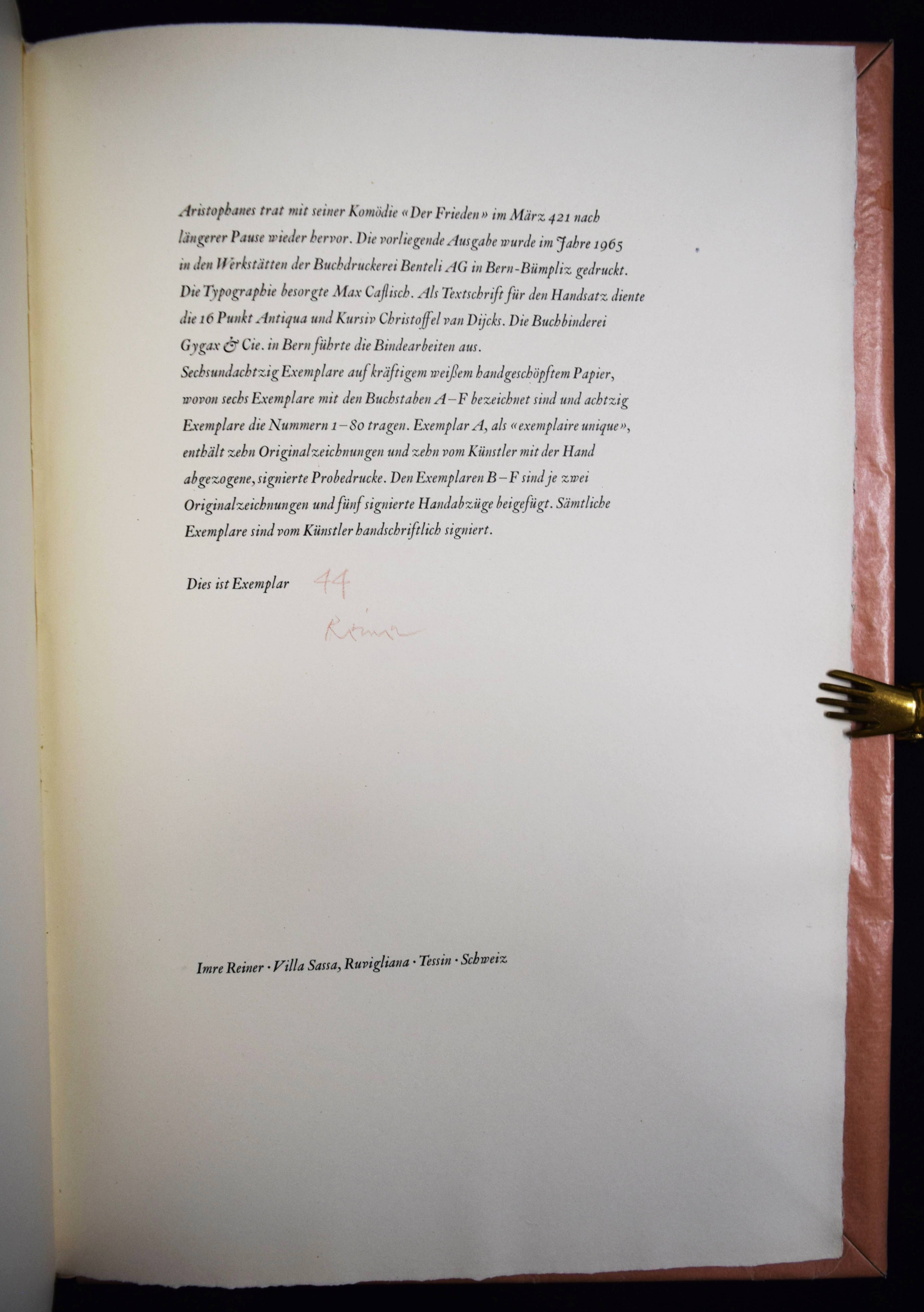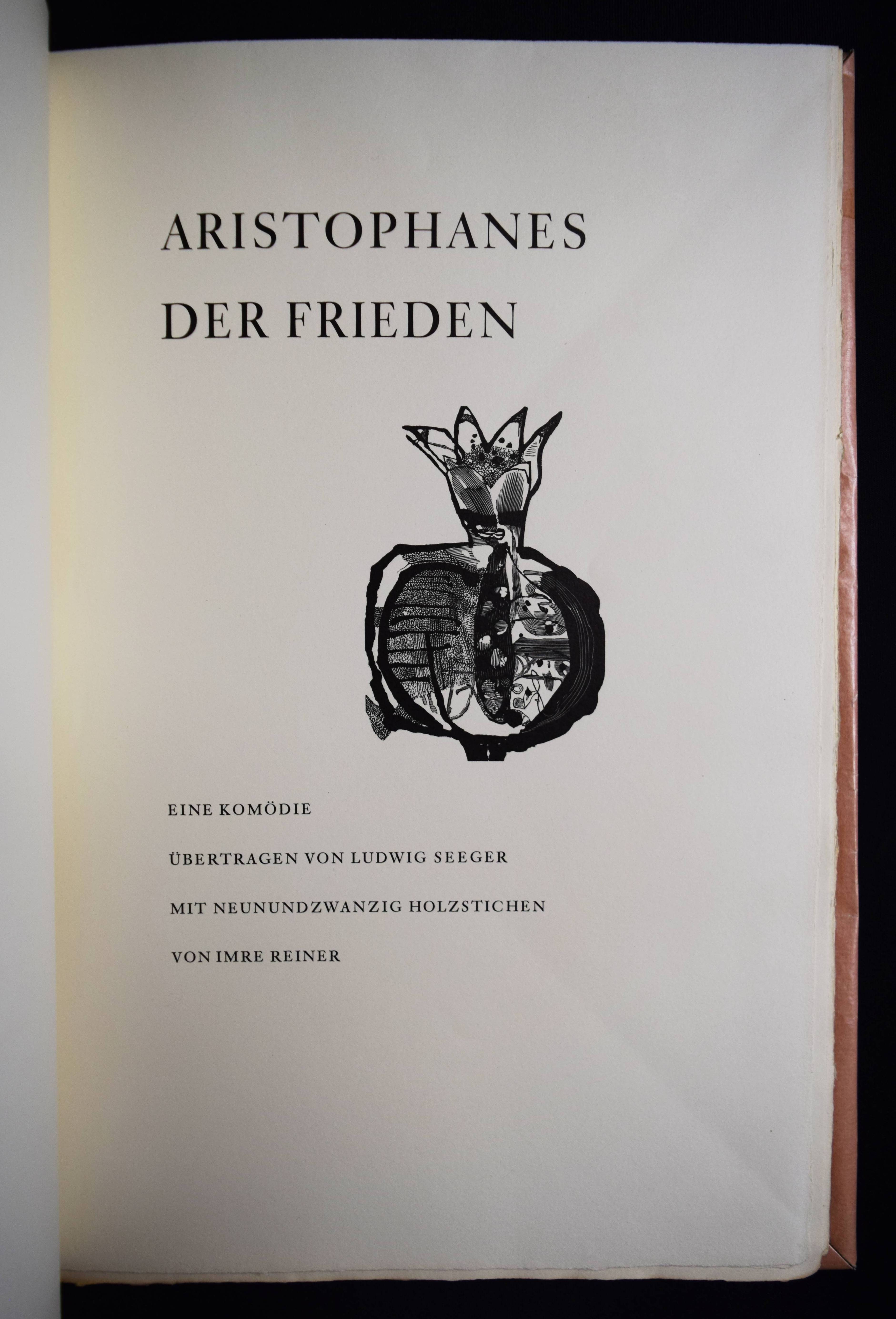 Aristophanes. Der Frieden. Eine Komödie. Übertragen von Ludwig Seeger. Mit neunundzwanzig Holzstichen von Imre Reiner. Ruvigliana, Selbstverlag (1965). Folio (39,5 x 27,5 cm.). 88 S., [2] Bl. mit 29 Orig.-Holzstichen. OPbd. mit Orig.-Schutzumschlag. Nr. 44 von nur 80 Exemplaren; im Druckvermerk von I. Reiner signiert. – Vorderes Innengelenkim oberen Drittel etwas angeplatzt, sonst sehr gut erhalten.