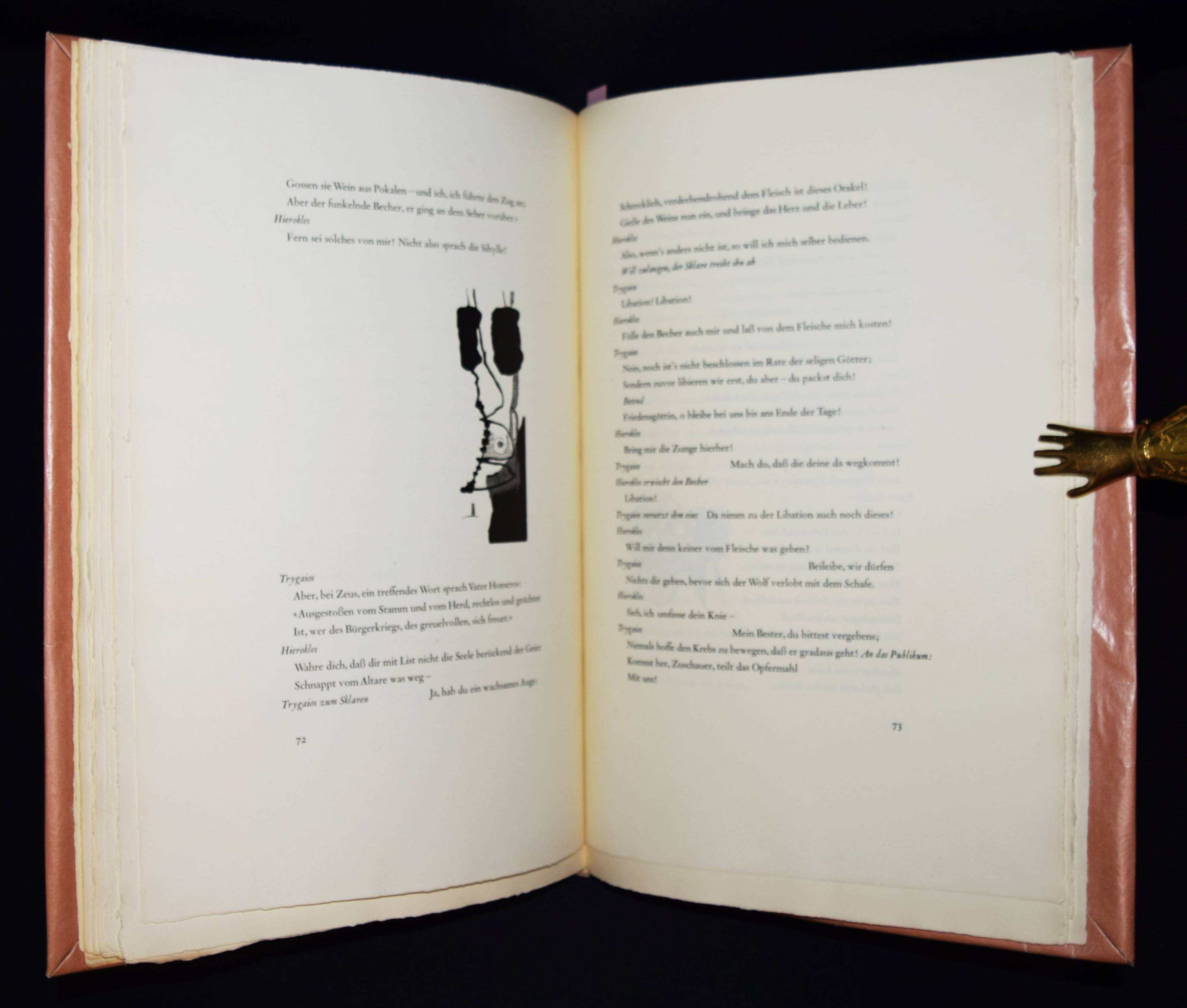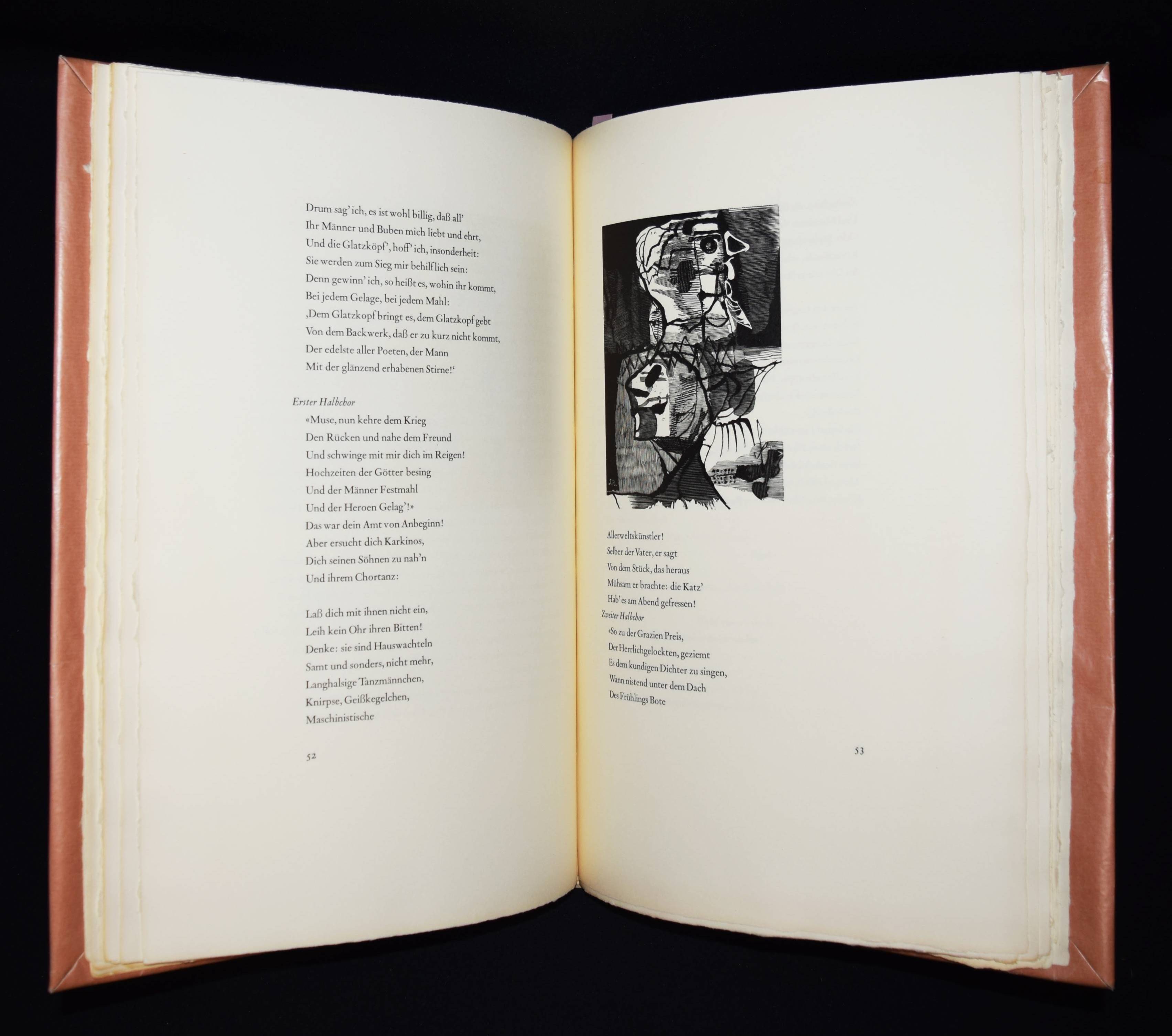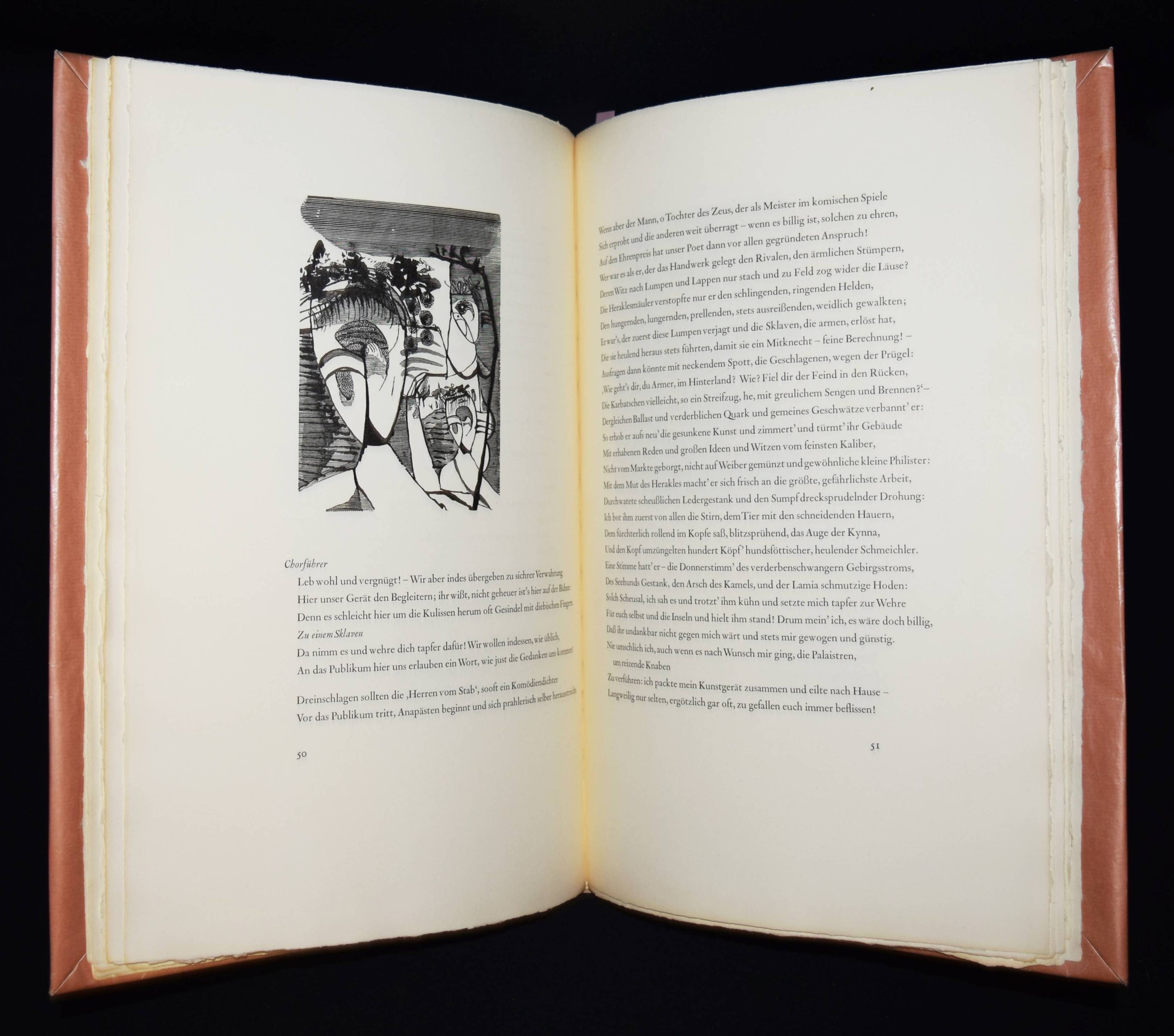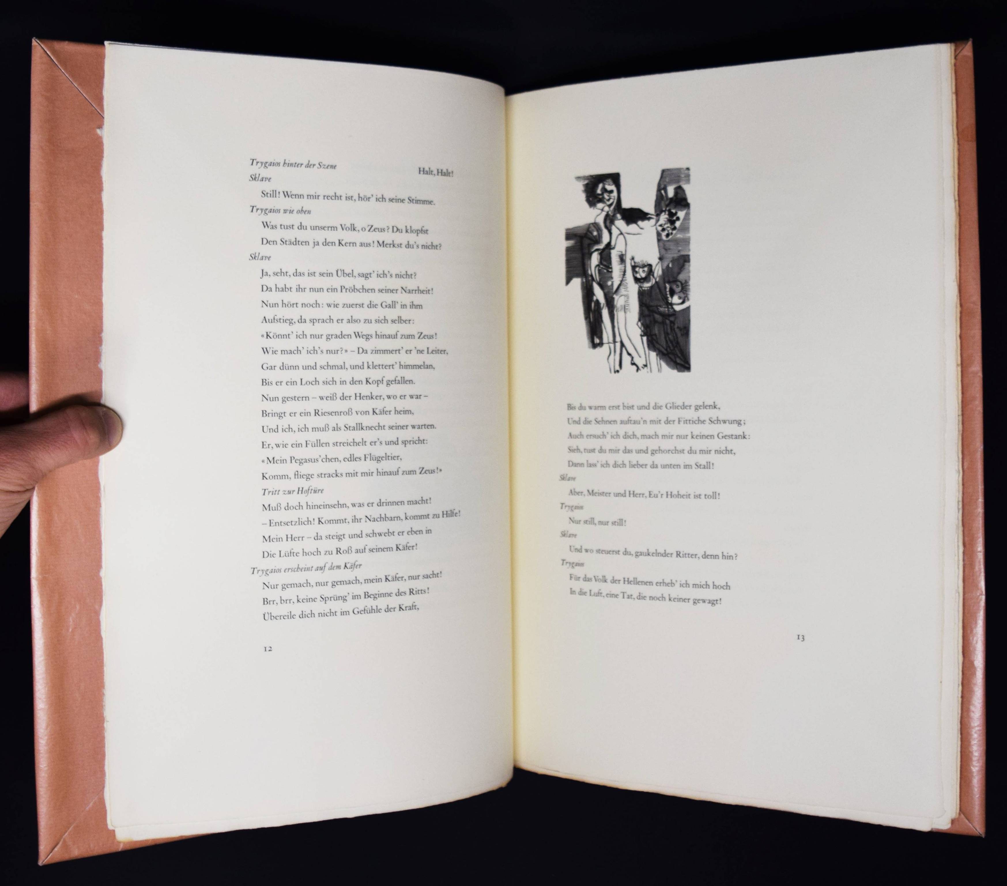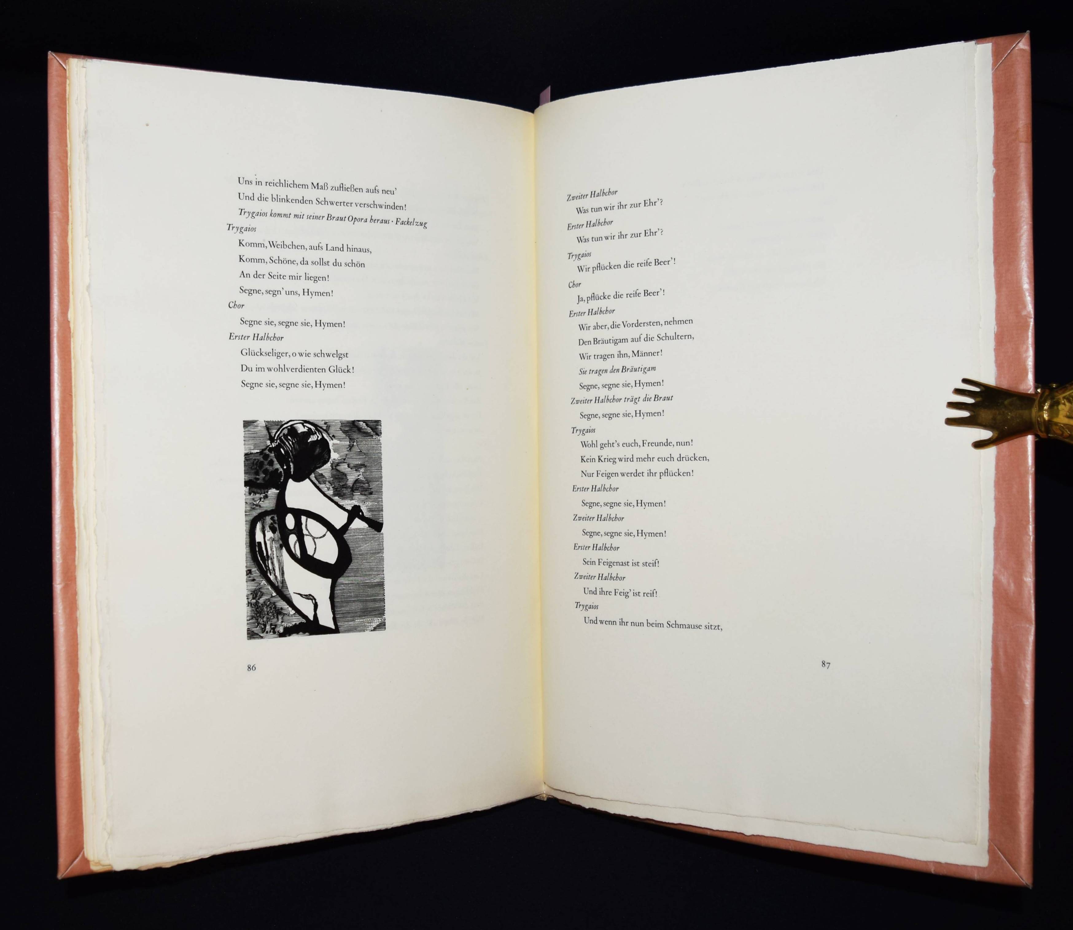 Aristophanes. Der Frieden. Eine Komödie. Übertragen von Ludwig Seeger. Mit neunundzwanzig Holzstichen von Imre Reiner. Ruvigliana, Selbstverlag (1965). Folio (39,5 x 27,5 cm.). 88 S., [2] Bl. mit 29 Orig.-Holzstichen. OPbd. mit Orig.-Schutzumschlag. Nr. 44 von nur 80 Exemplaren; im Druckvermerk von I. Reiner signiert. – Vorderes Innengelenkim oberen Drittel etwas angeplatzt, sonst sehr gut erhalten.