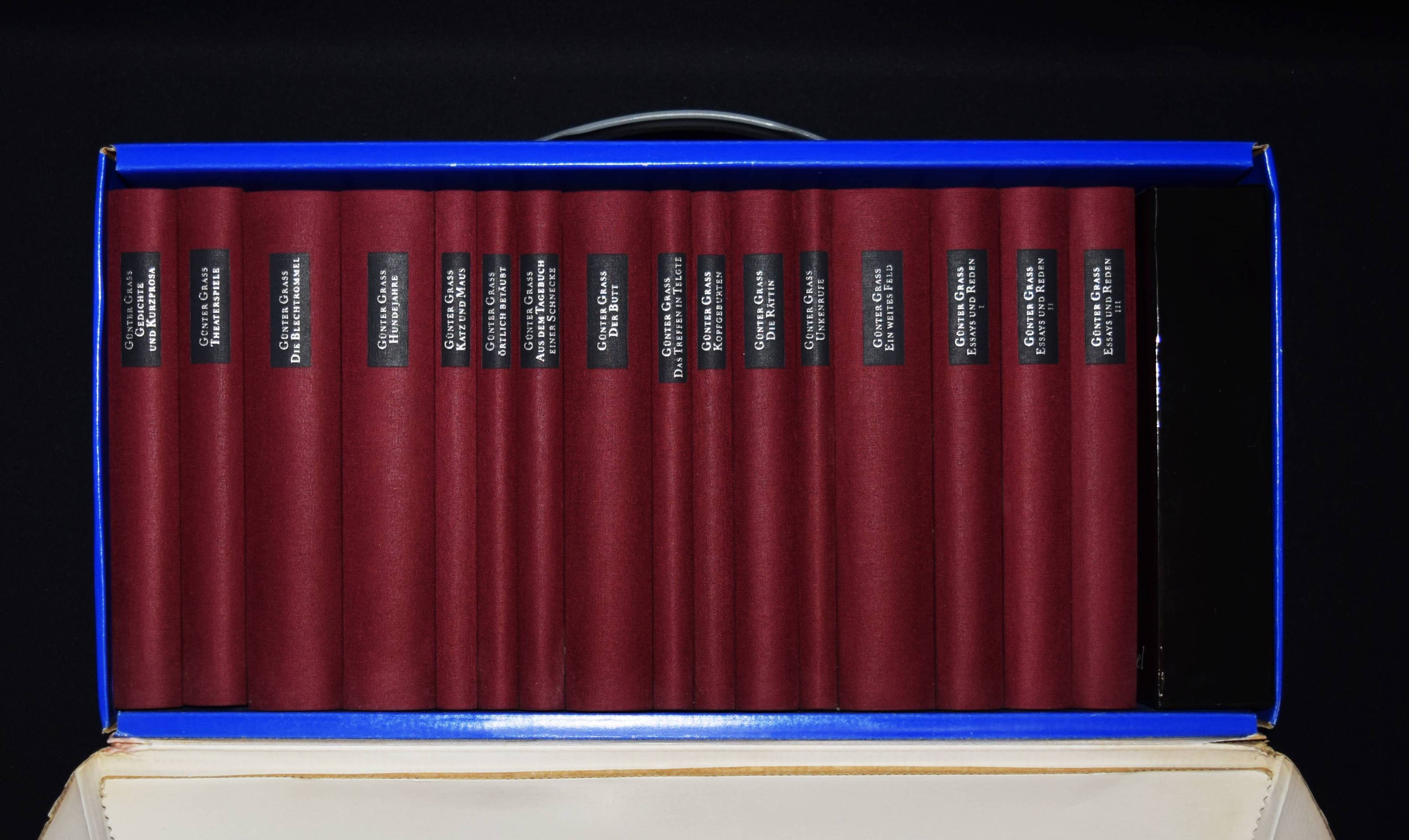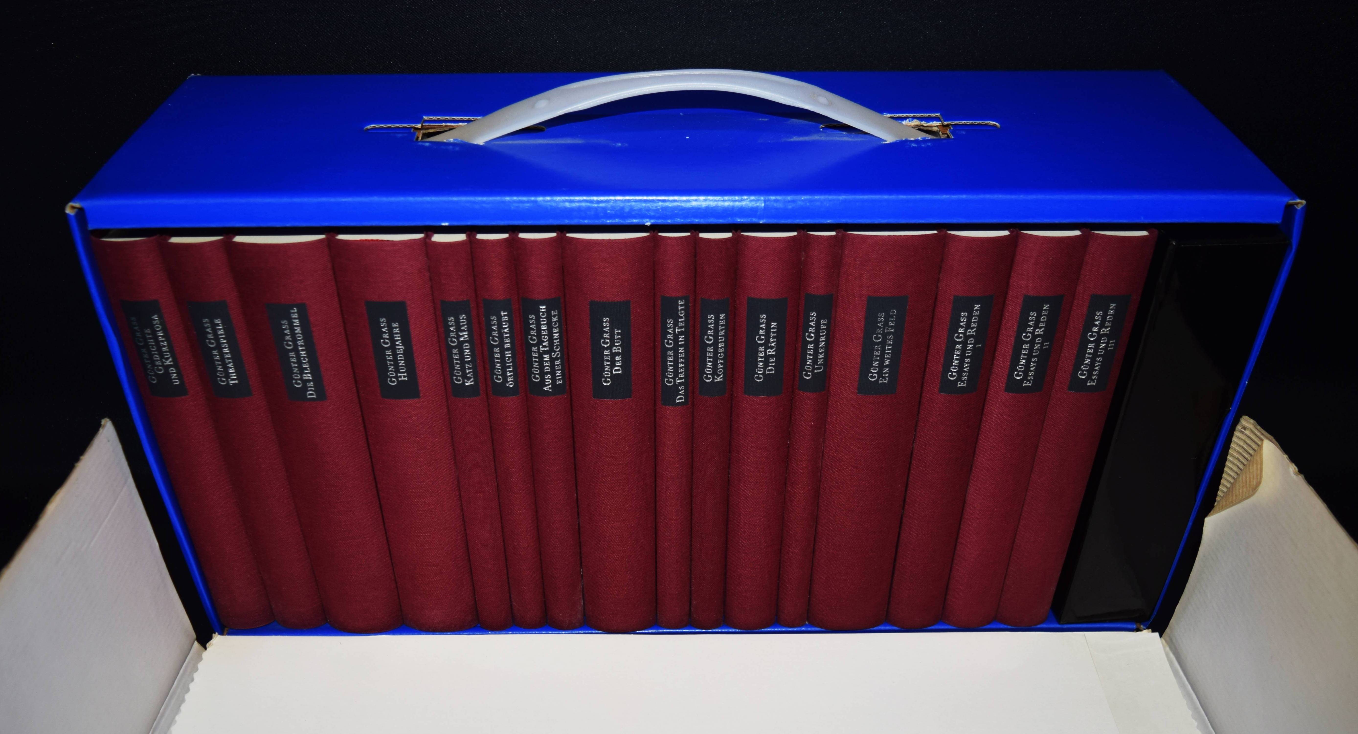 Grass, Günter. Werkausgabe in 16 Bänden. Herausgegeben von Volker Neuhaus und Daniela Hermes. 16 Bände und 23 Audio-CDs. Göttingen, Steidl 1997. 8°. Mit Hörbuch „Die Blechtrommel“ gelesen von G. Grass (ca. 28 Stunden auf 23 CDs) in illustr. Pappkassette. Weinrote Kallikobände mit silbergepr. Rückensch. in farbig illustr. Orig.-Pappkassette. Pappkassette mit Gebrauchsspuren, sonst sehr gut erhalten.
