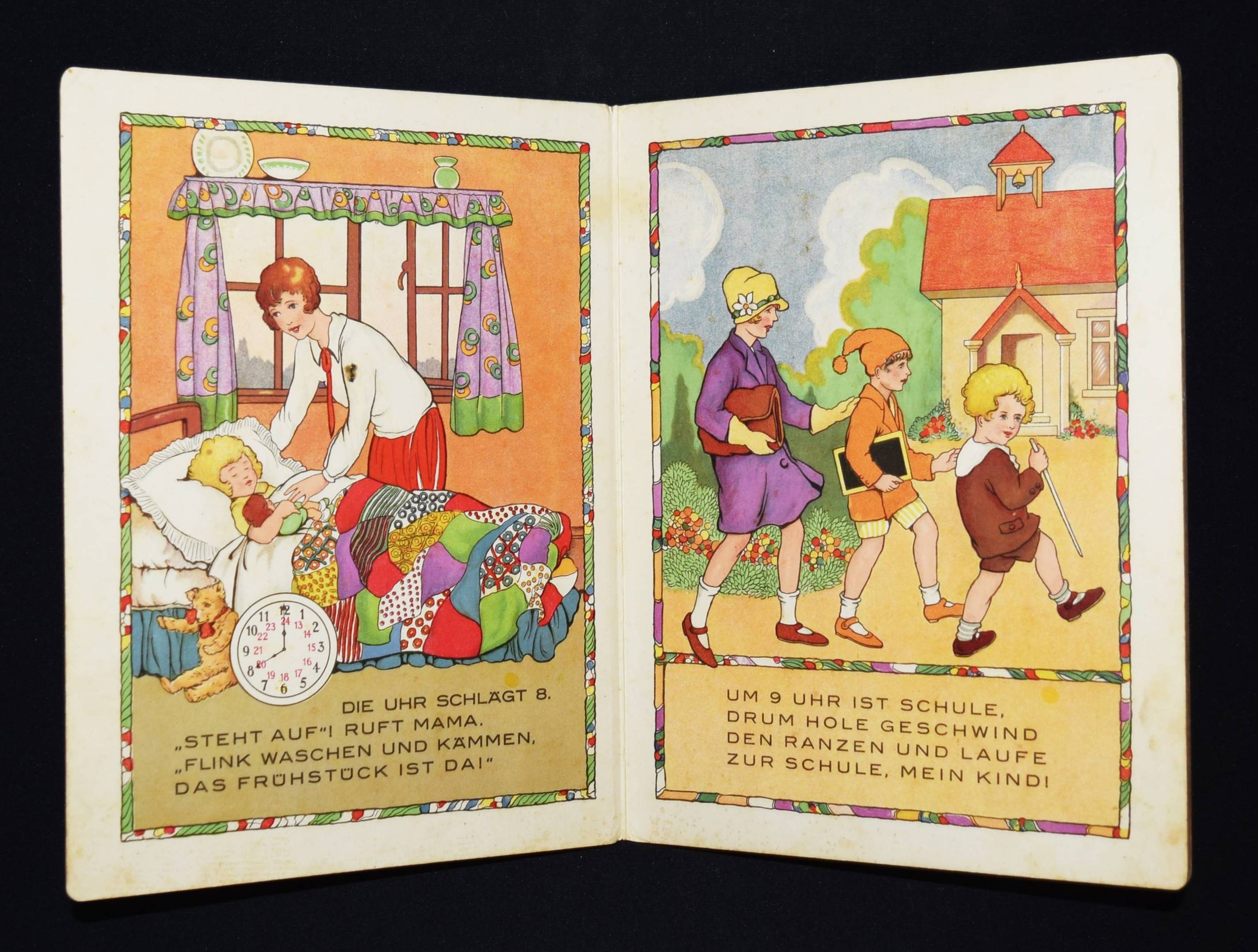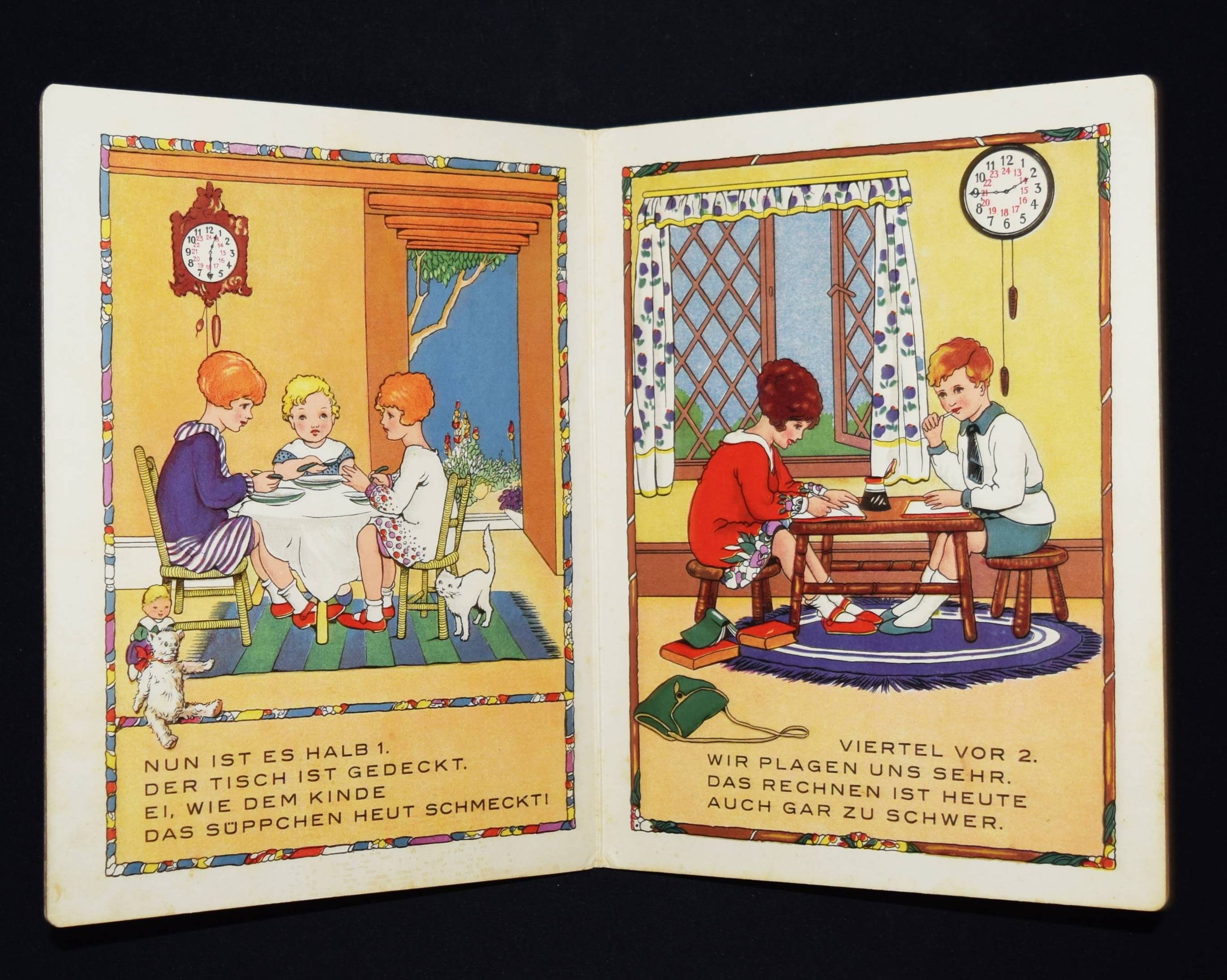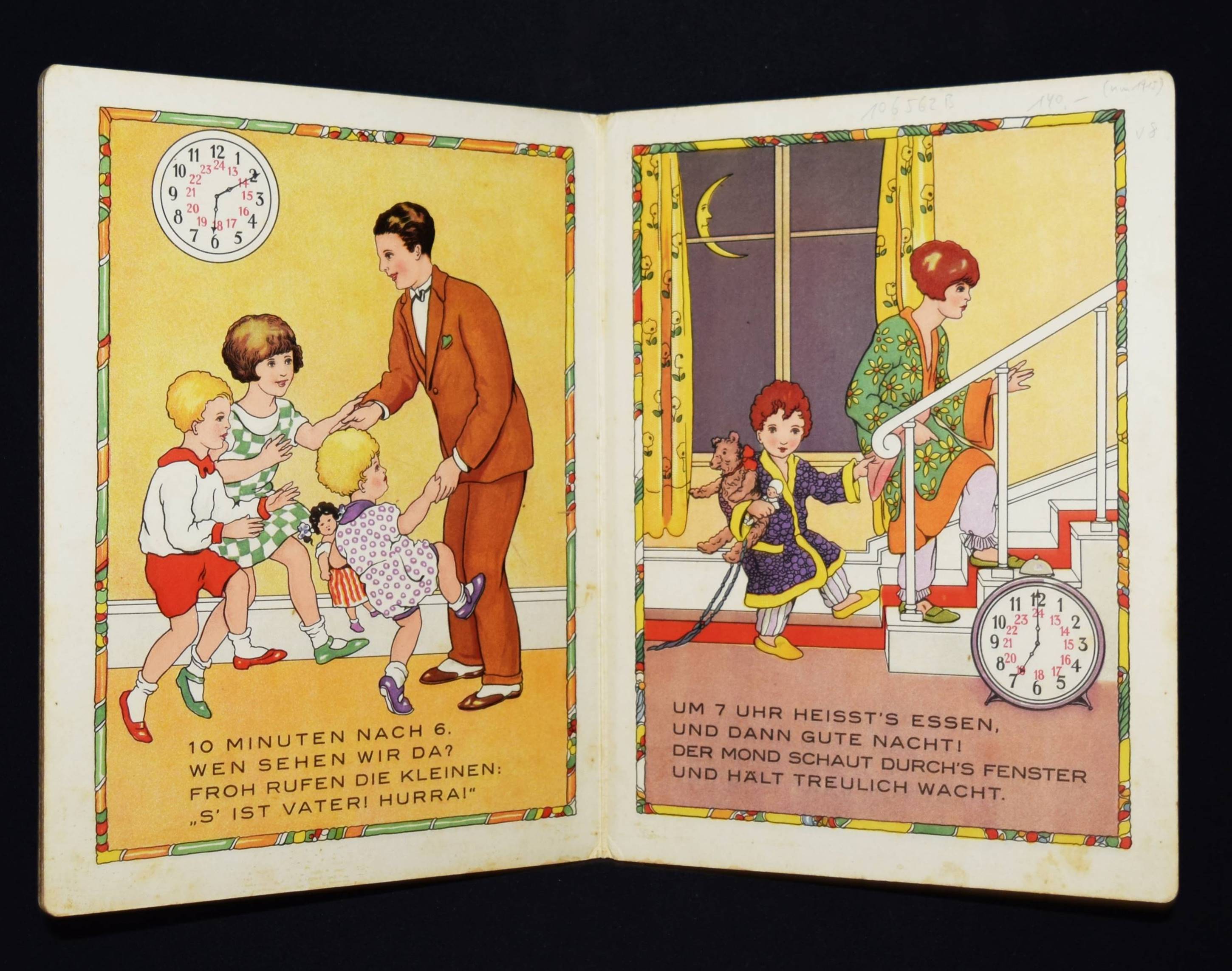 Die Uhr. Ein Bilderbuch zum Lernen und spielen. (Deckeltitel). Nünberg-Doos, Spear & Soehne o. J. (um 1915). 4°. [8] S. mit farblithogr. Illustrationen auf Karton. Farbig illustr. OHln. mit beweglichen Metallzeigern (zwei Kinder und „Golliwog“-Puppe). (Bilderbüchersammlung „Was ihr wollt“; Verlags-Nr. 10162). Nicht bei Rammensee. – Wohl einzige Ausgabe des seltenen Spiel-Bilderbuchs. – Deckel etwas fleckig und angestaubt, sonst gut erhalten.
