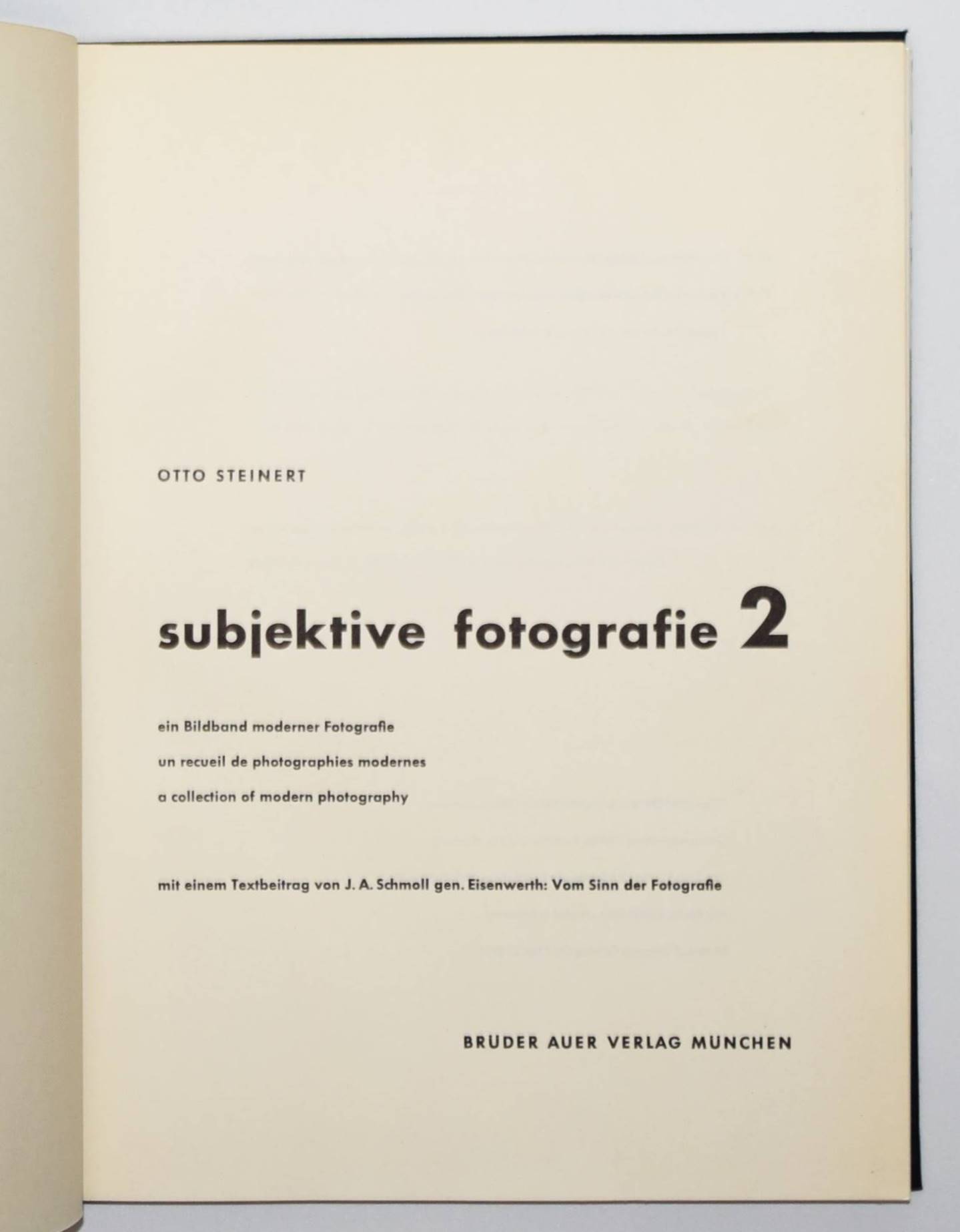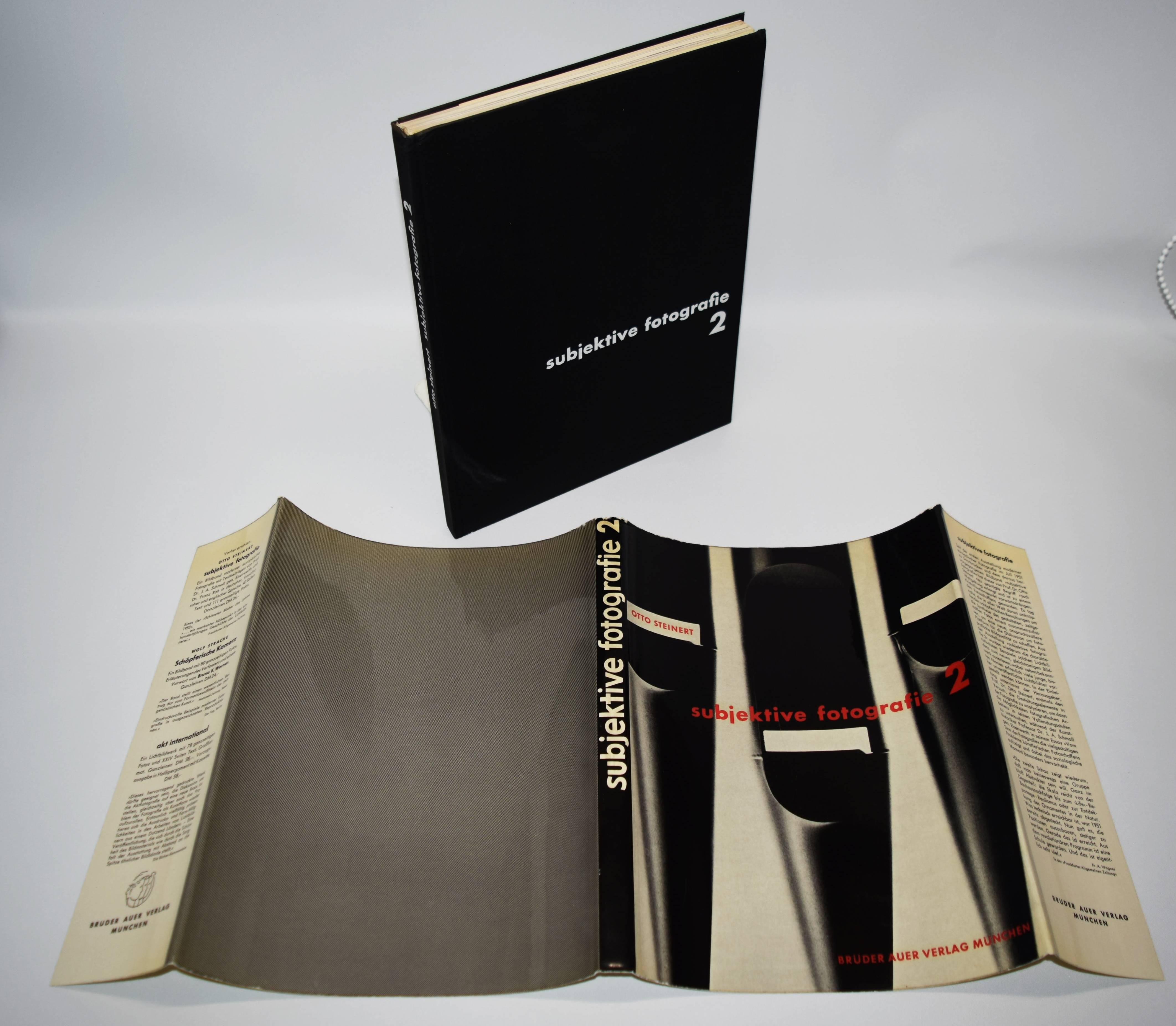Steinert, Otto (Hugo Wilhelm). Subjektive Fotografie. Ein Bildband moderner Fotografie. (Mit Texten von J. A. Schmoll gen. Eisenwerth, Franz Roh u. O. Steinert). – Und: Ders. Subjektive Fotografie 2. Ein Bildband moderner Fotografie. Mit einem Textbeitrag von J. A. Schmoll gen. Eisenwerth: Vom Sinn der Fotografie. 2 Bände. München, Brüder Auer Verlag 1952 und 1955. 4°. 40 S., 111 Tafeln, 1 gefalt. Bl.; 39, (1) S., 111 Tafeln, 1 gefalt. Bl. Orig.-Leinenbände mit illustr. Schutzumschlägen. Heidtmann 10781. Koetzle 439 f. Parr/Badger I, 205. Roth, The Open Book 156 f. – Erste Ausgaben. – Beide Bände erschienen anlässlich der zwei wichtigen Ausstellungen „subjektive fotografie“ (Saarbrücken 1951-1955), 1958 folgte eine dritte Ausstellung. Erster umfassender Versuch, „die gestalterischen Möglichkeiten des Mediums Fotografie in Deutschland wieder aufzuzeigen“ (T. Koenig). – Mit Bildbeiträgen von Moholy-Nagy, Man Ray, H. Bayer, P. Keetman, E. Bourbat, F. Brill, W. Bischof, Chargesheimer, H. List, H. Hajek-Halke, R. Groebli, F. Roiter, R. Hausmann, Y. Ishimoto u.v.a. – „Otto Steinert war der einflussreichste Mentor der westdeutschen Fotografie nach 1945. … Die Betonung der eigengesetzlichen Mittel der Fotografie in Optik und Chemie sind Grundlage seines Schaffens – ein fast naturwissenschaftlich anmutendes Credo, das sich in gelegentlich etwas sterilen, zugleich aber von enormer formaler Dichte geprägten Darstellungen artikulierte“ (U. Pohlmann in Koetzle). – „Its exhibitions, as well as the two ‚Subjektive Fotographie‘ (Subjective Photography) books published by Steinert, were highly influential, and iis approach to photography might be compared to the kind of formalist work being made around the same time at the Chicago Institute of Design and other teaching centers in the United States. … Thus although ‚Subjektive Fotografie‘ was a widely influential book for a while, its significance waned fairly quickly and the movement withered away through the 1960s“ (Parr/Badger). – Schutzumschläge an den Kanten geringf. berieben, der mit roter Schrift bedruckte zusätzliche Klarsicht-Schutzumschlag von Band I liegt als Fragment bei, sehr gute Exemplare.