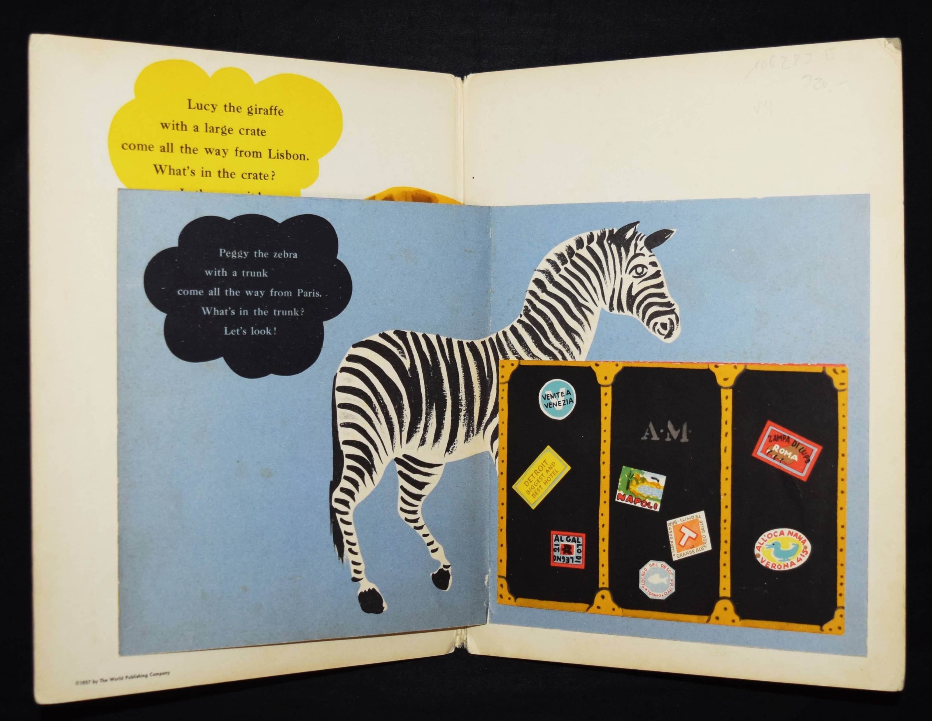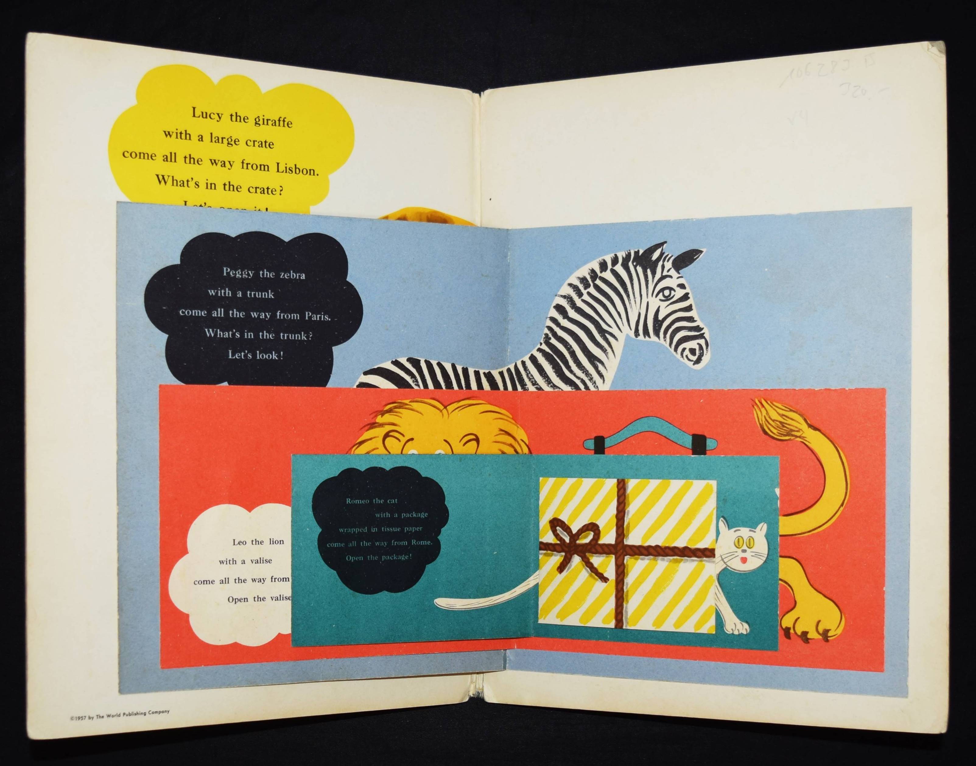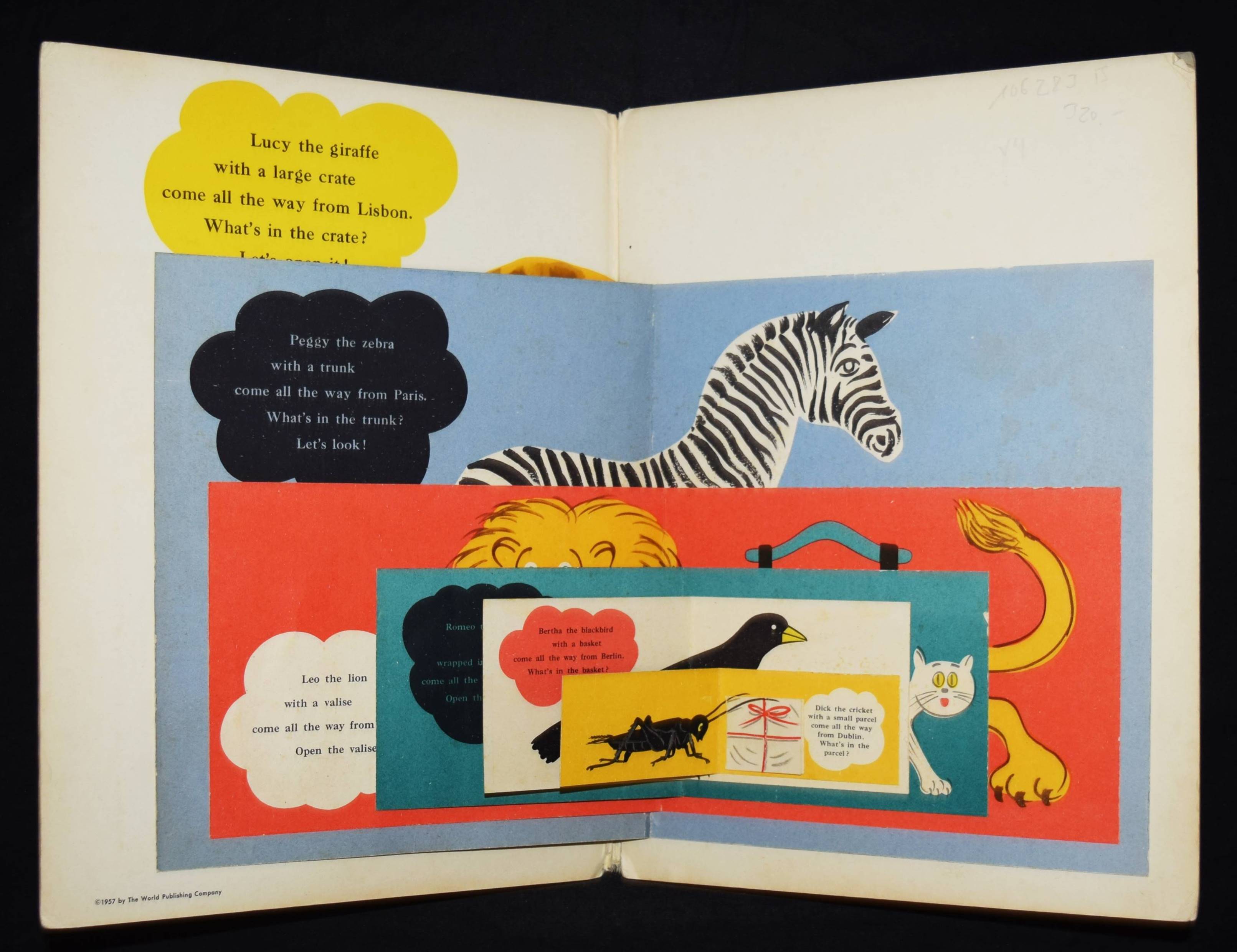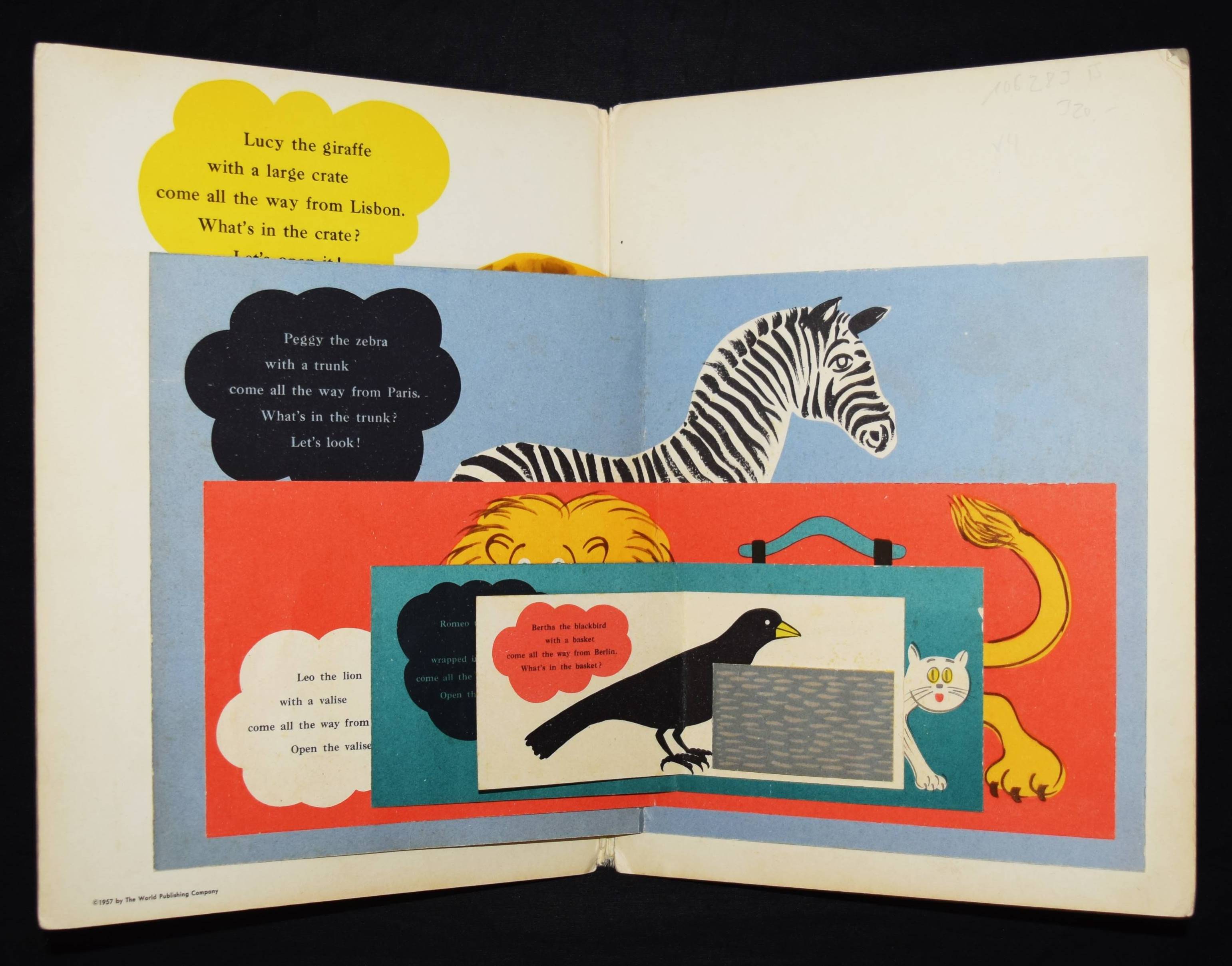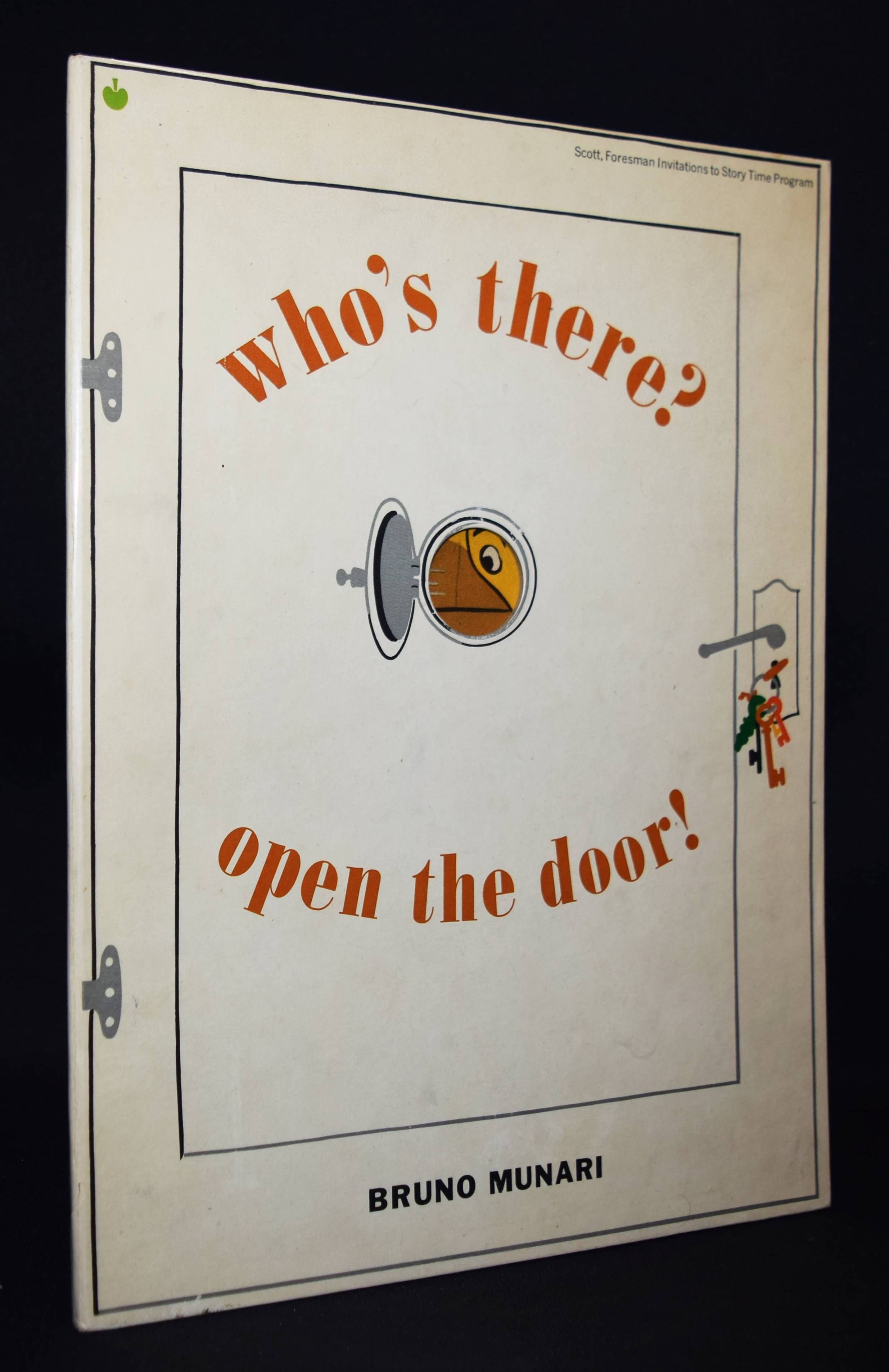 Munari, Bruno. Who’s there? Open the door! (Deckeltitel). Cleveland, New York, The World Publishing Company u. Scott, Foresman and Company (1957). 4°. [6] Bl. in verschiedenen Formaten mit farb. Illustrationen zum Aufklappen. Farbig illustr. OHln. mit kl. ausgestanztem runden Guckloch am Vorderdeckel. Erste amerikanische Ausgabe dieses originellen ital. Spielbilderbuchs. „Special Scott, Foresman and Company Edition“. Selten, wie alle Bilderbücher des Künstlers. – Bruno Munari (1907-1998) begann als futuristischer Maler, arbeitete als Industrie-Designer, konstruierte berühmte Mobiles und Spielzeug. – „In Sammlerkreisen ist er so etwas wie ein Geheimtipp: der Italiener Bruno Munari, 1907 in Mailand geboren und 1998 dort gestorben. Nach seinen Kunststudium war er zunächst als futuristischer Maler tätig, doch bald setzte sich der Drang zur Bewegung in seinen künstlerischen Elementen durch. Er begann Mobiles und Spielzeug zu konstruieren. 1945 war das entscheidende Jahr, in denen der Mailänder Verlag Mondadori gleich fünf Bilderbücher von Munari herausbrachte, in denen er seine Geschicklichkeit im Spiel mit den Buchseiten unter Beweis stellte. Von seinen zehn Bilderbüchern kamen in den Jahren zwischen 1957 und 1959 acht anglo-amerikanische Nachdrucke heraus. Und seine ab 1949 erschienenen „Libri Illegibili“ (Unlesbare Bücher) brachten ihm 1958 Anerkennung durch die Goldene Medaille der Triennale Milano“ (P. Laub, Spielbilderbücher S. 28). – „Dieser Künstler hat ab 1945 das Bilderbuch erneut zum Gegenstand experimenteller Umgangsweisen mit dem Medium „Buch“ gemacht. In seinen Büchern (vor allem der Reihe „I Libri Munari“, alle bei Mondadori) konnten die damals vielleicht erstaunten kindlichen oder erwachsenen Benützer allerlei Türchen und Fenster öffnen und auf- und ausklappen, es gibt viele Überraschungen und komische und (damals) ungewohnte Effekte – in einem Wort: das Buch wird zum Objekt, an dem man sich aktiv betätigt… ″ (F. C. Heller in Keune, Kat. 46, Nr. 1). – Bibliotheksstempel auf den Innendeckeln, sehr gutes sauberes Exemplar.