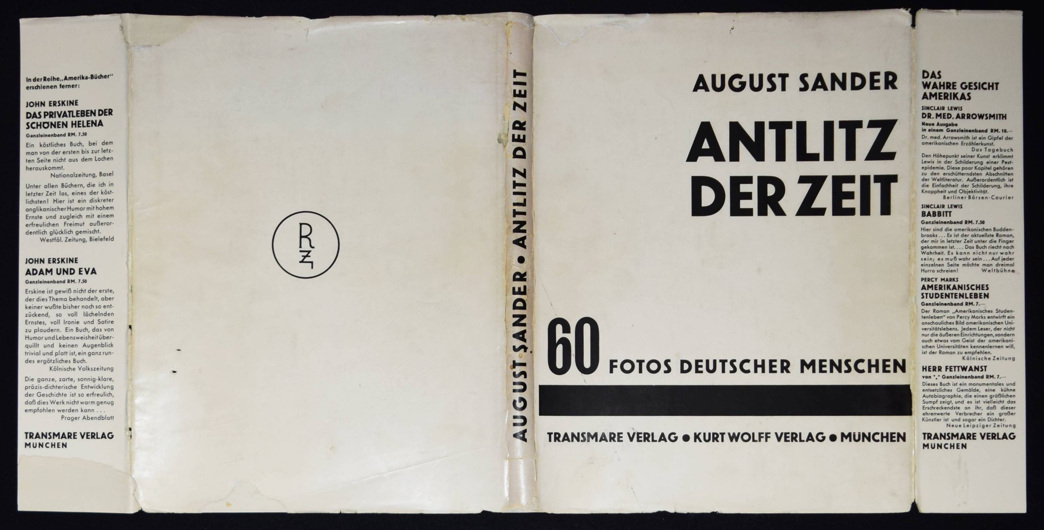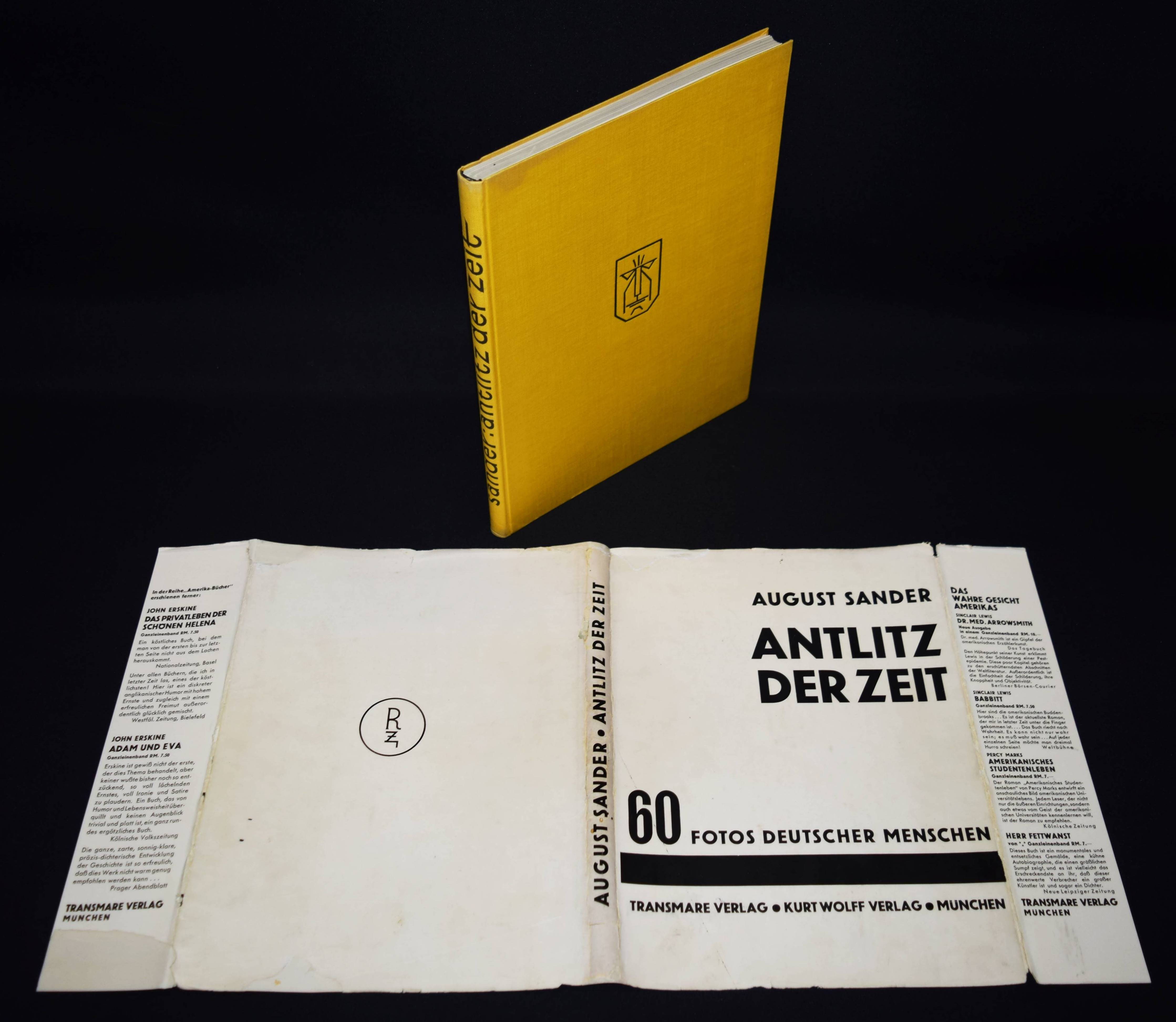 Sander, August. Antlitz der Zeit. Mit einer Einleitung von Alfred Döblin (″Von Gesichtern, Bildern und ihrer Wahrheit“). München, Transmare-Verlag u. Kurt Wolff 1929. 4°. 17, (3) S. und 60 Tafeln. Gelber Orig.Leinenband mit Rückentitel und Deckelvignette (Entwurf: Emil Preetorius) und Schutzumschlag. Auer 139. Göbel 694. Heidtmann 14133. Heiting/Jaeger I, 302 ff. Heiting/Wiegand 122. The Open Book 84 f. Roth, The Book of 101 Books 52 f. W.-G.² 27 (Döblin). – Erste und einzige Ausgabe des grundlegenden Werks zur Porträtphotographie im 20. Jahrhundert. – „Mit den in diesem Buch veröffentlichten Aufnahmen repräsentierte er (Sander) in deutlicher Abgrenzung von der überkommenen Kunstfotografie, in deren Bahnen er sich in den Anfangsjahren bewegt hat, den Stil der Neuen Sachlichkeit. Für die große Anerkennung, die Sander mit diesem Porträtwerk bereits von seinen Zeitgenossen bekommen hat, sprechen mehr als 100 in seinem Nachlass erhaltene Rezensionen. Heute läßt sich sagen, dass kein fotografisches Porträtwerk so einflussreich nachgewirkt hat, die Adaption in der zeitgenössischen Fotokunst eingeschlossen, wie das von August Sander, wenn es galt, mit Kameramitteln auf Aspekte des Sozialen hinzudeuten. Und das, obwohl Sanders Porträtwerk durchaus in den Wertigkeiten ambivalent ist. Sein konzeptioneller Porträtcorpus hat mit seiner gesellschaftlichen Relevanz zweifelsfrei etwas Fortschrittliches, die Ausführungen der einzelnen Porträts wie die angewandte fotografische Technik sind jedoch konventionell. … In seiner Ambivalenz ähnelt sein Werk dem von Eugène Atget in Paris, das gleichermaßen weniger durch die Technik und gestalterische Erfassung einzelner Fotografien als durch die konzeptionelle Stringenz in der Motivwahl zu internationaler Anerkennung gelangte“ (E. Kaufhold in Heiting/Jaeger). – „August Sanders Leistung bestand darin, dass er die traditionelle Arbeitsweise, Porträts sorgfältig zu arrangieren, für die neue dokumentarische Aufgabe der Fotografie nutzbar machte. Er hat das Atelierporträt mit der Dokumentarfotografie versöhnt. Besondere Bedeutung bekommt dieser Akt durch die Systematik, die seinem Lebenswerk innewohnt. Diese wird heute als frühes Beispiel konzeptioneller Kunst angesehen, die auch auf Entwicklungen innerhalb der bildenden Kunst nicht ohne Einfluss blieb. So hat Sander mit seinem Porträtwerk einen wichtigen Beitrag zur Anerkennung der Fotografie als Kunst geleistet und gilt mit Albert Renger-Patzsch daher als der international renommierteste deutsche Fotograf unseres Jahrhunderts“ (R. Misselbeck in Koetzle S. 391 f.). – „August Sander’s great project, Man in the Twentieth Century, a portrait study of the German people, was only exceeded in size by Edward S. Curtie’s American Indian study of 1929. But whereas the Curtis enterprise was essentially nineteenth-century in concept, a positivist, somewhat sentimental exercise in a neocolonialist genre. Sander’s magnum opus (whatever its roots in the dubious nineteenth-century ‚science‘ of physiognomy) was thoroughly of the twentieth century – sceptical, objective, lucid. … But many of his classic images are included in this seminal photobook, and the essential qualities of Sander’s vision can be seen. He took typical examples of professions, trades and social classes in Weimar Germany, and photographed them in their familiar environments in order to build up, piece by piece, a dispassionate image of the ‚face‘ of society“ (Parr/Badger). – Fehlstellen und Randläsuren des seltenen Schutzumschlags am Kapital, Fuß und im oberen Rand unauffällig restauriert und geringfügig angestaubt, der Einband im oberen Rand des Vorderdeckel etwas fleckig, sehr gutes Exemplar.