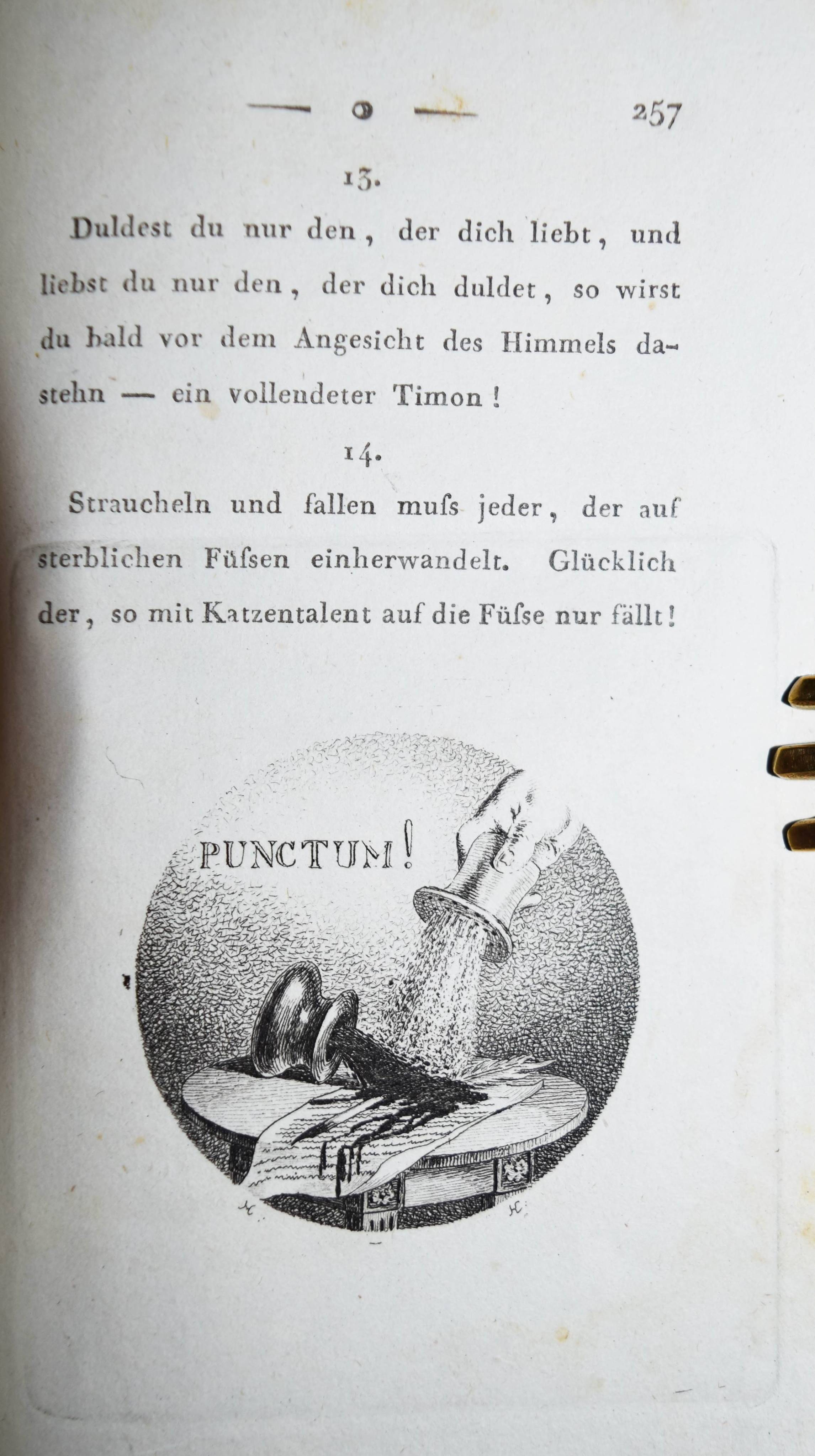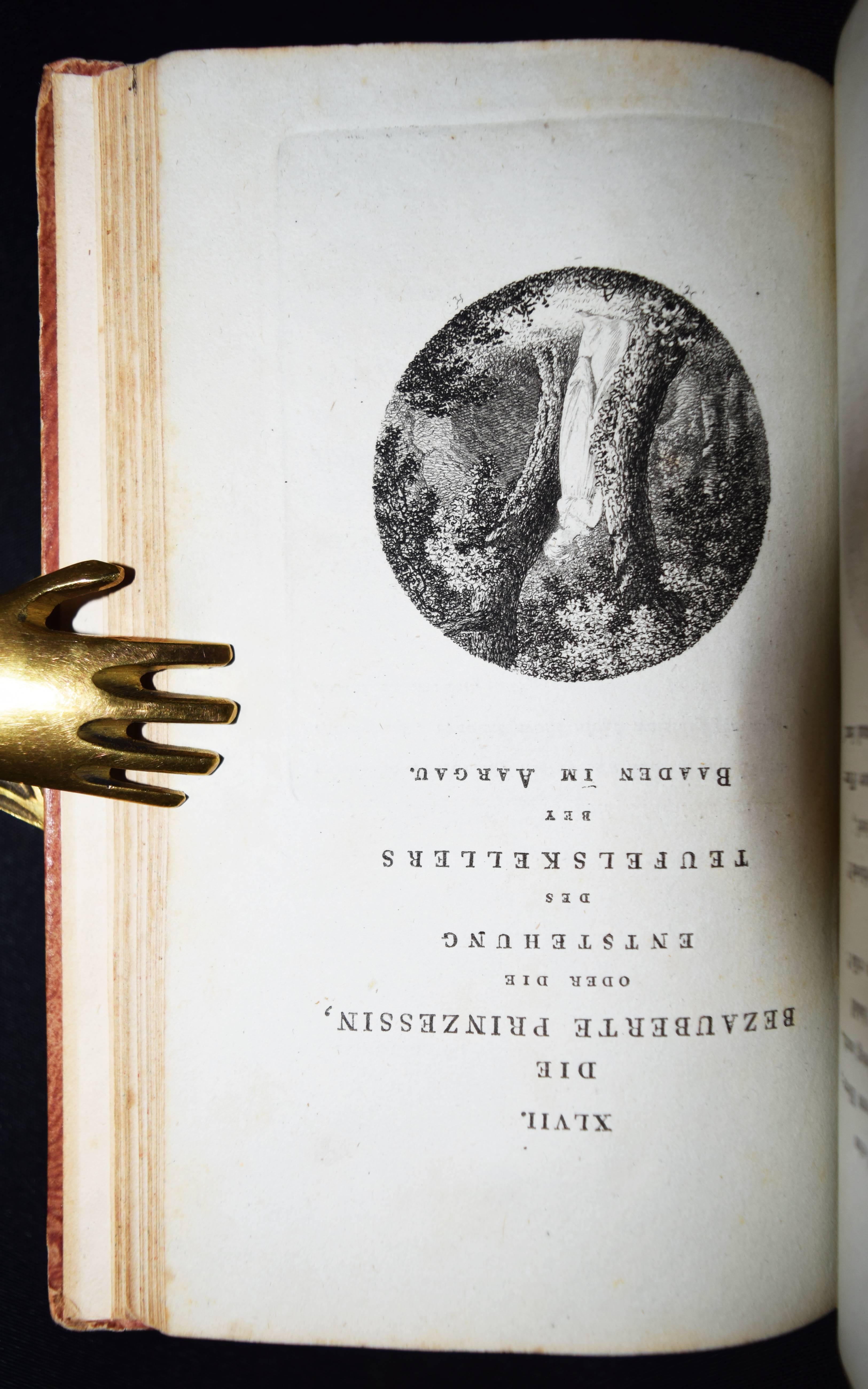 | (Hess, Johann Jakob). Kleine Gemählde, Reminiszenzen und abgebrochene Gedanken. Von einem Dilettanten. Zürich, Orell Füssli und Compagnie 1802. Kl.-8°. XI, [1] Bl., 257, 9 S. mit gestoch. Titel mit Vignette, 16 gestoch. Vignetten und 9 S. gestoch. Musik-Beilagen. Hldr. d. Zt. Brieger 1096. Holzmann-Bohatta II, 6414. Lonchamp 1468 a. – Erste Ausgabe, teils auf bläuliches Papier gedruckt. – Johann Jacob Hess (1741-1828), ein enger Freund Lavaters war seit 1777 Diakon und später Pfarrer und Atistes der Züricher Kirche. – Rücken fachgerecht erneuert, stellenweise leicht braunfleckig, gutes Exemplar.