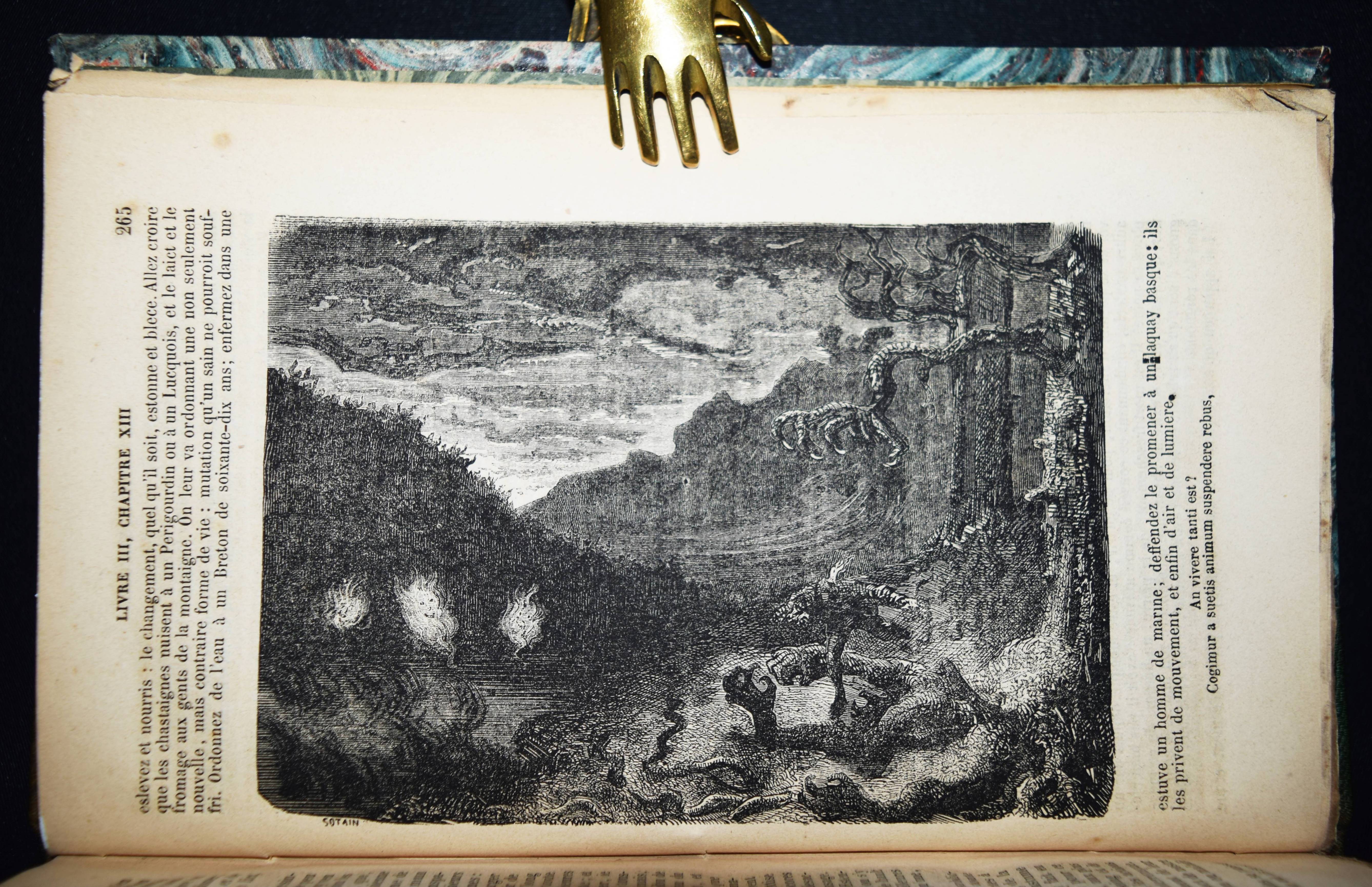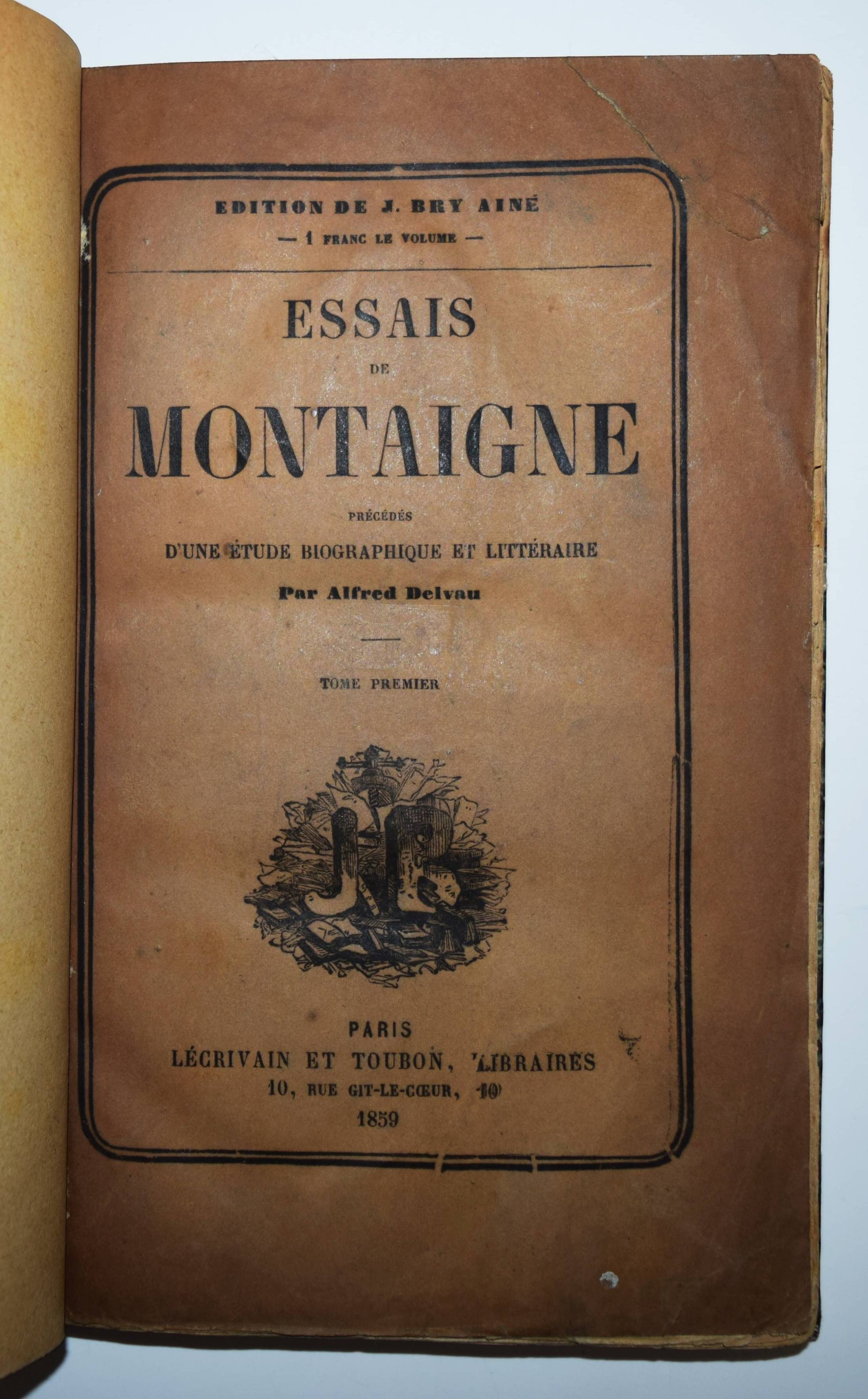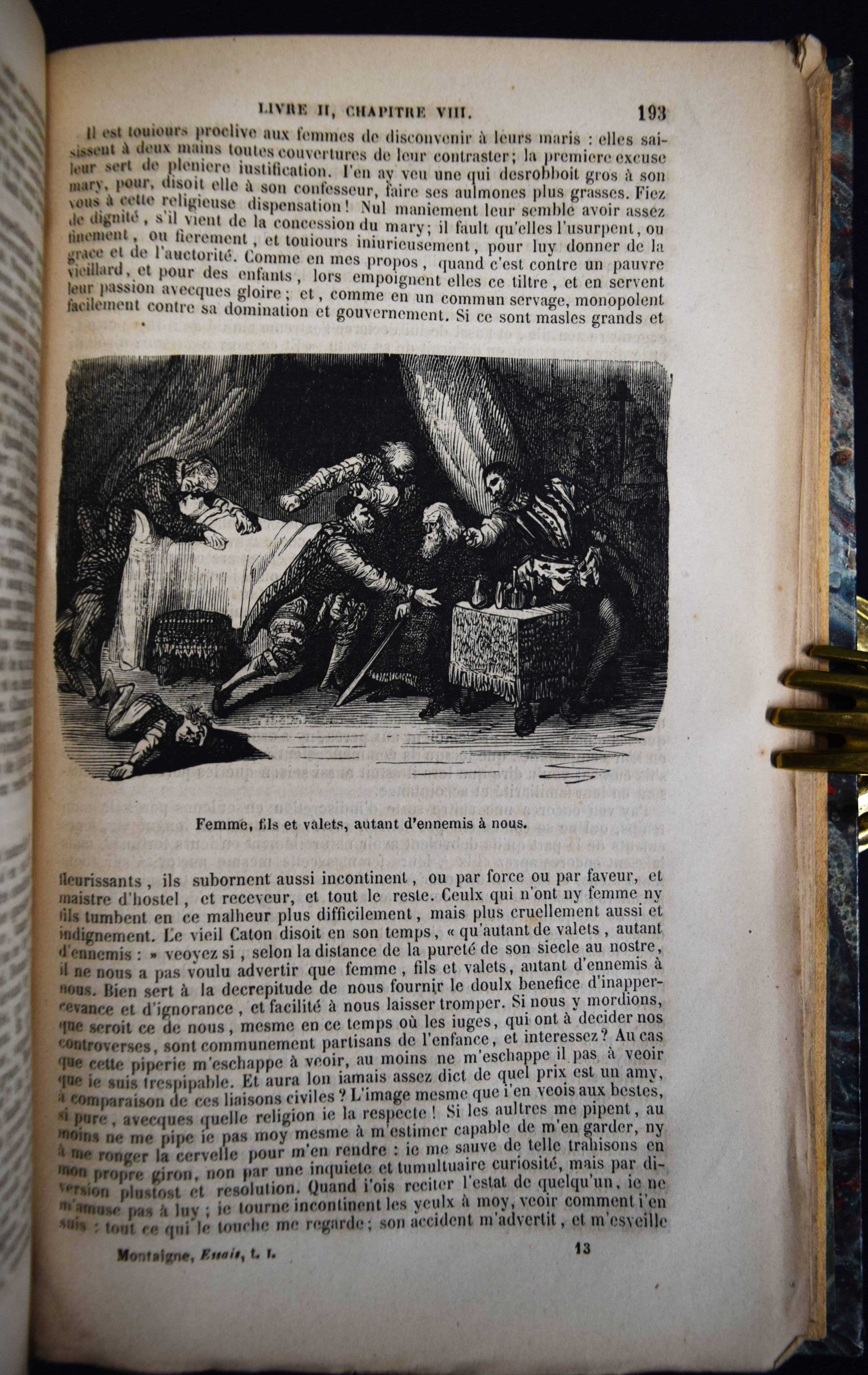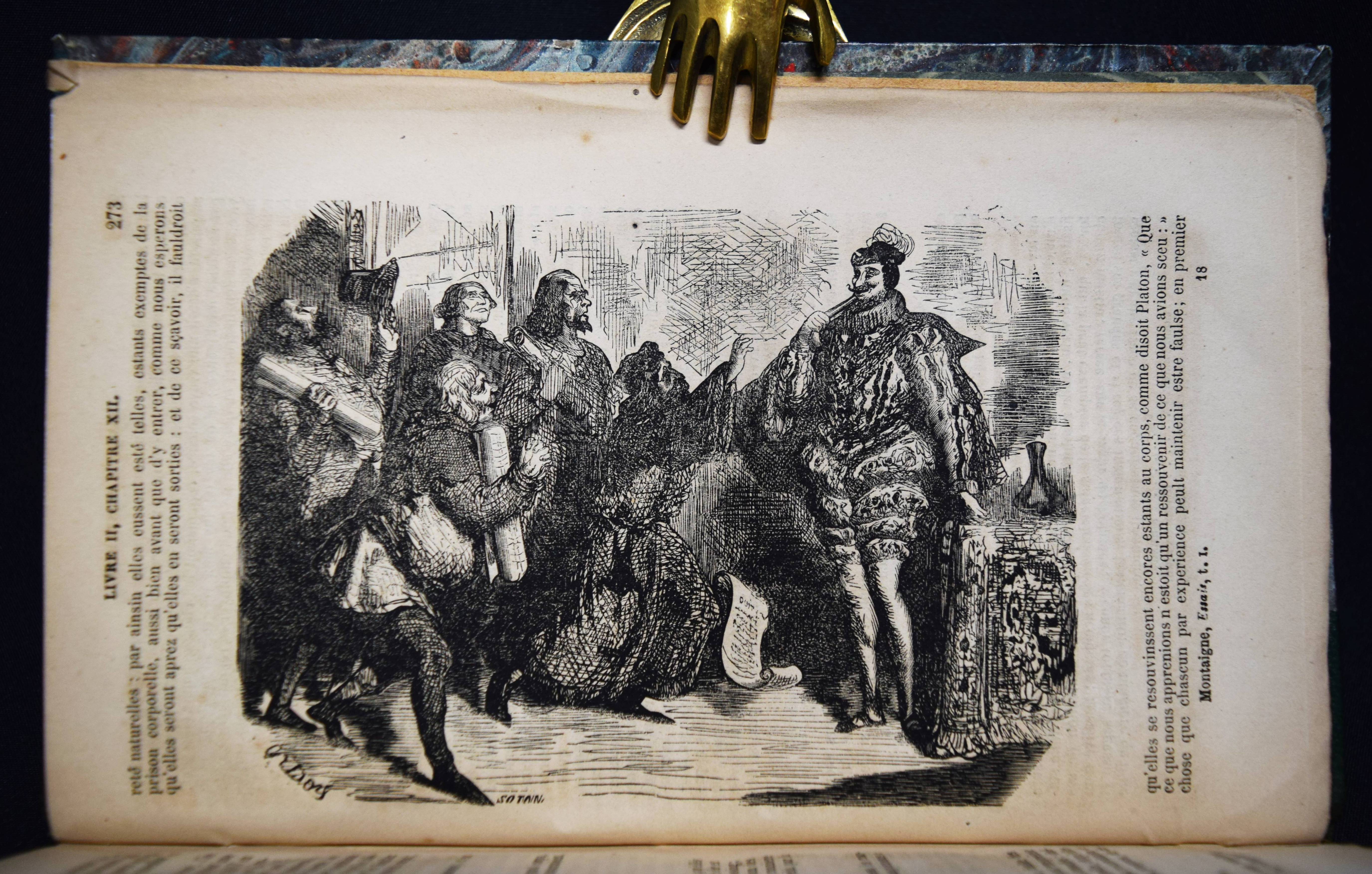 Montaigne, (Michel Eyquem) de. Essais. Précédes d’une étude biographique et littéraire par Alfred Delvau. 2 Bände. Paris, J. Bry ainé 1859. 8°. [2] Bl., VII, 288 S.; [2] Bl., 286 S. mit 12 Holzstichen von Gustav Doré. Dunkelgrüne Hldr. d. Zt. mit jeweils 2 goldgepr. Rückensch. Kassettenvergoldung und Kopfgoldschnitt (Orig.-Umschläge beigebunden). Erste von G. Doré illustrierte Ausgabe des Klassikers. – „Montaigne erfand die Form des Essays, um seine ganz persönlichen Überzeugungen und Gedanken auszusprechen, eine literarische Form, die es vor ihm kaum gegeben hatte. Sein ausgefeilter Essay, die ‚Apologie de Raimond Sebonde‘, steht mit seinem Angriff auf den Fanatismus und mit seinem Eintreten für die Toleranz keiner modernen Schrift nach. In der vorliegenden Sammlung hat Montaigne seinen Platz jedoch hauptsächlich als vollendeter Repräsentant des aufgeklärten Skeptizismus des 16. Jahrhunderts, dem Bacon, Descartes und Newton im folgenden Jahrhundert erwidern sollten. Die Vorherrschaft der aristotelischen Wissenschaft hatte durch die Wiederentdeckung anderer antiker Philosophen eine Schwächung erfahren, und dies begünstigte eine skeptische Auffassung der Möglichkeit, überhaupt irgendwelche Kenntnisse des Wesens der Wirklichkeit zu erlangen. Montaigne war der führende Vertreter dieser Denkungsart. … Der letzten, zu Lebzeiten des Verfassers erschienenen Ausgabe der ‚Essais‘ von 1588 war ein dritter Band hinzugefügt, und diese Ausgabe wurde der endgültige Text, auf den alle späteren Ausgaben beruhen“ (J. Carter u. P. M. Muir zur ersten Ausgabe, Bordeaux 1580). – Rücken etwas aufgehellt und leicht berieben, stellenweise braunfleckig und durchgehend etwas gebräunt, gutes dekorativ gebundenes Exemplar.