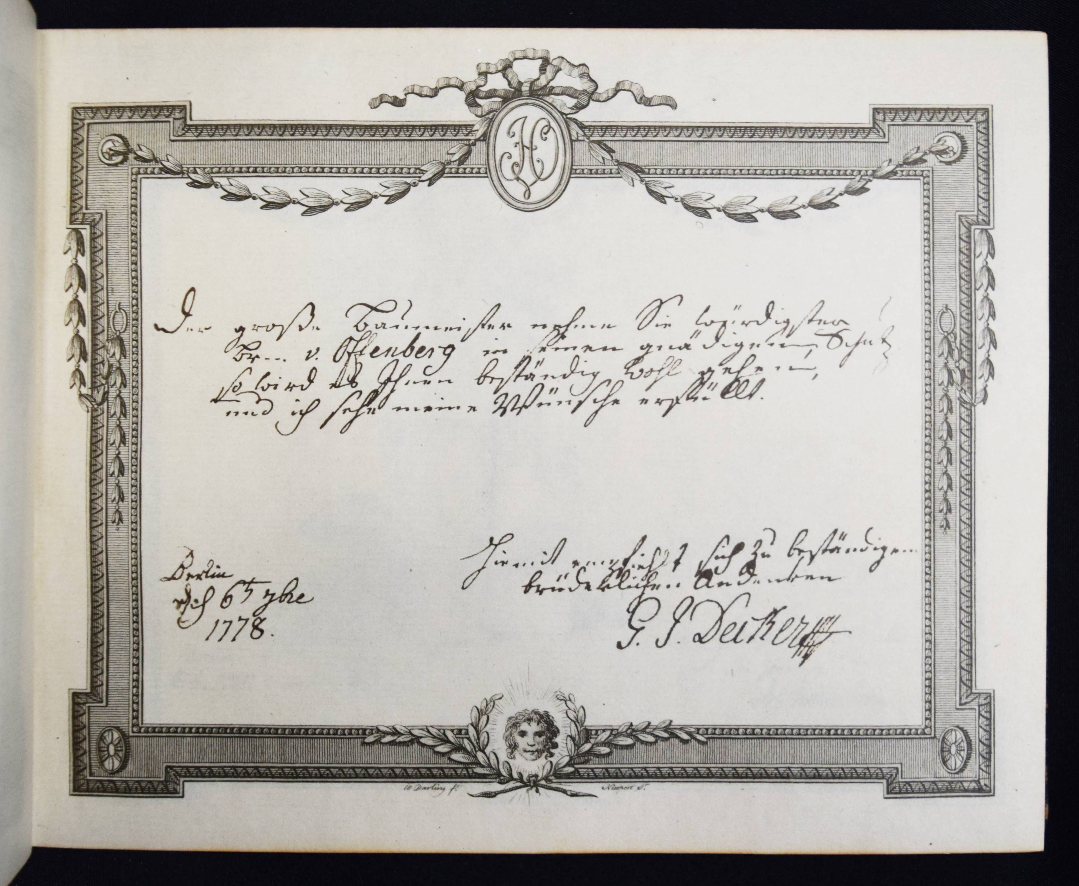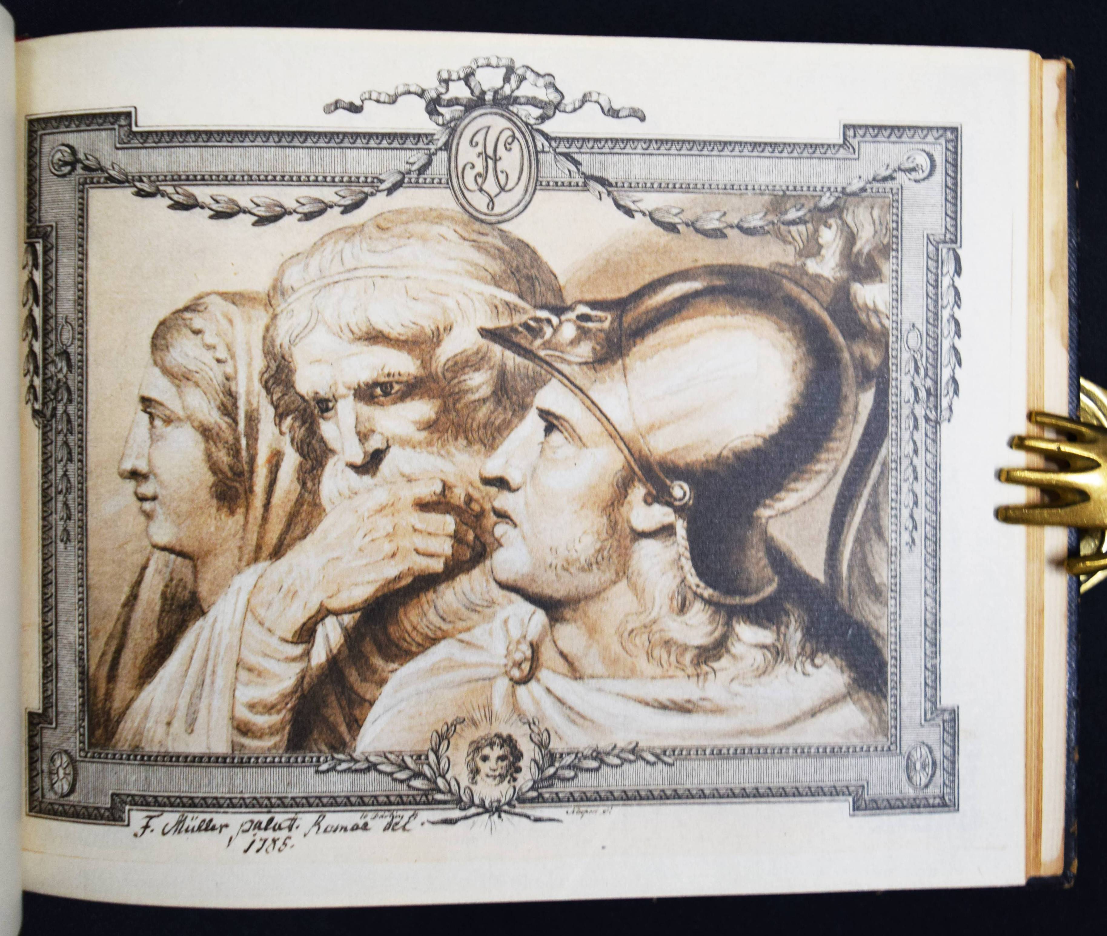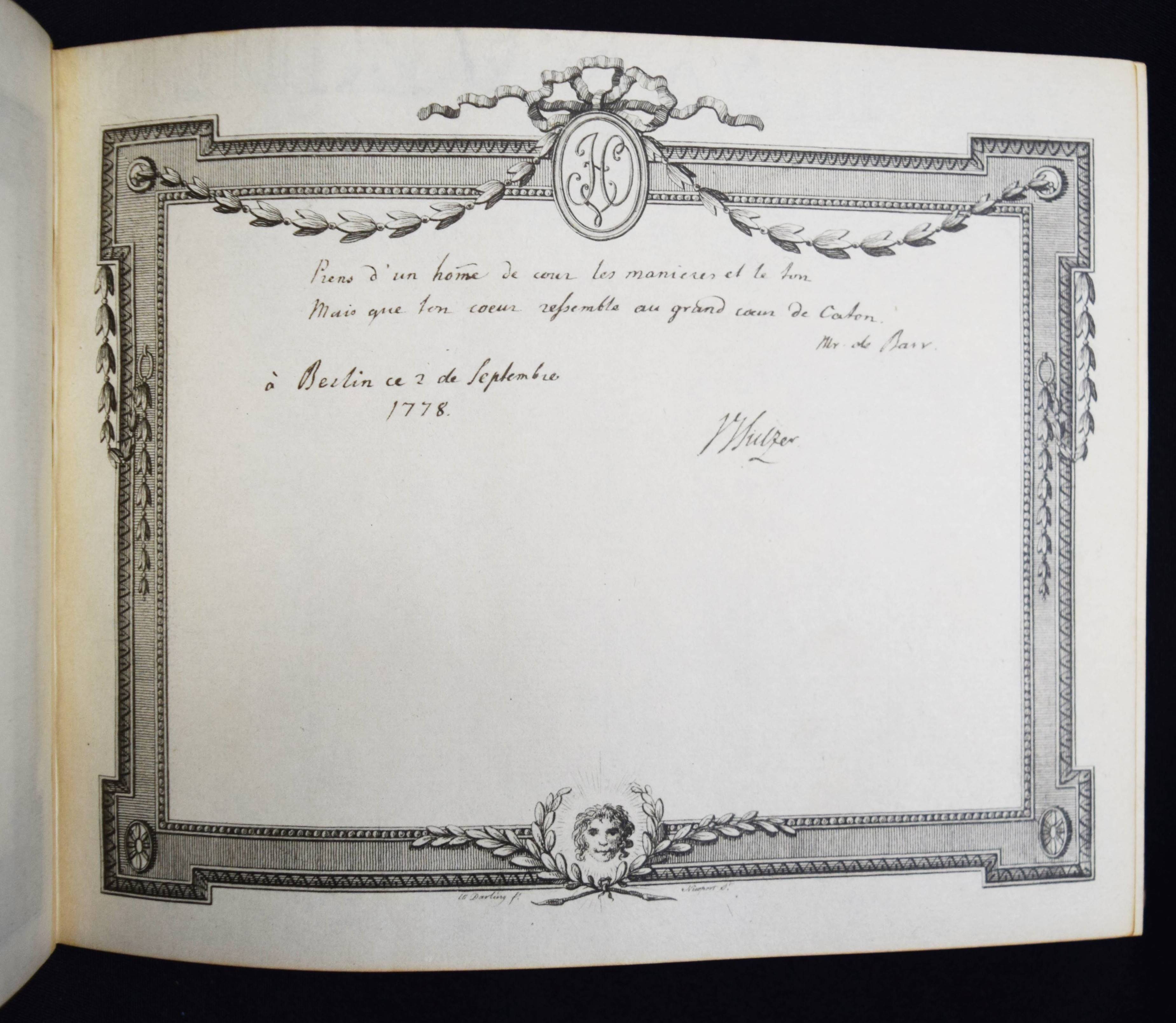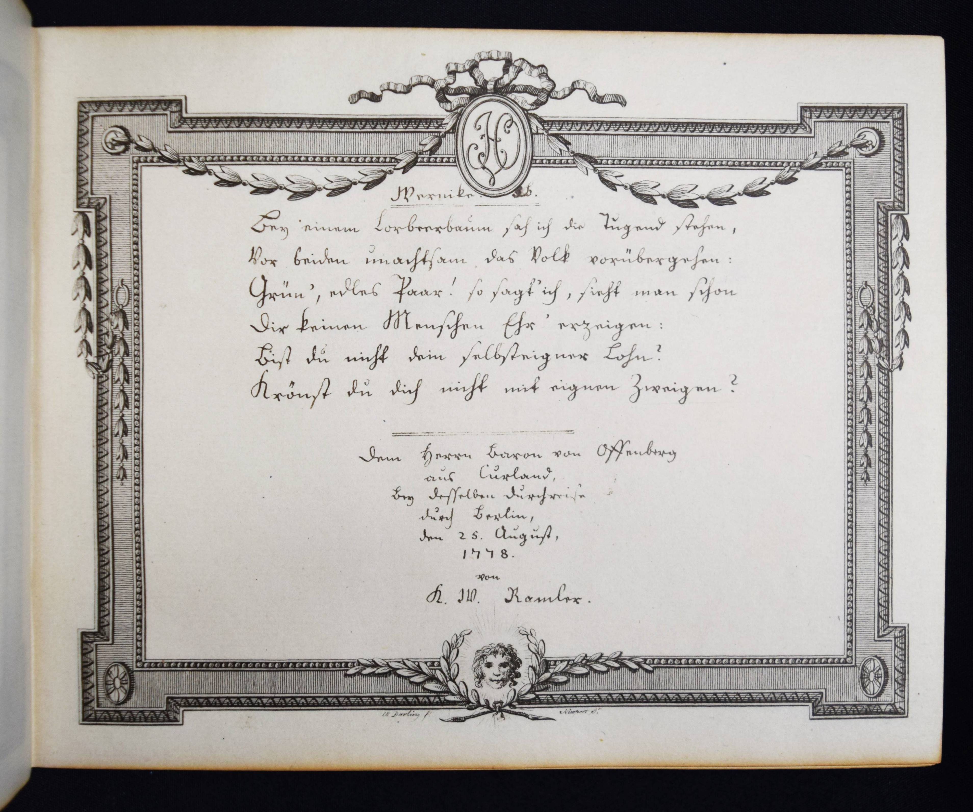 Stammbuch – Offenberg, Heinrich v. Various designs collected by le Baron d’Offenberg de la Courlande in the course of his travels. (Faksimile-Ausgabe nach dem im Provinizial-Museum zu Mitau befindlichen Original. Mit einem Nachwort von Otto Clemen). Leipzig, Insel-Verlag (1919). Quer-8°. [6], 77 teils farbige Tafeln, [12] S. Schwarzer Orig.-Lederband mit reicher Rücken- und Deckelvergoldung und goldgepr. Deckelvignette und Goldschnitt (signiert: E.-A. Enders Leipzig). Sarkowski 1209. – Eines von 312 num. Exemplaren der Vorzugsausgabe im prachtvollen Handeinband. – Das eindrucksvolle Stammbuch mit Zeichnungen und Eintragungen von Kant, Chodowiecki, Lavater, Salomon Geßner, Pestalozzi u. v. a. entstand in den Jahren 1773 bis 1788. Das Original befand sich im Museum der lettischen Stadt Jelgava. – Gelenke und Kanten etwas berieben, sonst sehr gut erhalten.