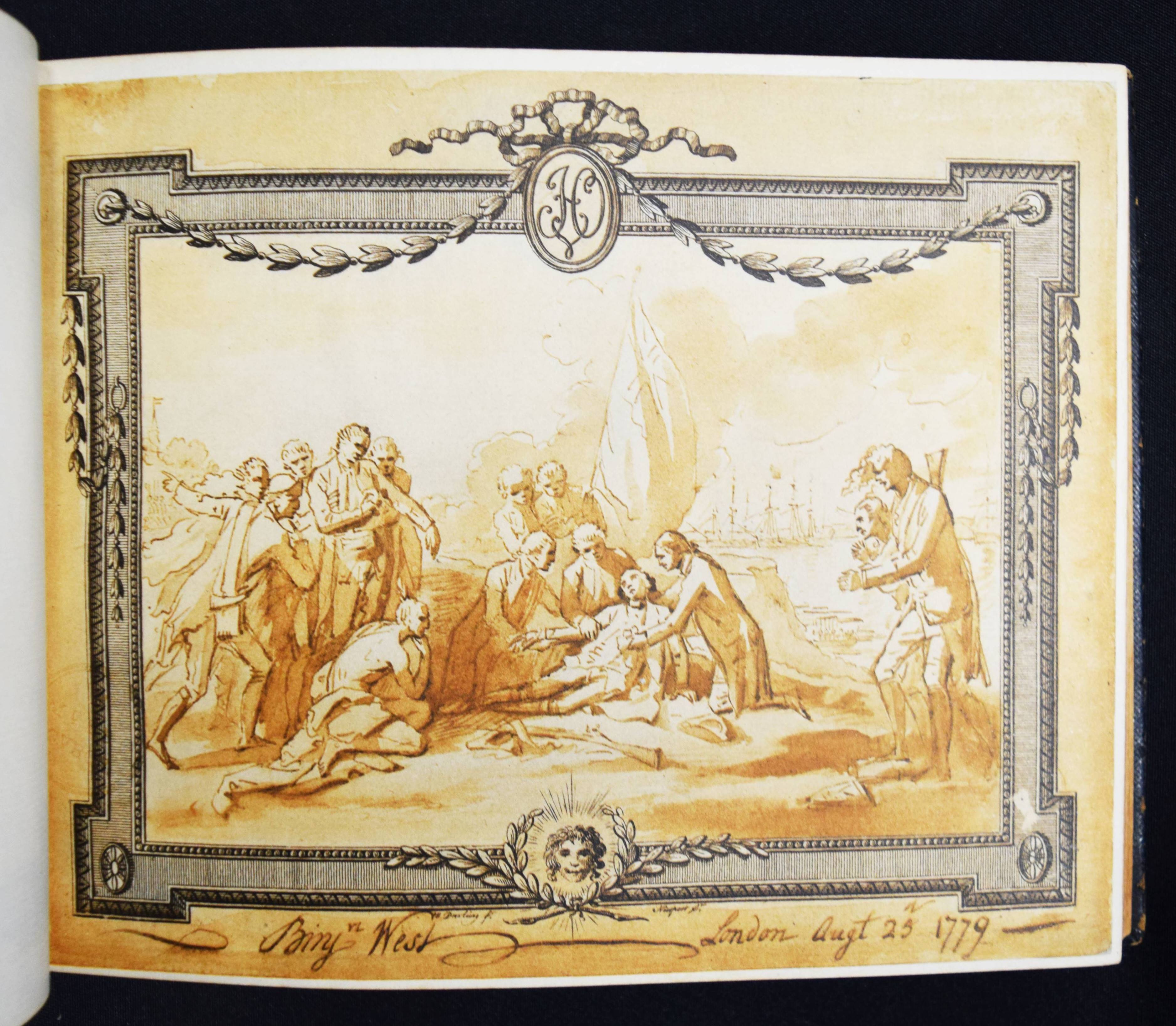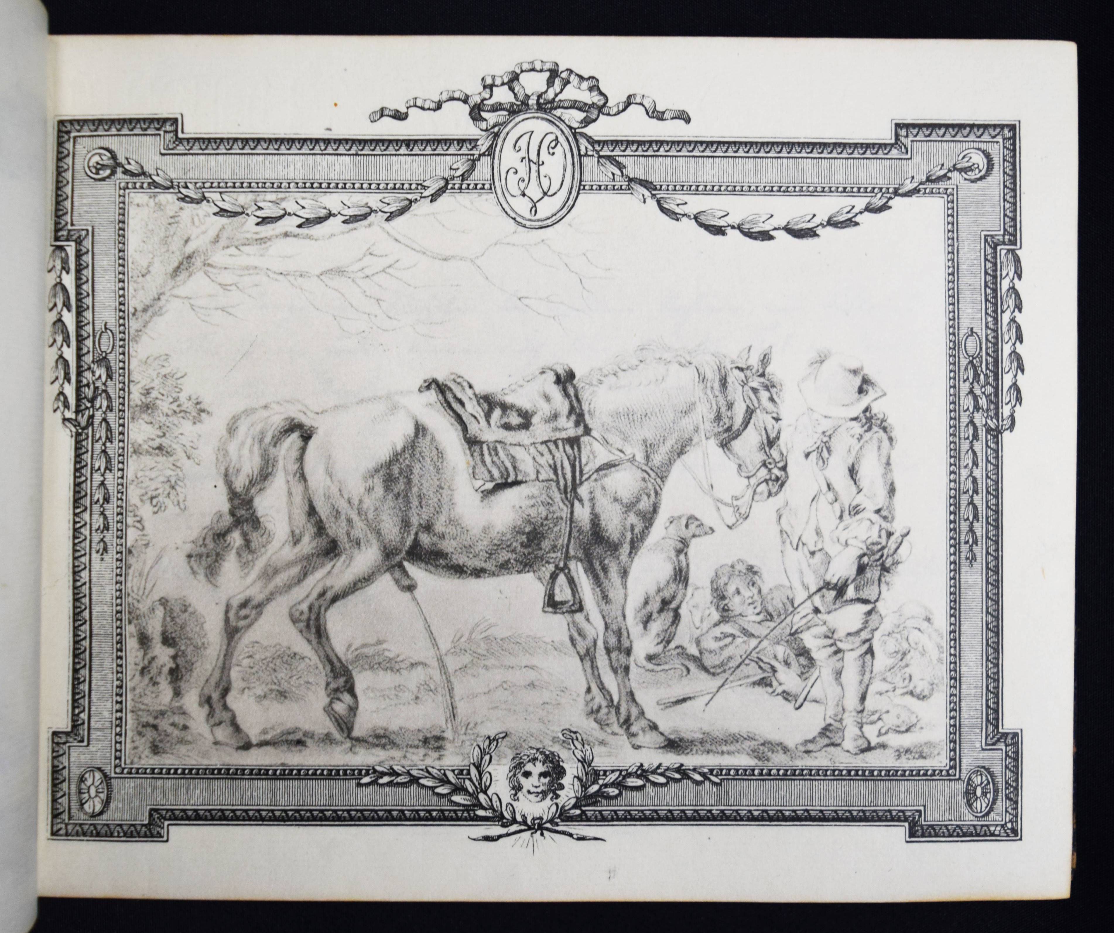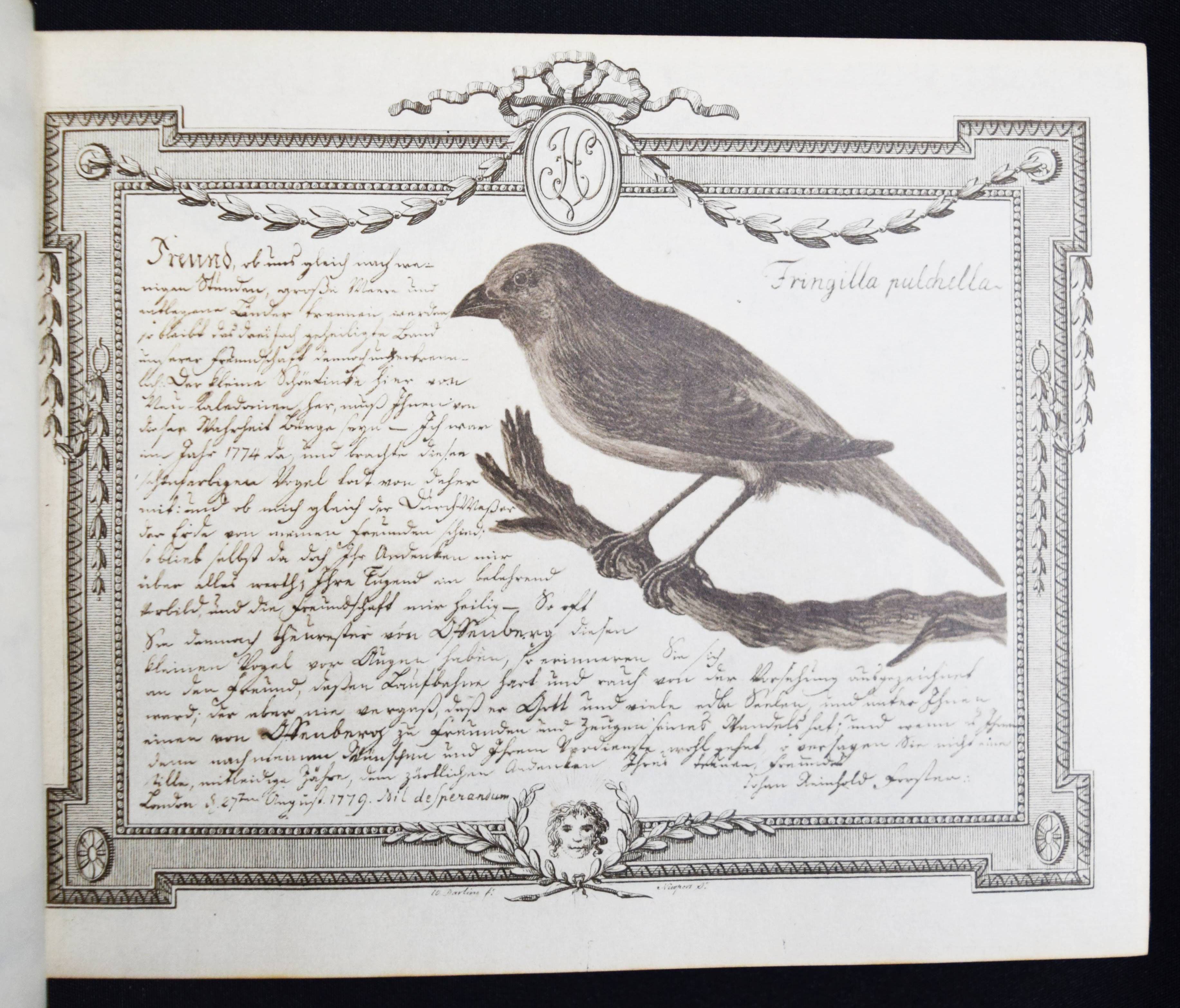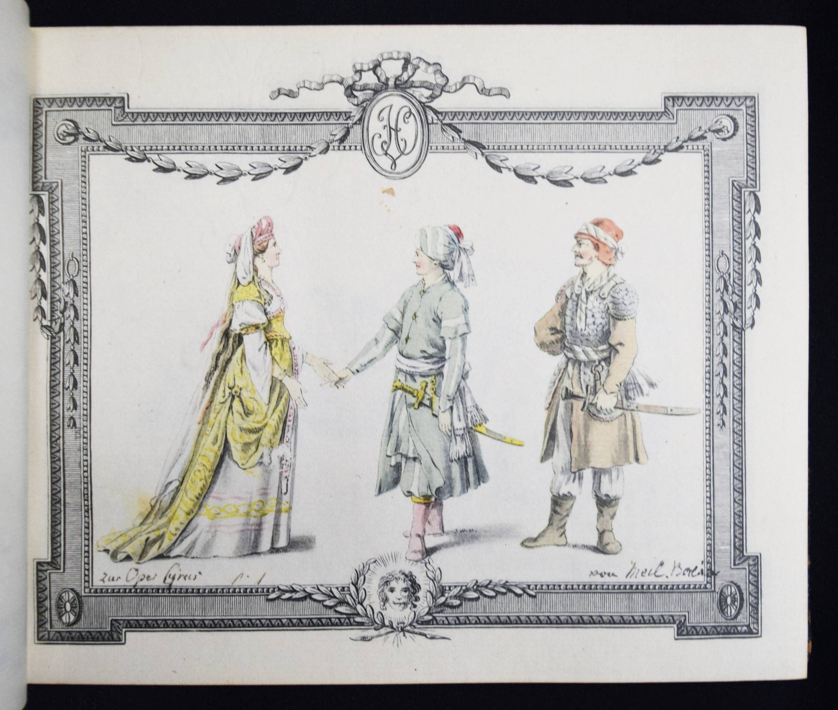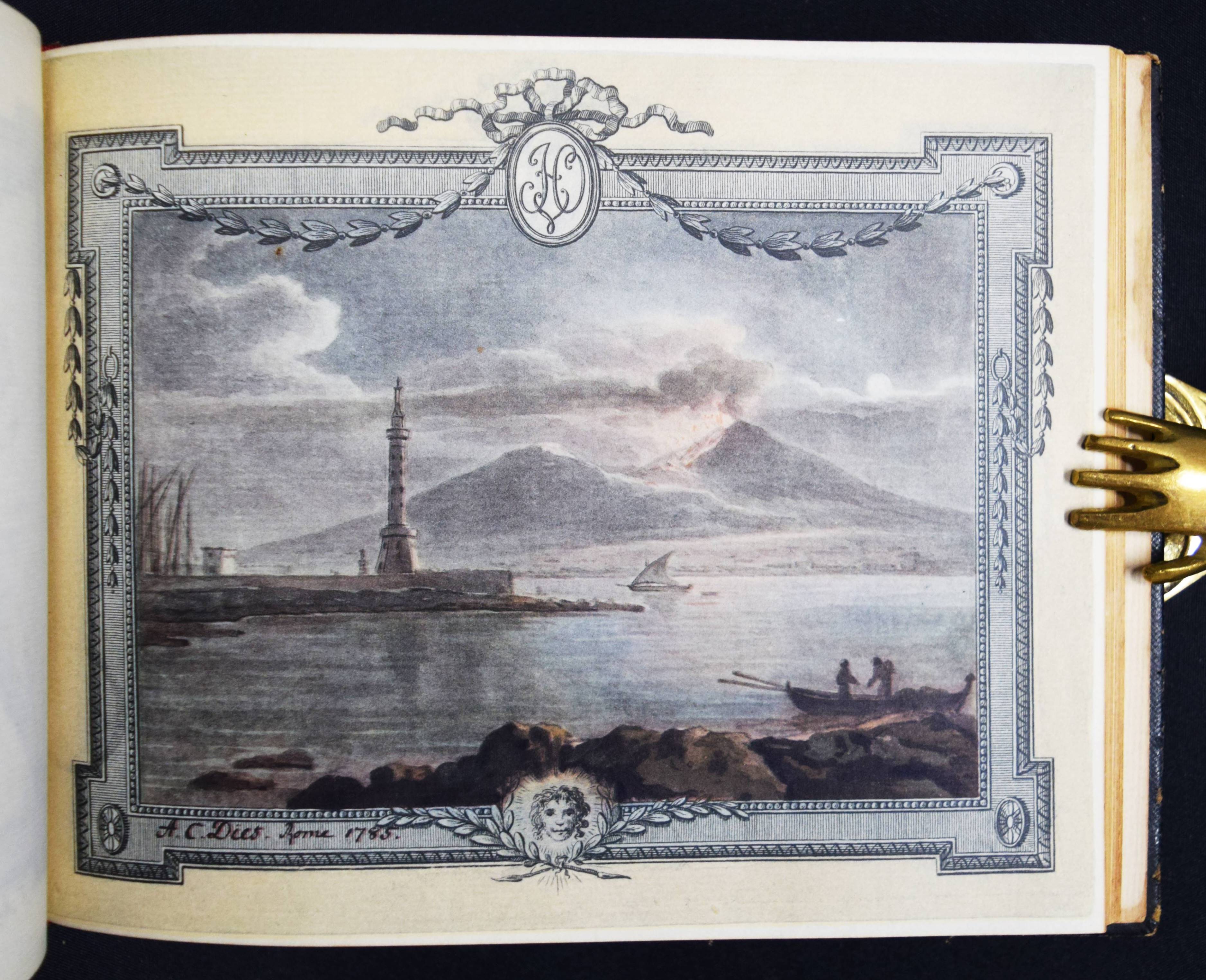 Stammbuch – Offenberg, Heinrich v. Various designs collected by le Baron d’Offenberg de la Courlande in the course of his travels. (Faksimile-Ausgabe nach dem im Provinizial-Museum zu Mitau befindlichen Original. Mit einem Nachwort von Otto Clemen). Leipzig, Insel-Verlag (1919). Quer-8°. [6], 77 teils farbige Tafeln, [12] S. Schwarzer Orig.-Lederband mit reicher Rücken- und Deckelvergoldung und goldgepr. Deckelvignette und Goldschnitt (signiert: E.-A. Enders Leipzig). Sarkowski 1209. – Eines von 312 num. Exemplaren der Vorzugsausgabe im prachtvollen Handeinband. – Das eindrucksvolle Stammbuch mit Zeichnungen und Eintragungen von Kant, Chodowiecki, Lavater, Salomon Geßner, Pestalozzi u. v. a. entstand in den Jahren 1773 bis 1788. Das Original befand sich im Museum der lettischen Stadt Jelgava. – Gelenke und Kanten etwas berieben, sonst sehr gut erhalten.