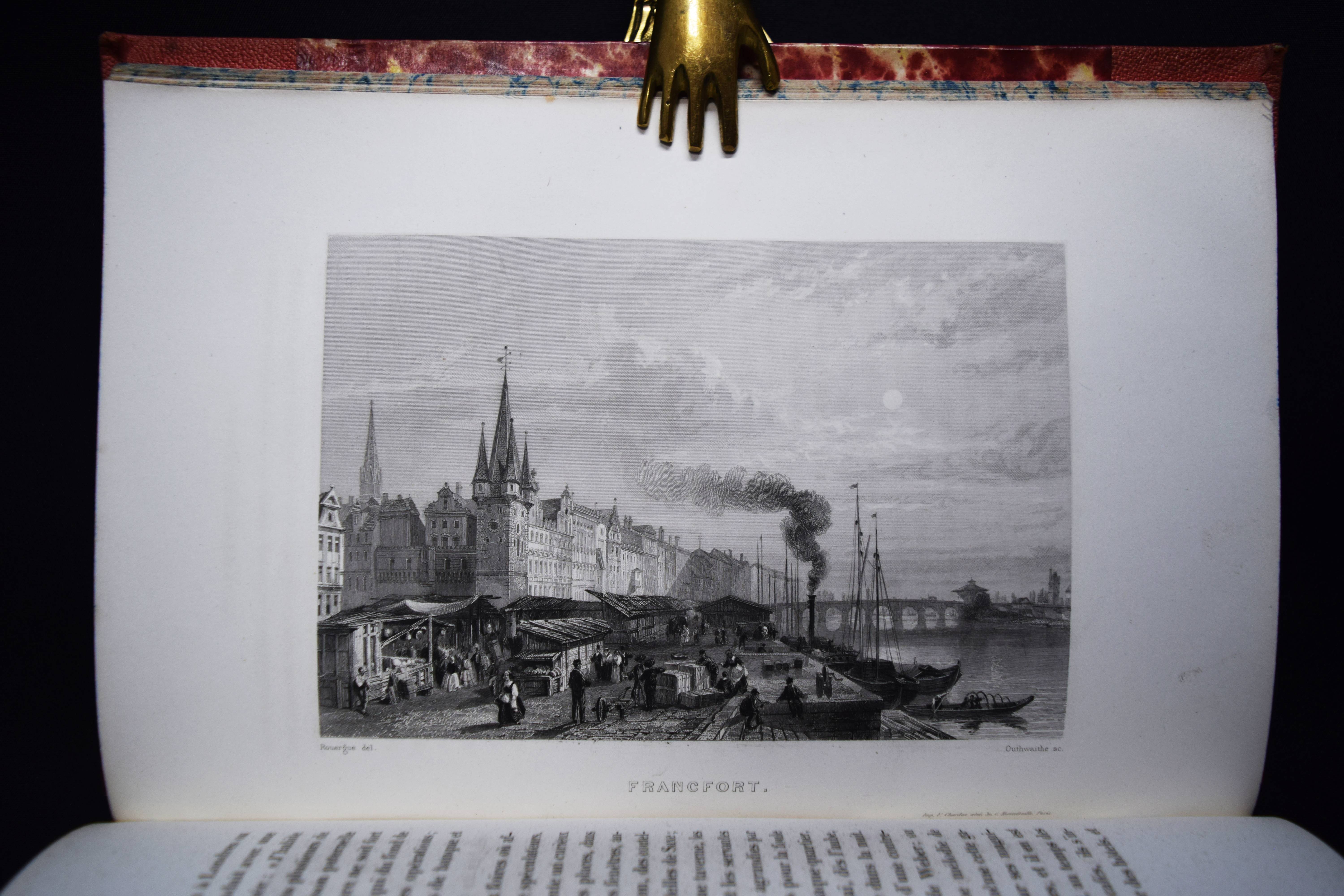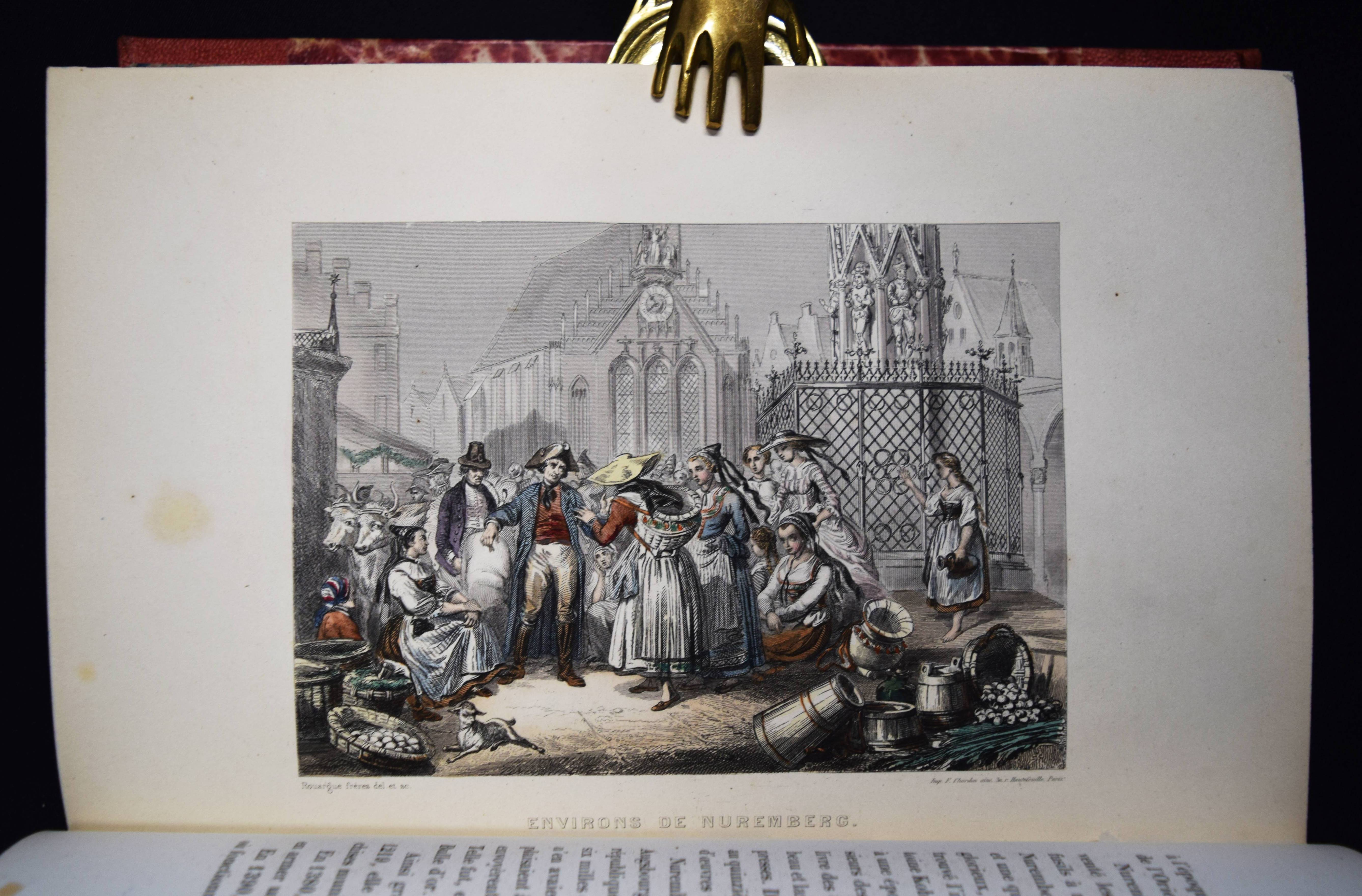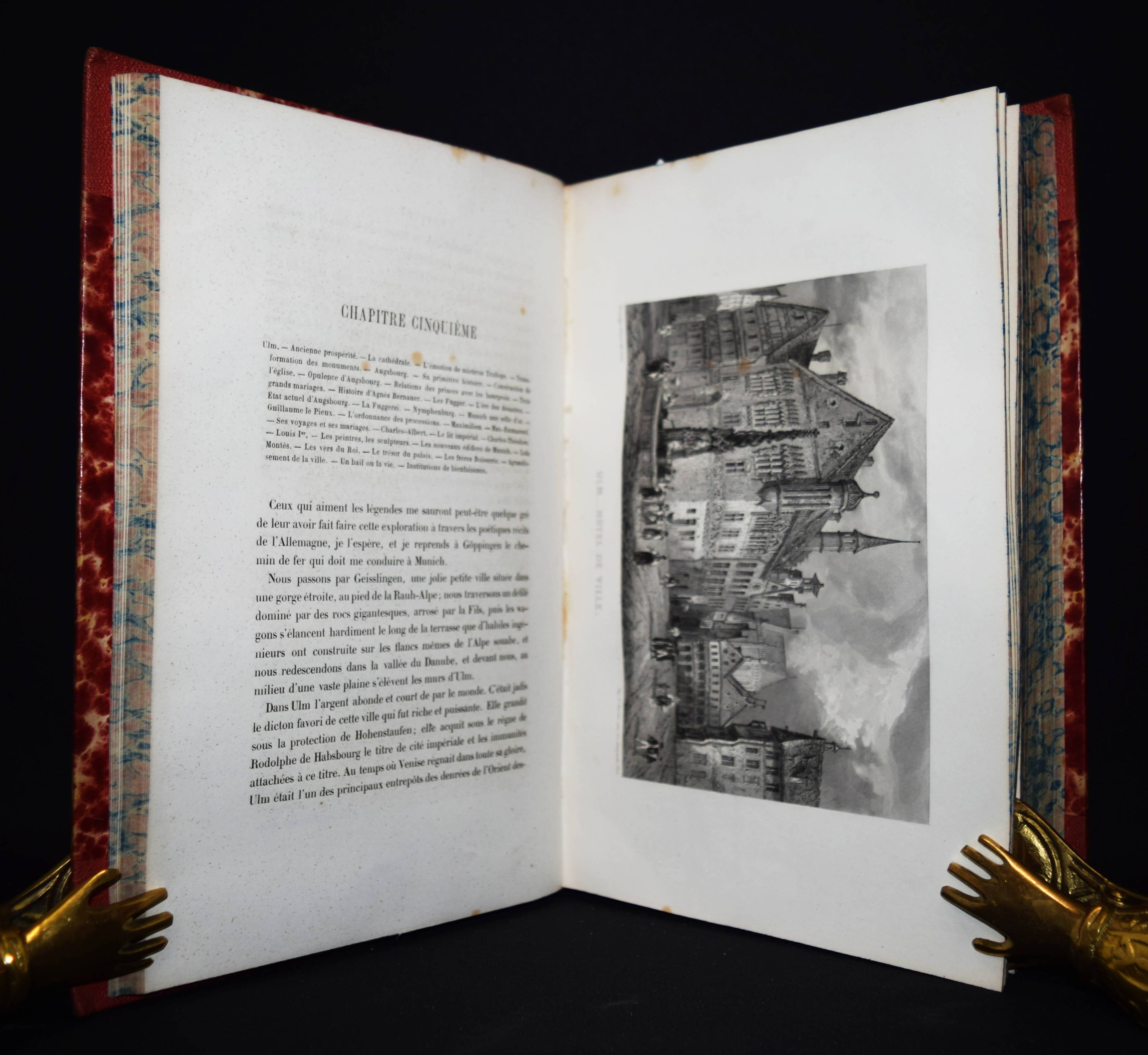 | Marmier, Xavier. Voyage pittoresque en Allemagne. Partie meridionale. – Partie septentrionale. 2 Bände. Paris, Morizot 1859-1860. 4° (26,5 x 16,7 cm.). [2] Bl., 504 SS.; [2] Bl., 516 S. mit 37 Stahlstichtafeln mit Ansichten (20 u. 17) und 7 Holzstichtafeln (4 u. 3, davon 6 kolor.) mit Trachtendarstellungen. Weinrote Orig.-Halb-Maroquinbände mit goldgepr. Rückentiteln, dekorativer Rückenvergoldung und marmoriertem Schnitt. Adams 137 und 138. Vicaire V, 536. – Erste Ausgabe. – Mit Ansichten von Augsburg, Berlin, Breslau, Frankfurt/M, Innsbruck, Karlsruhe, Koblenz, Köln, Lübeck, München, Prag, Salzburg, Ulm, Wien, Würzburg usw. – Der französische Germanist X. Marmier (1808-1892) besuchte bei seiner Deutschlandreise (1832-1835) u. a. Tieck, Schwab, Uhland, Chamisso, Holtei und die Brüder Grimm. „Durch zahlreiche Artikel, mehrere Bücher und durch Übersetzungen der Klassiker wies er sich als bester französischer Kenner des damaligen Deutschland aus und als eine Art Nachfolger der Madame de Stael. Wenn er nicht reiste, hielt er sich meist in Leipzig auf, deren Universität ihm 1839 einen Ehrendoktor verlieh“ (Wikipedia). – Nur vereinzelt leicht braunfleckig, schönes sauberes Exemplar in den dekorativen Verlagseinbänden.
